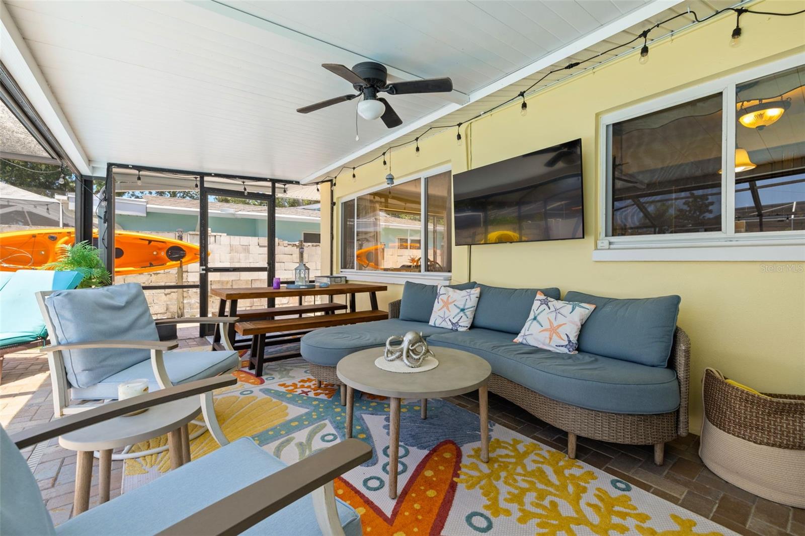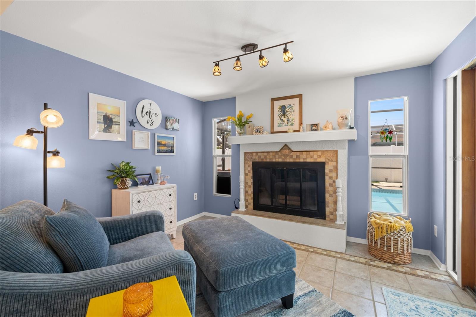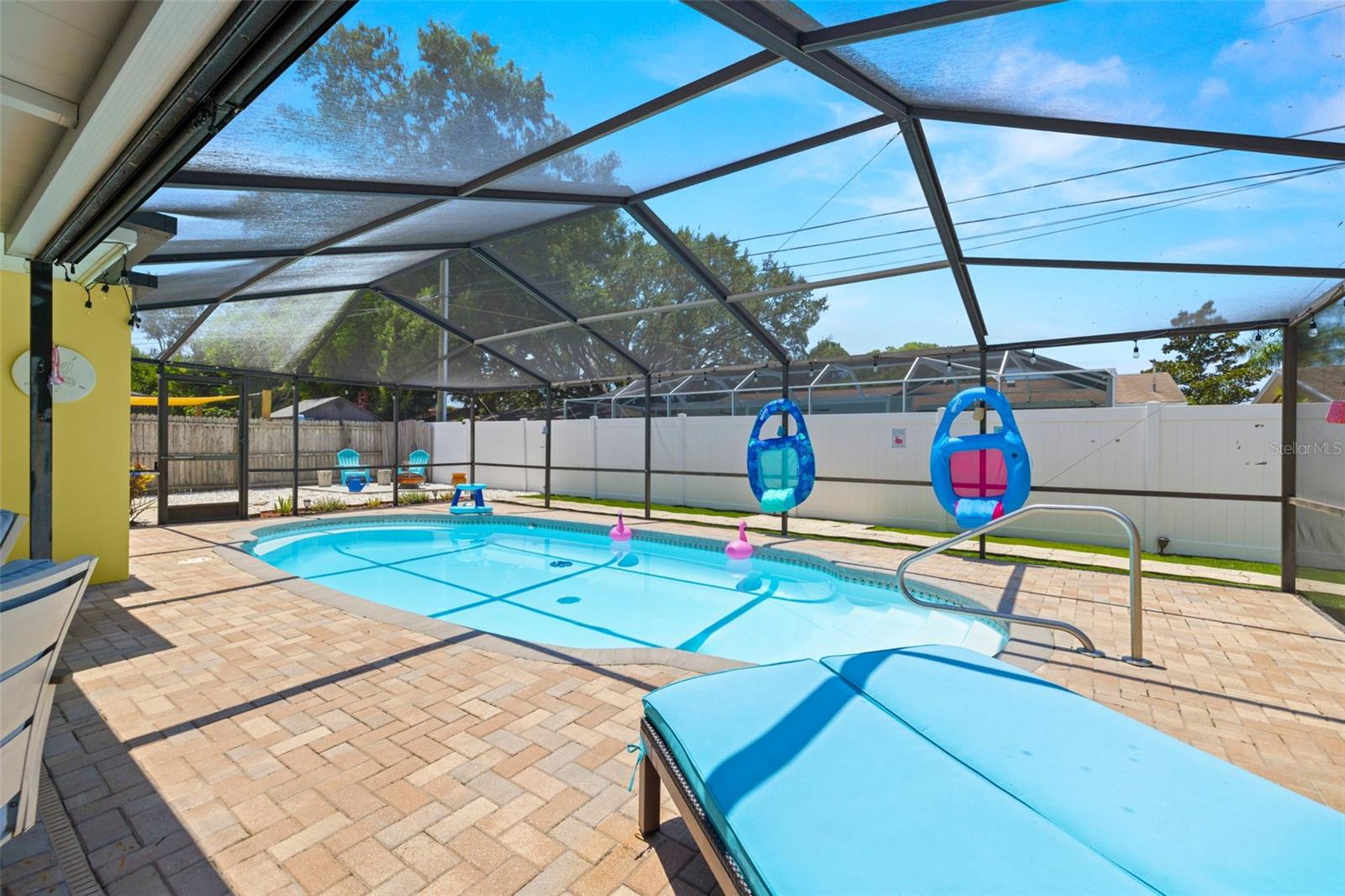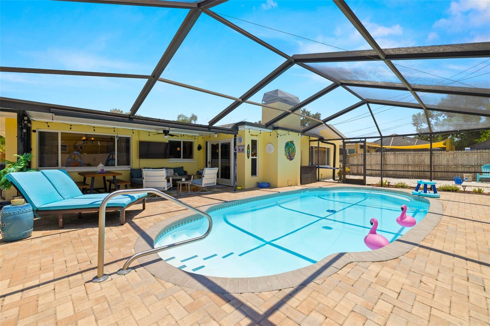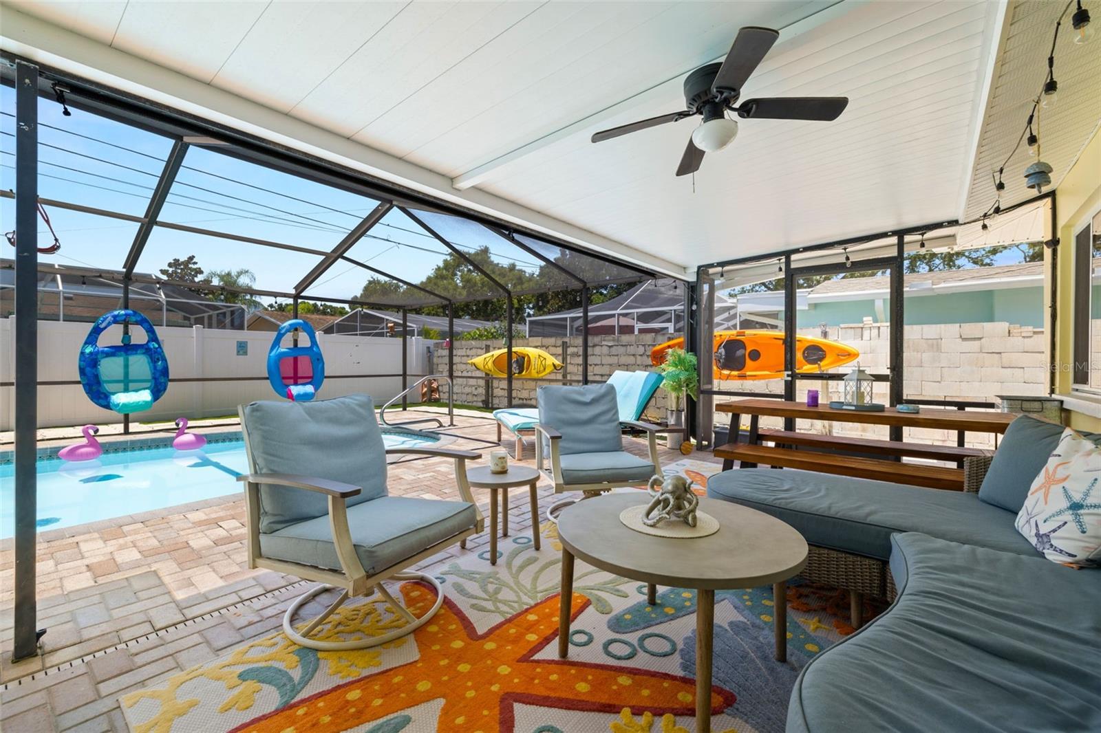 Welcome Home to your Sunny Slice of Paradise! This beautifully updated 2-bedroom, 2-bathroom home radiates warmth and charm from the moment you arrive. Pride of ownership is abundant in every detail. Freshly painted inside and out in 2024, this home features incredible curb appeal with vibrant landscaping, coastal charm, and a circular driveway that welcomes you home. A single car garage is perfect for parking your car or storing your toys. Step inside to find spacious living areas filled with natural light. Wood and tile floors throughout the main living space provide easy upkeep. The Florida room is warm and cozy with a fireplace and a view of the lanai. Both oversized bedrooms have brand new carpet, offering comfort and flexibility for use of space. The main bathroom has been thoughtfully renovated with stylish finishes, creating a relaxing spa like feel. The heart of this home is the backyard oasis. Enjoy year-round relaxation in the screened-in lanai, complete with a sparkling pool, new chlorinator (2024), and plenty of room to entertain. The paver patio pool deck is a nice upgrade. The entire backyard is designed with low-maintenance Zeroscape landscaping and astroturf, perfect for those who want beauty without the upkeep. Additional updates include a NEW AC system (2024) and NEW ROOF (2018), offering both comfort and peace of mind. No flood zone here, this home stayed high and dry and unaffected by the storms. The flexible floorplan allows for a 3rd bedroom to easily be added and for an ensuite bathroom added to the primary suite. Buy a 2/2 and make it a 3/3 with very little effort, the options are endless! Largo allows for short term rentals, think vacation rental or Air BnB. Located in a friendly neighborhood close to shopping, dining, and only 15 minutes to the Gulf beaches, this home is move-in ready and waiting for its next chapter!