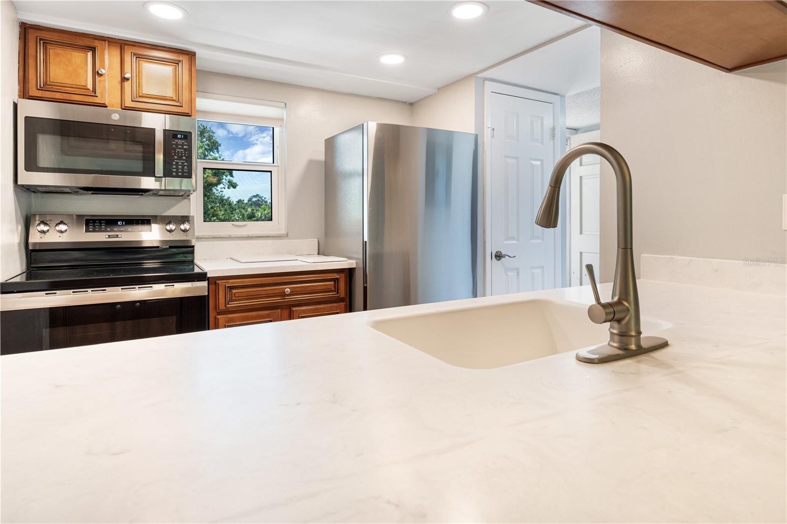 Price Reduced!!!!!Live The Dream! Kick Back, Relax and Enjoy the Peaceful Serenity of Living in this Waterfront Resort Style Complex. Peace of mind owning in Bldg 1 which sits high and dry within the complex. Offering over 1,300 Sq. Ft with 2 Bedrooms, 2 baths,featuring a split floor plan for privacy,and plenty of room to entertain in the spacious living/dining rooms . New Hurricane Windows, along with the Slider Door both have Custom Cellular Shades,add a Full View Storm Door all together will provide an abundance of natural light , security and save on your energy costs. Experience carefree living with the easy care tile floors throughout, New A/C, Electric Panel and Water Heater all completed in 2021. The Kitchen has Updated Wood Cabinets,New GE Stainless Appliances,Beautiful Solid Surface Countertops with an Intergrated Sink all installed in 2024. Cooking will be a pleasure with updated lighting and a large closet pantry to hold plenty of groceries. Both Bathrooms (1 en suite, 1 jack and jill) have New Vanities featuring Solid Surface Tops and new Fixtures. Inside Laundry Room is a bonus with ample storage space. Enjoy sitting on your Private Balcony(with access from the primary bedroom and the living room ) having your morning coffee. You might never find a reason to leave with all the amenities offered: 2 sparkling,heated pools,a hot tub,fitness center, tennis and pickleball courts,shuffleboard,kayaking or maybe try a hand at fishing and grill your catch on 1 of the many bbq grills scattered around the complex. The grounds are lush with beautiful tropical flowers, plants and palm trees. There is a designated car wash area and a private gated access to Bonner Park. The large clubhouse has a full kitchen, pool table, other games and offers organized activities throughout the year. The location is hard to beat with restaurants, sports bars,shopping, drug stores, coffee shops, easy access to airports and most importantly our spectacular gulf beaches are nearby to walk, bike, or hop in the car. Dreams Do Come True. Paradise Awaits!