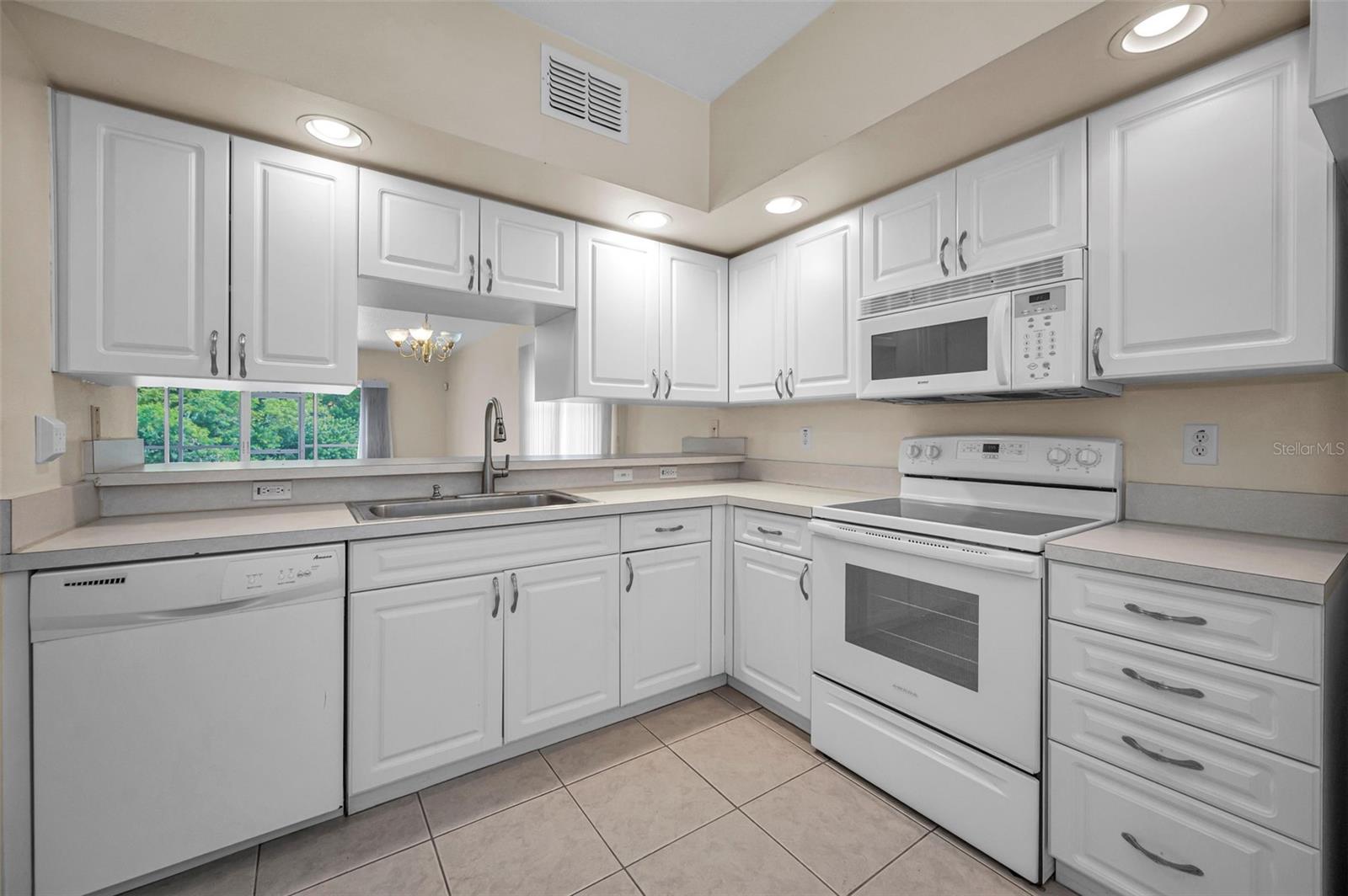 GROUND FLOOR END UNIT WITH WATER VIEWS! This spacious 3-bedroom, 2-bathroom condo with a 1-car garage offers an open floor plan main living area that features a bright living and dining area with large windows that bring in natural light and showcase serene views of the community pond. The large kitchen is designed with both function in mind, offering a closet pantry, built-in spice cabinet, and extra drawers under the breakfast bar for added storage and convenience. With plenty of cabinet space and a smart layout, it’s perfect for cooking and entertaining. The primary suite includes an en-suite bathroom with a step-in shower and a walk-in closet, while two additional bedrooms offer flexibility for family, guests, or a home office. A private screened lanai is the perfect spot to relax and enjoy the peaceful water view. Located on the first floor for easy access, this condo also comes with an attached garage and in-unit laundry. The community offers a pool and clubhouse, and you’ll love being just minutes from beaches, shopping, dining, and parks. This rare 3-bedroom end unit with a garage and pond view is move-in ready—schedule your private showing today!