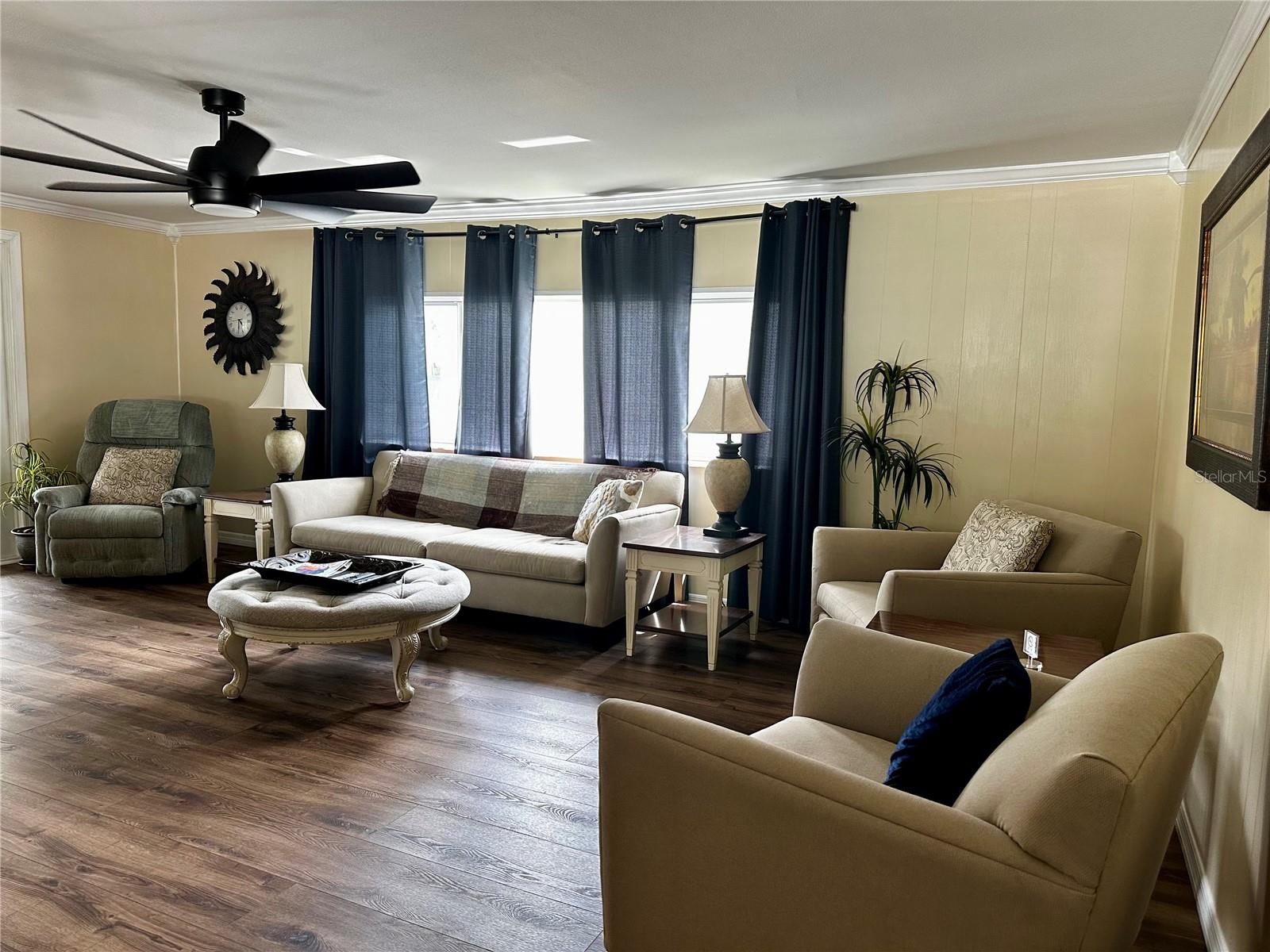 This stunning home is overlooking the 5th tee box of Fairway Village golf course, and is ready for it's new owner. The 2 bedroom 2 bath home, screams elegance. It's floor plan has been lovingly updated boasting, newly redesigned OPEN FLOOR PLAN to showcase renovated kitchen with NEW QUARTZ counter tops, high end flooring through out. Freshly painted and filled with natural light, the open kitchen plan flows easily into the dining and living room areas. 1414 total livable square footage, 289 of that is enclosed Florida Room with a separate AC. Need more storage? You'll find it here, with built-ins to house for all those extra winter clothes you brought to Florida but will rarely wear. Enjoy your down time relaxing in the sun on the outdoor patio, or the bright and airy Florida room. This fully furnished home includes washer & dryer, NEW oversized hot water heater 2024 and NEW AC in 2022. The kitchen is fully loaded with dishes, pots pans and kitchen supplies. Relax in the new cozy living room furniture with club chairs and oversized sofa. Plenty of room welcome your guests. The MASSIVE he/she shed with washer & Dryer, has lots of storage space, built in shelves, room for a work bench, and has a water tub for washing off all the grime. Fairway Village is a spacious, premier manufactured home community. A perfect place to live your dream, whether you stay year-round or spend some months elsewhere. A Resident Owned Manufactured Home Community of 751 homes for persons 55-plus years of age. Located in sunny Largo, on Florida's Gulf coast and close to many of Florida's major attractions. We offer a feeling of spaciousness with our wide curbed streets with streetlights and sidewalks. All homes are located with established setbacks from the street. Amenities include: A private 9 hole par 3 golf course with two lakefront fairways and a practice putting green A five-plus acre lake for catch and release fishing Two swimming pools with hot tubs Eight sheltered shuffleboard courts A new 19,000+ sq. ft. Clubhouse was completed January, 2022, that includes the following: 700 seat Auditorium/Ballroom, Large commercial kitchen, Stage for chorus and programs, Separate conference rooms, Fitness center, Library, Billiard room, Card playing room, Sitting areas, Wi-fi service throughout. Fairway Village's 2025 maintenance fee of $401/month includes water, sewer, in-home high speed internet access, 220+ Spectrum cable TV channels, curbside trash pickup, lawn pest control and lawncare. 2025 Annual Golf memberships are available to residents for unlimited play. Non-members pay a $15 greens fee during season and $8 off season. The Fairway Village Social Committee (FSC) promotes and coordinates over 50 social activities. While the listing information is deemed reliable, please note, it is not guaranteed and should be independently verified for accuracy.