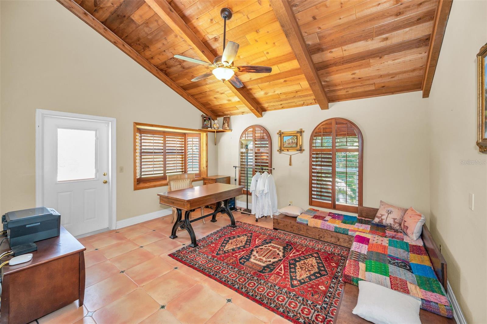 Timeless Mediterranean Revival Estate with Resort-Style Pool Oasis on Over Half an Acre in Prestigious Carlton Estates. Step into a world of enduring elegance with this captivating two-story Mediterranean style pool home, where architectural splendor meets elevated leisure and family-friendly luxury. Nestled on more than half an acre in one of Pinellas County’s most sought-after enclaves, this exceptional residence offers over 3,800 square feet of exquisitely designed living space. Inside, authentic character abounds, from rich Saltillo tile floors and arched doorways to bay windows, wrought iron railings, and soaring beamed ceilings that crown the interiors with timeless charm. A brand-new roof and updated windows and doors throughout ensure peace of mind and modern comfort. From the moment you enter, bold Tuscan-style tile flooring sets a tone of European permanence. The main level unfolds with expansive, interconnected living spaces, including a formal living and dining room that exudes warmth and sophistication—perfect for elegant entertaining or intimate evenings. At the heart of the home lies a grand, light-filled family room, where two-story vaulted ceilings and exposed wood beams evoke the rustic romance of a Spanish mission. Anchoring the space is a striking wood-burning fireplace, casting a cozy glow across gatherings large or small. The adjacent chef’s kitchen is a seamless extension of the living space, featuring a central island and open sightlines that keep the cook connected to the conversation. A sunlit breakfast nook with a bay window offers the ideal setting for casual meals and morning coffee with a view. Thoughtfully designed for flexibility, the main floor also includes a secluded office retreat with a beamed ceiling and a generously sized bedroom with an adjacent full bath—perfect for guests, multigenerational living, or a private sanctuary. A sweeping staircase of wood and wrought iron leads to the upper level, where three generously sized bedrooms and a sunlit, multi-purpose bonus room span the second floor. The expansive primary suite is a true retreat, complete with a dramatic stone fireplace and a private veranda for quiet moments under the stars. Outdoors, the Mediterranean lifestyle comes to life. A sprawling covered lanai with paver flooring and elegant arched breezeways opens to a park-like backyard, where mature landscaping surrounds a large, sparkling inground pool. Whether hosting alfresco soirées or enjoying tranquil afternoons in the sun, this outdoor oasis is designed for seamless indoor-outdoor living. This is more than a home, it’s a statement of style, serenity, and sophistication. With four bedrooms, 4 baths, a resort-style backyard & pool, and over half an acre in one of Pinellas County’s finest neighborhoods, this home checks every box. Don’t miss your chance to experience the elegance and ease of Carlton Estates living! Experience the European charm and refined design for yourself.