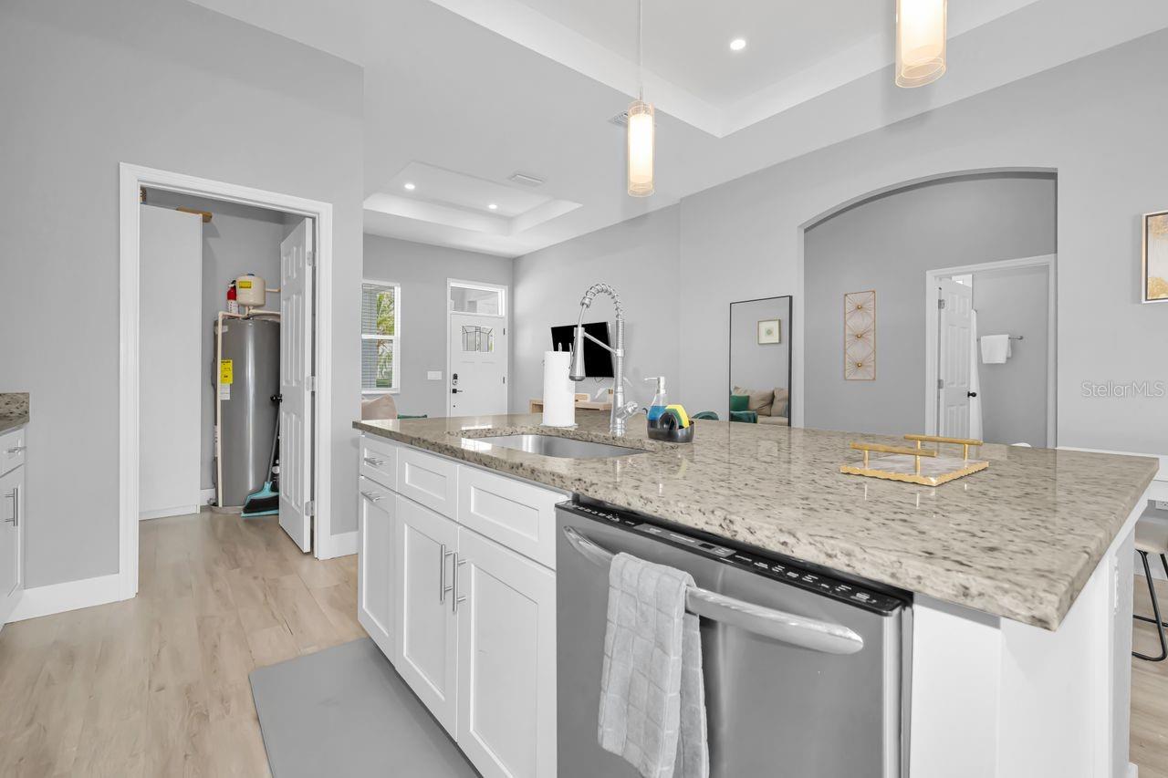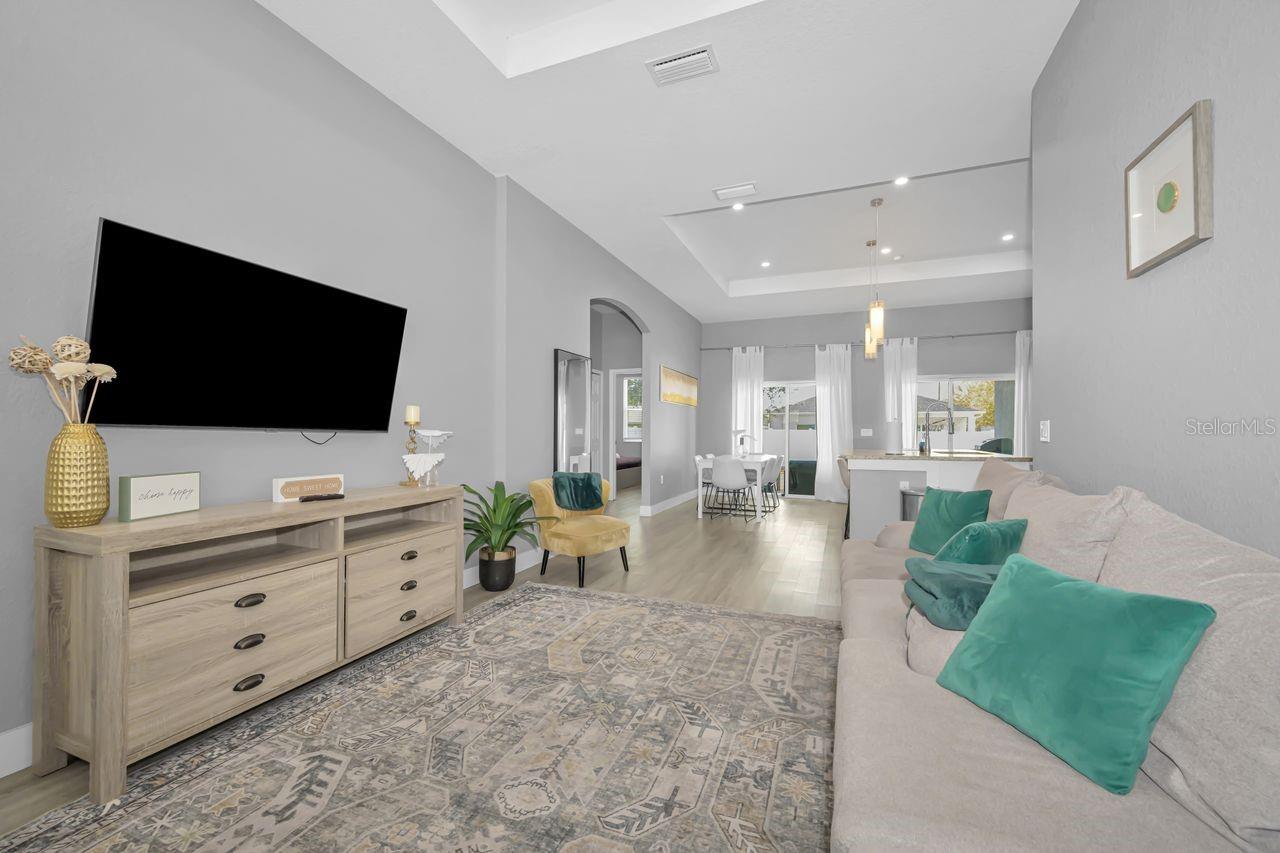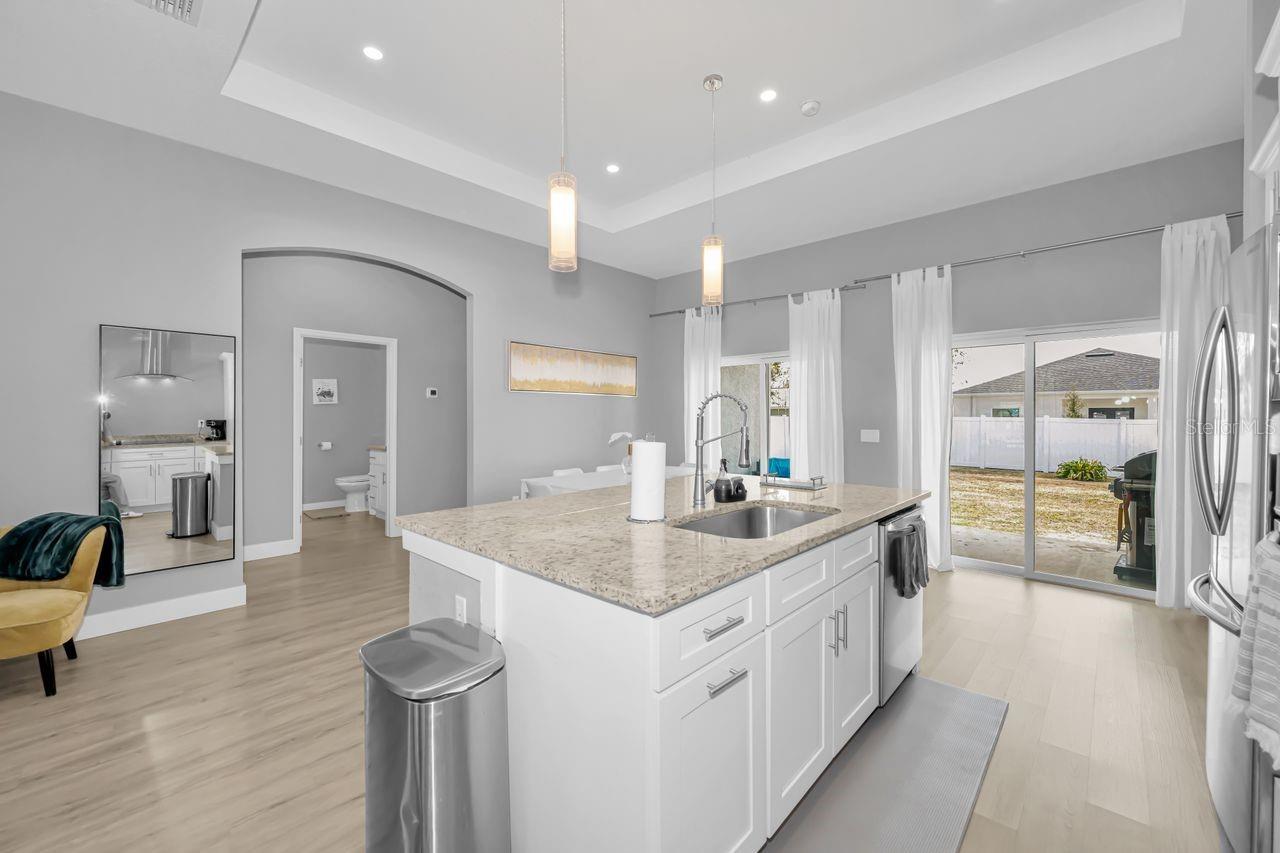 Beautiful, nearly new 3/2 with 2-car garage and 1,573 heated sq ft. Open-concept living/dining area and upgraded kitchen with granite countertops, stainless steel appliances, soft-close cabinets, and breakfast bar. Waterproof laminate flooring throughout. Split floorplan with spacious primary suite featuring walk-in shower. Two additional bedrooms with ample closets. Indoor laundry room. Large backyard with 16x9 patio. Impact windows/doors, foam insulation, Smart Home features, and appliances still under warranty. Move-in ready. Additional features include an indoor laundry room, impact windows and doors, foam insulation for energy efficiency, and Smart Home technology (smart switches, thermostat, Ring doorbell, and smart lock). Looking for income potential? This home is currently an active AirBnB!