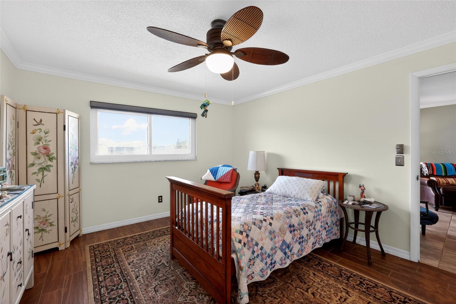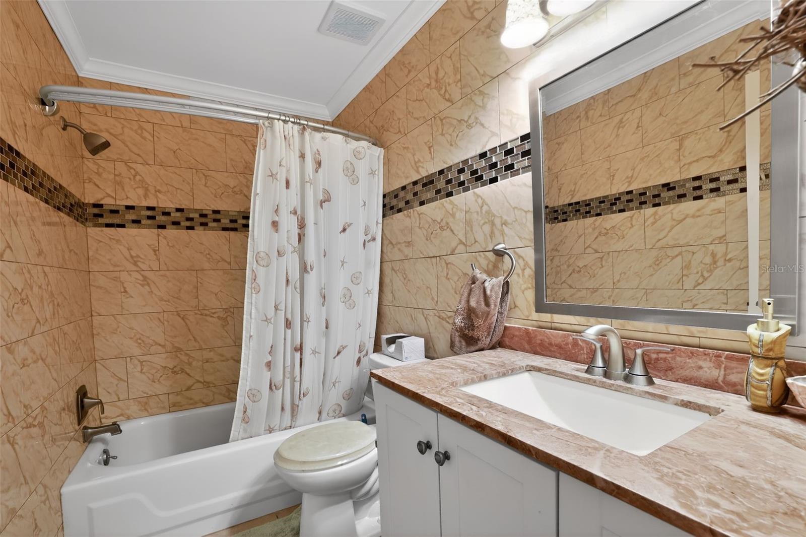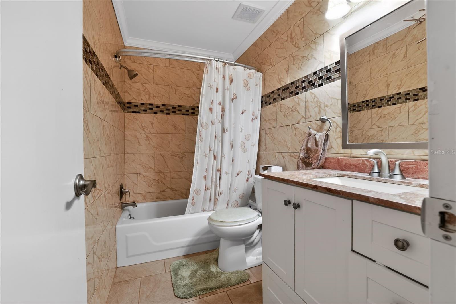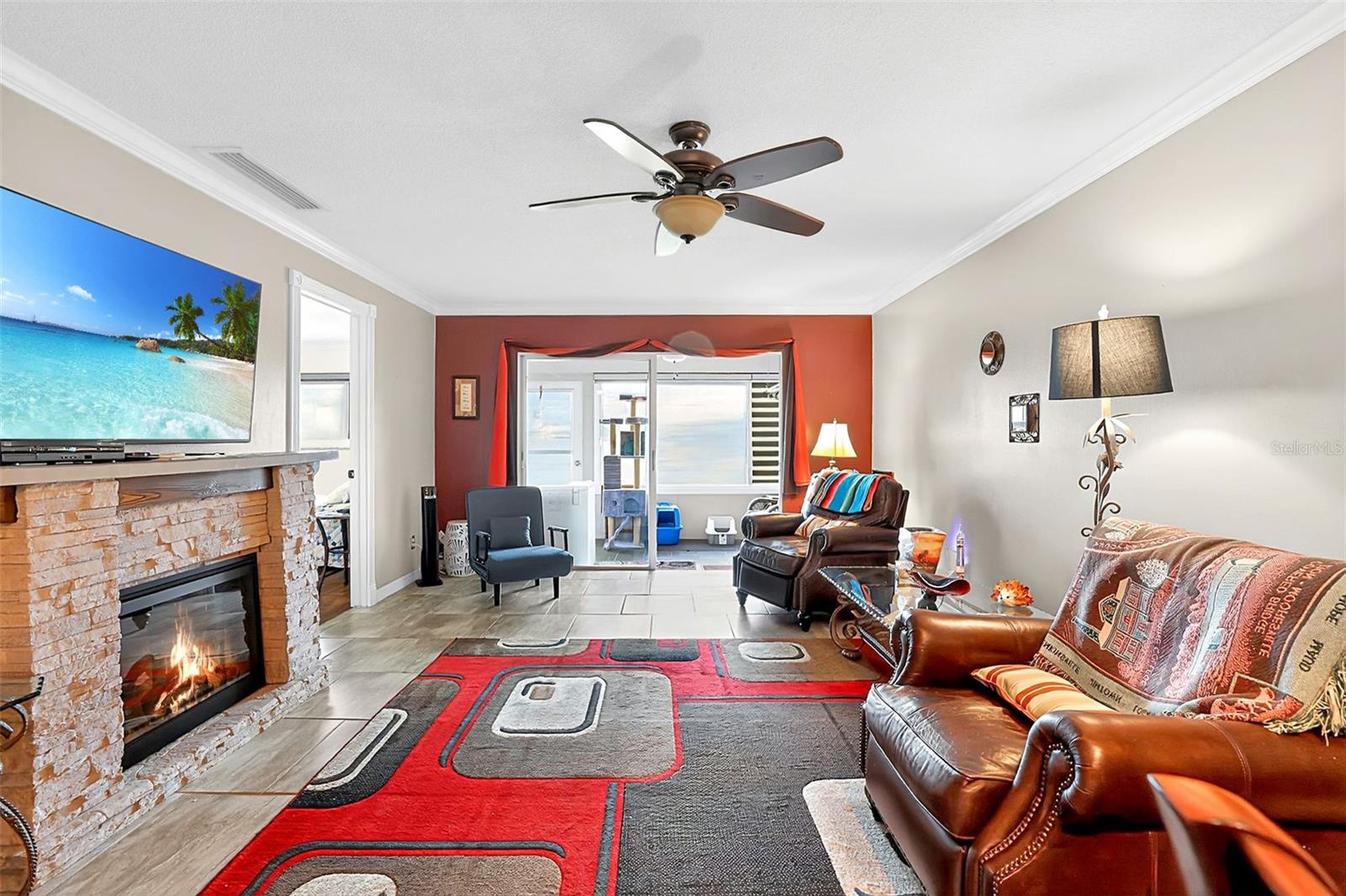 Discover your Florida retreat in this beautifully updated villa, ideally situated in the well-maintained Villa Nueva community in Largo—high and dry with no flood insurance required. Whether you're searching for a seasonal getaway or a full-time residence, this home offers an exceptional blend of modern upgrades, smart design, and effortless, low-maintenance living. Step inside to find durable porcelain tile flooring throughout and a spacious open-concept layout designed for both comfort and functionality. The gourmet kitchen is a standout feature, showcasing expansive granite countertops, a sleek tile backsplash, solid cherry wood cabinetry, and a full suite of stainless steel appliances—including a KitchenAid refrigerator and range with vent hood, plus a Haier dishwasher. A generous breakfast bar with seating for four flows seamlessly into the living area, where a freestanding fireplace adds warmth and inviting ambiance—perfect for relaxing or entertaining year-round. The versatile front bedroom is thoughtfully designed with a queen-size memory foam Murphy bed (included), a built-in drop-down desk, and custom California Closet organizers—ideal for guests, a home office, or both. The nearby guest bathroom features a tub/shower combo with striking floor-to-ceiling tile work. Privately positioned at the rear of the villa, the primary suite offers a peaceful retreat with custom California Closet systems and an updated ensuite bath complete with a walk-in tiled shower and full-height tile. An all-in-one washer/dryer is conveniently integrated into the suite for added ease. Enjoy Florida living at its best in the enclosed, tiled rear patio overlooking a tranquil community greenbelt. With wiring in place for a wall-mounted TV, this inviting space is perfect for morning coffee, evening relaxation, or entertaining in any season. Additional highlights include a new HVAC system and ductwork (2024), top of the line hurricane-rated PGT windows (2015), added attic insulation (2019), a covered carport directly in front of the unit, and an exterior storage unit. Villa Nueva offers a truly carefree lifestyle with a low monthly HOA covering cable, internet, water, sewer, trash, exterior maintenance (including the roof), lawn care, pest control, and access to the community pool and clubhouse. Conveniently located just minutes from Clearwater Beach, St. Pete–Clearwater Airport, and Tampa, this move-in ready villa places you close to the very best of Florida’s Gulf Coast. Schedule your private tour today and experience the comfort, style, and convenience this exceptional home has to offer.