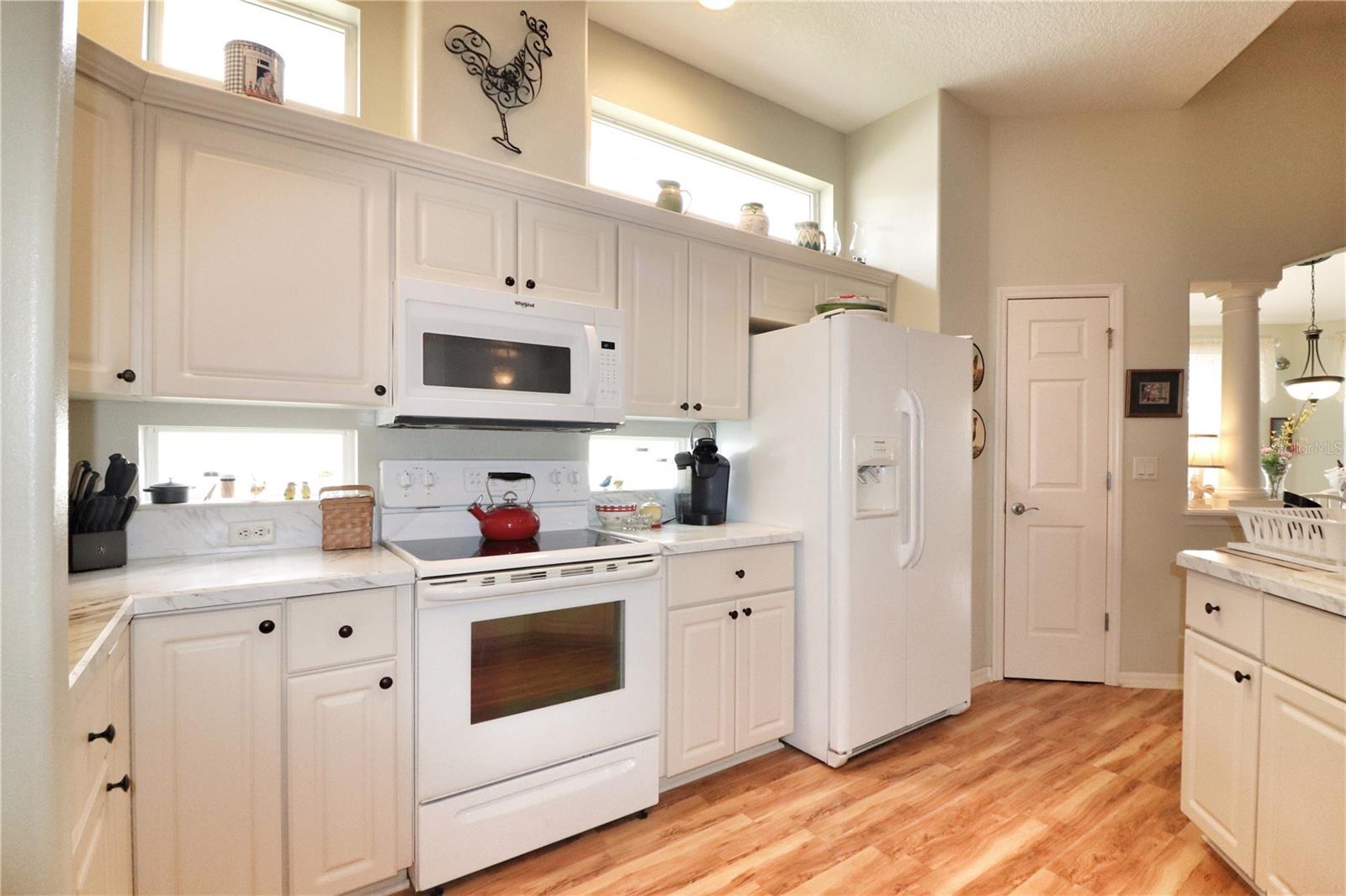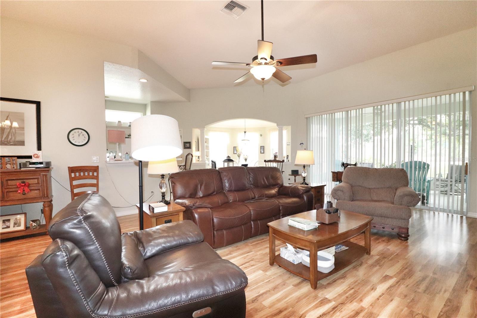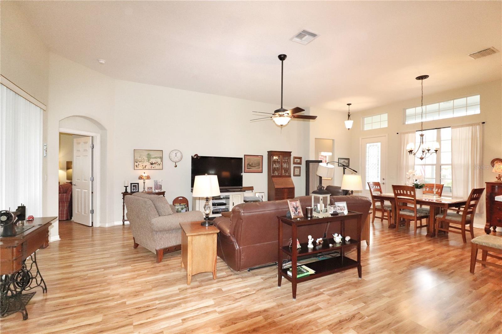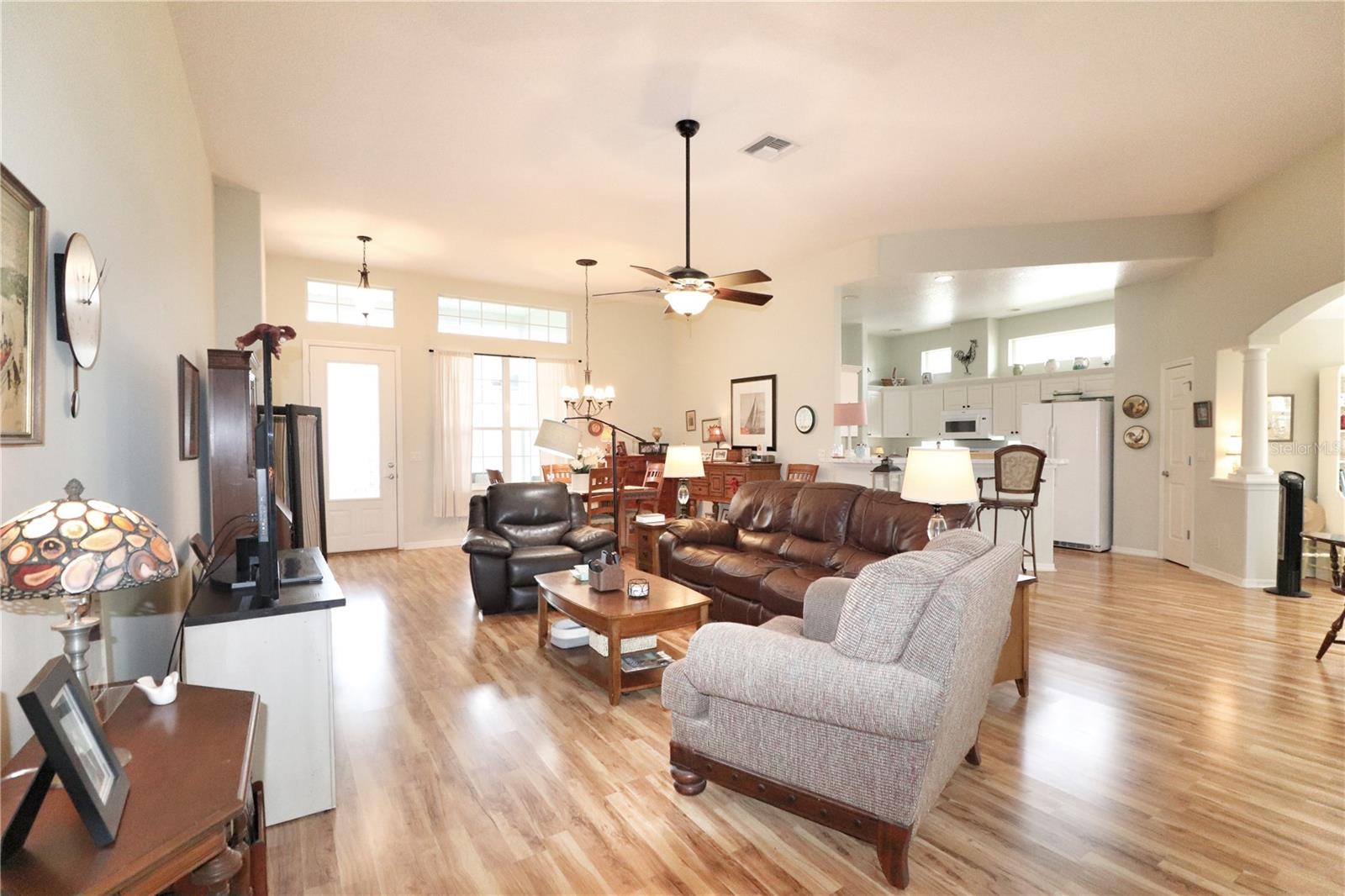 This Huntly model sits on a conservation lot and is the perfect home for those looking for convenience and relaxation. This recent 2019 HVAC system and recent 2018 roofed home offers expansive living space, formal dining area, well-designed kitchen, breakfast nook, large screened in front porch, master suite with two walk-in closets, master bath with a large shower, two guest bedrooms or use one for an office/den, guest bath has a tub, volume ceilings, inside laundry and two-car garage. The home also has luxury laminate flooring (2022) and (2019) countertops and cabinets. Large 18’ x 13’ screened in backyard porch gives you plenty of room to enjoy comfortable outdoor dining and pleasant views of the conservation area. Hard wired smoke detectors. Royal Highlands is a premier resident-owned gated community with 2 pools (one indoor and one outdoor), lighted tennis courts, 18-hole golf course, restaurant and pro shop, recreation center with numerous activities including billiards, fitness center, activity rooms, library, grand hall for social functions, concerts and plays, bocce ball, pickleball, shuffleboard, softball, a driving range and putting practice. HOA fees include Xfinity cable (for 3 TVs) and high speed internet plus secure RV/boat storage. Close proximity to the turnpike, airport, and Orlando attractions make this an ideal spot for those looking for convenience, luxury, and relaxation.