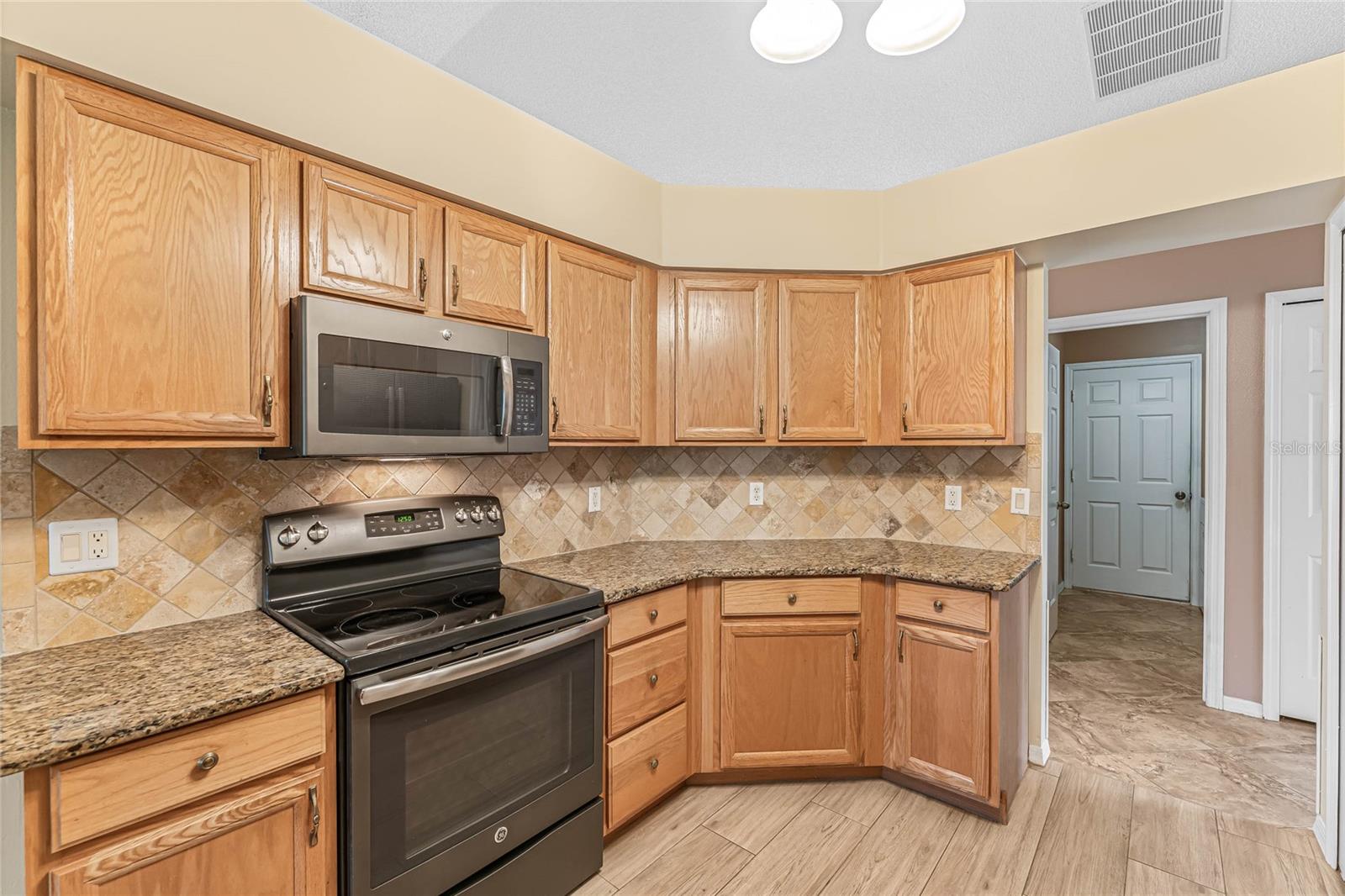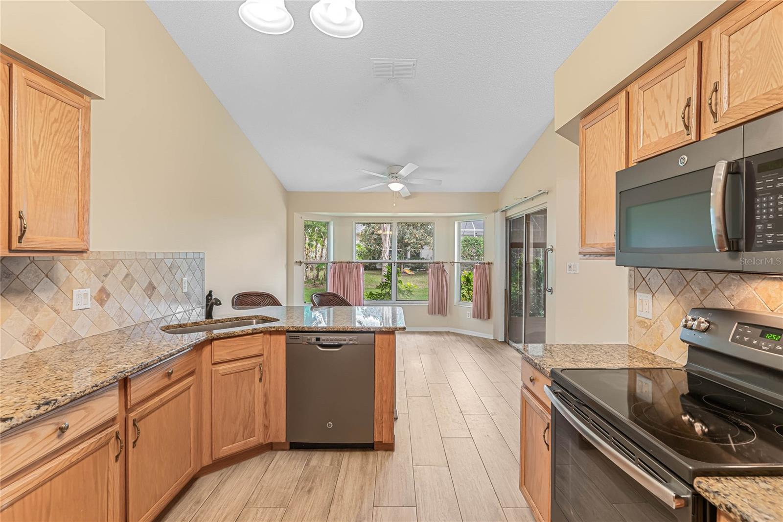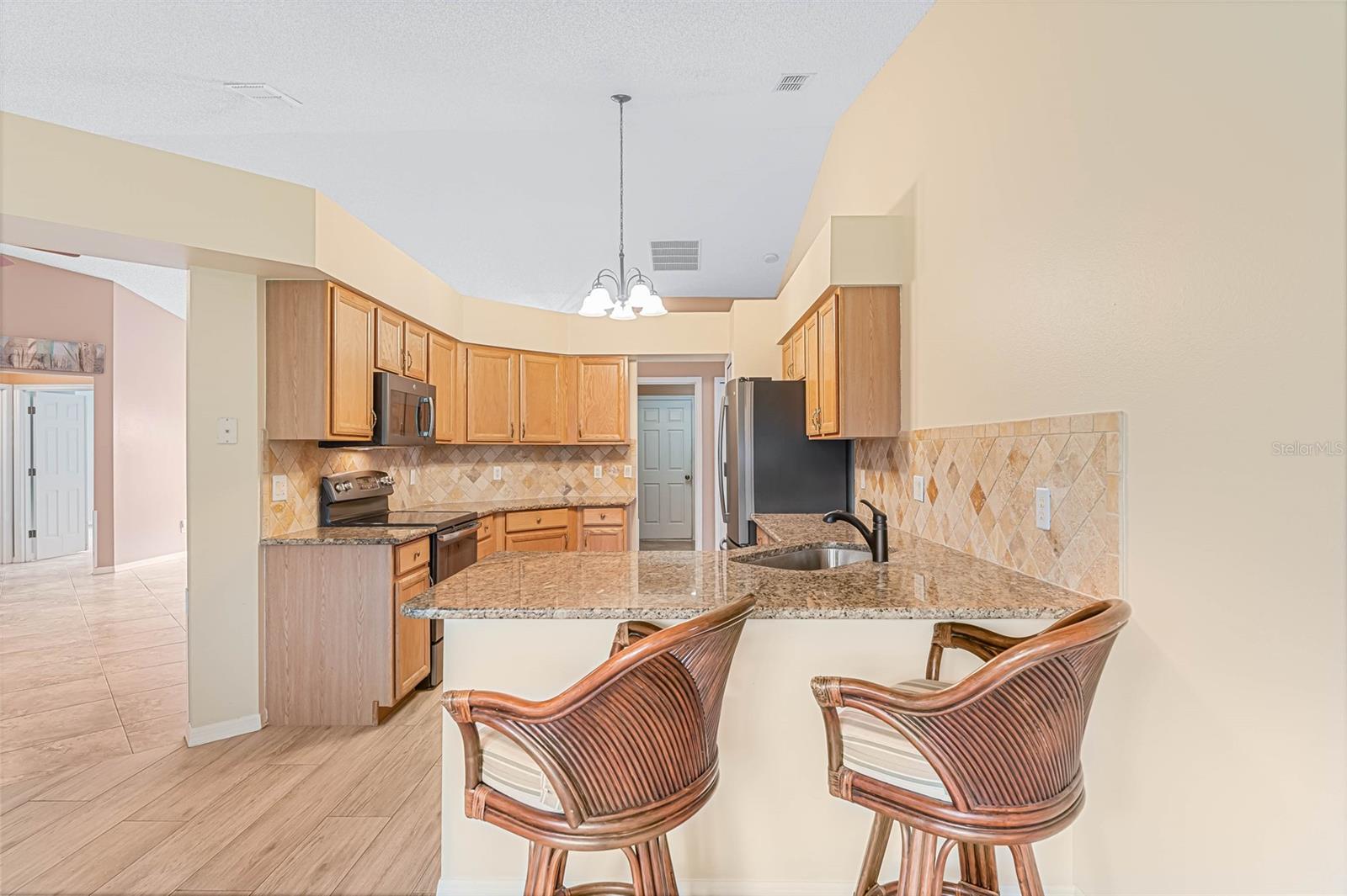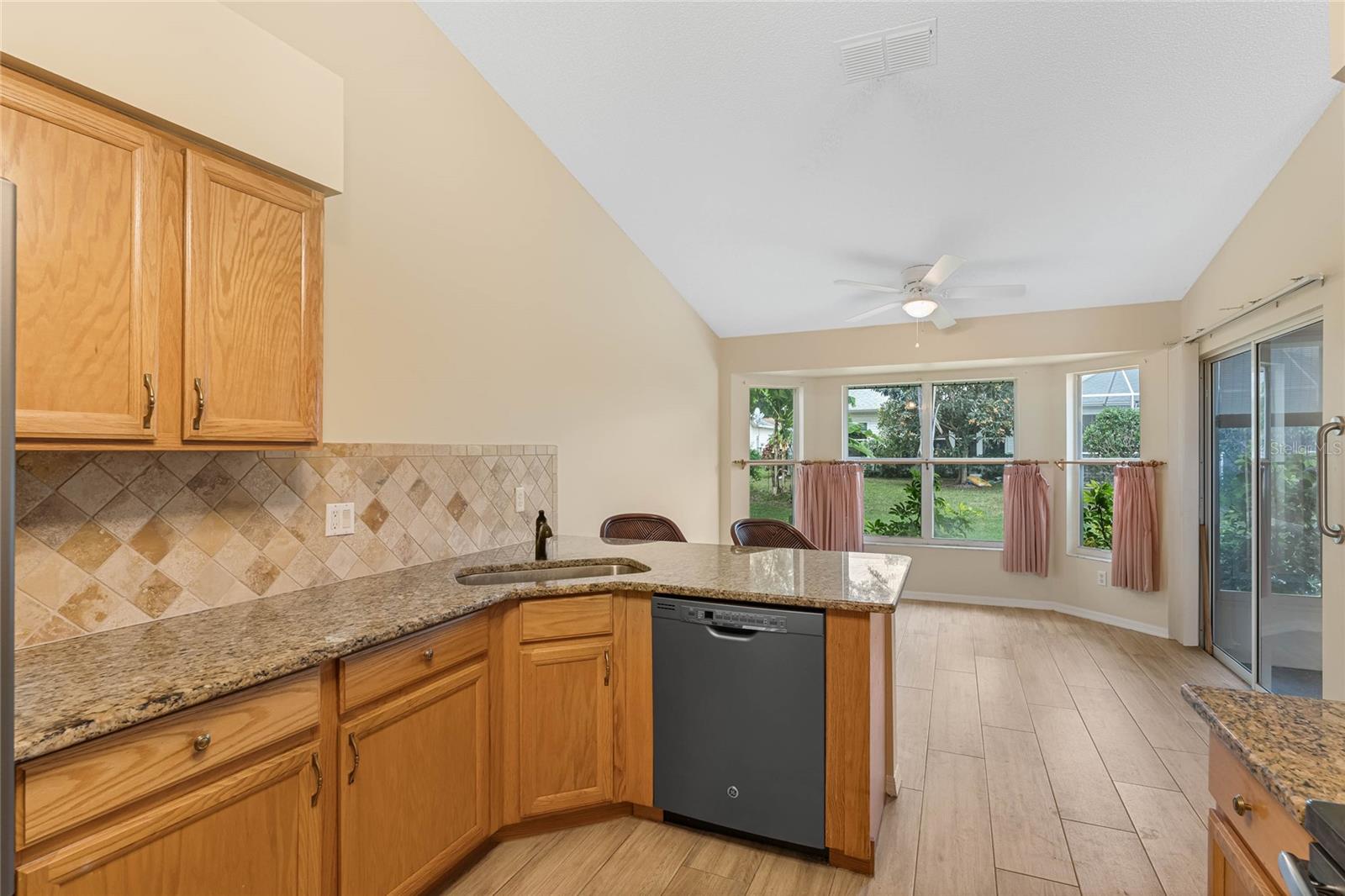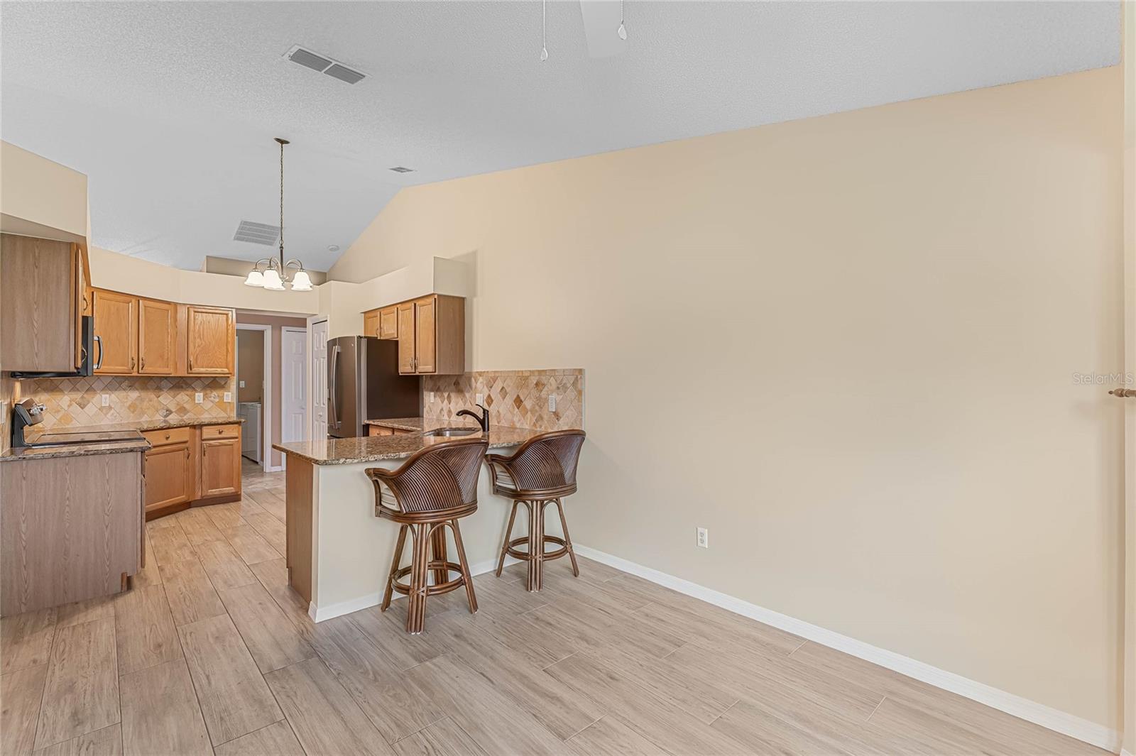 Welcome to your new home! Step inside and discover this exquisite 3-bedroom, 2-bathroom residence, nestled in the sought-after Plantation at Leesburg, an exclusive 55+ golf community. Situated on a spacious corner lot, this home boasts vaulted ceilings throughout, creating an inviting and luminous ambiance as you enter. The recently updated kitchen is a chef's dream, featuring top-of-the-line GE appliances, elegant Granite countertops, ample cabinet space, and a generously-sized dining area perfect for entertaining. Retreat to the master bedroom oasis, complete with dual vanities adorned with Granite countertops, a luxurious garden tub, and two walk-in closets for added convenience. Start your mornings by savoring a cup of coffee on the expansive enclosed lanai, which opens up to a paver patio, ideal for enjoying the Florida sunshine. This home has been impeccably maintained and boasts numerous upgrades! Roof installed in 2016, a state-of-the-art A/C system installed throughout the home in 2020, and water heater replaced in 2019. Pull into the spacious 2-car garage, featuring a motorized garage door screen, via the paver driveway. Indulge in the resort-style amenities offered by the Plantation at Leesburg, including two championship golf courses, three activity centers with over 100 activities, three sparkling pools, two fitness centers, and various recreational facilities such as tennis, pickleball, shuffleboard, and more. Whether you're interested in fishing, woodworking, or simply lounging in paradise, this community has something for everyone. Don't let this opportunity pass you by – make this your ultimate retirement retreat today!