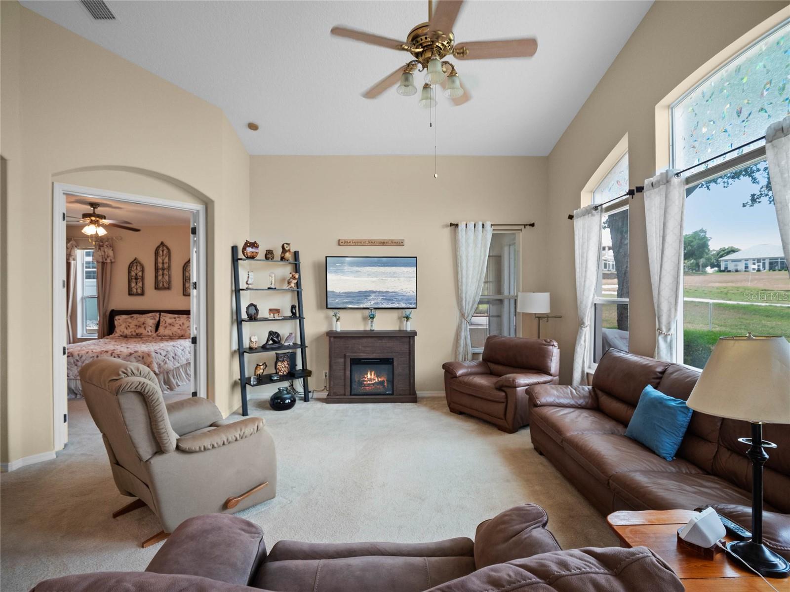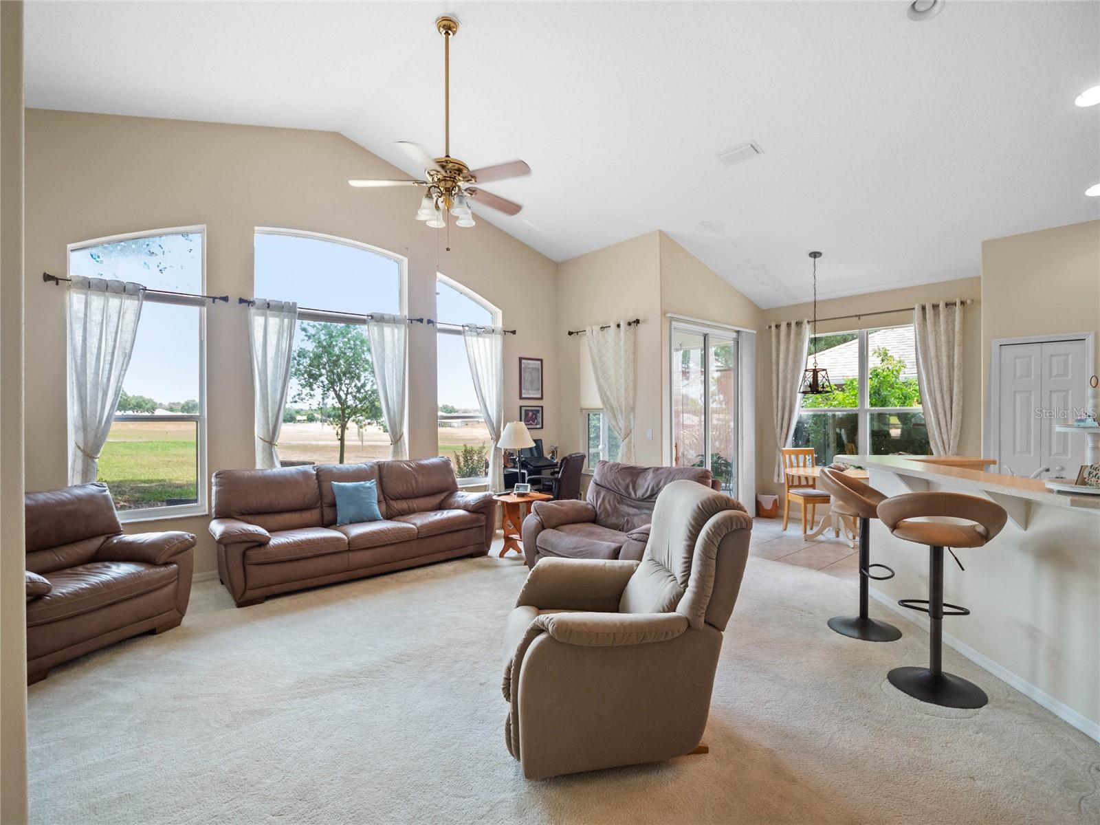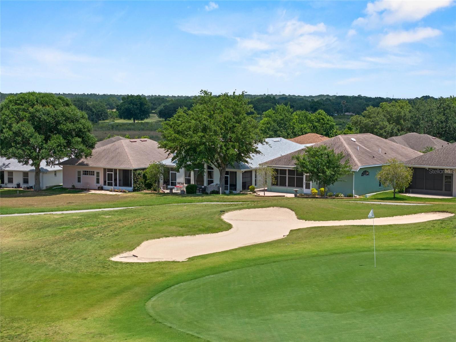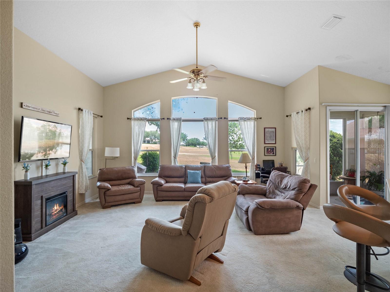 One or more photo(s) has been virtually staged. ***Golf Cart Included in the Purchase!*** Seller offering the buyer a Home Warranty!*** Nestled between the golf course and glorious conservation, with evening sunsets, morning sunrises, it's the perfect place to call home. This 3/2/2+ with golf cart parking, block & stucco Edinborough Model home sits on one of the rolling hills in the sought after 55+ golf community of Royal Highlands. You'll enjoy the vast views of the 16th fairway and green, one of the best course views in the community! Offering 1808sf. of under-air living area and two screened lanai's where you can relax and kick your feet up. Between the two lanai's is a open patio where you can grill and sip wine with visiting friends. The perfect oasis! Inside, the kitchen overlooks the large living room & dinette, with vaulted ceilings. This home has so much natural light thanks to the large windows. Formal dining is featured in this adorable home, along with two guest suites, and a large primary bedroom which includes a sitting or reading nook! Ensuite primary bath lends it owners dual vanities, garden soaker tub, step-in tiled shower, and private commode. If large closets are a must, this one should be on your touring list! Lastly, owners will love the inside laundry, transferrable termite bond, and architectual design with high ceilings and door arches. Brand New 2023 Roof! 2020 HVAC! Call for your tour today! Royal Highlands is centrally located in Lake County, Florida with two pools, fitness center, courts, fishing, crafts, clubs, and activities. Meet your neighbors for dinner at the campus restaurant or grab a bucket of balls and hit the driving range. Close to MCO, shopping, restaurants, medical professionals and entertainment! Come see what retirement living is all about!