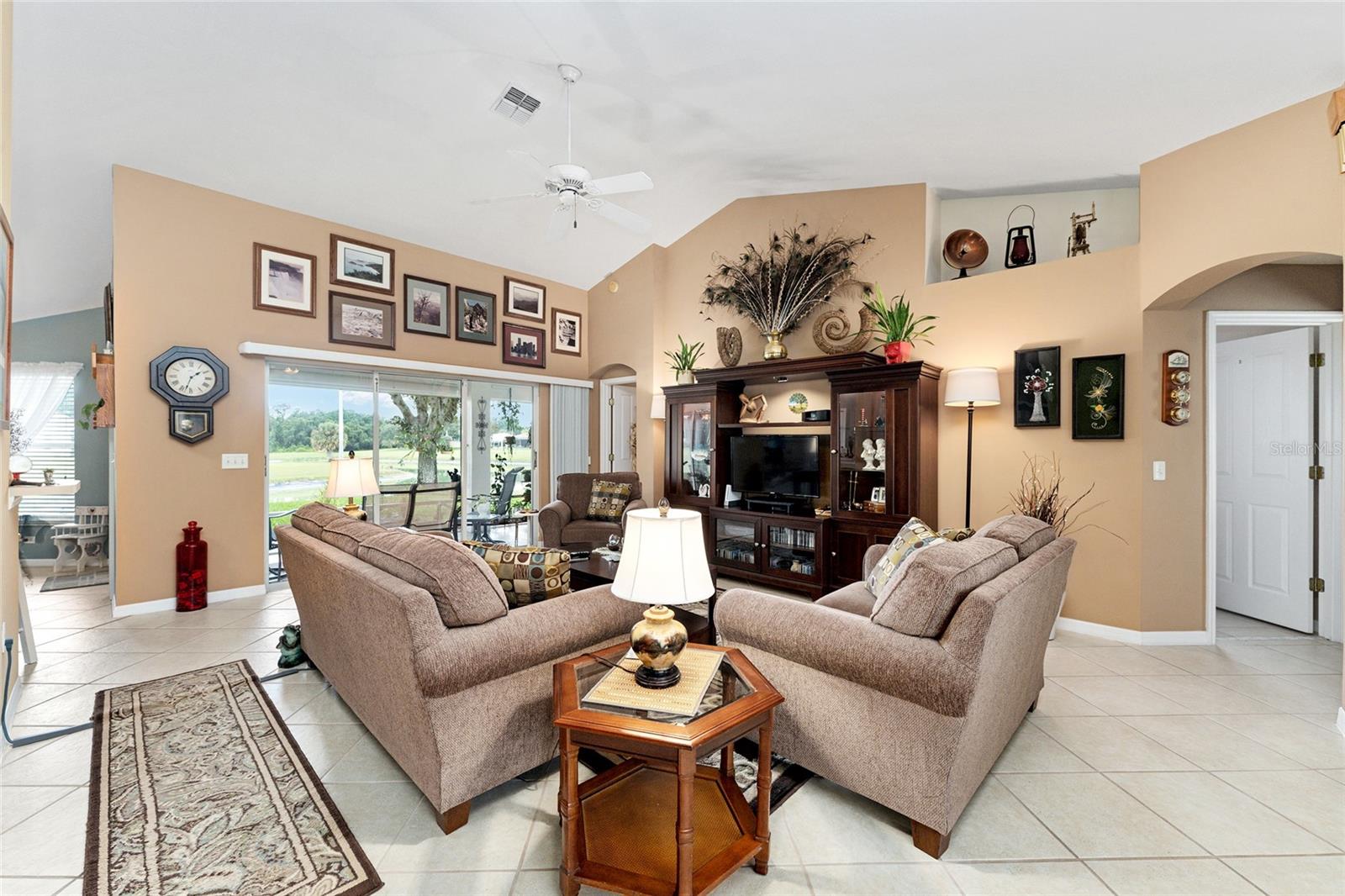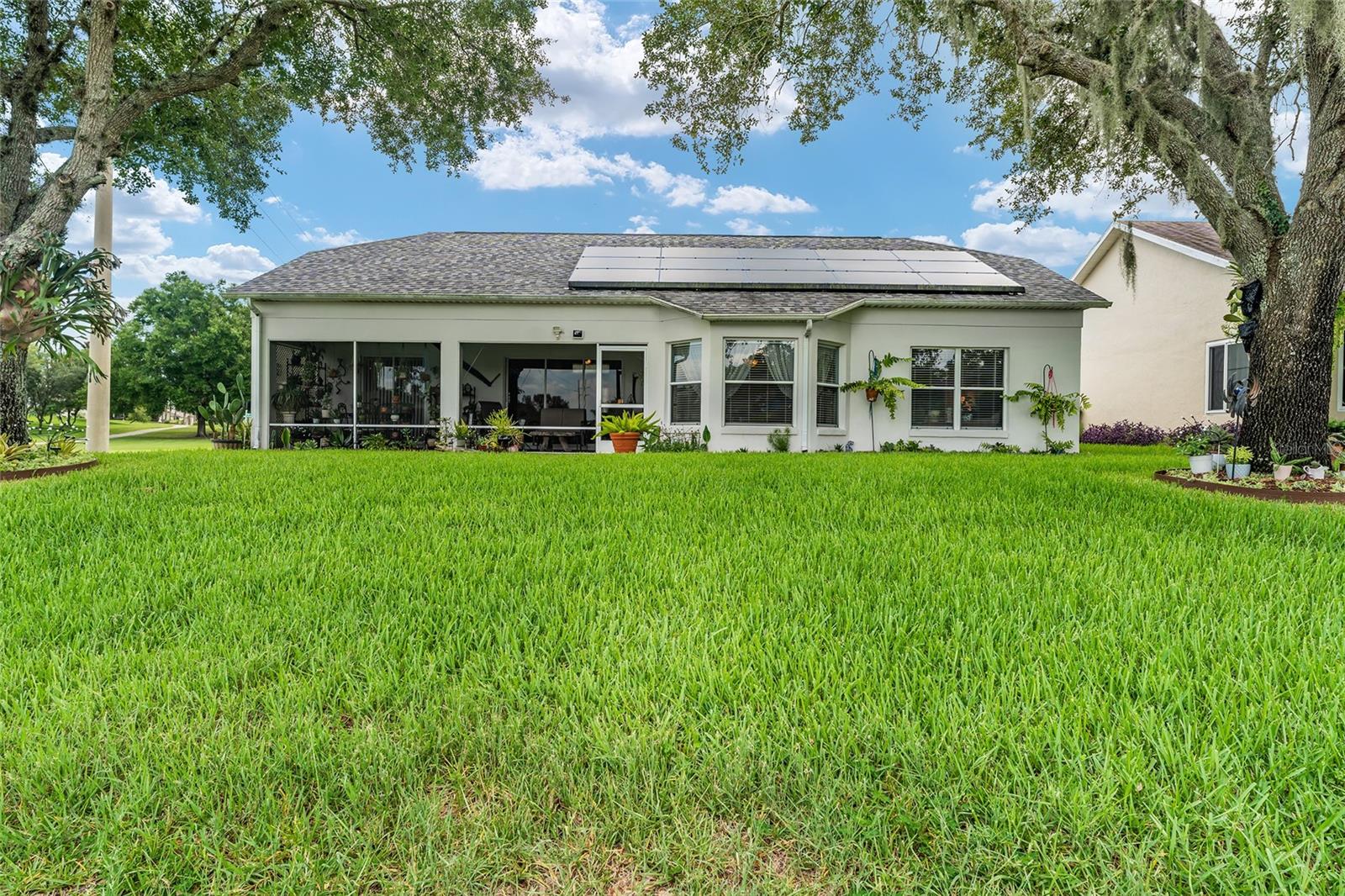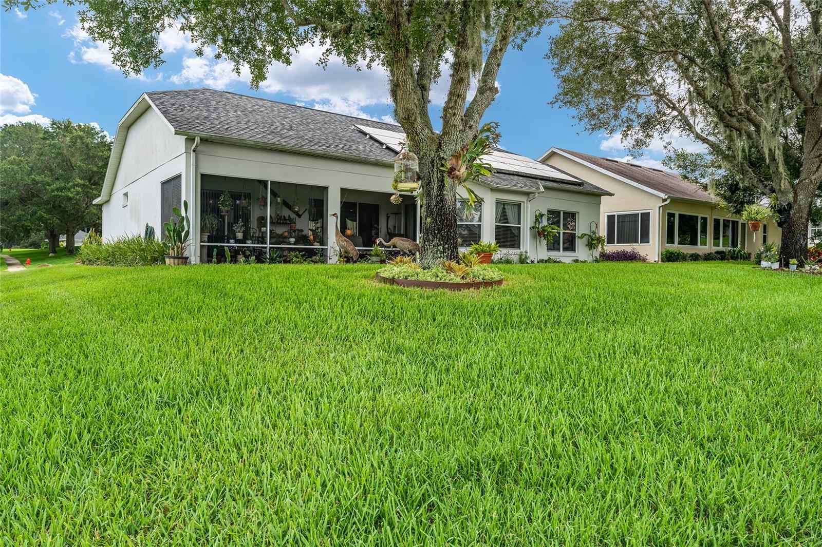Welcome to your next home! This 3 bed / 2 Bath split plan home has all the features you will enjoy while living here at this Premier Resort Style Community at Legacy! This Home is perched on it’s own berm overlooking the Nature View Trail and the Nature View Pond In this Nature Lover’s Paradise. There are no neighbors behind or to the right ensuring unobstructed views from your backyard Lanai which is a perfect spot for your morning coffee or the evening glass of wine. Your new home is a short walk away from the Clubhouse and all the Amenities such as a the beautifully appointed Library, Billiard Room, Pickle Ball, Gym, Exercise Classes, Tennis, Shuffleboard, Bocce and over 20 miles of Walking Trails! The Resort Pool at the Clubhouse will also be a place you will frequently enjoy as you cool off after reading a nice book and soaking up the Florida sun. Upon entering the house you are welcomed to a large open plan living room with Cathedral Ceilings. The view goes straight through to the back of the house and Lanai. This open floor plan includes the Well Designed Kitchen and open counter that flows out into the dining area which connects to the Lanai. The Master Bedroom Suite has vaulted ceilings and a Walk In Closet. The connecting bath to the master has a large Soaking Tub and separate enclosed shower. The counter and vanity area of this master bath also has Two Sinks. The floors in the home are all tiled except for the bedrooms which have carpet. Across, and to the other side of the living room area, there is a separate Guest Bedroom and adjacent Guest Bathroom with a tub / shower. This floor plan provides comfort and privacy when your guests visit.. and they will ! Along this side of the home is another room which can serve as an additional Bedroom or in the case of the present owners, an exceptional Craft Room / Office which looks out to the back yard view. All Kitchen Appliances convey as well as the Clothes Washer and Dryer which are in the Inside Laundry. There is a two car garage with ample storage space. The Gas Powered Hot Water Tank and Trane HVAC have been well maintained and are in working order. The Roof and Bonus Solar System are new and keeps your electric bill to the minimum. This location at Legacy is within a mile of all your shopping needs with restaurants galore and there is a new Orlando Health South Lake Hospital ER complex within 3miles. The ride to Orlando is 45 minutes and to the MCO Orlando airport it’s a comfortable 55 min drive via the turnpike. Are you a couple or an individual looking for an active lifestyle in Florida? Come on home and make this beautiful place your own and enjoy what the original owners have enjoyed for so many years here at Legacy in beautiful Lake County Florida.
