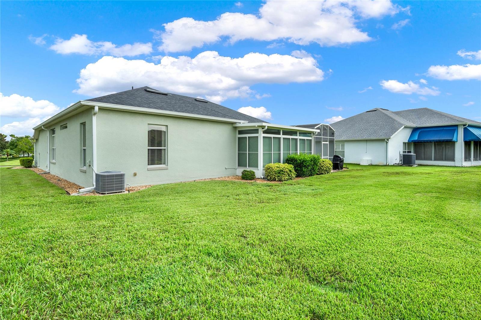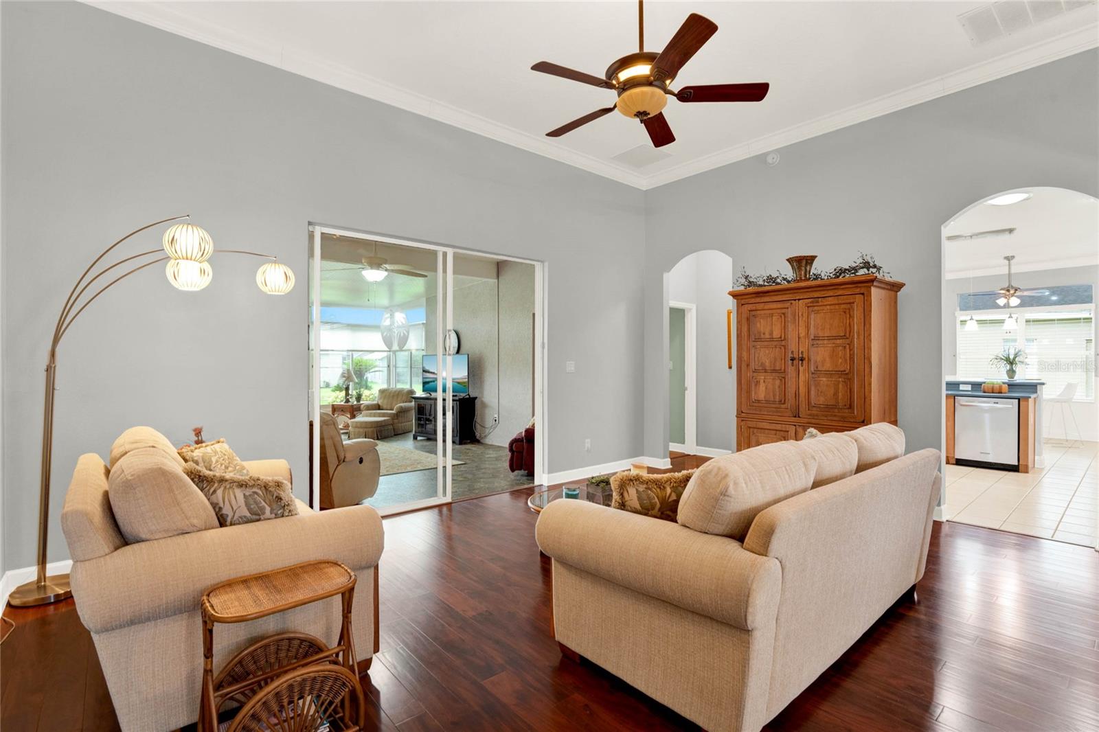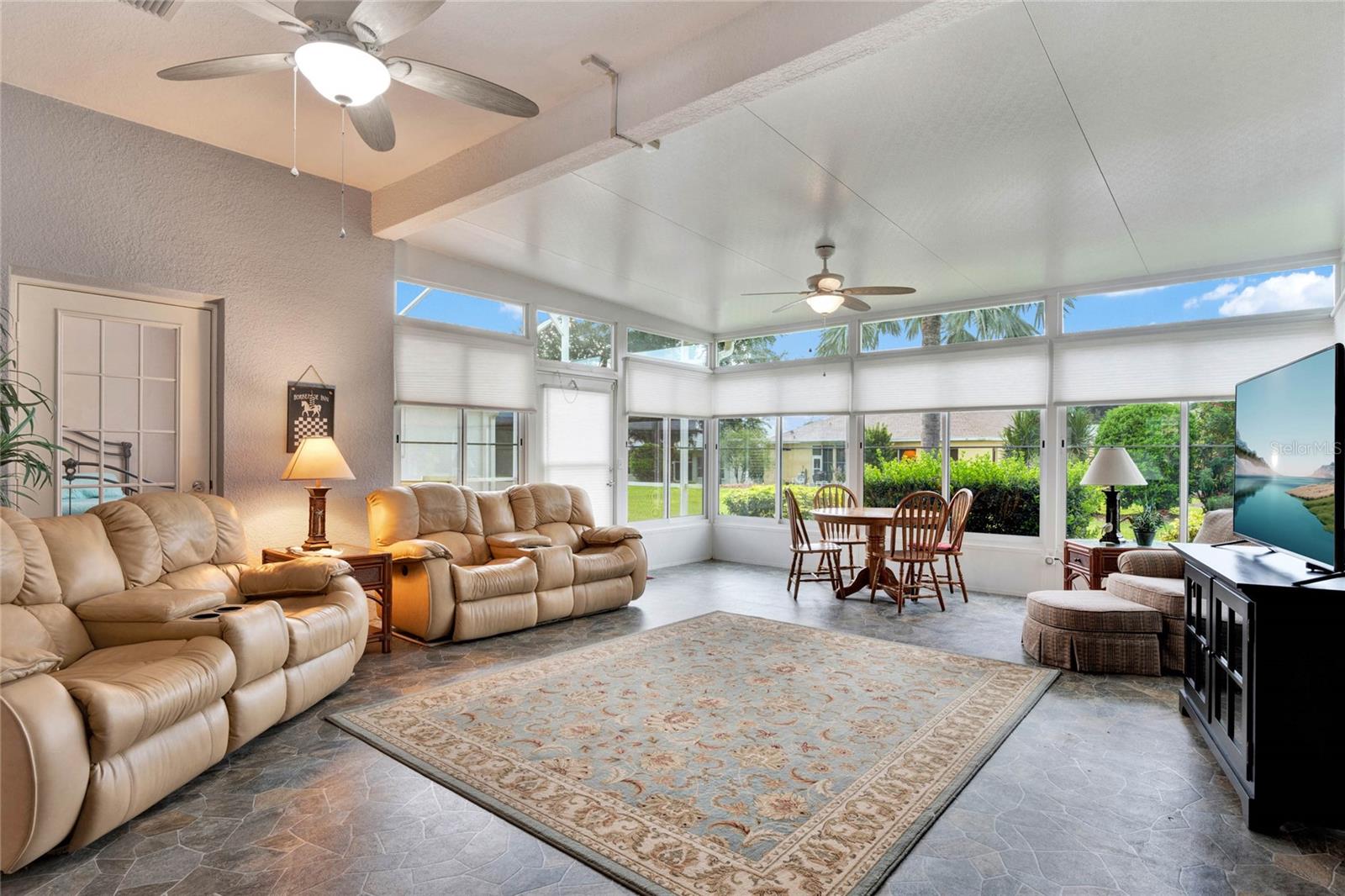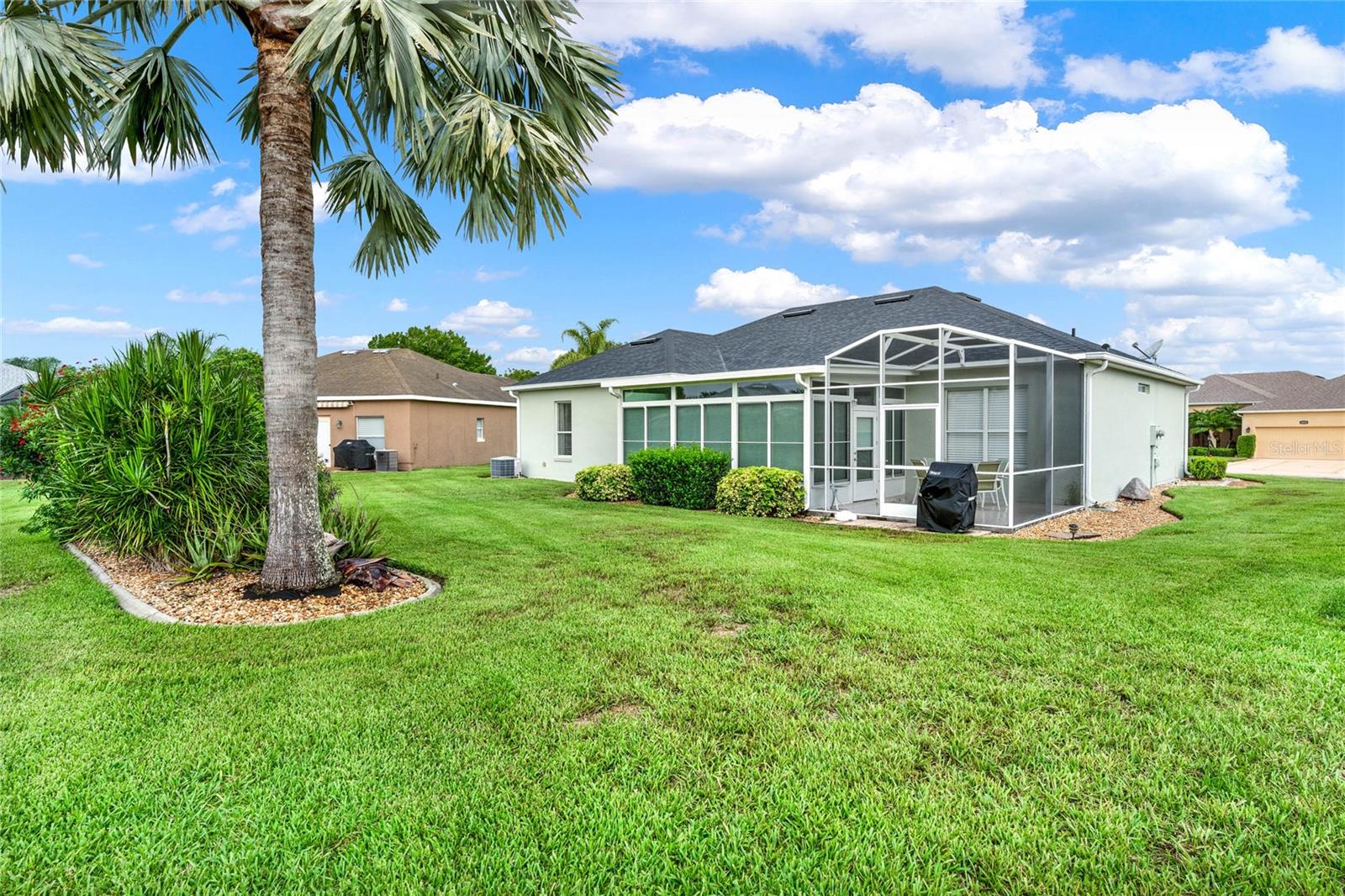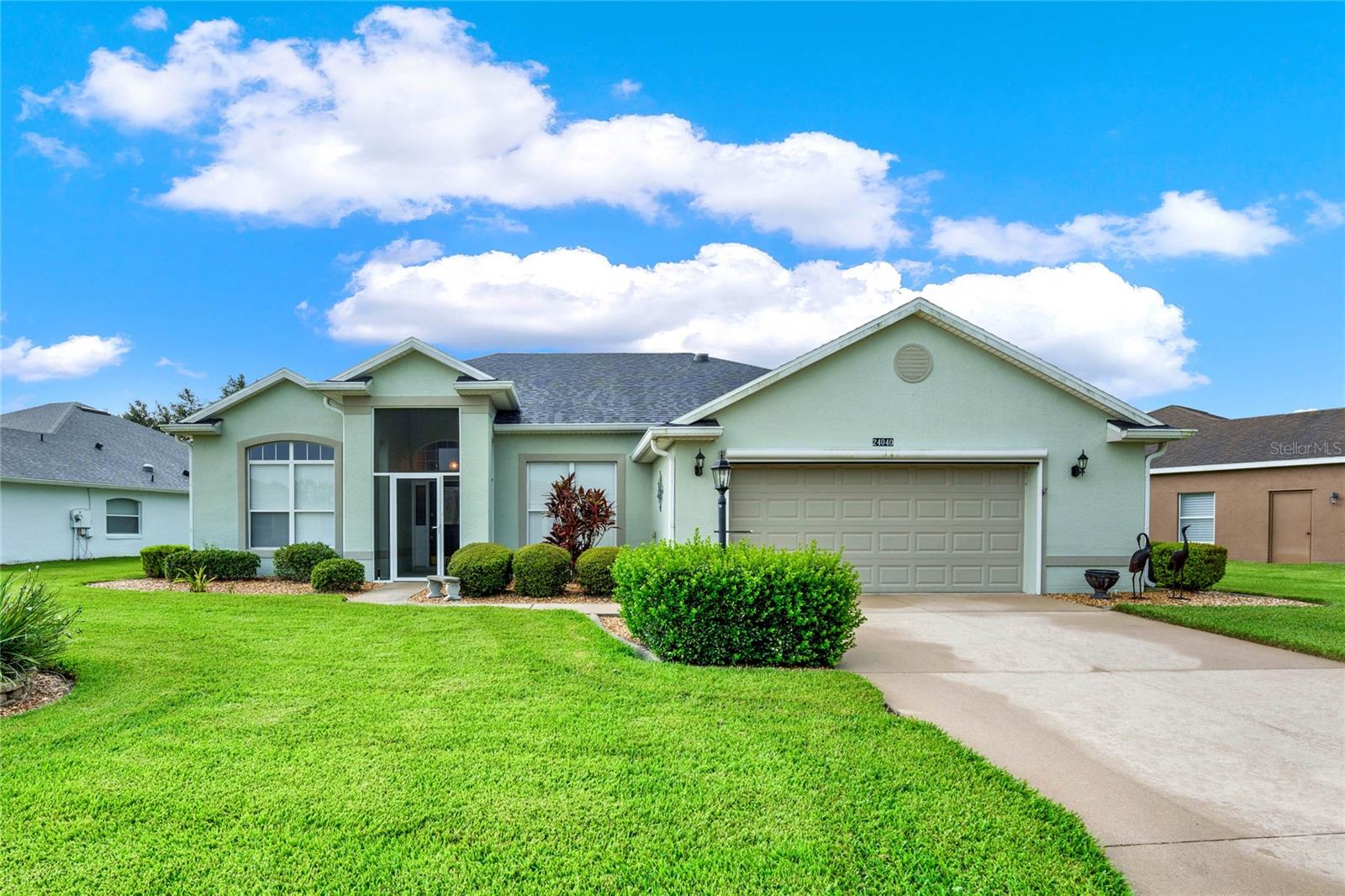 When you arrive to the 2 bed plus den 2 bath home you’ll immediately be impressed with the lush landscaping and open green space on this oversized lot. Enter through a screened entry to over 2,300 square feet of well-appointed living space, , arched entryways, crown molding and Florida sunshine filling the home. The kitchen includes Corian countertops, stainless steel appliances, tiled backsplash, eat-in bar with pendant lighting and adjacent breakfast nook. Extend your entertainment into the recently renovated and spacious Florida Room overlooking the beautifully landscaped backyard. The master suite includes a sitting area and oversized walk in closet and the master bath with dual split vanity, cultured marble countertops and glass enclosed walk-in shower. The den can be used as a hobby room, office, or can be used as a third bedroom. Oversized garage with electronic screen has 2 pull downs for attic access that gives you plenty of storage. Located close to the south entrance for added convenience. The Plantation at Leesburg offers 24 hour guard gated security with endless amenities for 55+ residents. Three clubhouses and two 18-hole golf courses offer something for everyone. Amenities include 3 pool areas, hot tub, pickleball, a softball field with men and women’s community teams, tennis, bocce ball, archery range, and much more. This community also features the on site restaurant so you can stay close for great food and drinks. HOME COMES TURN KEY FURNISHED INCLUDING A 4 SEATER GOLF CART