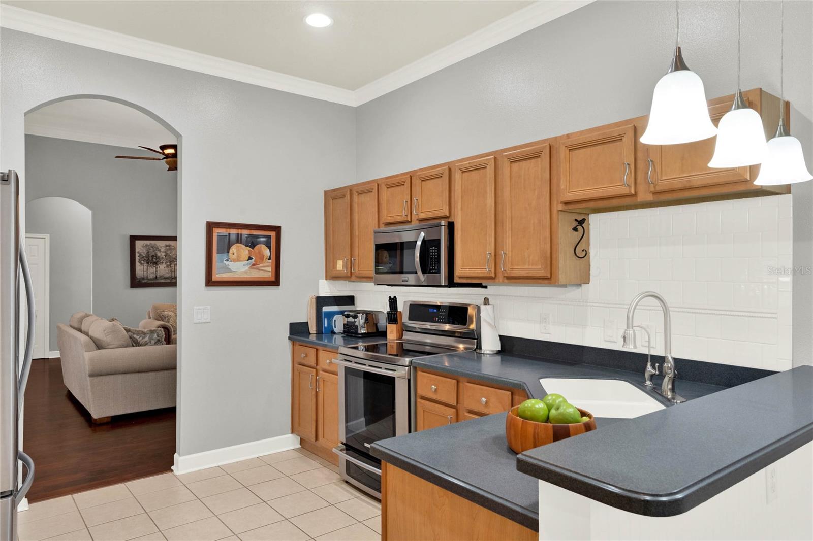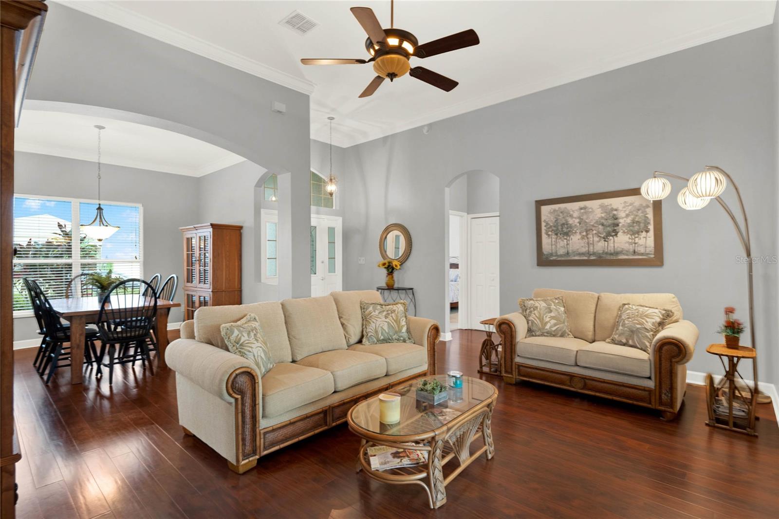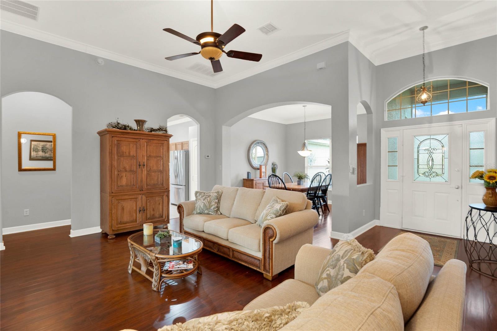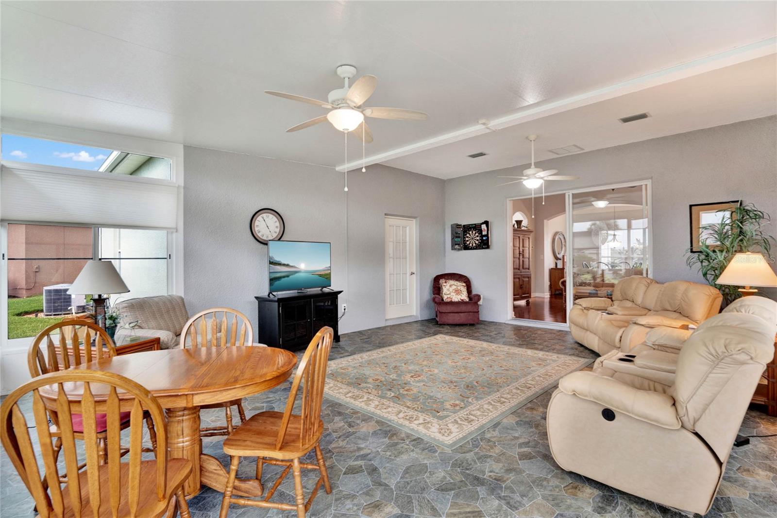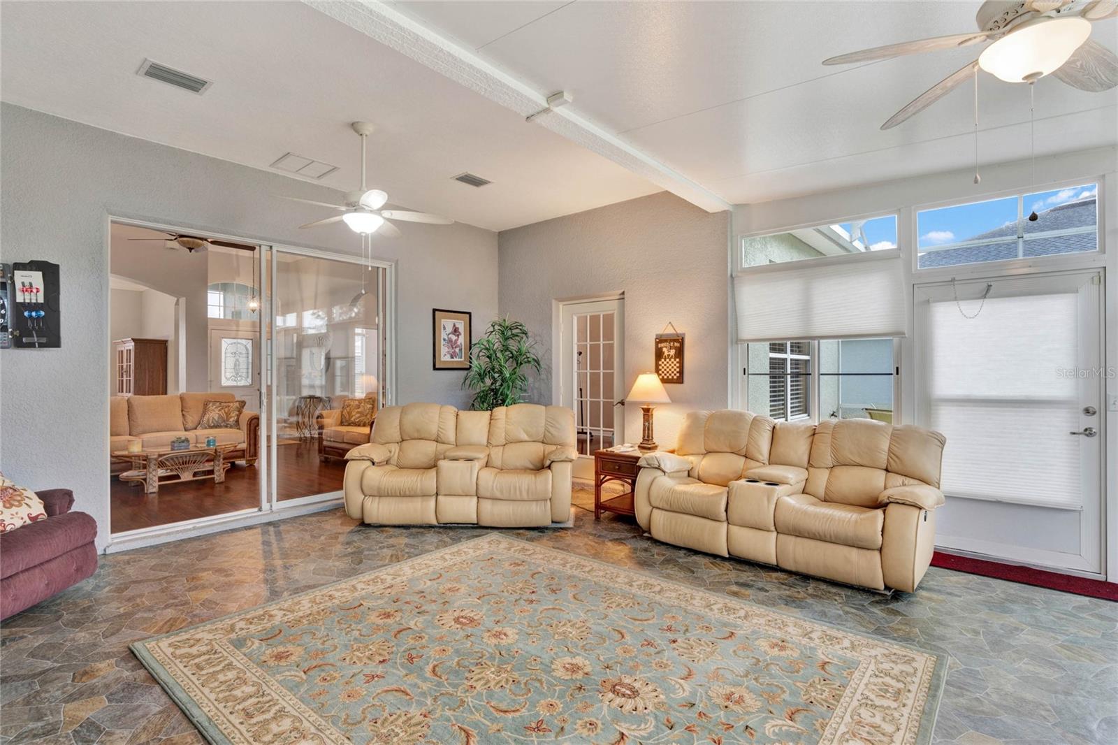 When you arrive to the 2 bed plus den 2 bath home you’ll immediately be impressed with the lush landscaping and open green space on this oversized lot. Enter through a screened entry to over 2,300 square feet of well-appointed living space, , arched entryways, crown molding and Florida sunshine filling the home. The kitchen includes Corian countertops, stainless steel appliances, tiled backsplash, eat-in bar with pendant lighting and adjacent breakfast nook. Extend your entertainment into the recently renovated and spacious Florida Room overlooking the beautifully landscaped backyard. The master suite includes a sitting area and oversized walk in closet and the master bath with dual split vanity, cultured marble countertops and glass enclosed walk-in shower. The den can be used as a hobby room, office, or can be used as a third bedroom. Oversized garage with electronic screen has 2 pull downs for attic access that gives you plenty of storage. Located close to the south entrance for added convenience. The Plantation at Leesburg offers 24 hour guard gated security with endless amenities for 55+ residents. Three clubhouses and two 18-hole golf courses offer something for everyone. Amenities include 3 pool areas, hot tub, pickleball, a softball field with men and women’s community teams, tennis, bocce ball, archery range, and much more. This community also features the on site restaurant so you can stay close for great food and drinks. HOME COMES TURN KEY FURNISHED INCLUDING A 4 SEATER GOLF CART