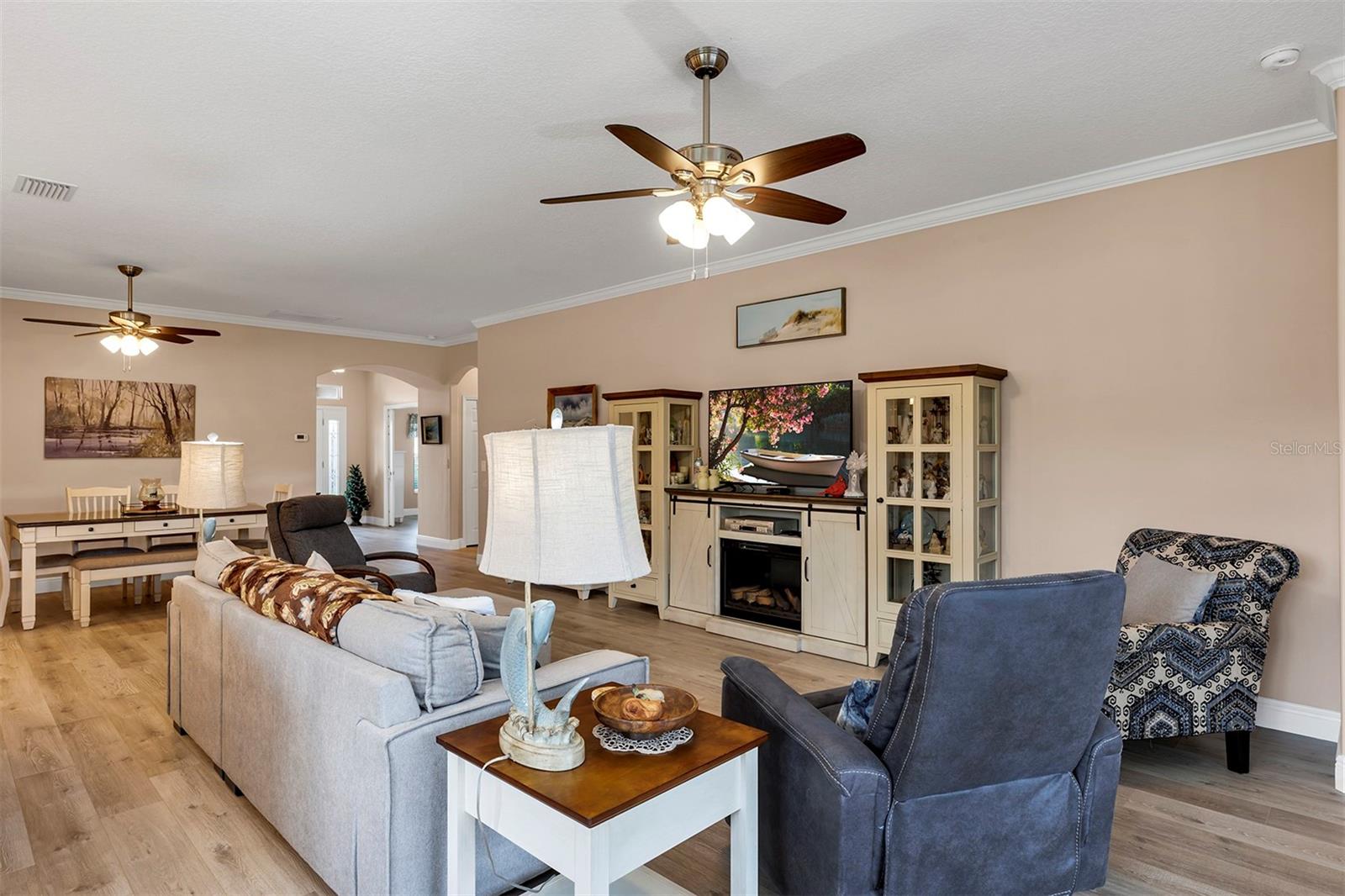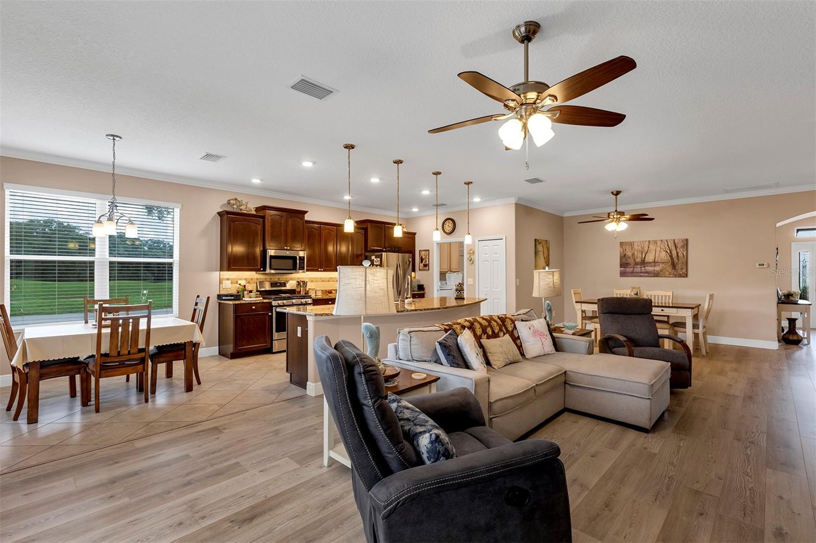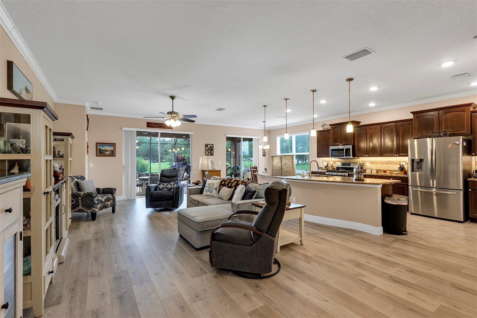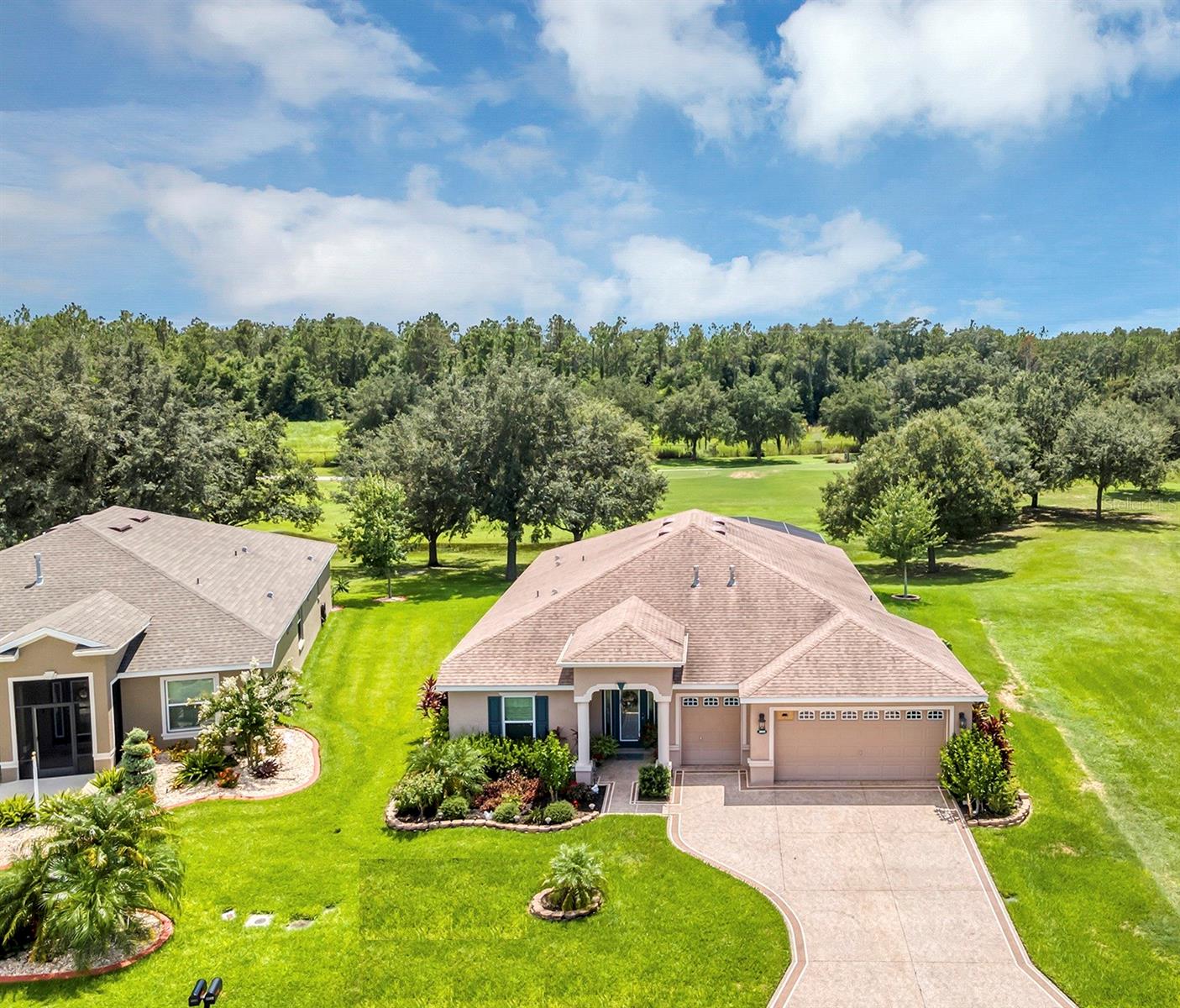 Affordable Golf-Front, Pool Home living in a Guard Gated Active Adult Golf Community. Discover a lifestyle of comfort and leisure you've waited for your whole life for in this charming golf-front, pool home located in the popular, high-demand Arlington Ridge Guard Gated Golf Community With a low HOA of $117 per month, Built in 2018, this 3 bedroom 2 bath 2,001 square foot home with 2 Car + Golf Cart Garages. Home boasts modern design and low-maintenance stucco construction, open-concept floor plan and 9 foot ceilings enhance the sense of space and inviting atmosphere and overlooks the golf course. This modern design has rounded corners on sheetrock, all hard low-maintenance flooring consisting of NO CARPET only tile and BRAND NEW! luxury vinyl plank flooring throughout the home. Kitchen is open to great room w/ high ceiling & crown molding and dining room are perfect for entertaining and features ample wood cabinetry, granite counters, Large Vanda style bowed island with bar-top and abundant natural light. The range and fridge are included. The master bedroom offers trayed ceiling a scenic view of the golf course and features an en-suite bath with dual vanities w/ granite tops, a walk-in Roman shower, walk-in closet, and a private water toilet closet. A 900+ s.f. screened lanai and hard to find private lot overlooking the golf course are perfect for entertaining or simply relaxing with room to add a year round outdoor kitchen. Watch your spouse and friends golf while enjoying your favorite drink. The backyard is private, no golfers in your backyard If you're looking for paradise, You've found it. Benefit from huge discounts on homeowner's insurance due to the home's high construction standards being built to wind code, high elevation for flood protection, and a low wind zone, also qualifying for additional insurance discounts. The low HOA of $117/month includes, Wi-Fi router for signal coverage throughout the home, 200+ cable TV channels, and 250-megabyte high-speed internet. Two DVRs are also included for recording your favorite shows which is all included in the low HOA of $117/month making this community even more affordable than nearby communities This sought-after community offers a range of amenities, including an 18-hole golf course where you can get a tee time year round, driving range, putting greens, lighted tennis and pickleball courts, heated swimming pools, hot tub, fitness facilities, billiards, a restaurant, tavern, and a free movie theater. The community is golf cart-friendly, with sidewalks for strolls and low-speed limit streets perfect for bicycling. Enjoy the convenience to grocery stores, restaurants, banks, and pharmacies within a 5-minute drive. Emergency services are just 10 minutes away, and a free boat ramp and fishing pier on a 15,000-acre lake are nearby. Community is 20 minutes from malls, restaurants, and a 12-screen movie theater, 45 minutes from Orlando, Major theme parks, and the airport, 90 minutes to Daytona Beach & Atlantic Ocean and Gulf of Mexico Clearwater SJS 2024©