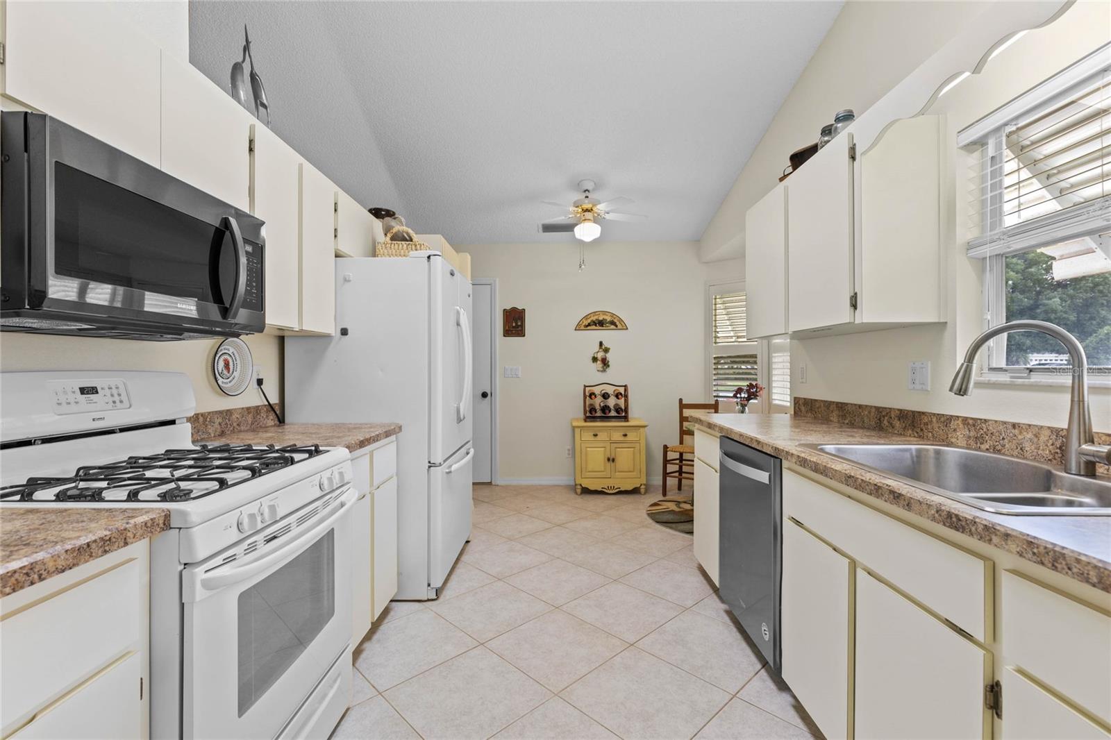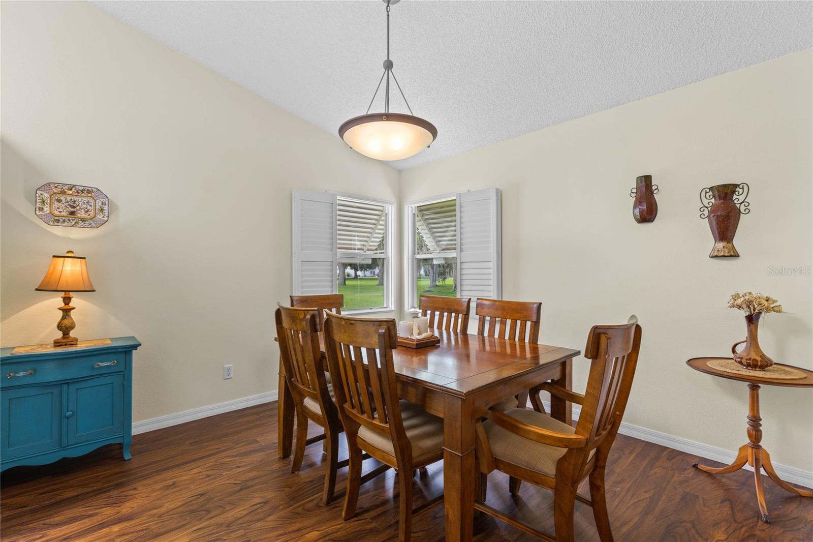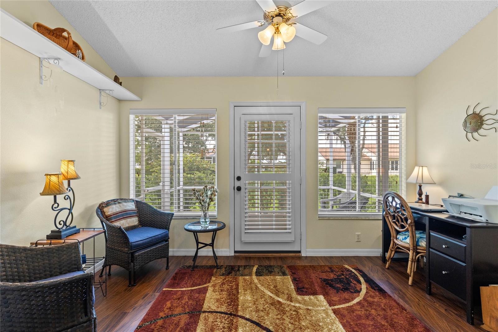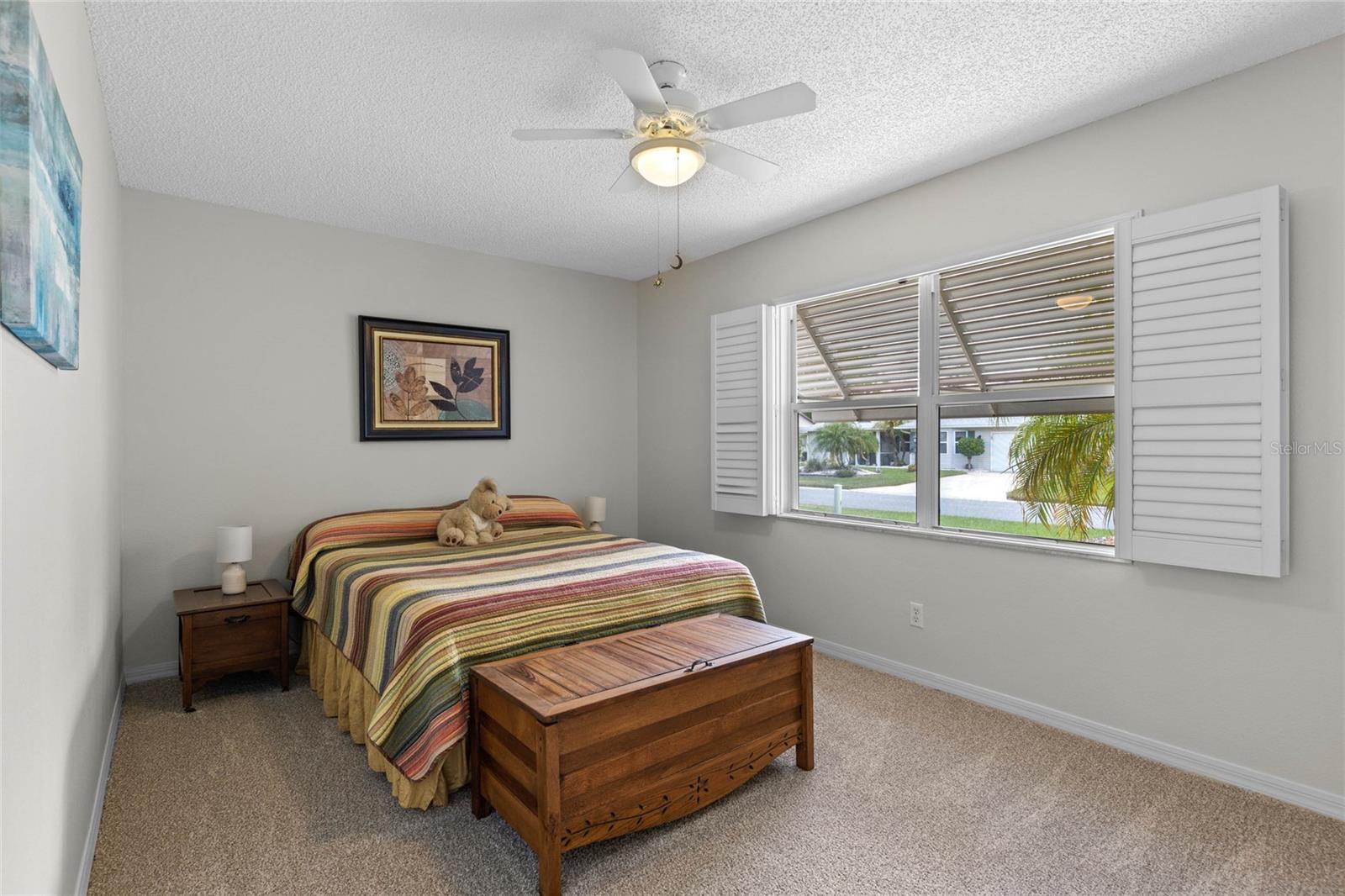 Nestled in a desirable neighborhood on a quiet dead-end street, this 2-bedroom, 2-bathroom home offers 1,418 square feet of living space, a 2-car garage with a privacy screen, and a range of premium features. To include an HVAC system installed in 2014 and a roof replaced in 2017, while the interior boasts wood laminate flooring in the living room, dining room, and bonus room. The galley kitchen features a breakfast nook, bay window, and closet pantry with pull-out shelving, as well as a gas range and French door-style refrigerator. Additional highlights include a formal dining room with interior plantation shutters and a bonus room ideal for use as a craft room, office, or additional sitting area; hurricane shutters to boot!