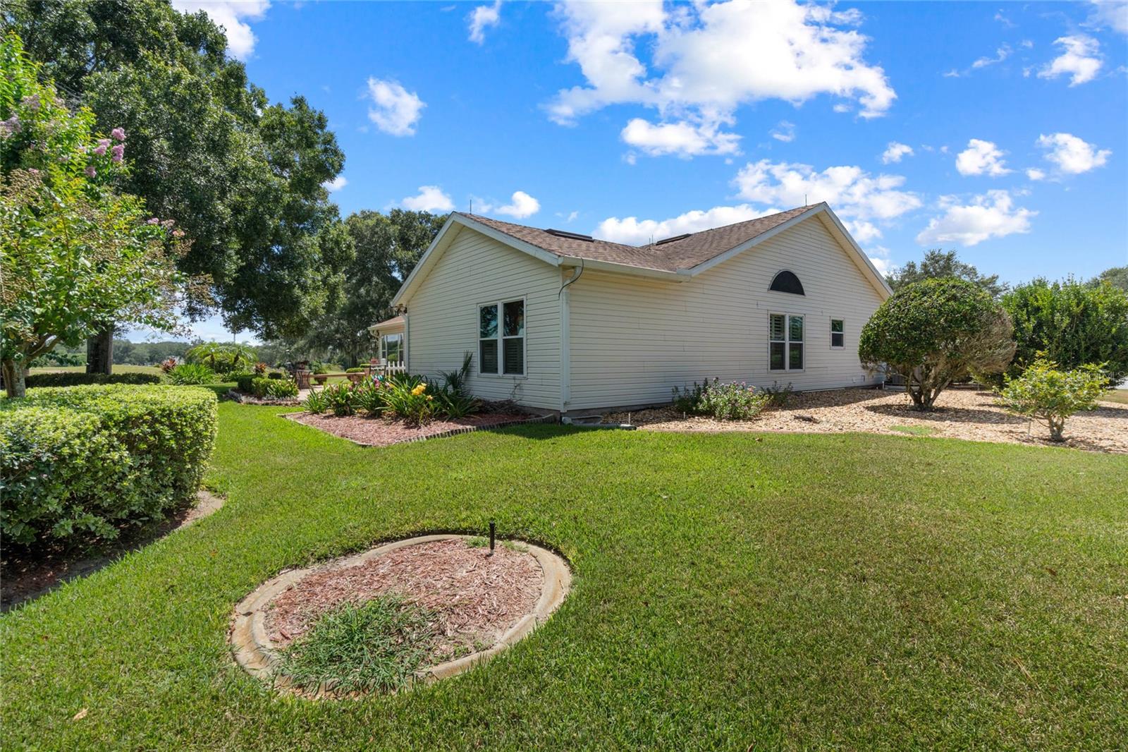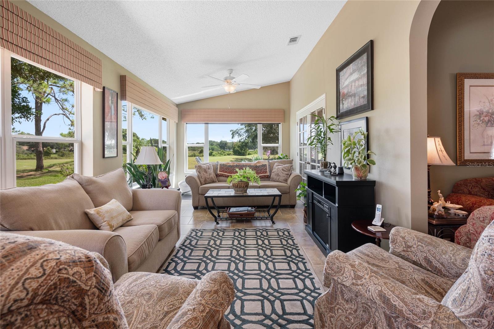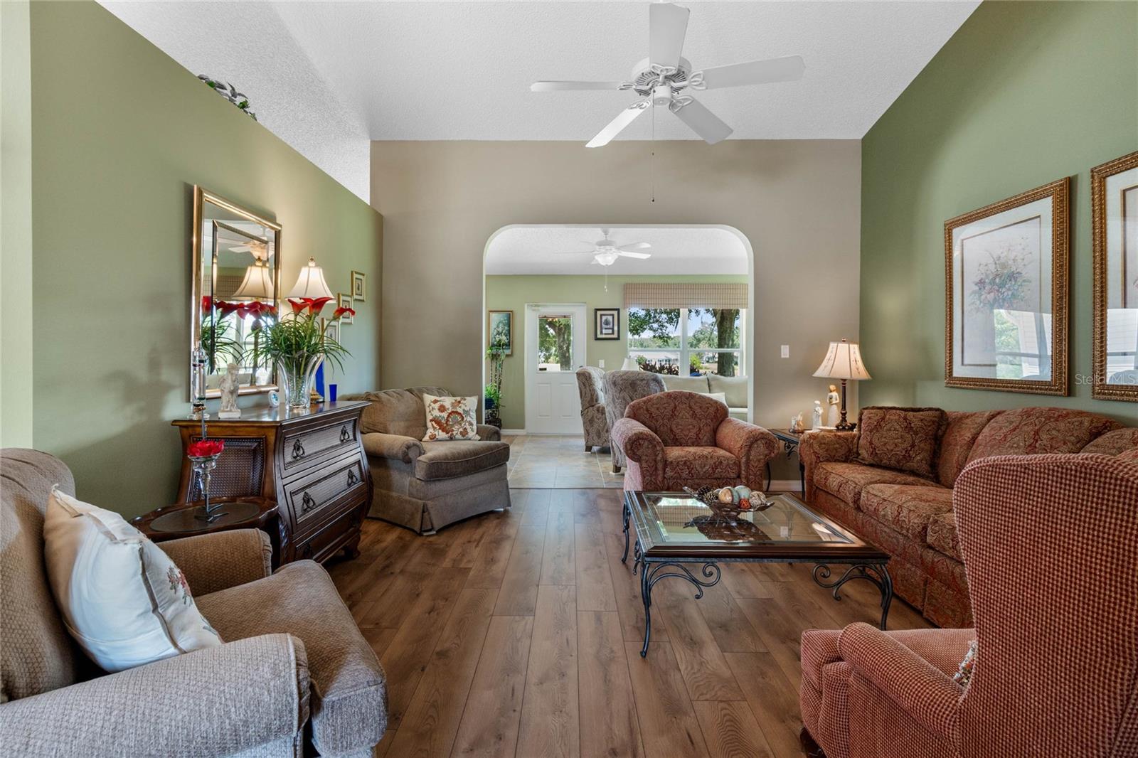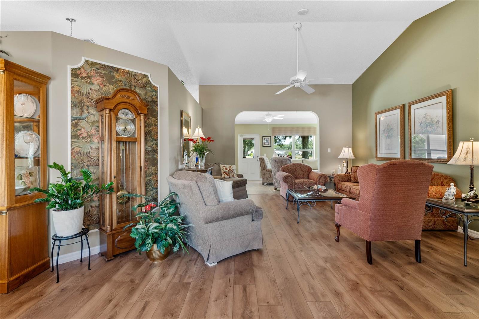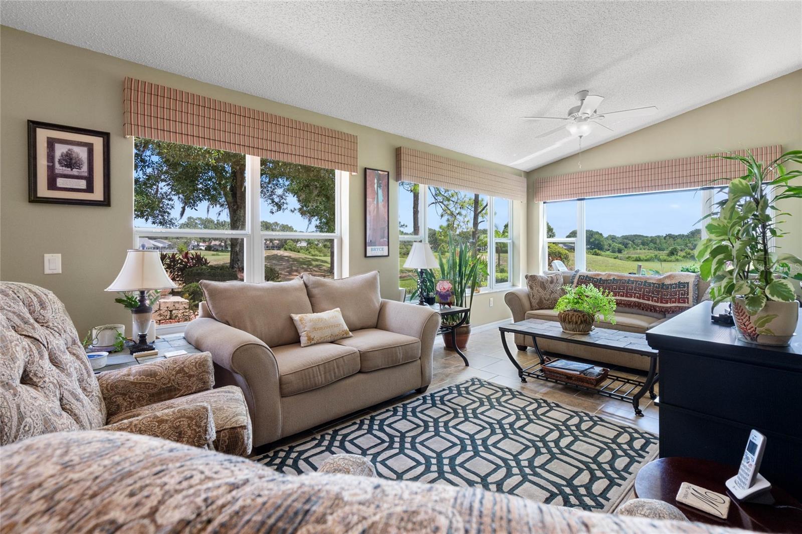 Stunning GOLF VIEW HOME, located on the FIRST HOLE of the popular, CRANES ROOST golf course. This house has been modified and expanded from the Great Spruce, and PREVIOUSlY A MODEL HOME! ***Be sure to check out the 3D TOUR above*** The home offers breathtaking golf course views and unparalleled privacy. The long approach paved driveway along with being tucked away in a cul-de-sac, creates minimal through-traffic and ample parking options. You will appreciate the upgraded and established landscaping with stone bordered beds. NO CARPET, featuring easy-care German-engineered SOLID WOOD FLOORING throughout, ensuring a seamless flow from room to room. This home boasts a range of updates and upgrades, including all new windows (2012), a NEW AC system (2023) with SANITIZER, a full WATER FILTRATION system, and FULL HOME GROUNDING RODS (2023). Additionally, a TRANSFERABLE TERMITE BOND provides added peace of mind. The redesigned CUSTOM KITCHEN is a chef's dream, showcasing GRANITE countertops and custom-built SOLID WOOD CHERRY CABINETS. Offering a NEW MICROWAVE, CONVECTION STOVE and DISPOSAL along with LOTS OF DRAWERS, PULL-OUT CABINETS, and a separate pantry with additional custom storage, this kitchen is perfect for both daily living and entertaining. Enjoy game day or host gatherings with ease as the kitchen opens up to the family room, dinette, and a Florida room with miles of gorgeous views. The primary suite is a spacious retreat, easily accommodating a king-size bed and offering an ensuite bathroom with DUAL SINKS, a soaking tub, and a walk-in shower. Bedroom two is versatile and could serve as a secondary primary suite, complete with its own private ensuite—ideal for guests or a mother-in-law suite. Bedroom three is perfect for a home office or flex space, and an additional half bath is conveniently located for guests. Plus, an inside laundry room adds to the home's functionality. The Plantation at Leesburg is a 55+ community that offers two full size golf courses, 3 clubhouses; all with heated pools, tennis, pickleball, pool tables, darts and a huge list of activities each and every month that will keep you moving and having fun. You can enjoy a good game of softball and hotdogs at the pavilion on game day. Whether it is bocce ball, shuffleboard, or horseshoes, you will never run out of things to do at the Plantation. The life you have waited your whole life for is just minutes away from major hospitals and shopping. Easy access to the parks and airport. This exceptional property combines elegance, functionality, and comfort, making it a true gem in the community. Don't miss your chance to make this beautiful house your new home! Call today for your personal tour!
