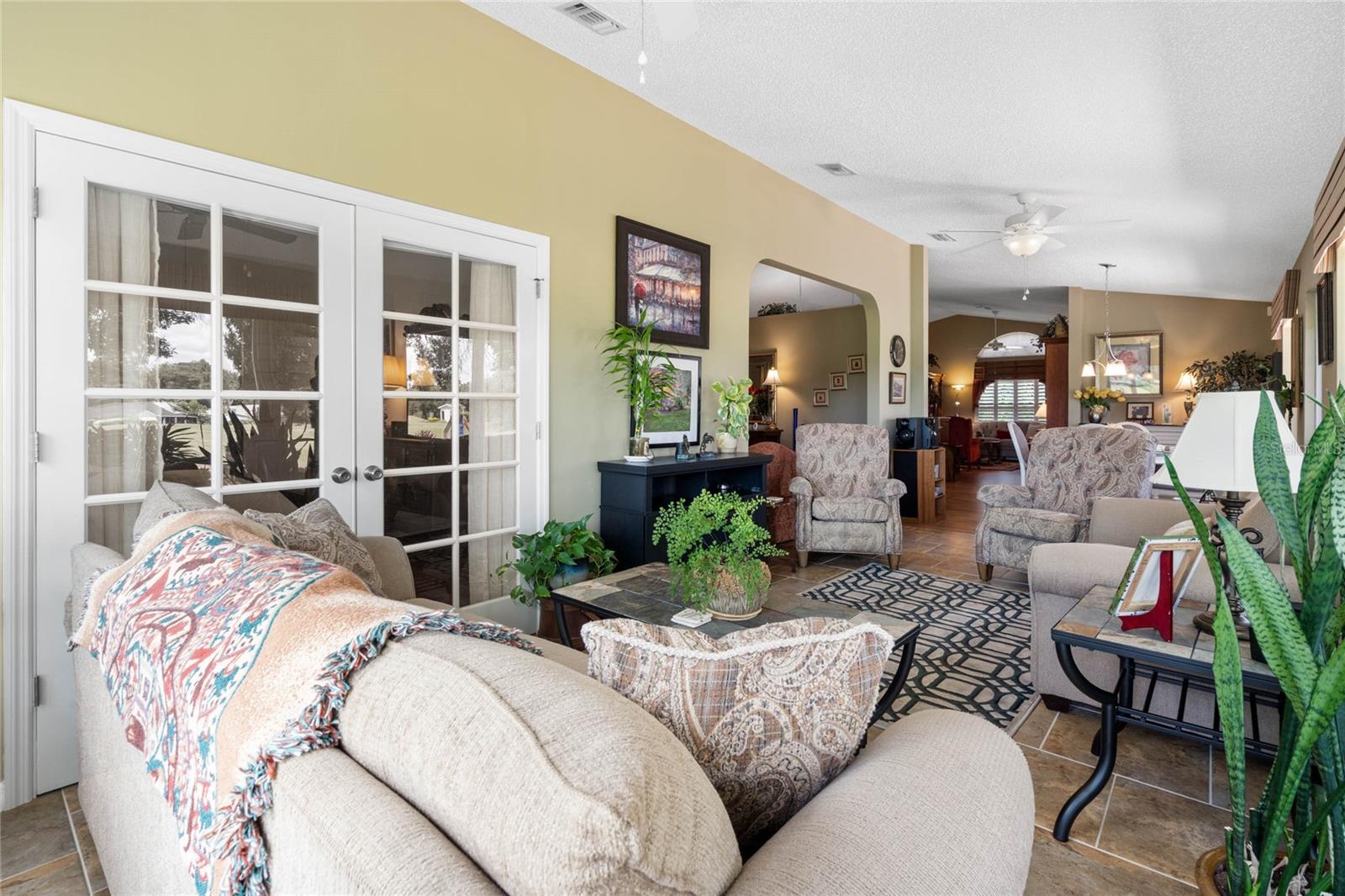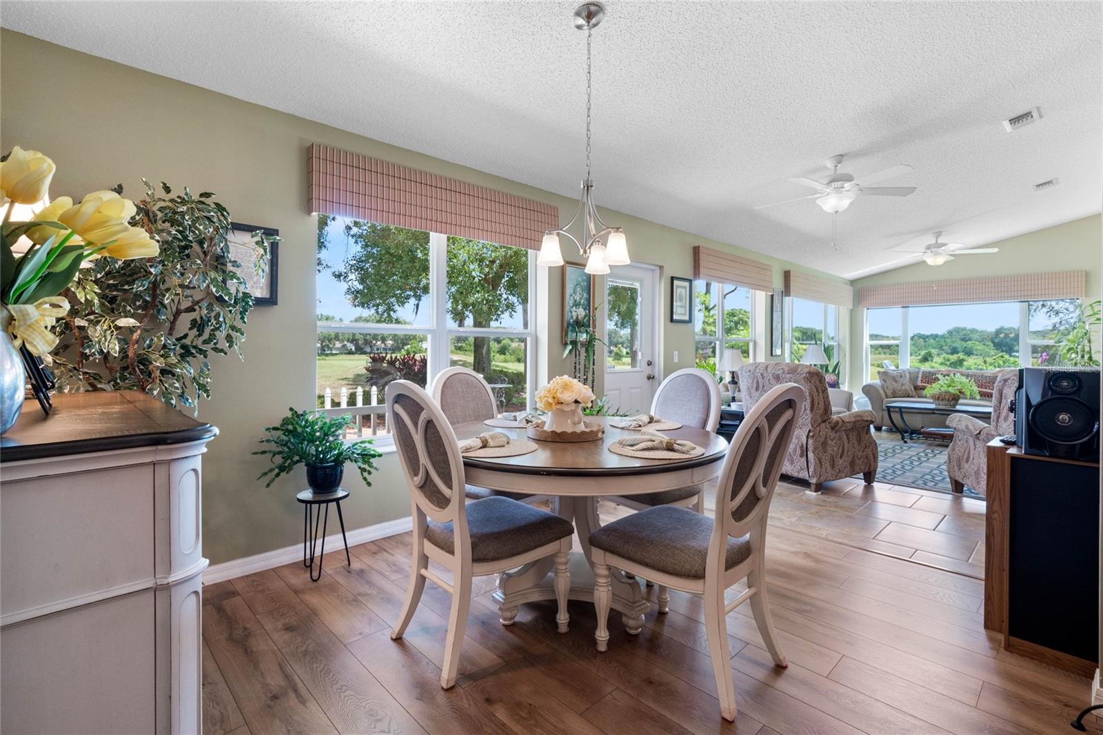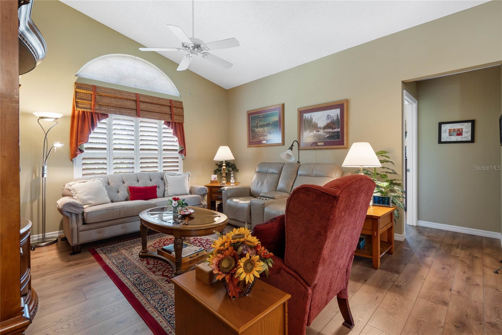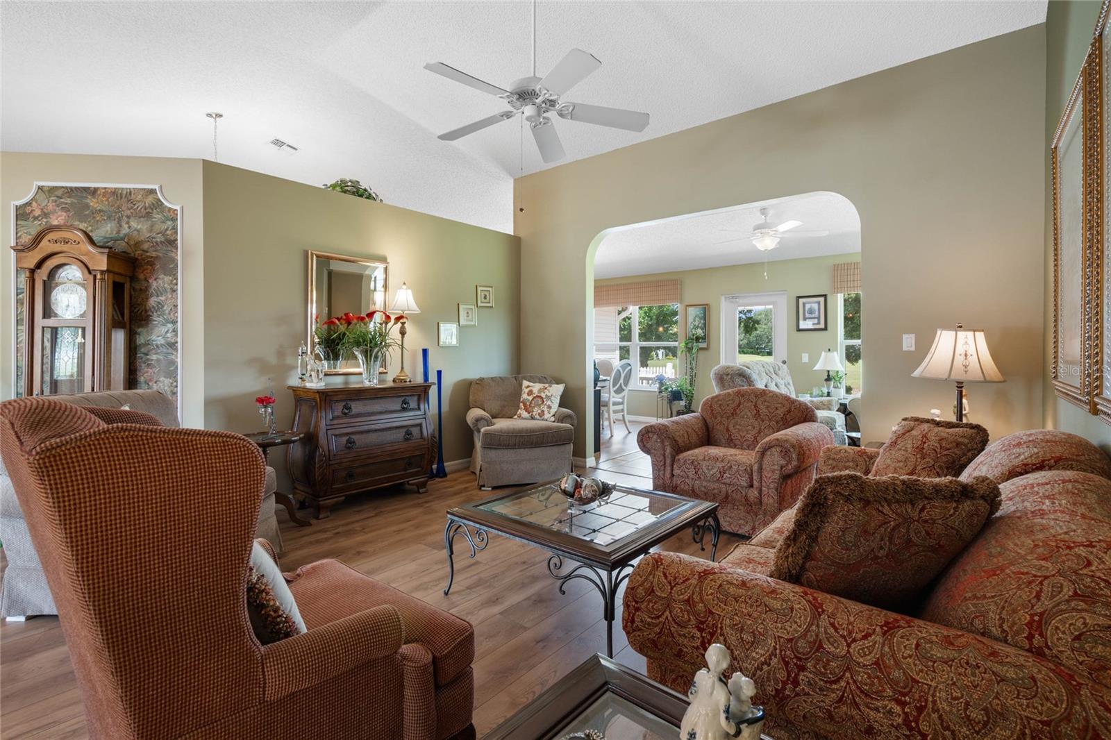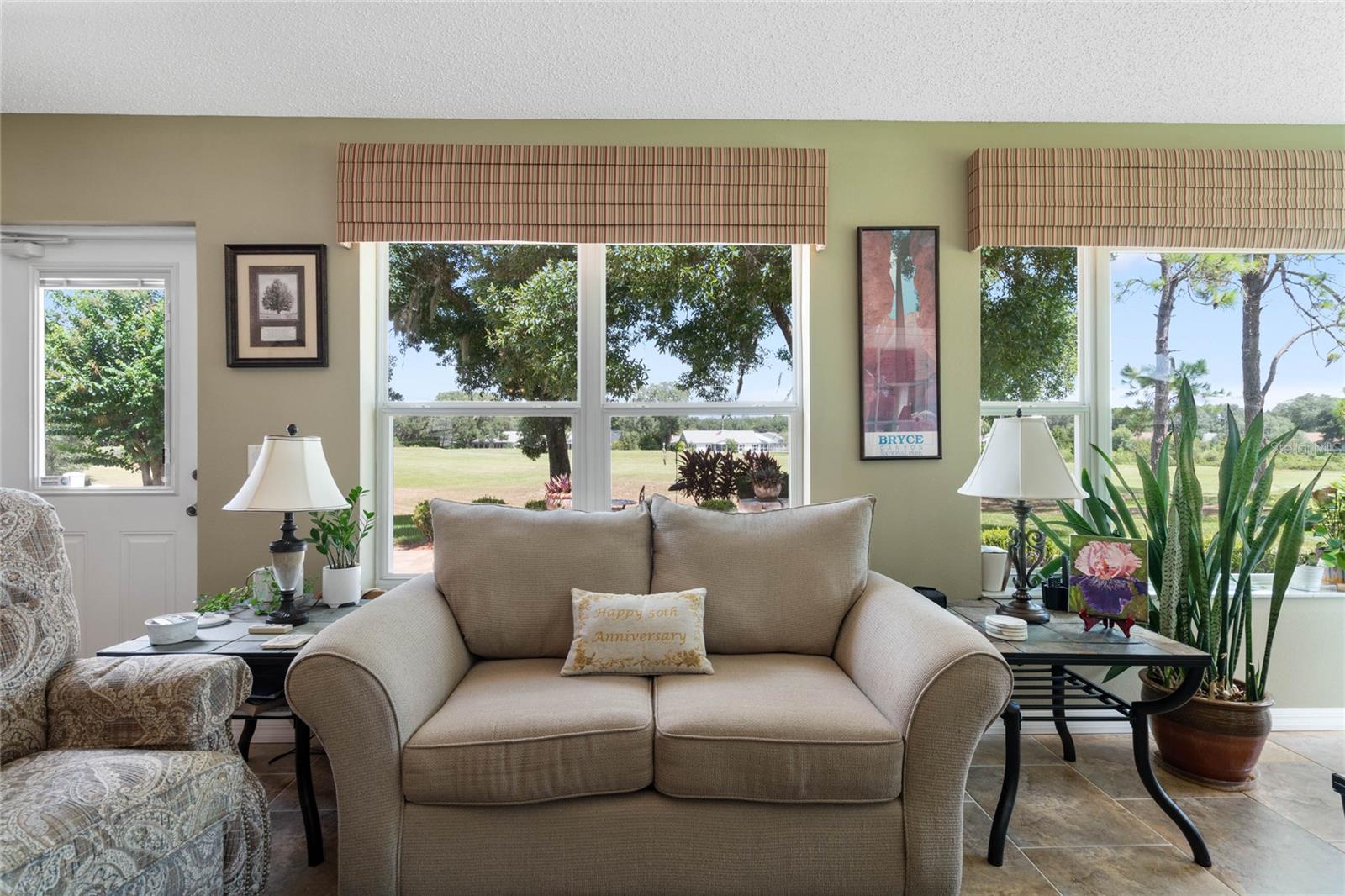 Stunning GOLF VIEW HOME, located on the FIRST HOLE of the popular, CRANES ROOST golf course. This house has been modified and expanded from the Great Spruce, and PREVIOUSlY A MODEL HOME! ***Be sure to check out the 3D TOUR above*** The home offers breathtaking golf course views and unparalleled privacy. The long approach paved driveway along with being tucked away in a cul-de-sac, creates minimal through-traffic and ample parking options. You will appreciate the upgraded and established landscaping with stone bordered beds. NO CARPET, featuring easy-care German-engineered SOLID WOOD FLOORING throughout, ensuring a seamless flow from room to room. This home boasts a range of updates and upgrades, including all new windows (2012), a NEW AC system (2023) with SANITIZER, a full WATER FILTRATION system, and FULL HOME GROUNDING RODS (2023). Additionally, a TRANSFERABLE TERMITE BOND provides added peace of mind. The redesigned CUSTOM KITCHEN is a chef's dream, showcasing GRANITE countertops and custom-built SOLID WOOD CHERRY CABINETS. Offering a NEW MICROWAVE, CONVECTION STOVE and DISPOSAL along with LOTS OF DRAWERS, PULL-OUT CABINETS, and a separate pantry with additional custom storage, this kitchen is perfect for both daily living and entertaining. Enjoy game day or host gatherings with ease as the kitchen opens up to the family room, dinette, and a Florida room with miles of gorgeous views. The primary suite is a spacious retreat, easily accommodating a king-size bed and offering an ensuite bathroom with DUAL SINKS, a soaking tub, and a walk-in shower. Bedroom two is versatile and could serve as a secondary primary suite, complete with its own private ensuite—ideal for guests or a mother-in-law suite. Bedroom three is perfect for a home office or flex space, and an additional half bath is conveniently located for guests. Plus, an inside laundry room adds to the home's functionality. The Plantation at Leesburg is a 55+ community that offers two full size golf courses, 3 clubhouses; all with heated pools, tennis, pickleball, pool tables, darts and a huge list of activities each and every month that will keep you moving and having fun. You can enjoy a good game of softball and hotdogs at the pavilion on game day. Whether it is bocce ball, shuffleboard, or horseshoes, you will never run out of things to do at the Plantation. The life you have waited your whole life for is just minutes away from major hospitals and shopping. Easy access to the parks and airport. This exceptional property combines elegance, functionality, and comfort, making it a true gem in the community. Don't miss your chance to make this beautiful house your new home! Call today for your personal tour!
