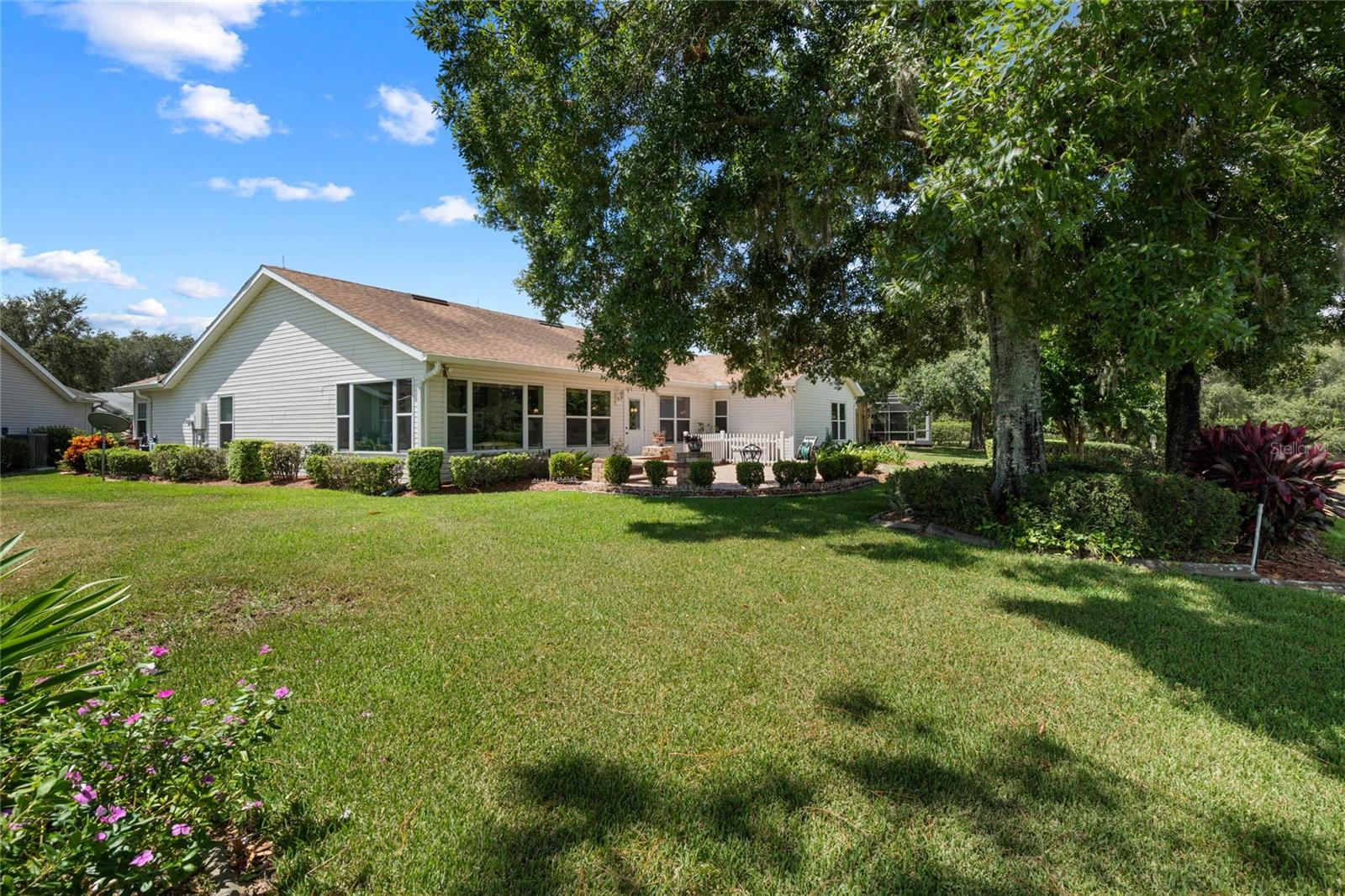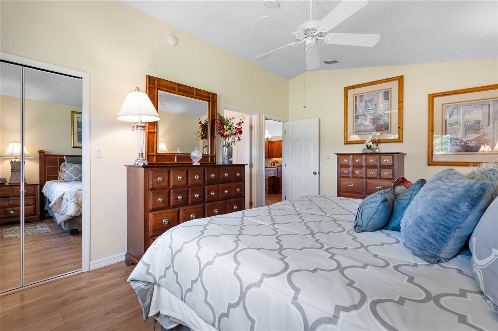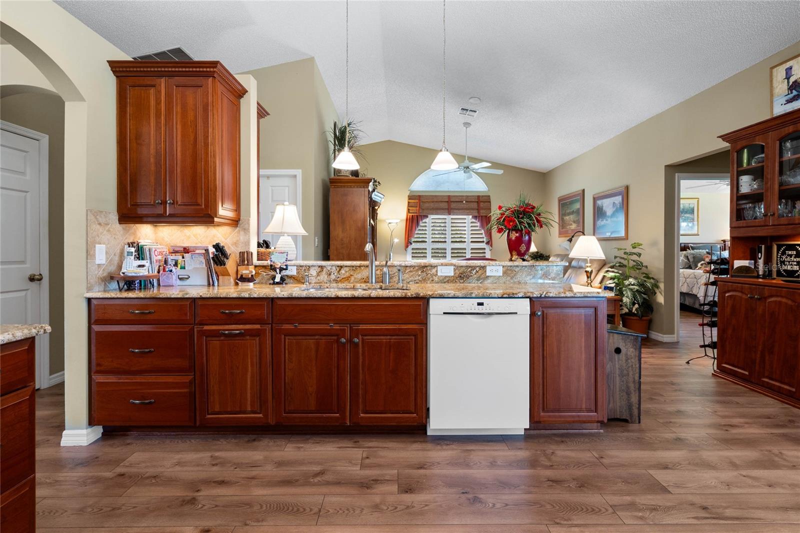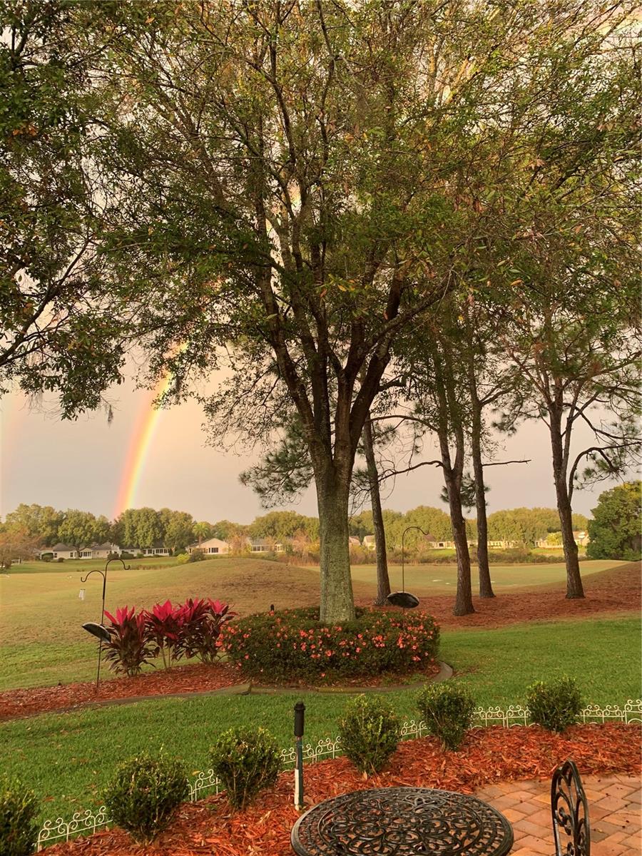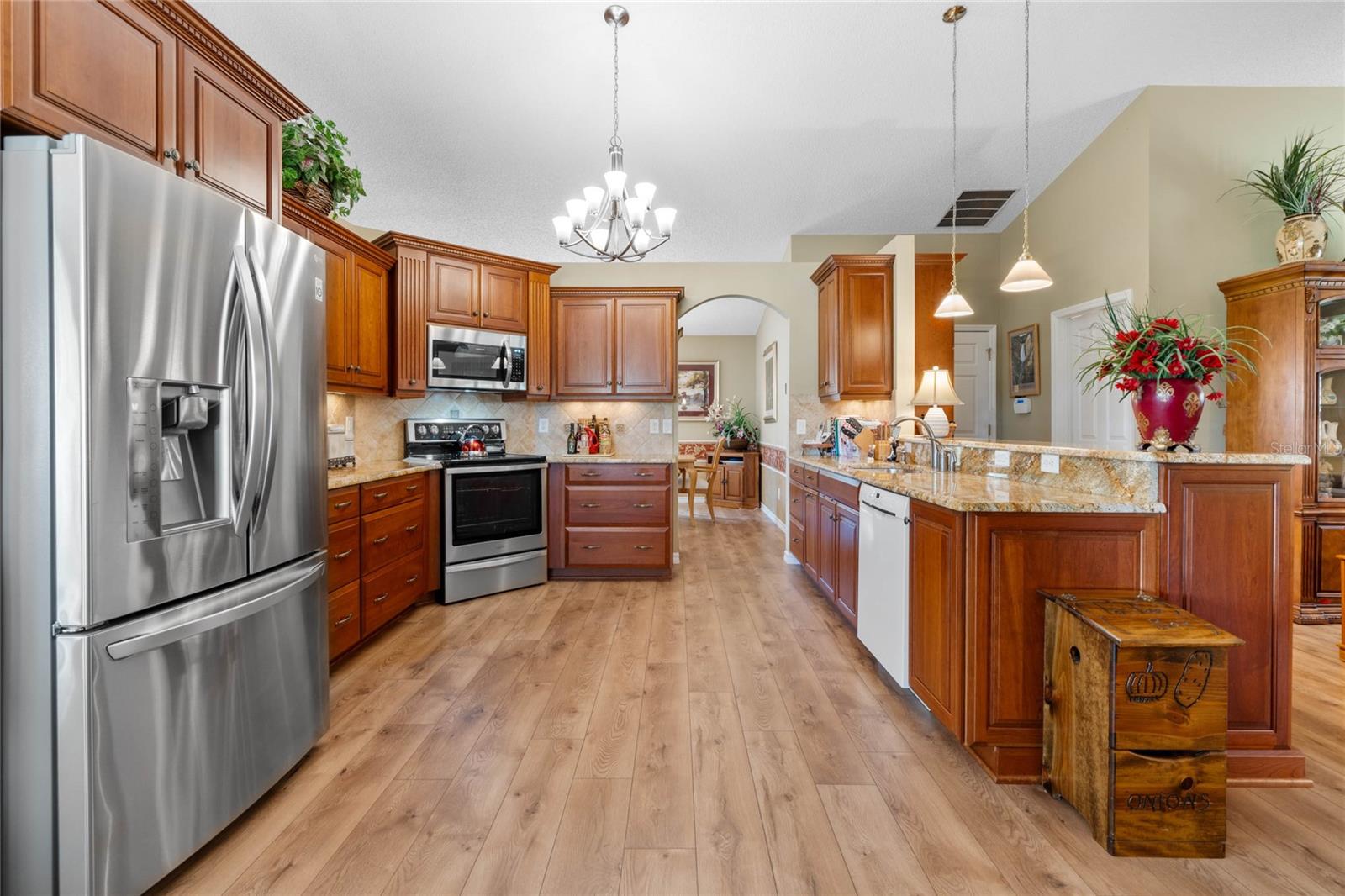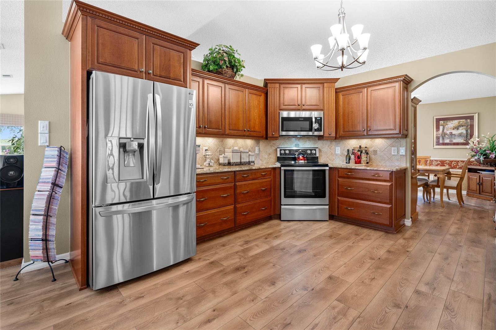 Stunning GOLF VIEW HOME, located on the FIRST HOLE of the popular, CRANES ROOST golf course. This house has been modified and expanded from the Great Spruce, and PREVIOUSlY A MODEL HOME! ***Be sure to check out the 3D TOUR above*** The home offers breathtaking golf course views and unparalleled privacy. The long approach paved driveway along with being tucked away in a cul-de-sac, creates minimal through-traffic and ample parking options. You will appreciate the upgraded and established landscaping with stone bordered beds. NO CARPET, featuring easy-care German-engineered SOLID WOOD FLOORING throughout, ensuring a seamless flow from room to room. This home boasts a range of updates and upgrades, including all new windows (2012), a NEW AC system (2023) with SANITIZER, a full WATER FILTRATION system, and FULL HOME GROUNDING RODS (2023). Additionally, a TRANSFERABLE TERMITE BOND provides added peace of mind. The redesigned CUSTOM KITCHEN is a chef's dream, showcasing GRANITE countertops and custom-built SOLID WOOD CHERRY CABINETS. Offering a NEW MICROWAVE, CONVECTION STOVE and DISPOSAL along with LOTS OF DRAWERS, PULL-OUT CABINETS, and a separate pantry with additional custom storage, this kitchen is perfect for both daily living and entertaining. Enjoy game day or host gatherings with ease as the kitchen opens up to the family room, dinette, and a Florida room with miles of gorgeous views. The primary suite is a spacious retreat, easily accommodating a king-size bed and offering an ensuite bathroom with DUAL SINKS, a soaking tub, and a walk-in shower. Bedroom two is versatile and could serve as a secondary primary suite, complete with its own private ensuite—ideal for guests or a mother-in-law suite. Bedroom three is perfect for a home office or flex space, and an additional half bath is conveniently located for guests. Plus, an inside laundry room adds to the home's functionality. The Plantation at Leesburg is a 55+ community that offers two full size golf courses, 3 clubhouses; all with heated pools, tennis, pickleball, pool tables, darts and a huge list of activities each and every month that will keep you moving and having fun. You can enjoy a good game of softball and hotdogs at the pavilion on game day. Whether it is bocce ball, shuffleboard, or horseshoes, you will never run out of things to do at the Plantation. The life you have waited your whole life for is just minutes away from major hospitals and shopping. Easy access to the parks and airport. This exceptional property combines elegance, functionality, and comfort, making it a true gem in the community. Don't miss your chance to make this beautiful house your new home! Call today for your personal tour!