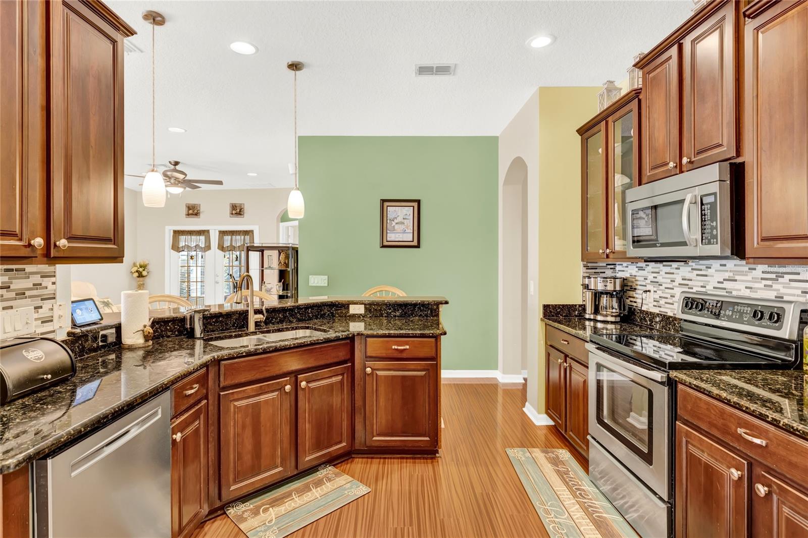 Immaculate 4-Bedroom, 2-Bathroom Single Family Home in USDA eligible area with New Roof(2022) & A/C(2022). Custom upgrades throughout entire home. Features include wood laminate flooring throughout, surround sound in family room, recessed lighting, stainless steel light fixtures & fans all through the home. Formal living room & dining room. Family room is nice size with a view out to the enclosed lanai. French Doors lead to glass enclosed lanai and a newer 260 sq ft screened patio. Kitchen boasts 42" wood cabinets, stainless steel appliances, granite countertops, including breakfast bar. Primary bedroom has large walk in closet with primary bath featuring marble countertop w/dual sinks, garden tub, glass shower and tiled floor. Guest bath features granite countertop, tiled floor & a window! Extra large garage with epoxy flooring, side door entry, garage door screen, and wood cabinets w/sink. Drop down stairs to large attic space, with shelving. The oversized yard has been professionally landscaped. The community offers a community swimming pool and & playground which are located diagonally across the street from the house.