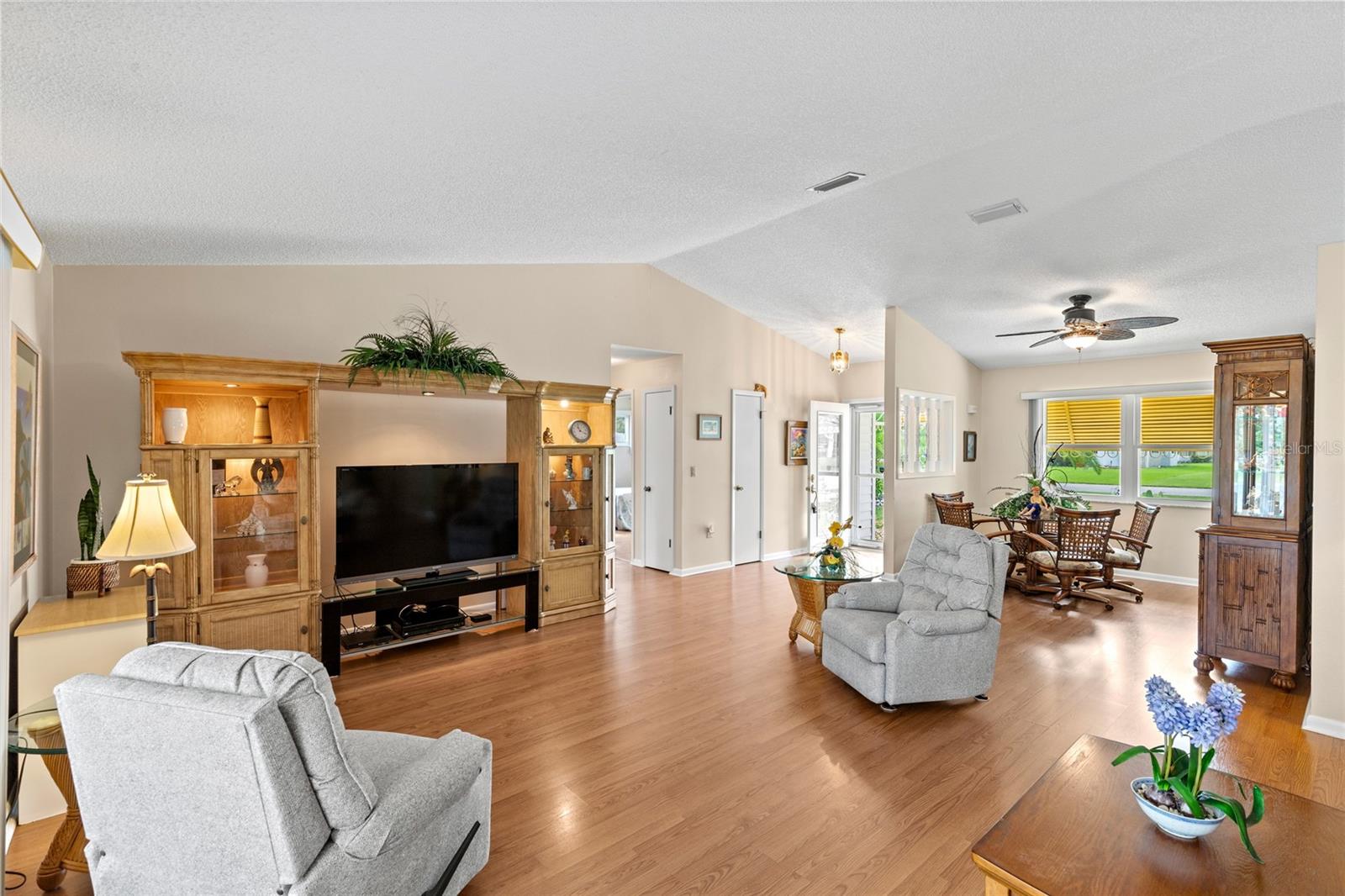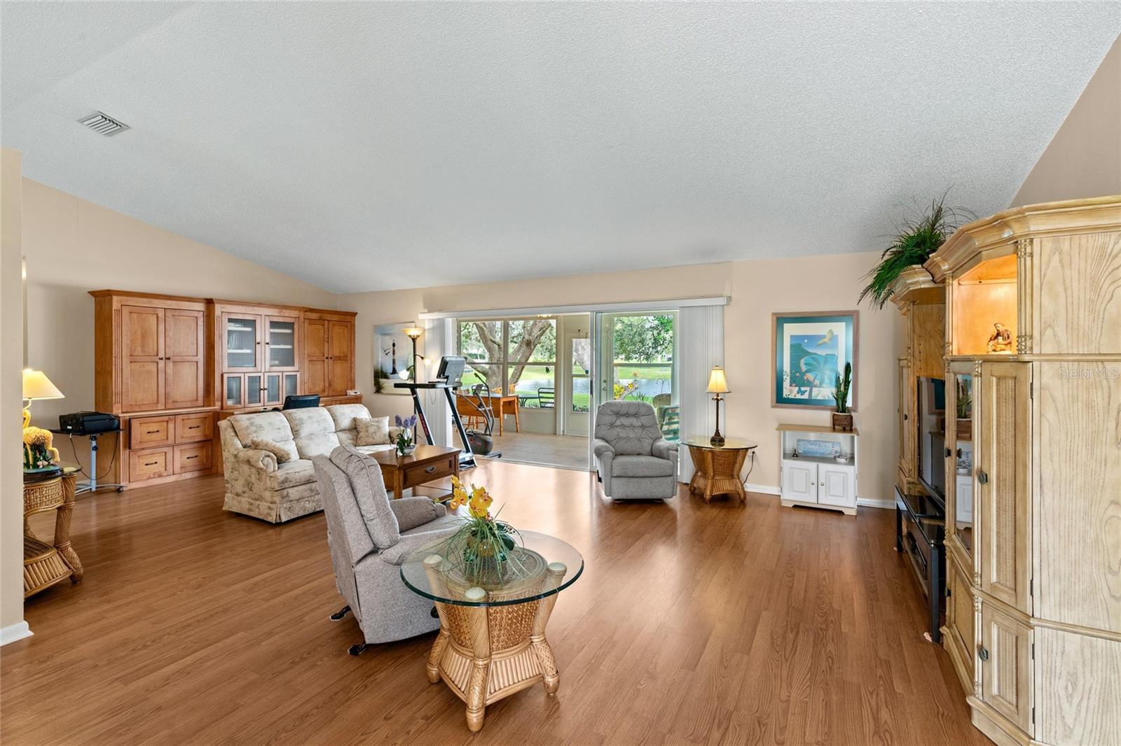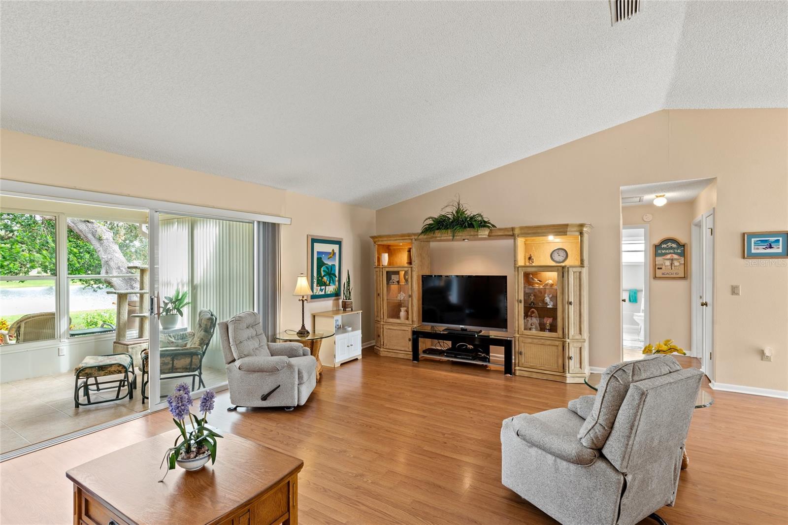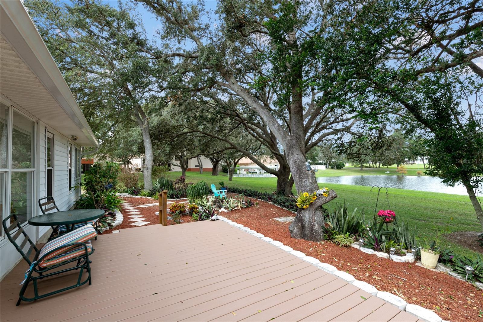 Pond Setting in the Scottish Highlands 55+ Community Imagine a beautifully landscaped home with stunning pond views from your 12 x 20 deck. The Florida room, also 12 x 20, features glass windows, providing another space to enjoy the serene scenery. The primary bedroom boasts sliding glass doors, offering a private view of the pond. Inside, the spacious living room also overlooks the pond and includes a large set of built-in cabinets with a desk. The home has two bedrooms and a bathroom on one side. The primary bedroom’s bathroom features a large, handicap-accessible walk-in spa shower, measuring 6 x 15, designed with wheelchair access in mind. The kitchen offers both a formal dining room and a kitchenette, with lower cabinets equipped with pull-out shelves for easy storage. The roof was replaced in 2017, and the windows were updated in 2013. The community includes over 600 homes, two recreation buildings, and an onsite manager. Residents have access to storage for trailers, boats, and RVs. While you maintain your own lawn, the HOA takes care of all common areas. Golf carts are welcome for cruising the streets. The community features a large pond at the entrance and smaller ponds throughout. Conveniently located near Leesburg Mall and two hospitals, Advent Health and Leesburg Hospital, this community is perfect for bass fishing enthusiasts, with numerous surrounding lakes. Prospective buyers must be approved by the Scottish Highlands HOA Board, which includes a background check and a minimum credit score of 730. The application fee is nonrefundable, and approval must be completed within five business days. A home inspection was done and available for buyers to view.
