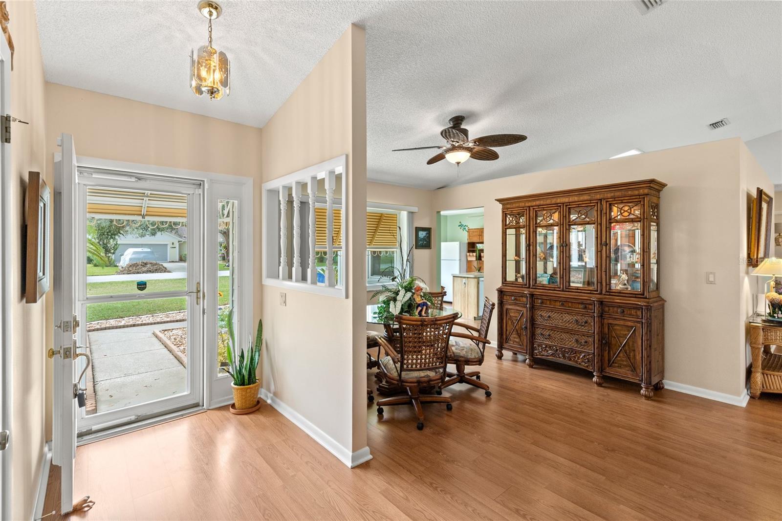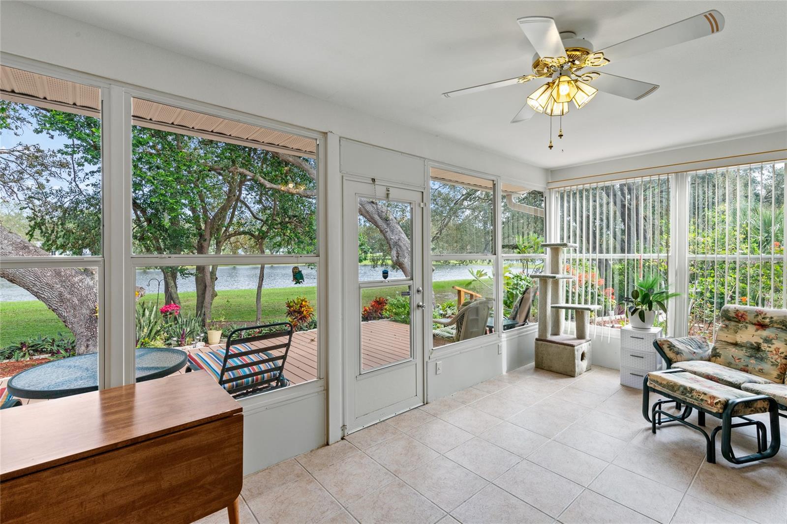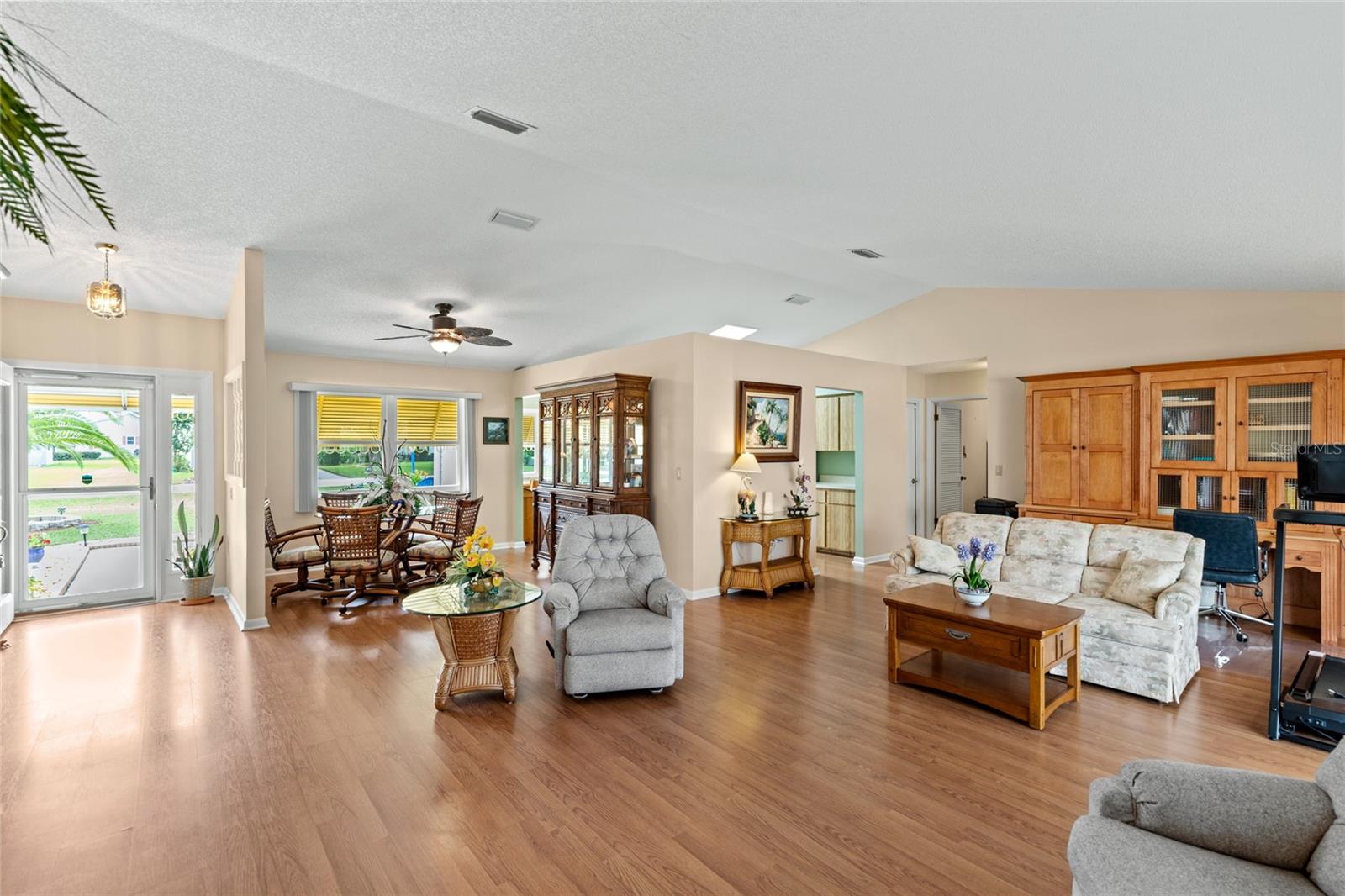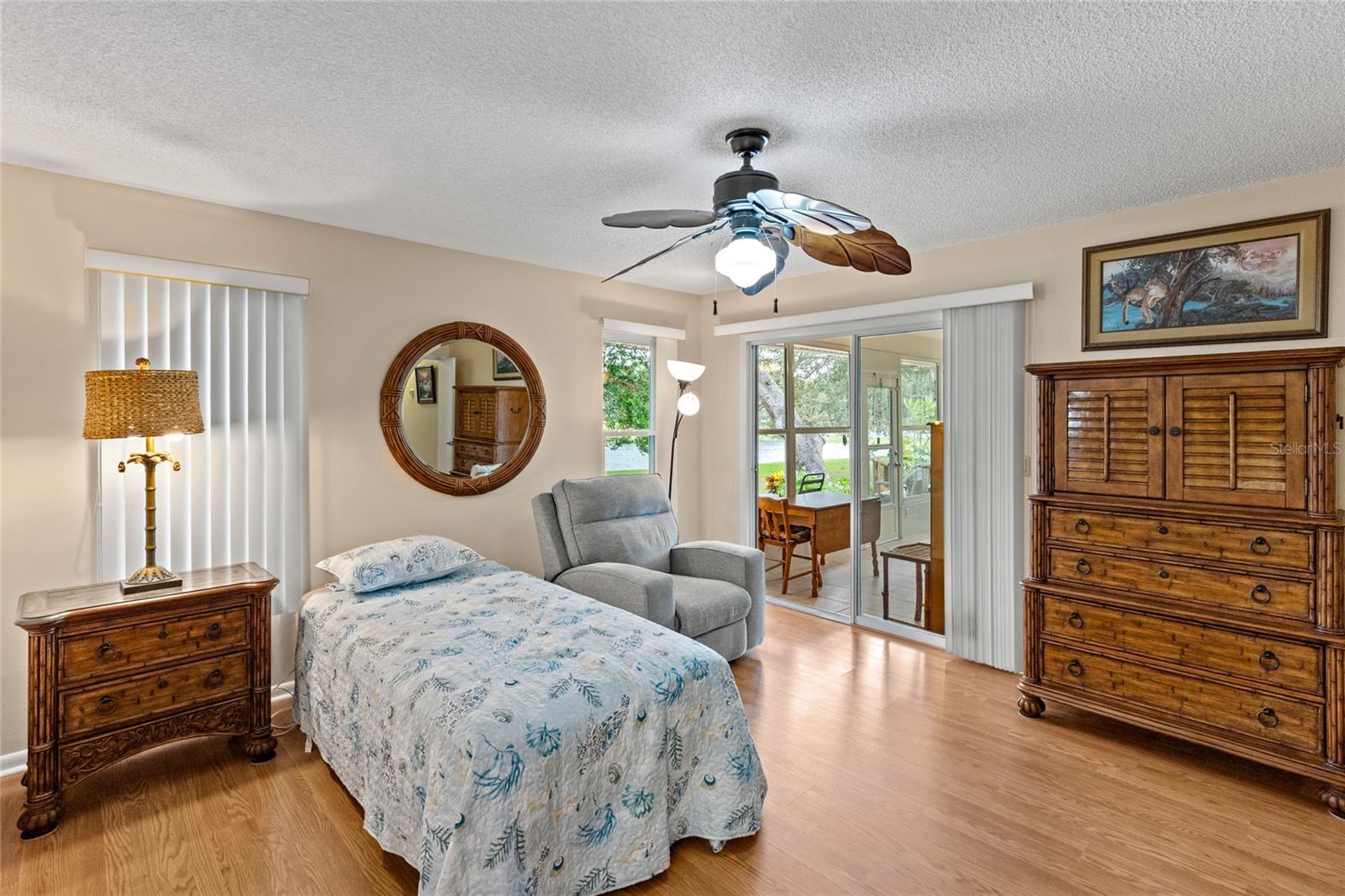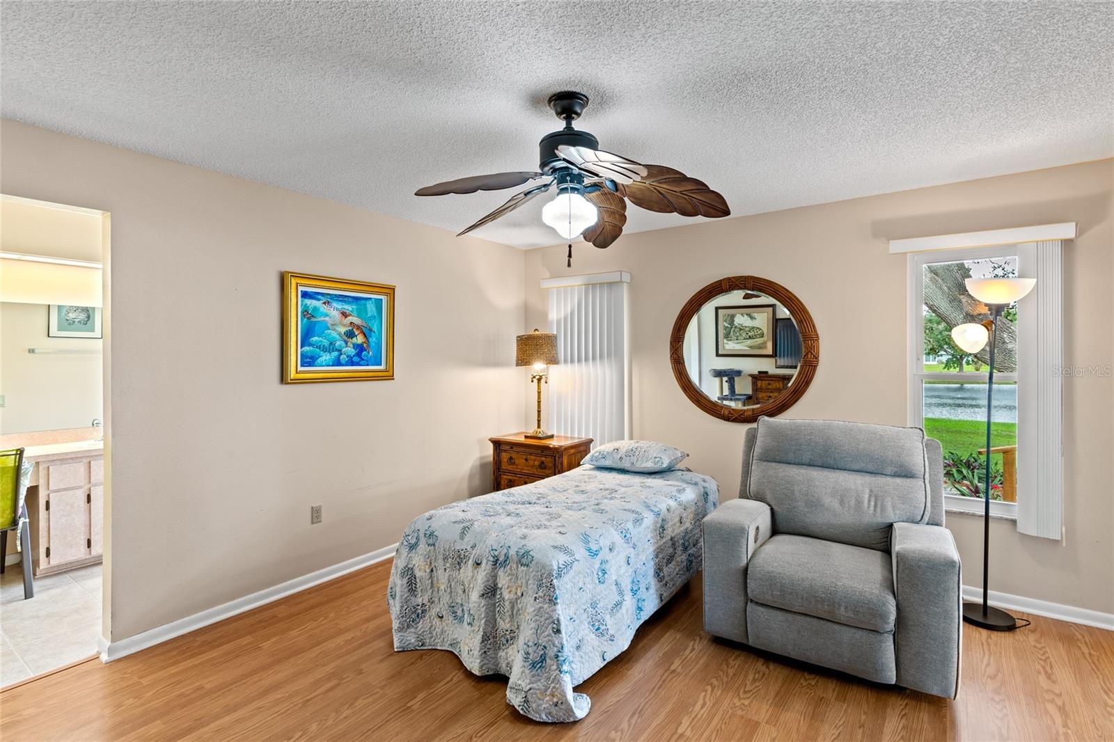 Pond Setting in the Scottish Highlands 55+ Community Imagine a beautifully landscaped home with stunning pond views from your 12 x 20 deck. The Florida room, also 12 x 20, features glass windows, providing another space to enjoy the serene scenery. The primary bedroom boasts sliding glass doors, offering a private view of the pond. Inside, the spacious living room also overlooks the pond and includes a large set of built-in cabinets with a desk. The home has two bedrooms and a bathroom on one side. The primary bedroom’s bathroom features a large, handicap-accessible walk-in spa shower, measuring 6 x 15, designed with wheelchair access in mind. The kitchen offers both a formal dining room and a kitchenette, with lower cabinets equipped with pull-out shelves for easy storage. The roof was replaced in 2017, and the windows were updated in 2013. The community includes over 600 homes, two recreation buildings, and an onsite manager. Residents have access to storage for trailers, boats, and RVs. While you maintain your own lawn, the HOA takes care of all common areas. Golf carts are welcome for cruising the streets. The community features a large pond at the entrance and smaller ponds throughout. Conveniently located near Leesburg Mall and two hospitals, Advent Health and Leesburg Hospital, this community is perfect for bass fishing enthusiasts, with numerous surrounding lakes. Prospective buyers must be approved by the Scottish Highlands HOA Board, which includes a background check and a minimum credit score of 730. The application fee is nonrefundable, and approval must be completed within five business days. A home inspection was done and available for buyers to view.