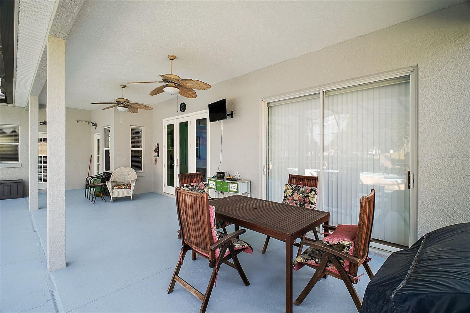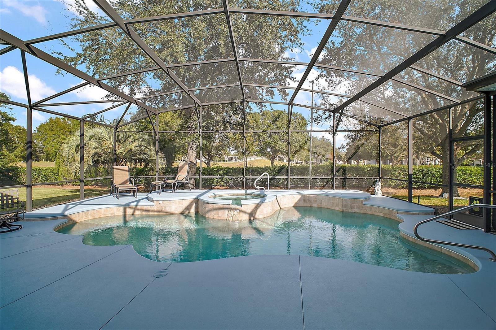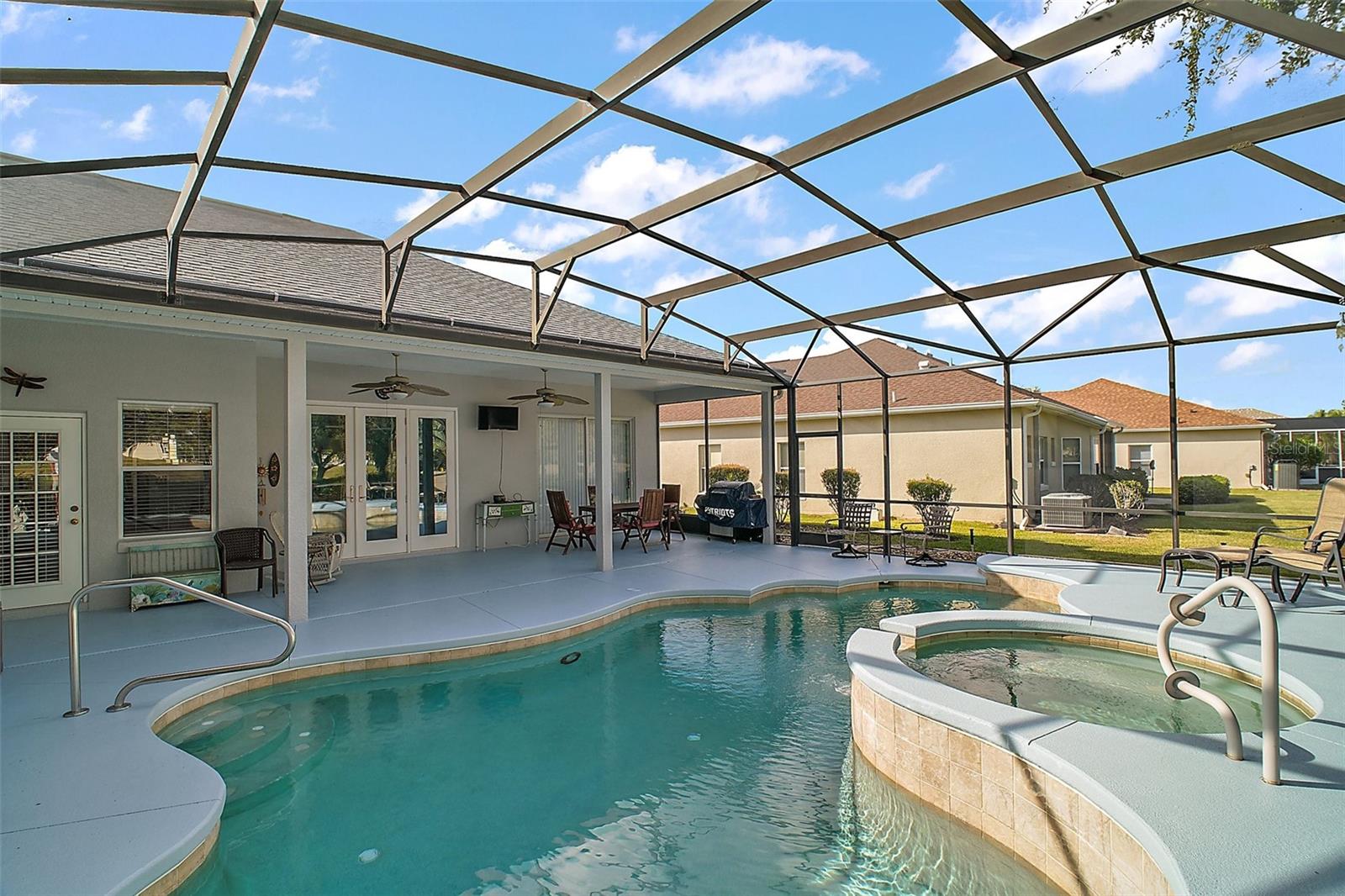 This updated pool home is move-in ready with several recent upgrades. The roof was replaced in 2022, the AC in 2023, and the solar system and spa heater are both from 2022 and 2024, respectively. Additional updates include a one-year-old pool pump, brand-new birdcage screens, and a tankless propane water heater. The home has been freshly painted inside and out, giving it a refreshed, modern feel. The kitchen is equipped with beautiful granite countertops, pull-out cabinet shelves, a stylish tile backsplash, a propane range, stainless steel appliances, and luxurious tile. The living room features elegant French doors that lead to the pool area, perfect for those warm evenings, and there's also a formal dining room as well as a cozy family room just off the kitchen. Designed with comfort in mind, the home offers a wonderful split floor plan, featuring two primary suites, each with its own upgraded bathroom. For convenience, there's an inside laundry room and a half bathroom for guests. Plus, the third bedroom offers plenty of space for whatever you need. The outdoor grill is connected to propane, so there’s no hassle with refilling portable tanks. With low HOA fees, the Plantation at Leesburg community offers a wide array of amenities, including two golf courses, three swimming pools, three clubhouses, walking trails, pickleball, tennis, softball, saunas, workout rooms, and more. You can even easily take your golf cart to the community restaurant for a leisurely lunch, dinner, or entertainment. With all these features, there's truly nothing left for new homeowners to do but move in, relax, and enjoy the peaceful lifestyle this home offers.