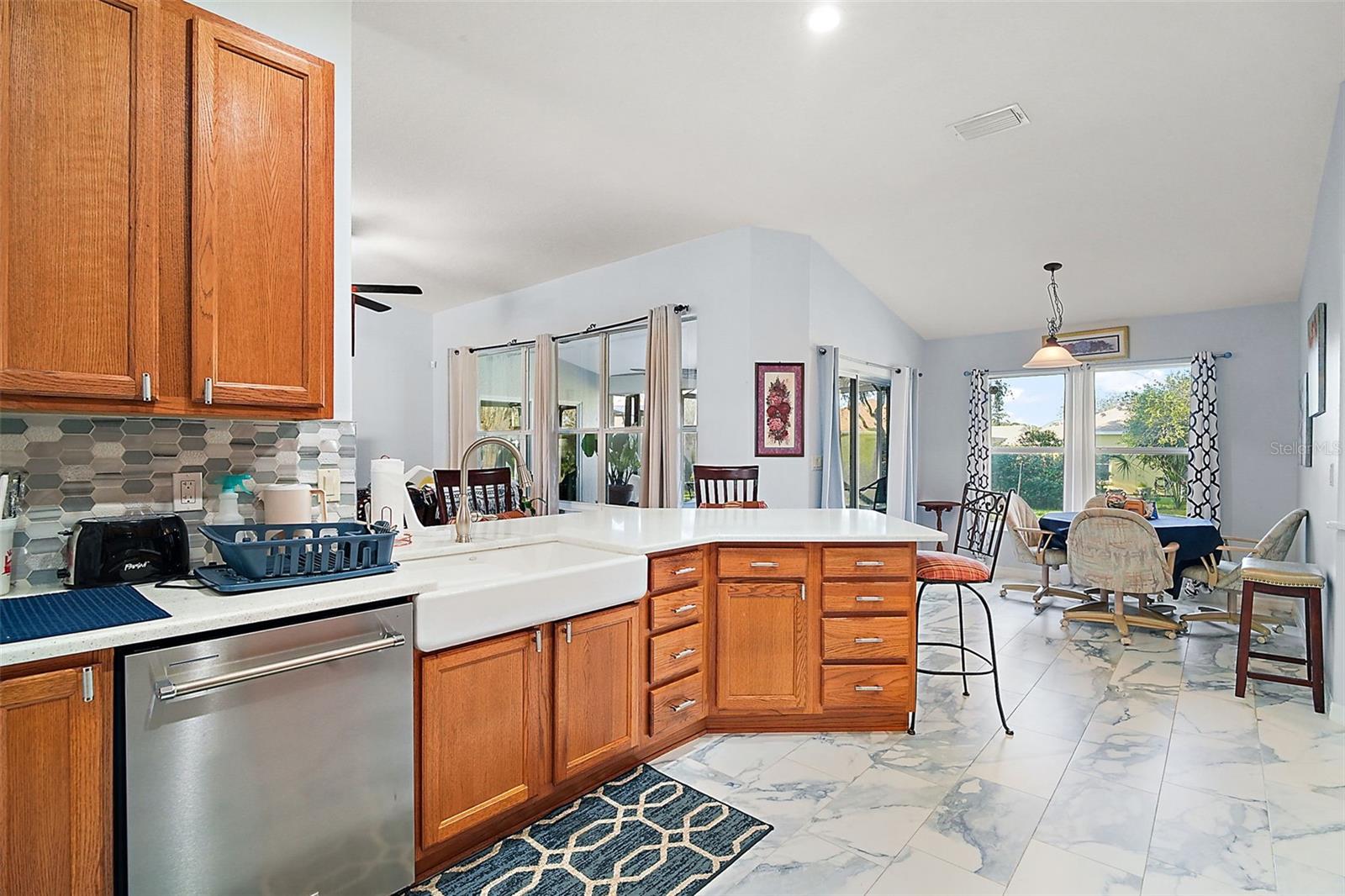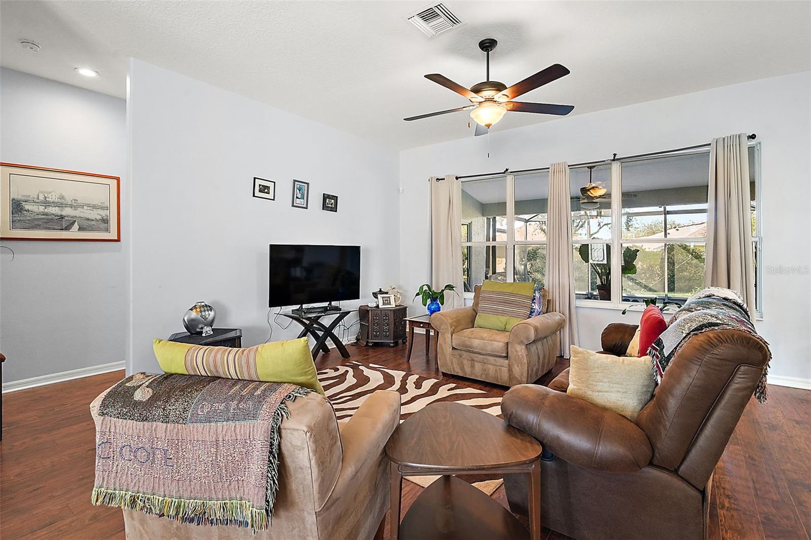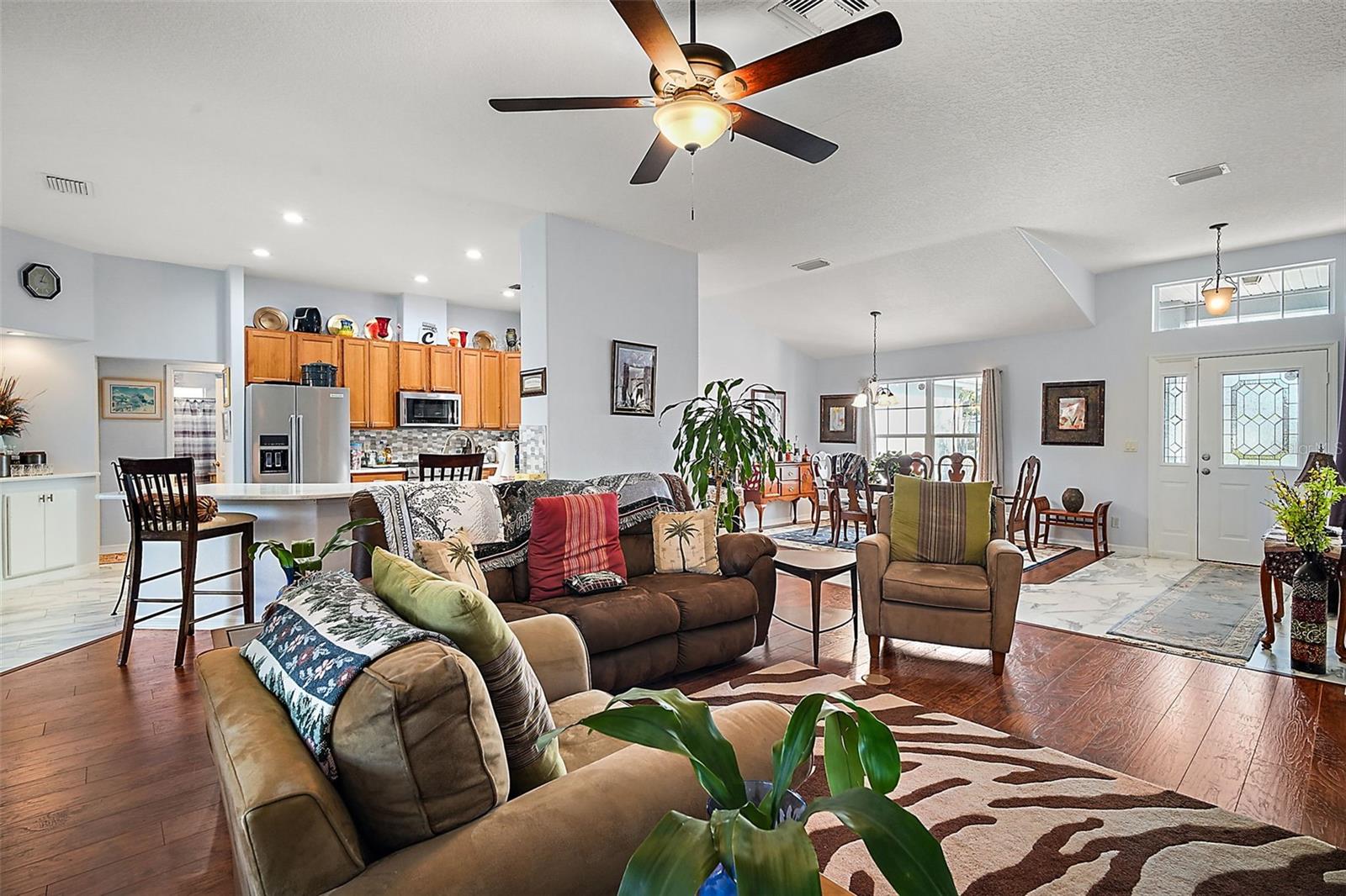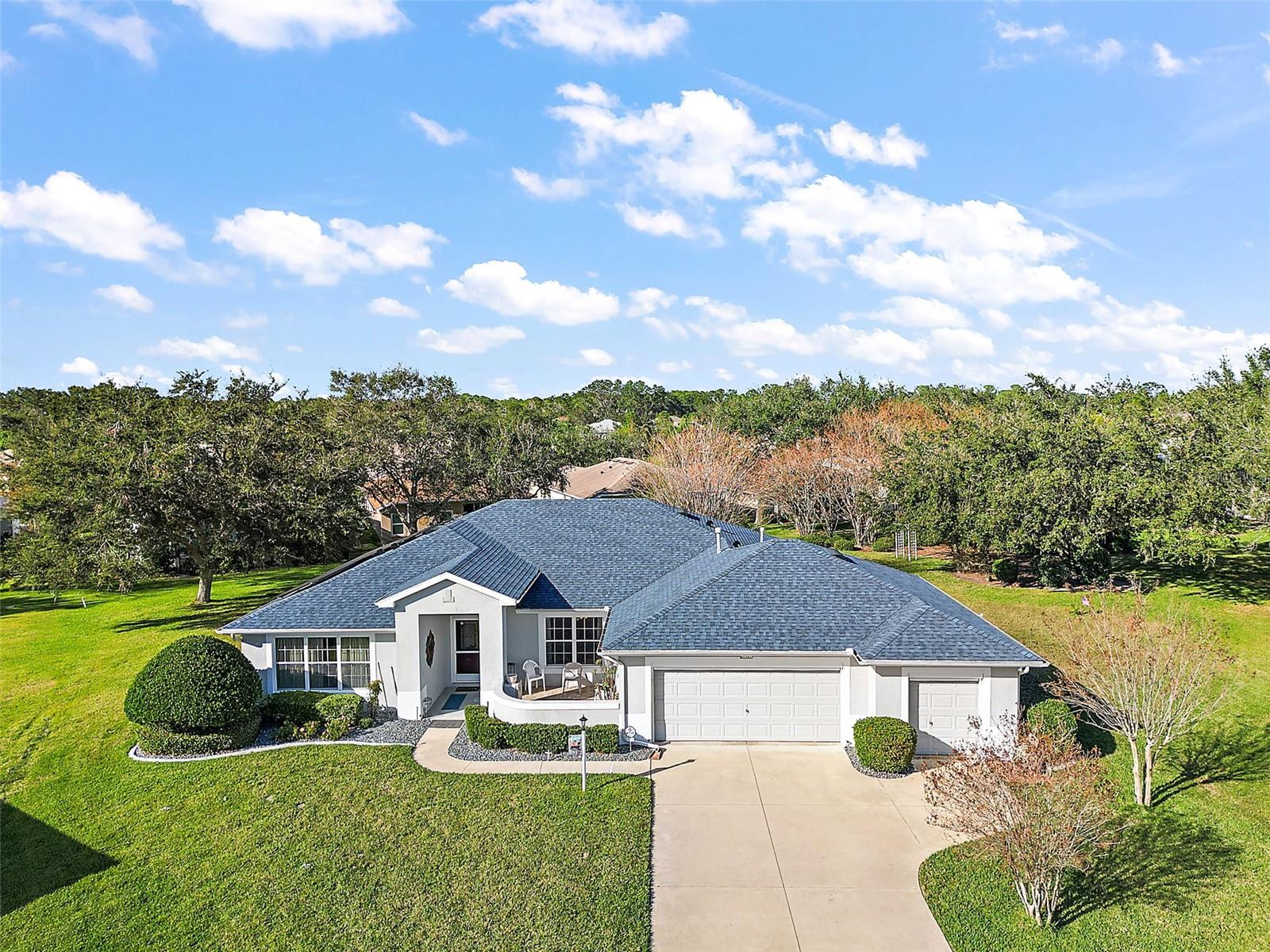 This beautiful home is a must see! Stepping inside the front door you, your eye will be drawn to the high end marble flooring and the spacious living room. To your left, there is a flex room with potential for a den, hobby room, or even a fourth bedroom and on your right is the formal dining room with a view of the front courtyard. The kitchen will wow you! Tons of cabinet space, stunning backsplash, quartz countertops with bar space, farmhouse sink, and breakfast nook with access to the lanai. The master suite is wonderful and spacious with walk-closet and sliding doors that also lead to the screened in lanai. The master bath has a walk-in shower, double vanity, and huge built in linen closet. At the other end of the home, there are two additional bedrooms with great lighting and a shared hall bathroom. The third bedroom is currently being utilized as a home office with customized built in desk and cabinets. Exiting through the laundry room into the garage, there are two full size parking space, golf cart garage, and a large workshop with plenty of space for storage, tools, and equipment. The homes central vac system is also located in the garage. Beautiful landscaping and rock beds surround the perimeter of the home and there are lush and lavish views of the oversized lot that is more than 1/2 an acre! The home is powered by solar with a very affordable, transferable lease never having to worry about sky rocketing electric bills. The gated community of Legacy has phenomenal amenities including peaceful walking trails, clubhouse, library, billiard room, resort style heated pool, social events, RV and boat storage, cable, internet, and even your lawn maintenance that includes edging. Easy access to major highways, shopping, and dining. Assumable VA