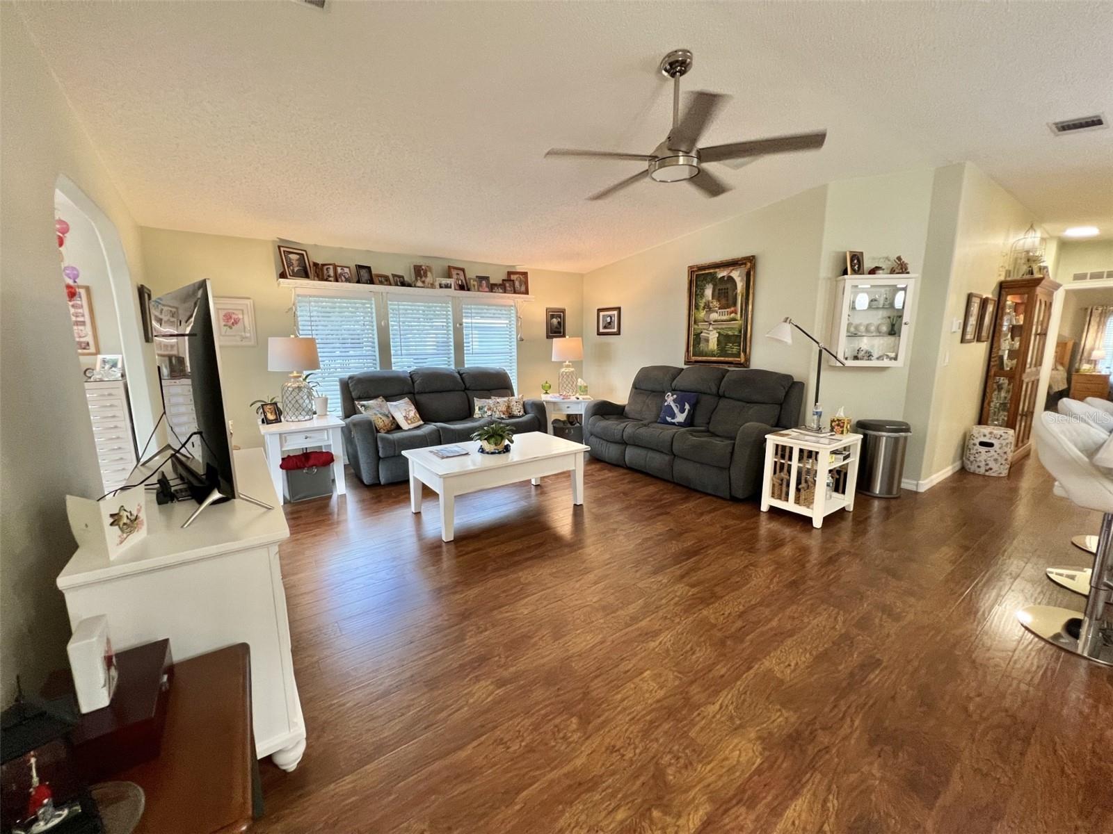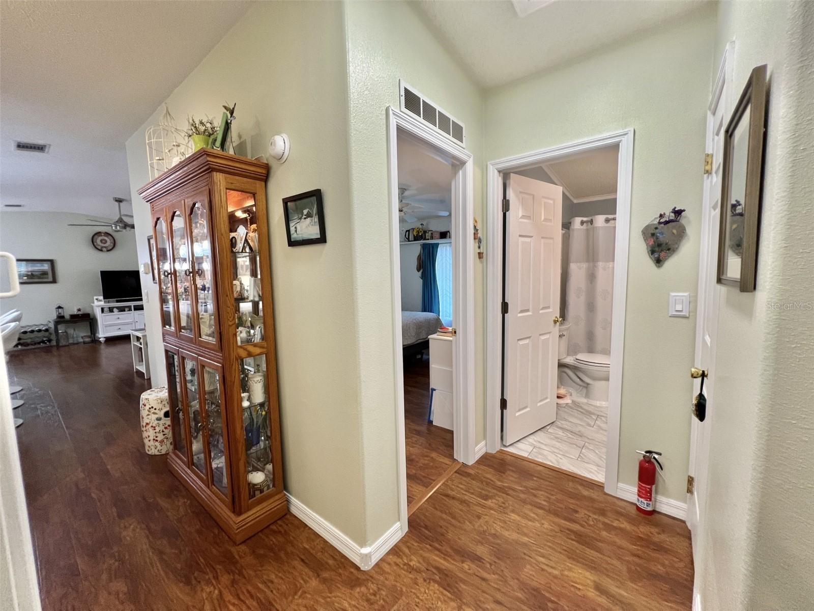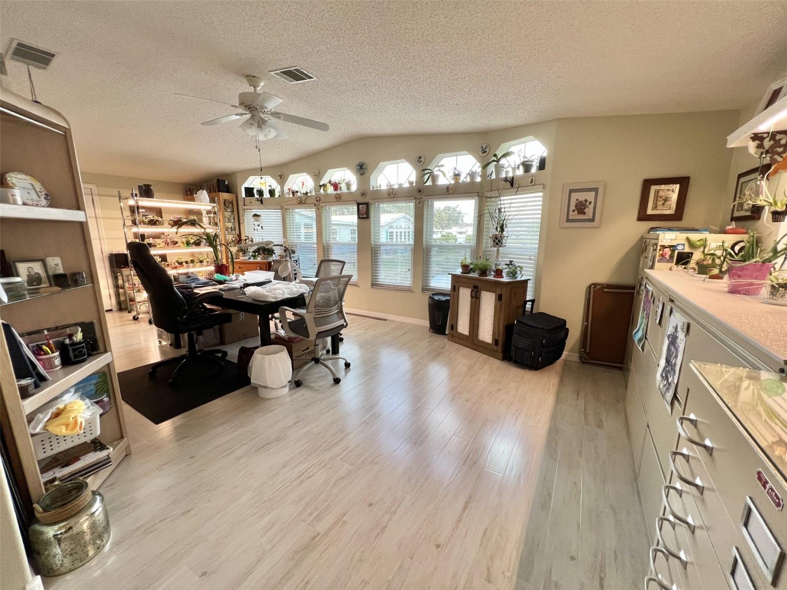 Exceptional home located on a tranquil cul-de-sac on Tamarisk Way, offering stunning and serene views of the lake! From the moment you step into the screened front porch and through the foyer, you’ll be welcomed by a beautifully upgraded kitchen designed to impress. The elegant quartz island and countertops are perfectly complemented by stylish pendant lighting, under-cabinet illumination, and a tasteful tiled backsplash. Solid Maple cabinets with pull-out shelves and soft-close drawers provide both functionality and sophistication. Stainless steel appliances, USB outlets, and LED lights enhance the space, making it as practical as it is beautiful. The home features a 2019 HVAC system and a 2017 water heater for added comfort and efficiency. The open floor plan seamlessly connects the kitchen to a spacious living room and large craft / hobby room, both with breathtaking views of the lake and woods. Stepping down from the craft room, is an enclosed storage room and a large 14 x 32 workshop. Additional highlights include a well-maintained rubber roof, Smart Core laminate and vinyl plank flooring throughout. The master bedroom features ceiling planks, as well as a generous amount of closet space. The updated master bath boasts an elegant walk-in shower, stylish cabinetry, and modern finishes..........Hawthorne at Leesburg is an active, resident owned, 55+ cooperative, waterfront, gated community, with beautifully landscaped grounds, lakes with illuminated fountains and a relaxing and comfortable gazebo. The affordable monthly maintenance fee of $346 includes water, sewer, lawn mowing, private emergency services and storage space for recreational vehicles, boats, trailers and much more! The beautiful clubhouse is complete with a full-time program coordinator, more than 100 different activities and seating for 550. It has a hospitality lounge, card rooms, craft rooms, billiard room, fitness center, library, fine arts room and many more. There is excellent fishing, outdoor geo-thermally heated pool and two enclosed therapeutic pools. Hawthorne boasts a private marina monitored by an electronic security system with over 120 boat slips and access to the Harris Chain of Lakes and beyond.