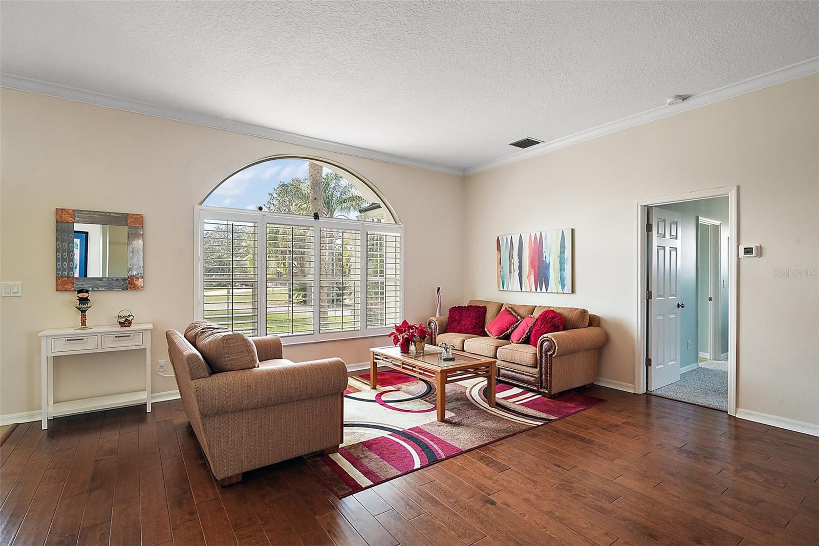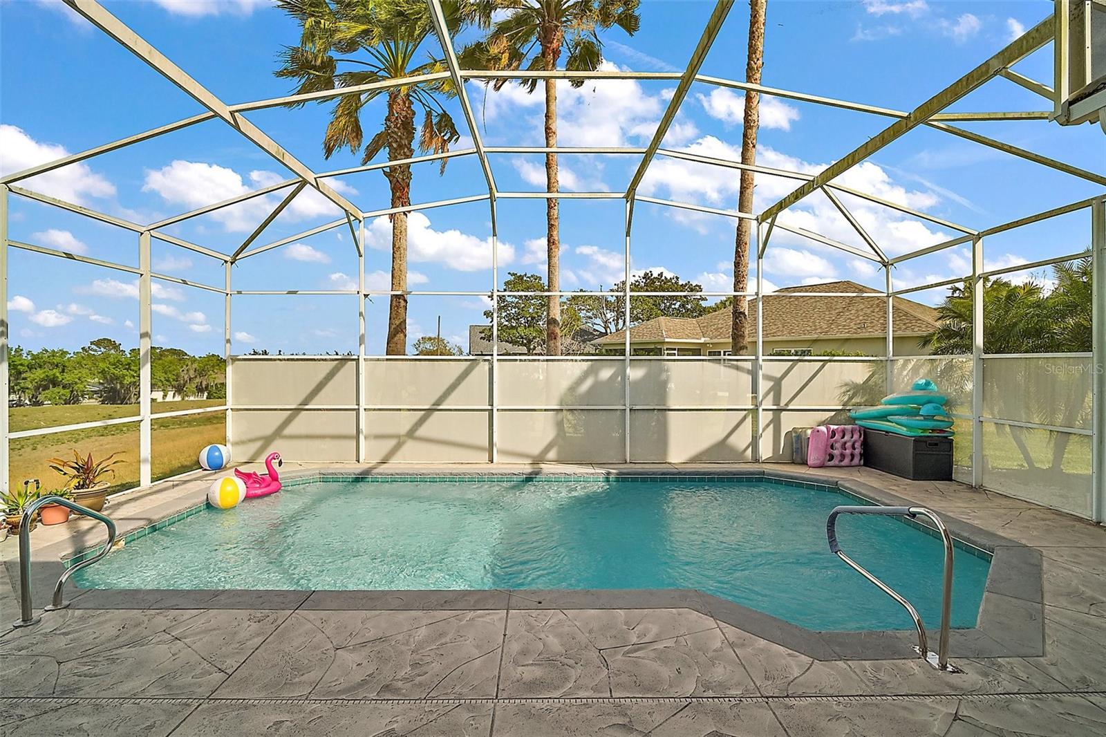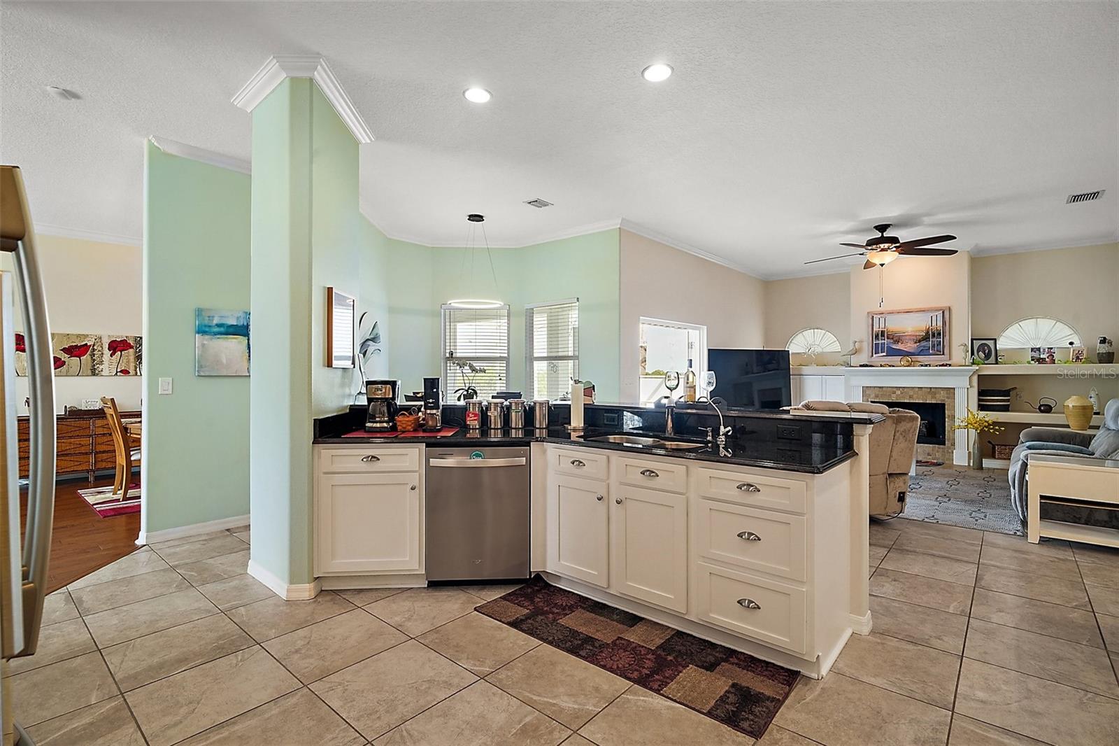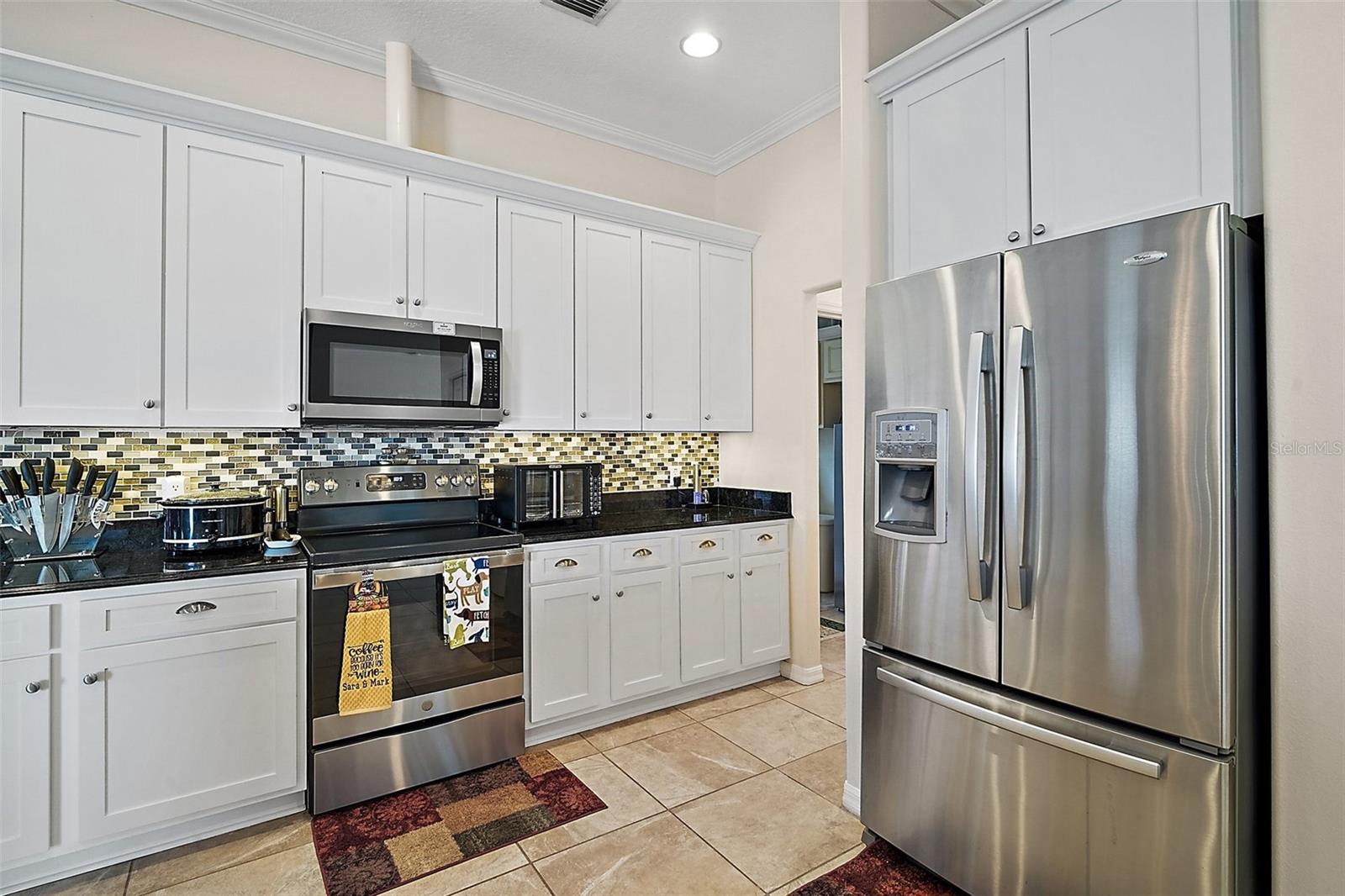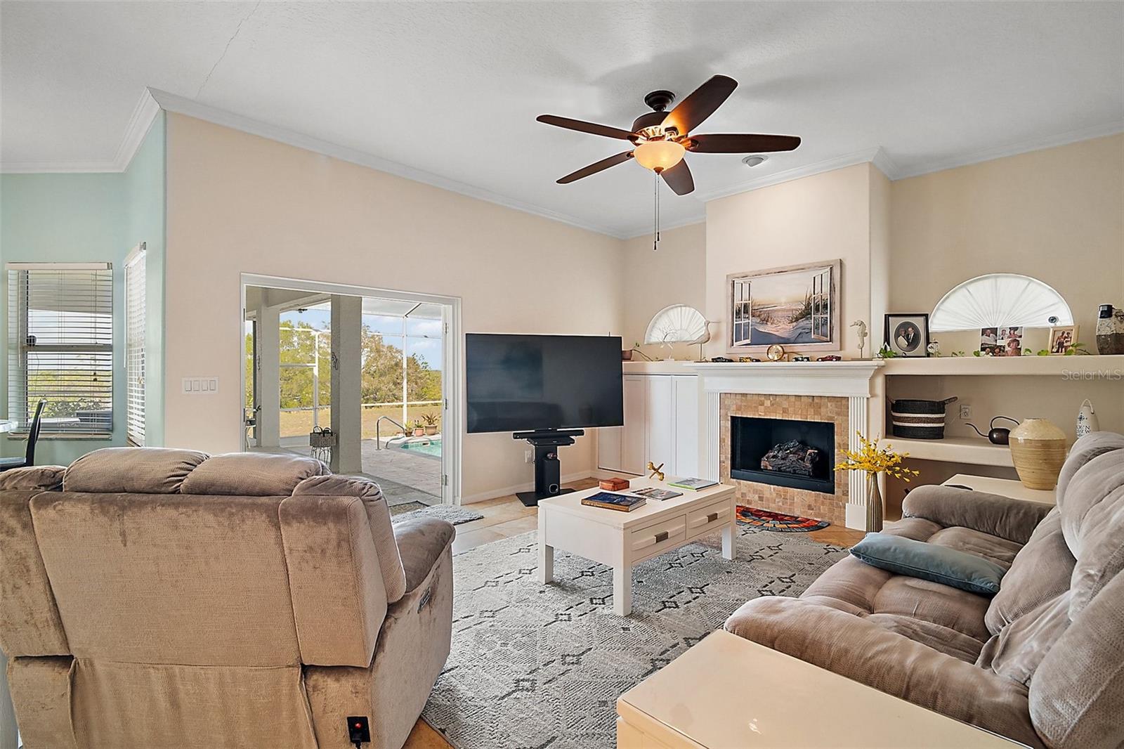 Home warranty provided for one year !!! — Motivated Seller!!! What a great place to call home, in this beautiful Pool Paradise 3 Bedroom 2 bath home, that opens up into the formal living and dining room. This large kitchen has solid wood cabinets with granite tops, stainless steel appliances, a glass cooktop stove, a built-in microwave, double-closet pantry, and a tiled backsplash. The breakfast nook area is shared with the family room, with a gas fireplace & custom shelving with french doors that lead to the gas-heated pool. The large master suite gives you access to the covered lanai and pool through the french doors. The bathroom has updated dual vanities, with his and her walk-in closets, a garden tub bath, and a separate shower. In this home, you will enjoy the privacy of the split bedroom plan with a pocket door in the hallway separating bedrooms 2 & 3 and the guest bath. The laundry/utility room is oversized with more storage. The other upgrades include crown moldings, energy-efficient double pane windows, tongue & groove wood plank and tile floors, architectural shingles, in the garage is a whole house water filtration with water softener, and under the kitchen sink is an extra water filter. You have a large concrete parking pad with a side-entry garage with built-in shelving for storage. And your family will enjoy the large common area in the backyard for the kids to play in. Come and enjoy a great location and a beautiful well-maintained home.