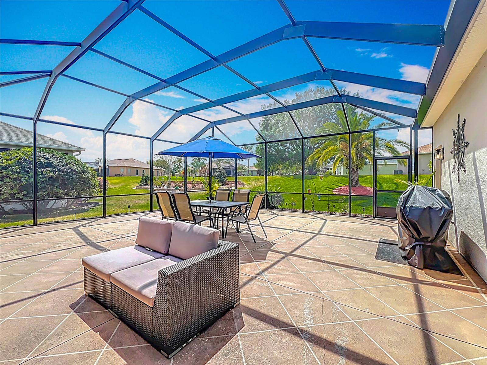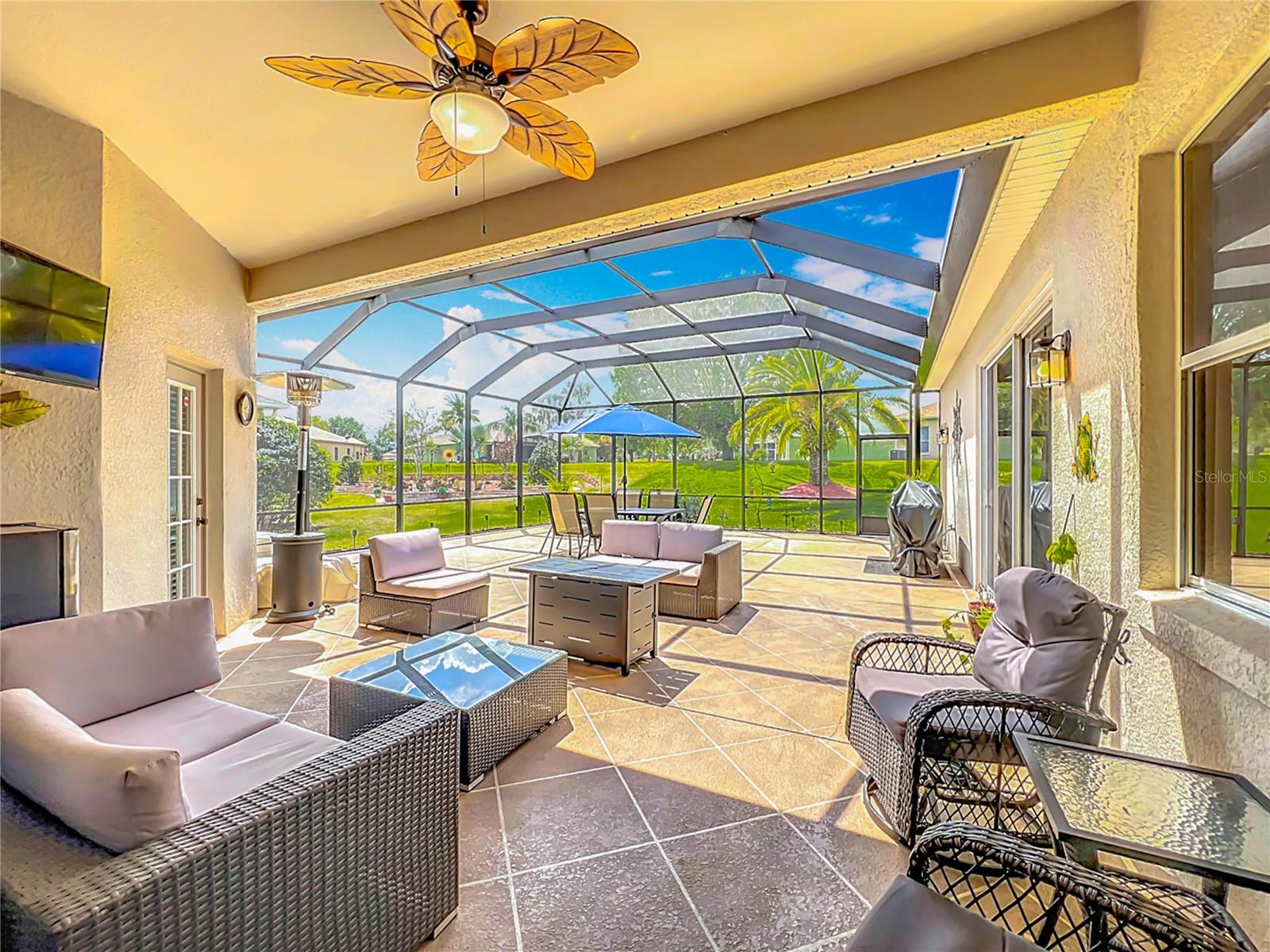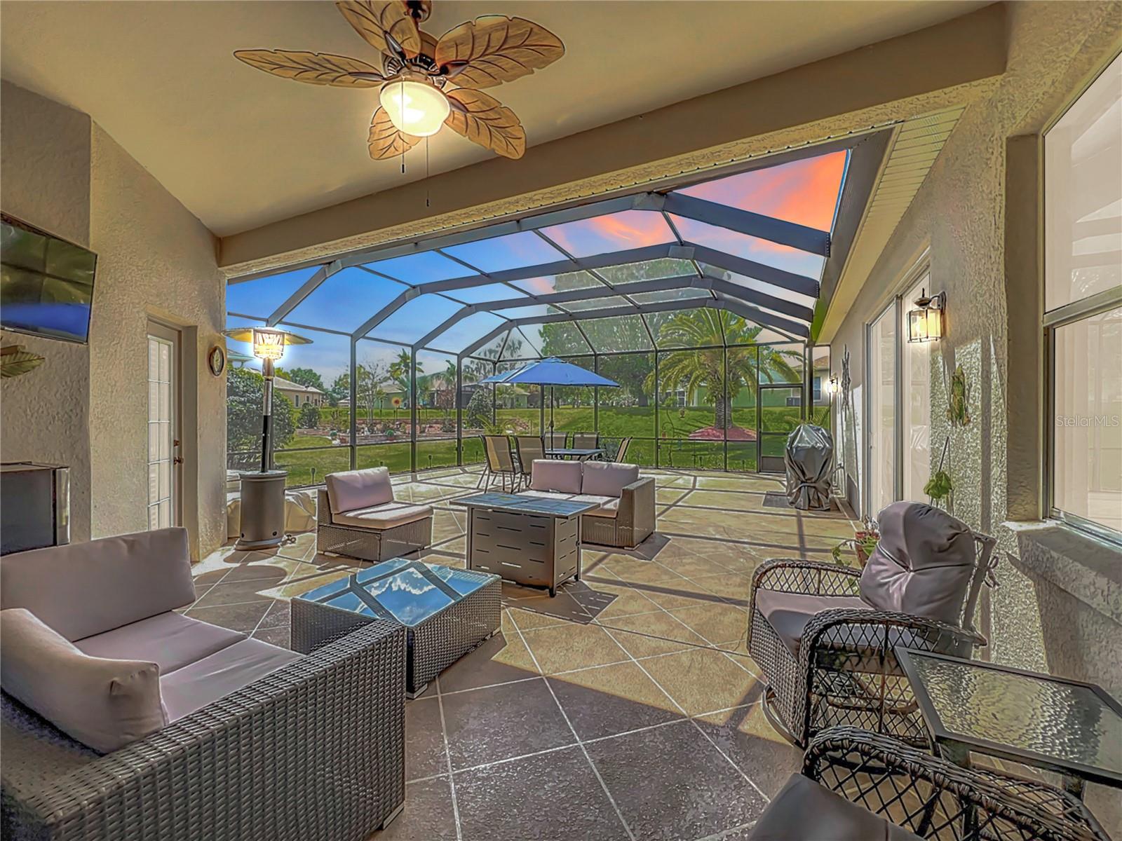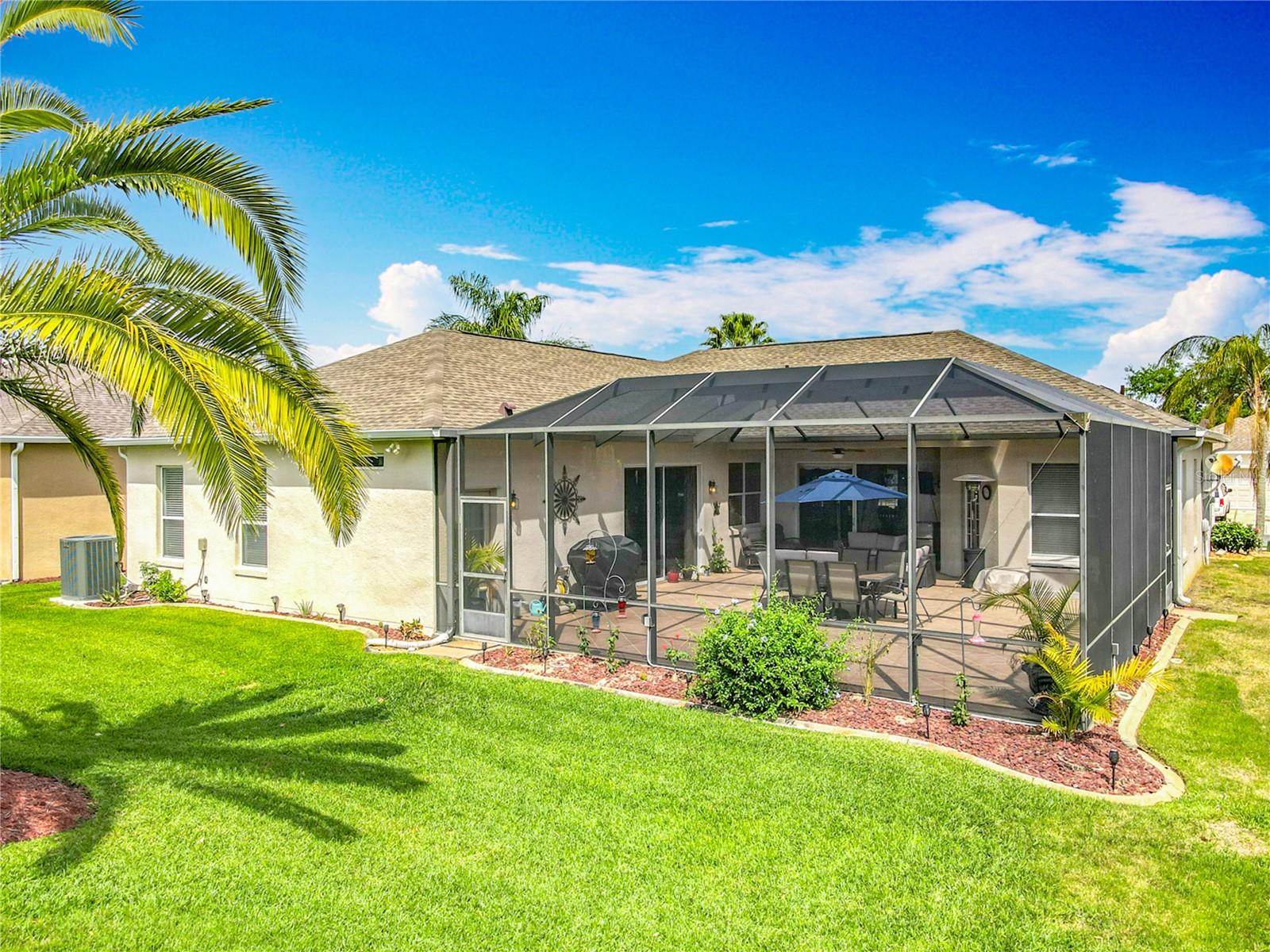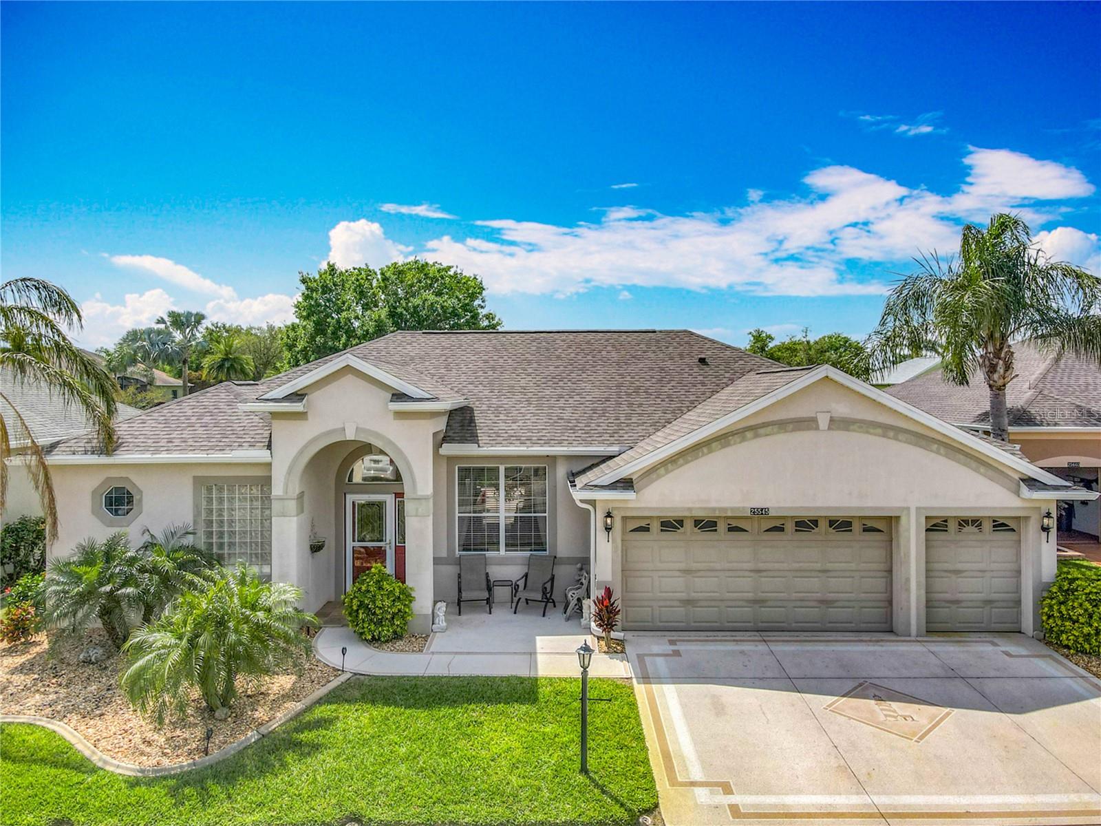 Private & Executive 2 Bedroom Home , Den/Office with Stunning Florida Sunsets.This elegant and spacious 2-bedroom, 2-bath home with a 2.5-car garage is designed for comfort and style, making it the perfect retreat for your golden years. The split floor plan offers privacy and openness, with high ceilings and ceramic tile flooring throughout most of the home.Enjoy breathtaking Florida sunsets from your expansive 28x29 screened patio and spacious lanai—ideal for relaxing or entertaining. The well-manicured landscaping enhances the home’s fantastic curb appeal. Interior Highlights:Gourmet Kitchen – Features an abundance of 42-inch cabinets and expansive Corian countertops, perfect for cooking and entertaining. Primary Suite – Boasts private lanai access, a large walk-in closet, and an upgraded spa-like en-suite bath with a jetted tub, walk-in shower, and dual vanities.Guest Suite – The second bedroom is privately situated on the opposite side of the home, with direct access to the second bath.Office/Den – With elegant French doors, this versatile space can be used as a home office or craft room. Indoor Laundry Room – Equipped with built-in cabinets for extra storage and convenience.Dream Garage & Recent Upgrades: Accommodates two cars plus a golf cart and features a large storage closet.New Roof (2022), New HVAC with UV Light (2022),Newer Water Heater. This beautifully designed home combines elegance, comfort, and functionality—ready for you to move in and enjoy! Enjoy leisurely rounds of golf on two 18-hole courses, stay active with lighted tennis courts, or relax by one of the three sparkling pools and Jacuzzis.For those who love staying fit, the world-class fitness centers and Volleyball & Pickleball courts will keep you engaged. With over 100 planned activities each week, you’ll always have something fun to look forward to. The scenic, landscaped boulevards and serene lakes a peaceful backdrop, perfect for fishing or simply unwinding. Plus, with three expansive clubhouses and a delicious on-site restaurant, everything you need is right at your doorstep.