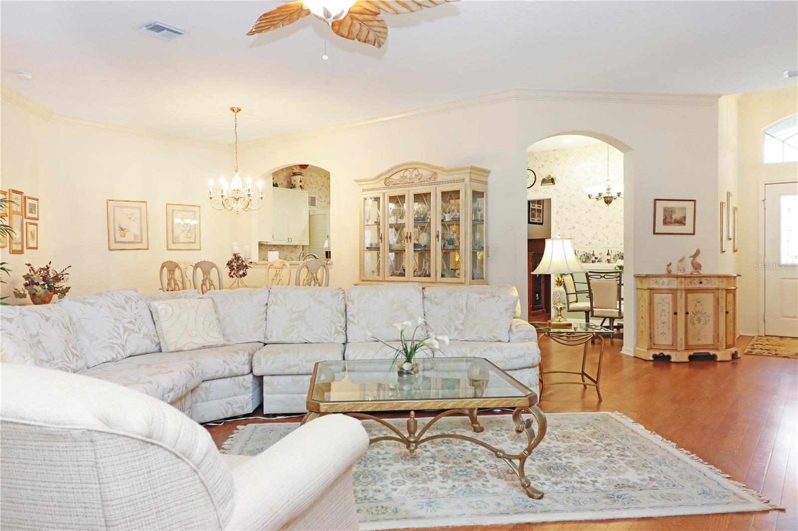 Brand new roof, gutters and solar tube! Discover this desirable York model in Royal Highlands, located on a quiet cul-de-sac lot, boasting a 2+ golf cart garage. Inside, find a spacious great room and dining room enhanced by crown molding, a split floor plan for privacy, and a kitchen featuring a smooth range, built-in desk, pantry, solar tube and a sunny breakfast nook. The primary suite offers two closets (including a walk-in) and an ensuite bathroom with dual sinks, a garden tub, and a large shower. Two comfortable guest bedrooms share a guest bath with a shower. An office is conveniently located off the kitchen, and the laundry room includes storage, a washer, and a dryer. Extend your living space in the enclosed lanai with acrylic windows, overlooking a private backyard. Benefit from ample storage throughout, including in the garage. This exceptional home is situated in the premier, resident-owned, gated community of Royal Highlands, offering 2 pools, tennis courts, an 18-hole golf course, dining, a recreation center with diverse activities, a grand hall, sports courts, and more. The HOA fee covers Xfinity cable (for 3 TVs), high-speed internet, and secure RV/boat storage. Enjoy easy turnpike access, proximity to the airport and Orlando attractions, and the convenience of the Orlando Health South Lake Hospital emergency center.