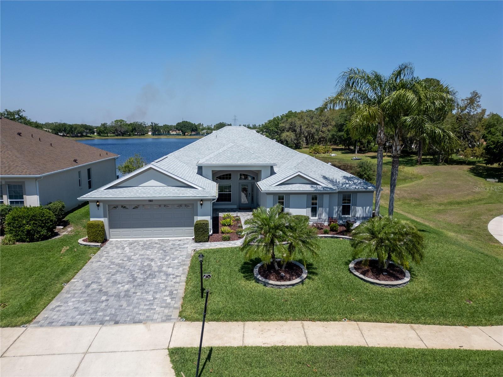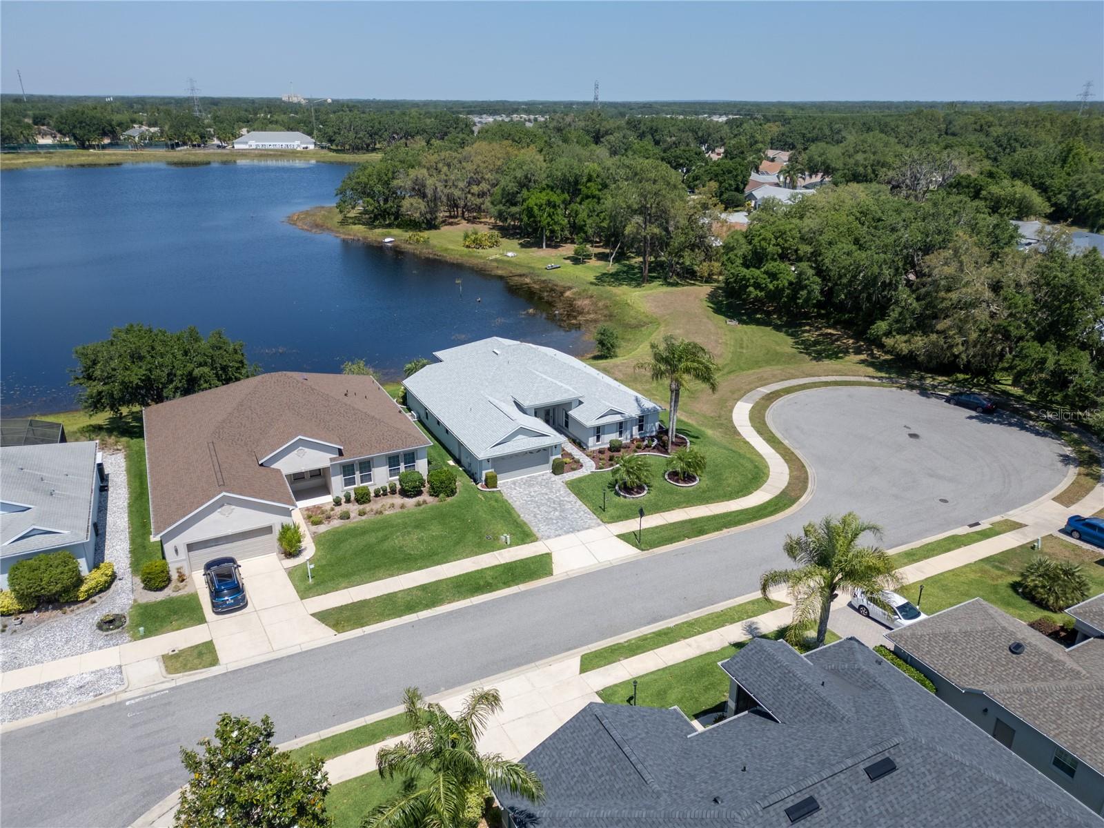 Lakefront, Lakefront, Lakefront! You will immediately fall in love with this beautiful 2600 sq. ft. Custom Designer Home with a stunning view of Lake Lessman. Your Piece of Paradise unfolds as you walk through the leaded glass entry onto a magnificent mosaic tile masterpiece. Your eyes are immediately drawn to the luxurious Great Room and Formal Dining room, with soaring 14 ft. ceilings boasting exquisite dentil crown moldings. French Doors open to an expansive quarry-tiled lanai showcasing a panoramic lake view with spectacular wildlife on display! Upscale amenities abound throughout this breathtaking home. The Gourmet Kitchen features custom cherry cabinets, Corian countertops, center island with built-in trash compactor, stainless steel appliances, and an oversized pantry. An indoor laundry room includes a deep sink, storage cabinets, and a LG stainless steel washer and dryer. A cozy family room adjacent to the kitchen also has French doors with a captivating lake view. Two spacious bedrooms provide luxurious Master and Guest sleeping accommodations with adjoining full baths. Each bathroom has custom wood cabinets and quartz countertops with adjacent large walk-in custom California Closets. Other amenities include decorative ceiling fans, upscale light fixtures, and custom window treatments throughout. A wet bar with combination refrigerator and wine cooler are included for entertaining guests. A dedicated office/den is located off the entryway. A pavered driveway leads to a 2 car garage with an epoxy floor. Exterior landscape lighting with decorative stone landscape borders create an enhanced ambience. Recent upgrades include new roof and gutters in 2022, new HVAC in 2018, and freshly painted exterior in 2024. The Plantation at Leesburg is a 55+ community offering 24/7 guard-gated security, three clubhouses and pools, two 18 hole golf courses, Pickleball, tennis, bocce ball, and an on site restaurant and bar for dining and socializing. This spectacular Piece of Paradise situated at the end of a quiet cul-de-sac offers ultimate privacy and won’t last long.