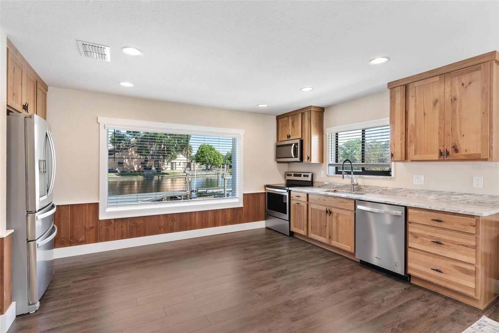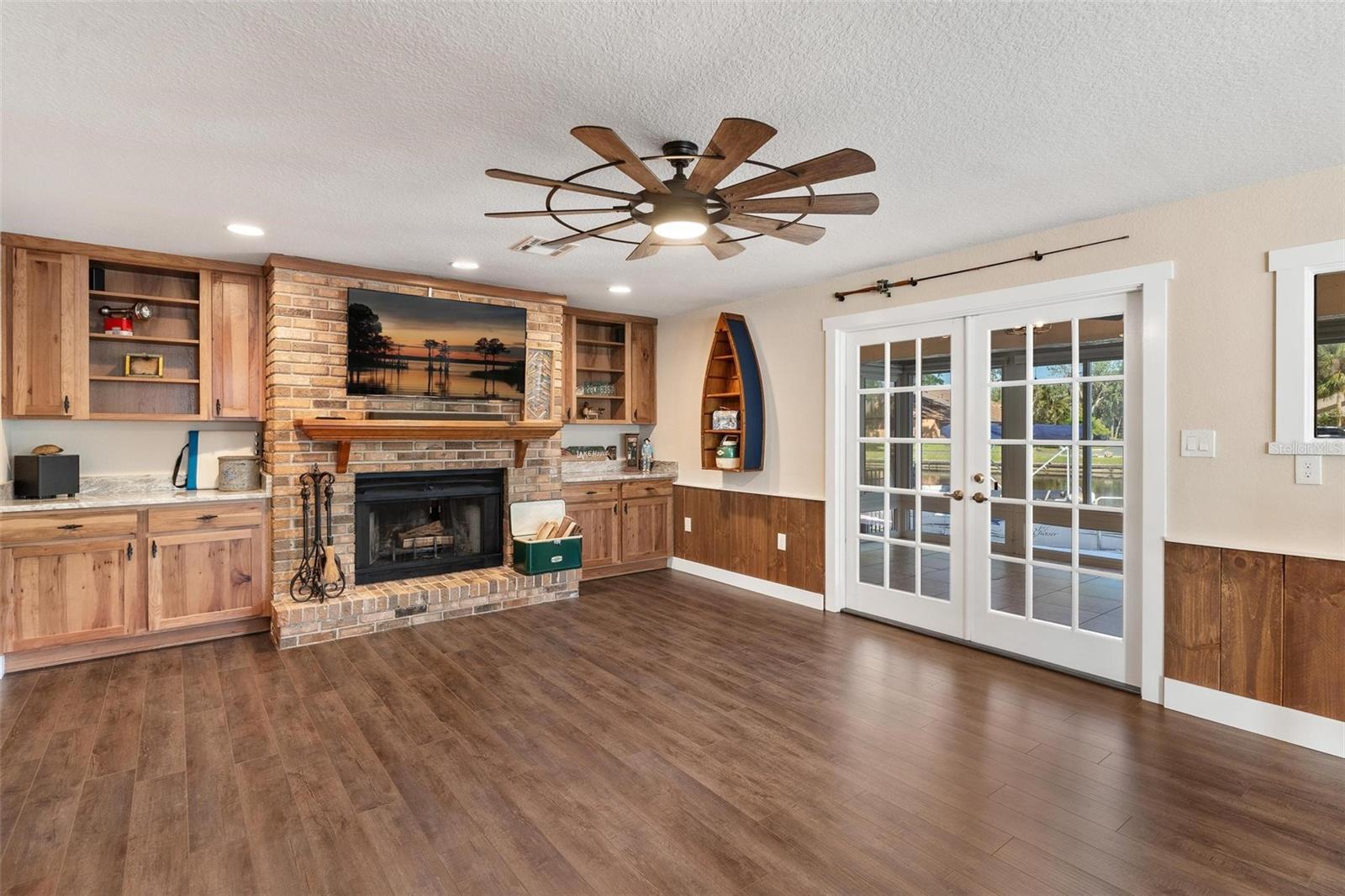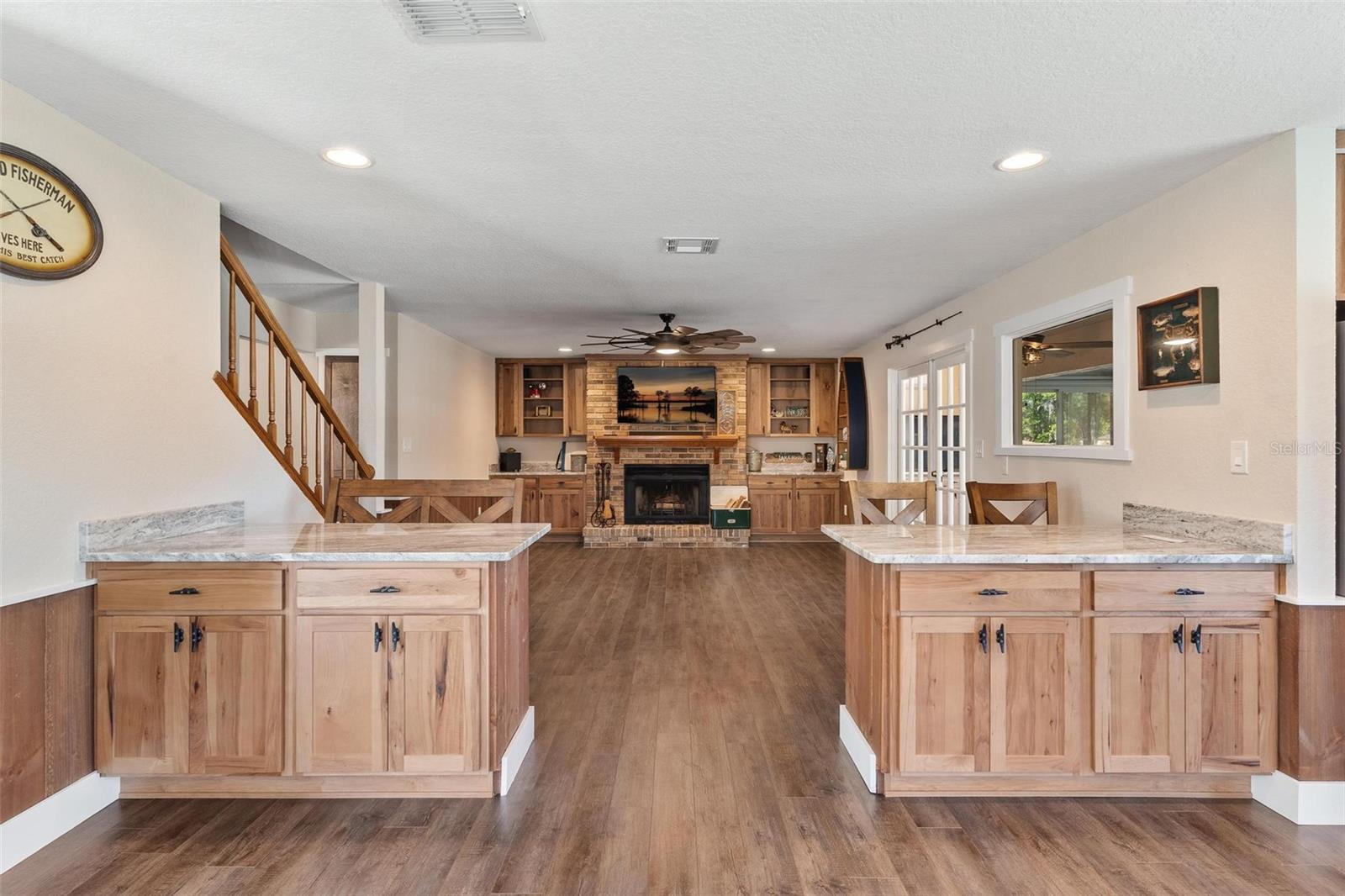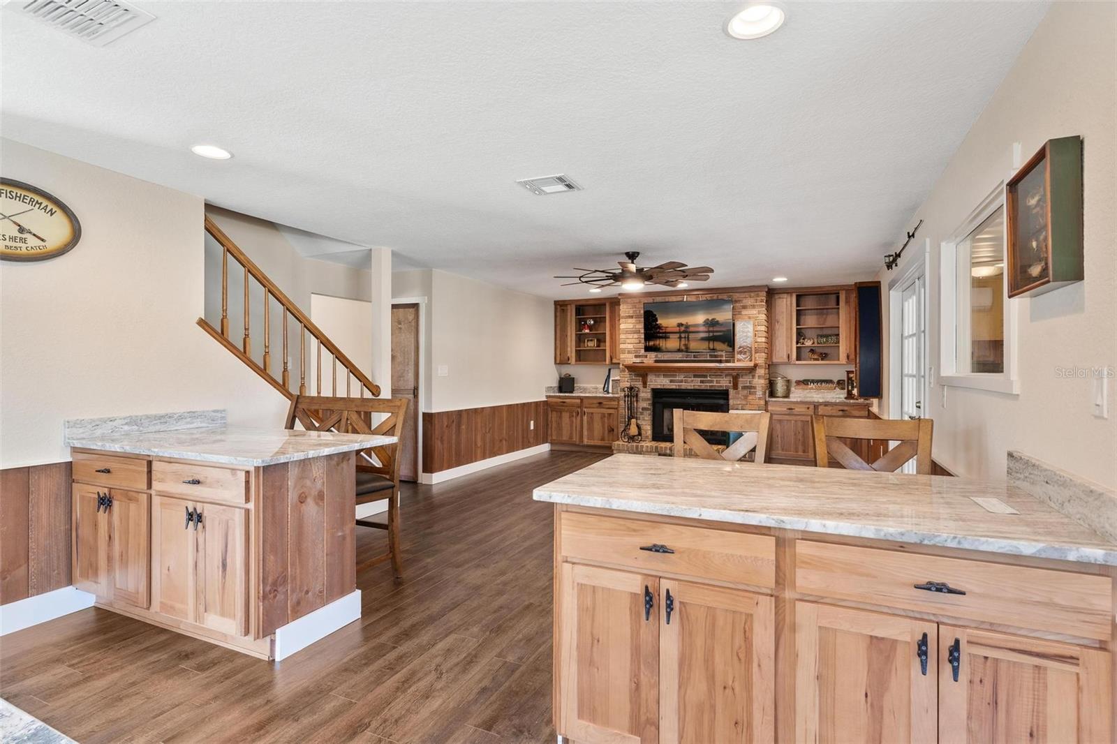 Motivated Seller! Bring all Offers!! Rare Waterfront Opportunity with Access to Lake Harris. Don’t miss this beautifully updated, move-in-ready home on a peaceful lagoon leading to Lake Harris—homes in this sought-after neighborhood rarely hit the market! Enjoy an open floor plan with luxury laminate flooring, a brick wood-burning fireplace, built-ins, and French doors leading to a bright Florida room with water views. The kitchen features wood cabinetry, granite countertops, stainless steel appliances, and two eat-in bars—perfect for entertaining. The upstairs master suite offers a walk-in closet, sun tunnel, and French doors to a private balcony overlooking the water. The en-suite bath features double vanities, granite counters, and a large walk-in shower with dual and rain shower heads. The second bedroom has a private entrance, and both bedrooms include custom wood closet doors. The second full bath includes a tub/shower combo and skylight. Outside, enjoy a 20x10 Florida room, 33x19 concrete patio, double garage, and a 45x16 dock with seawall and a 12,000-lb boat lift. Waterfront views like this sell themselves—schedule your showing today!