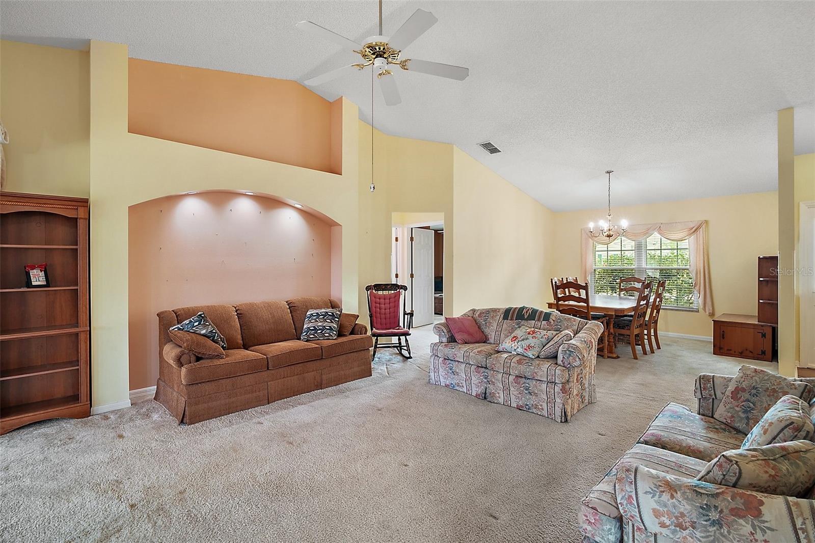 This spacious 3-bedroom, 2-bathroom home with a 2-car garage offers comfort and convenience in the desirable Plantation at Leesburg community. The kitchen boasts a smart layout with plenty of room to cook and gather, including a 12-foot eating area that flows into a versatile living room/dining room combo—perfect for entertaining. The split floor plan ensures privacy, with two guest rooms and a full bath on one side, and the owner’s suite—featuring a private bathroom and generous closet space—on the other. Roof is 10 years old and AC is 2019. Enjoy quiet mornings or lively evenings in the enclosed lanai with newer windows, or host a barbecue on the large patio. The community features two golf courses, three swimming pools, walking trails, tennis and pickleball courts, workout rooms, and a full calendar of activities. Ride your golf cart over to the on-site restaurant for lunch and a cold drink, or enjoy live entertainment on the patio. With a low HOA, proximity to shopping and the turnpike, and the possibility of a quick settlement, this home offers a calm, active lifestyle in a welcoming neighborhood.