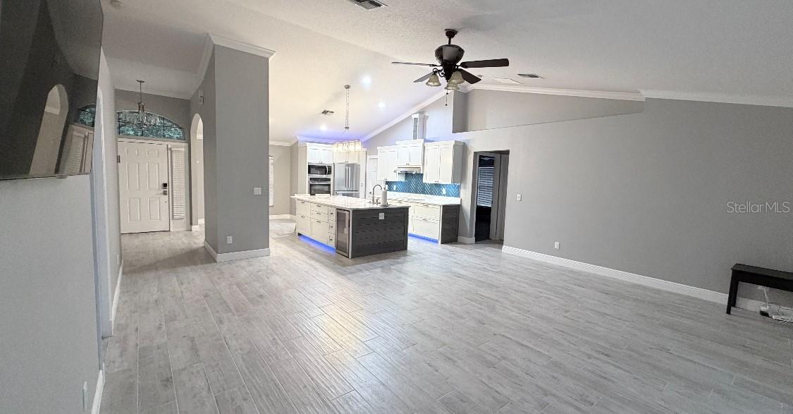 Fully Renovated 4-Bed/2-Bath Home with 2024 Roof & Chef's Kitchen. Welcome to your spectacular, completely updated turn-key home, nestled under a canopy of magnificent, mature oak trees in the quiet, desirable Lake Pointe neighborhood of Leesburg, FL. This property seamlessly blends quality craftsmanship with a serene Florida lifestyle. Meticulously renovated with attention to every detail, from fresh landscaping to new lighting fixtures and wall plate covers. Peace of mind comes standard with a brand-new roof and turn-key mechanicals. Perfectly situated on an oversized lot fully fenced, private backyard featuring a freshly painted screened enclosure and ample shade for sunset relaxation. Step inside this 4-bedroom, 2-bathroom residence to discover high vaulted ceilings and elegant crown molding. The flowing floor plan features modern tile flooring throughout the main living areas and beautiful wood floors in the bedrooms. The large family room, illuminated by natural light through two expansive sliding doors, offers seamless indoor-outdoor living. The heart of the home is a chef's dream kitchen, boasting a stunning one-piece stone countertop island with ample seating, integrated shelving, and a built-in drink/wine refrigerator. All new stainless steel appliances, including a separate cooktop and a conveniently located oven, microwave, and refrigerator, complete this functional and beautiful space. Retreat to the large primary bedroom suite featuring rich wood flooring and a spacious walk-in closet. The spa-like primary bath suite offers double modern sinks, a new vanity with a top-of-the-line stone countertop, and a custom walk-in shower with two separate, controllable rain shower heads. The second and third bedrooms are intelligently located on the opposite side of the home, sharing a completely remodeled second bathroom, with the versatile fourth bedroom situated near the front entrance.Enjoy convenient living centrally located between several beautiful lakes in Leesburg, with easy access to various nearby downtowns, shopping centers, and a quick commute via the Florida Turnpike. This level of quality and a truly turn-key condition is a rare find.