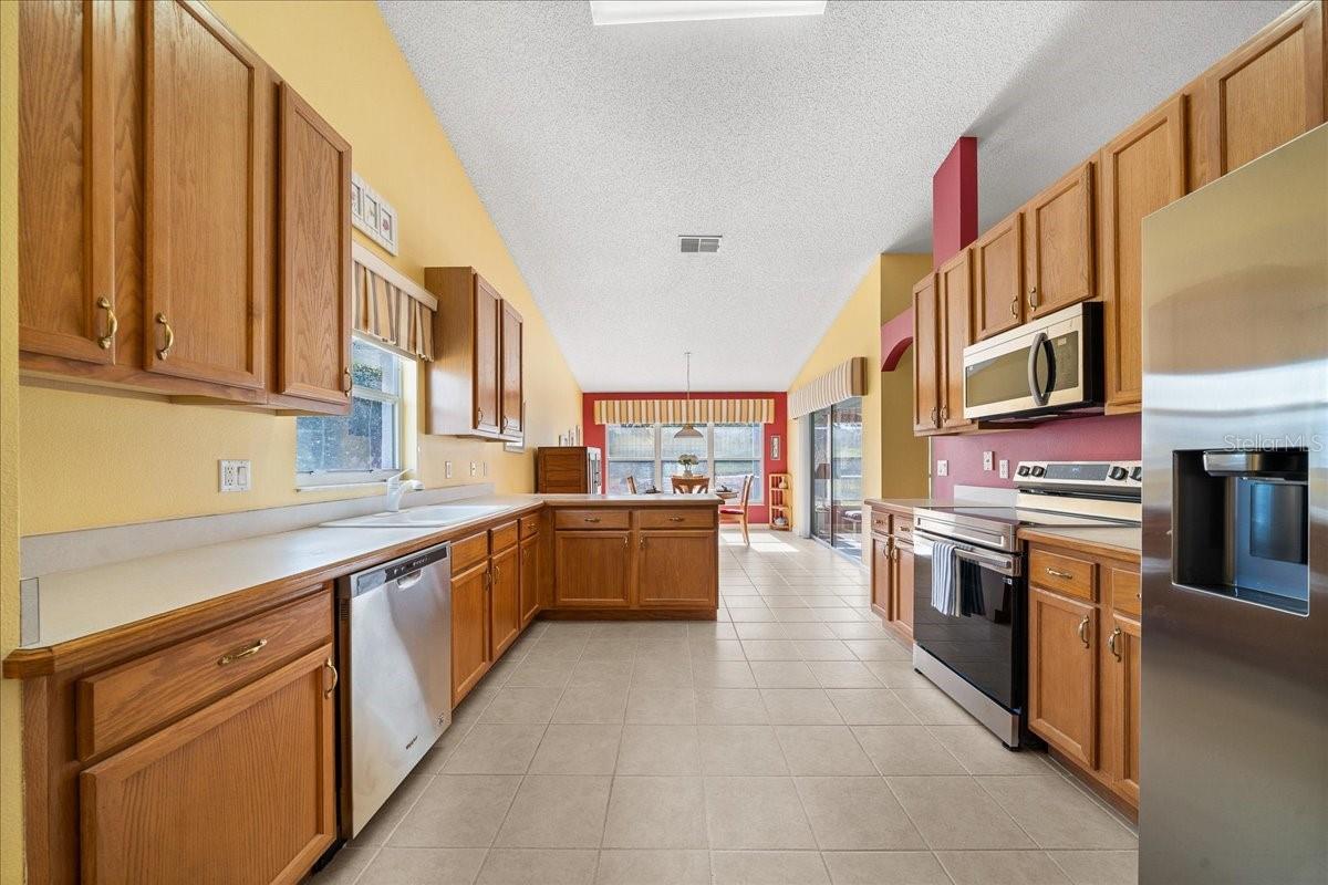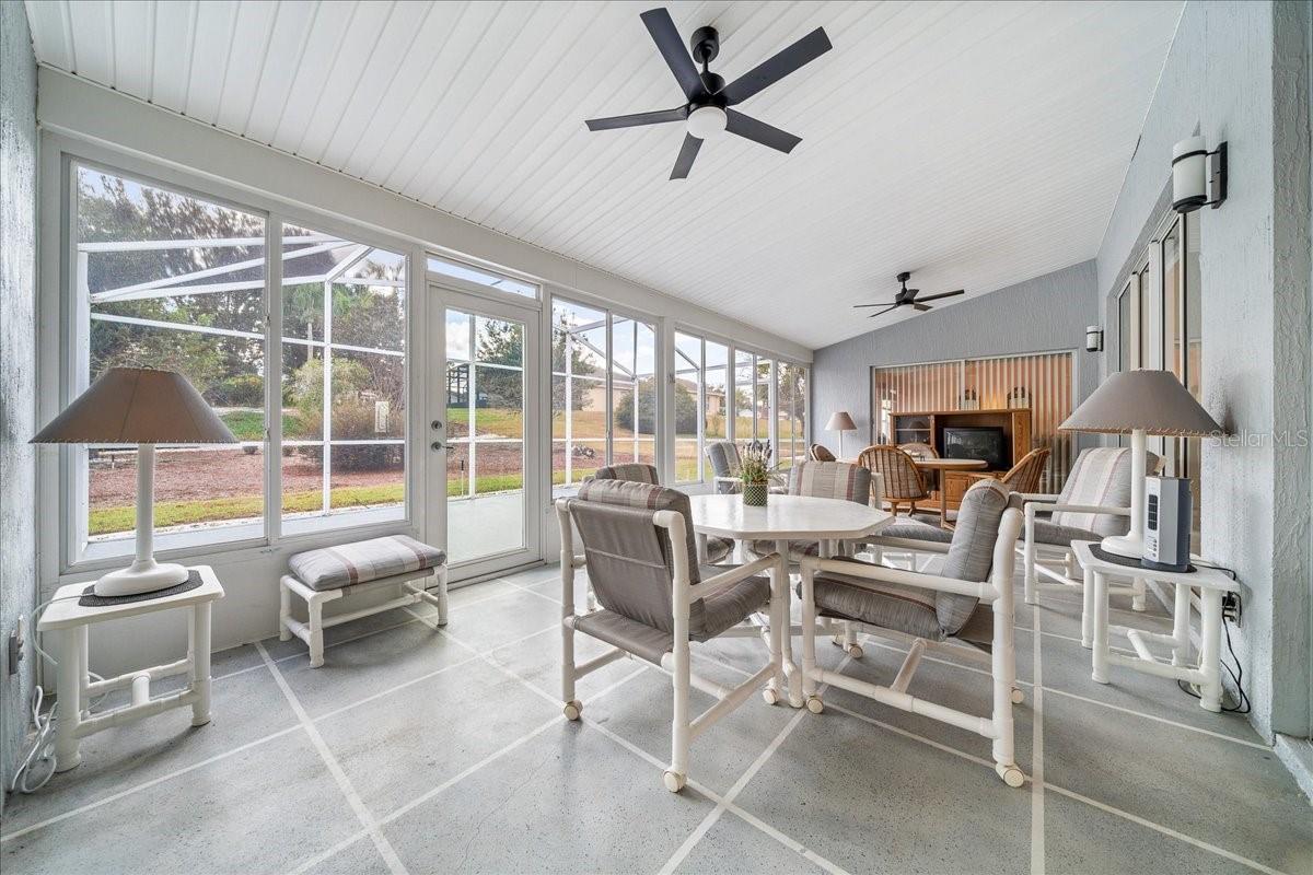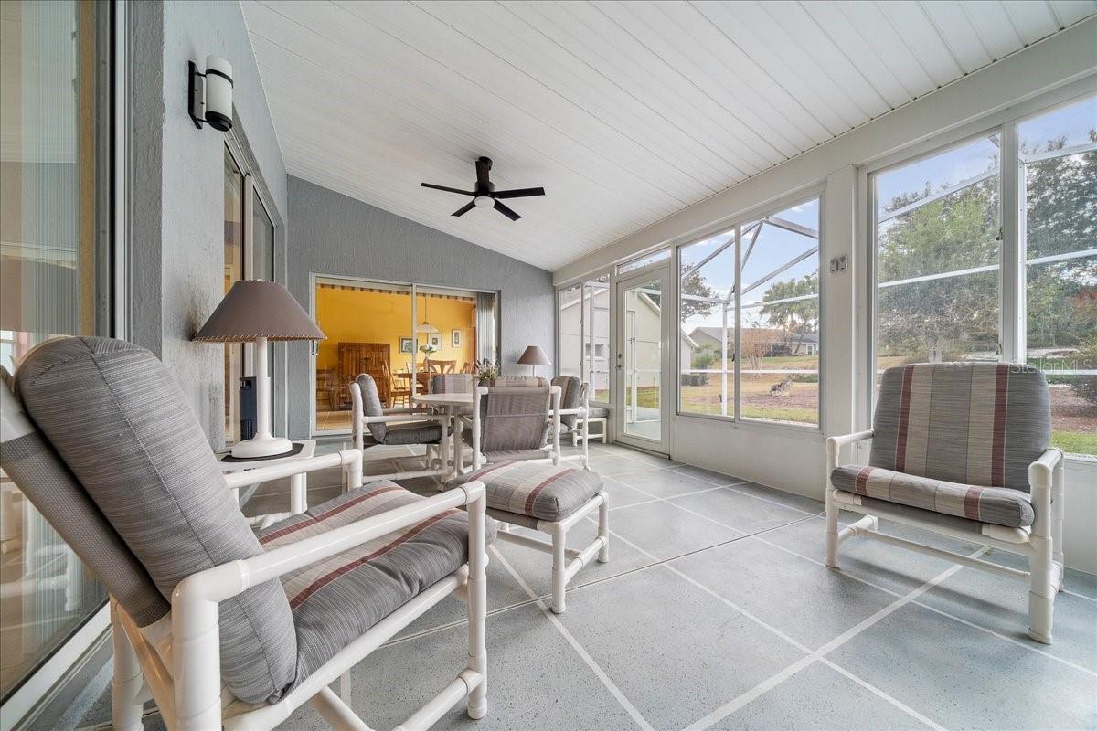 Welcome to this beautifully maintained Timberline model located in the highly desirable, gated 55+ community of Plantation at Leesburg. Offered FULLY FURNISHED including all furniture, dishes, towels and lanai furniture — just bring your suitcase and start living the Florida lifestyle! This light-filled 2 bedroom + DEN, 2 bath home features soaring high ceilings in the living room, dining room and expansive GLASS-ENCLOSED LANIA with UPDATED FANS (2026), creating an open, airy feel throughout. The living and dining areas flow seamlessly, making entertaining effortless. The separate kitchen boasts brand-new STAINLESS STEEL APPLIANCES (2025), abundant cabinetry, an EAT-IN NOOK, and picturesque views of the large private backyard and garden area — perfect for enjoying your morning coffee with nature. Retreat to the spacious primary suite with a large walk-in closet and a spa-like ensuite offering a SOAKING TUB, separate walk-in shower, private water closet and linen storage. The guest bedroom enjoys its own quiet wing of the home with easy access to the full guest bath, while the DEN provides ideal flex space for a home office, hobby room or extra guest area. You’ll also appreciate the oversized hallway linen closet for additional storage. Step outside to your spacious lanai, which opens to a freshly painted (2026) birdcage with newly painted patio pad (2026) — the perfect setup for outdoor entertaining, relaxing evenings, or gardening on your oversized lot. Additional highlights include: • Roof & HVAC replaced in 2015 • 2-car + golf cart garage • Laundry currently in garage, with a dedicated indoor laundry room used as large pantry/storage • Block & stucco construction • Ceramic tile throughout the home • Meticulously maintained by original owner Enjoy resort-style living with access to three activity centers, each offering pools & spas, fitness centers, tennis, pickleball, softball, on-site restaurant, pro shop and endless social clubs and activities. This is truly a move-in-ready gem in one of Central Florida’s premier 55+ golf communities. Book your private showing today!