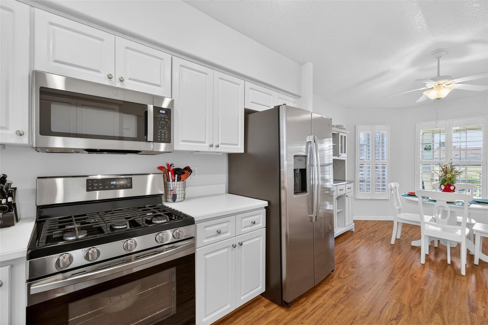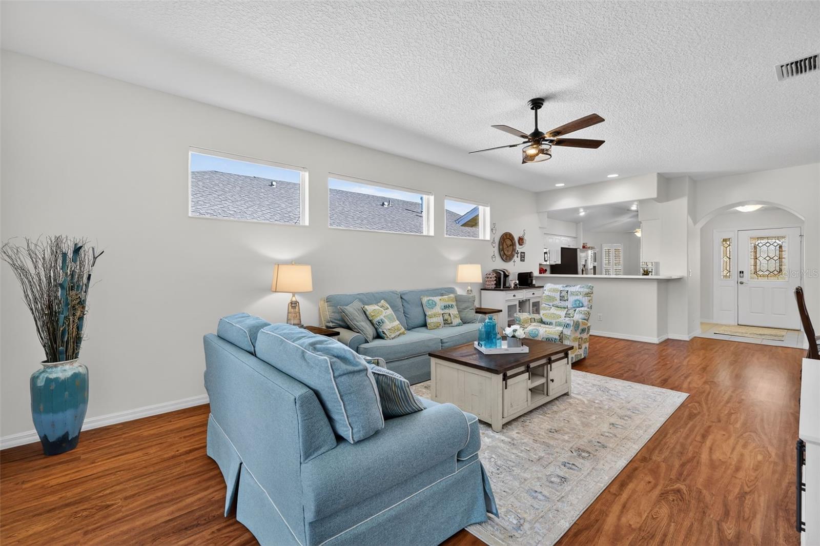 2021 ROOF • SCREENED LANAI W/ BIRDCAGE • WATER VIEW • 10,697 SQFT LOT • Welcome to 26705 Wetlands Way, a beautiful Custom Carlisle model in the prestigious 55+ community of LEGACY OF LEESBURG. Designed with Florida living in mind, this 3-bedroom, 2-bath home blends comfort, charm, and an active lifestyle. You’ll notice the quality from the start, with the block-and-stucco exterior, lush landscaping, and a welcoming gazebo-style screened front porch. Step inside to a ceramic-tiled entry and arched transition into the main living areas. The kitchen is a chef’s dream, featuring Corian counters, stainless steel appliances, plantation shutters, a casual eat-in nook, and an opening to the living area for easy entertaining. The living and dining spaces are cozy and elegant with high ceilings, luxury vinyl plank flooring, and sun-filled windows for natural lighting and French doors to the lanai. The primary suite includes cozy carpeting, a walk-in closet, and an ensuite bath with a tiled walk-in shower and Corian vanity. The two guest bedrooms are also carpeted with ceiling fans and built-in closets, while the guest bath features a tub/shower combo. A separate laundry room with a washer and dryer leads to the 2-car garage with a full garage door screen. Retreat to the covered and screened lanai with birdcage enclosure, where you’ll enjoy the tranquil water view- perfect for unwinding or hosting friends. Legacy of Leesburg offers unparalleled community amenities, including miles of nature trails, a heated resort-style pool, pickleball, tennis, bocce, softball, shuffleboard, and on-site RV and boat storage.