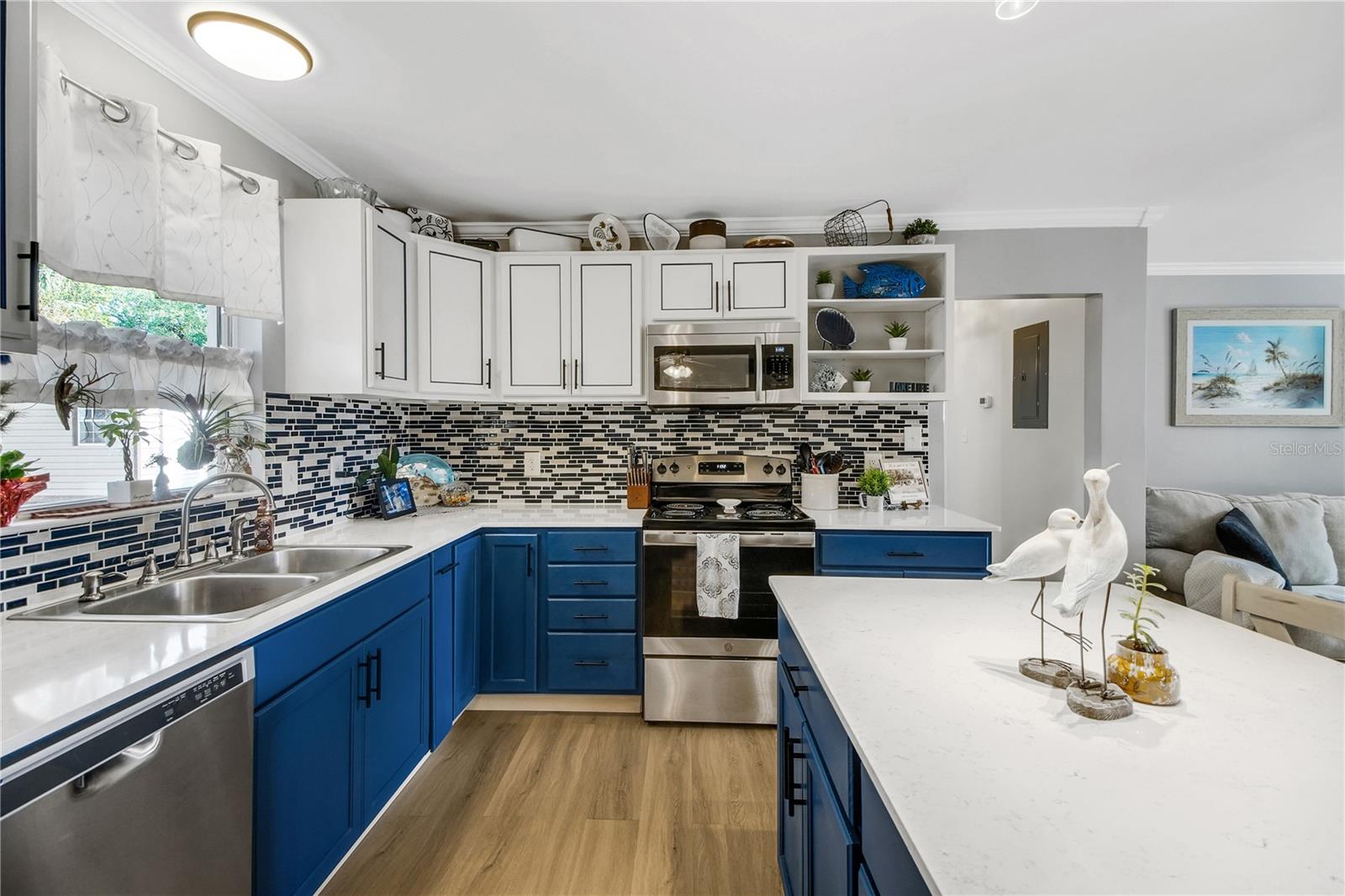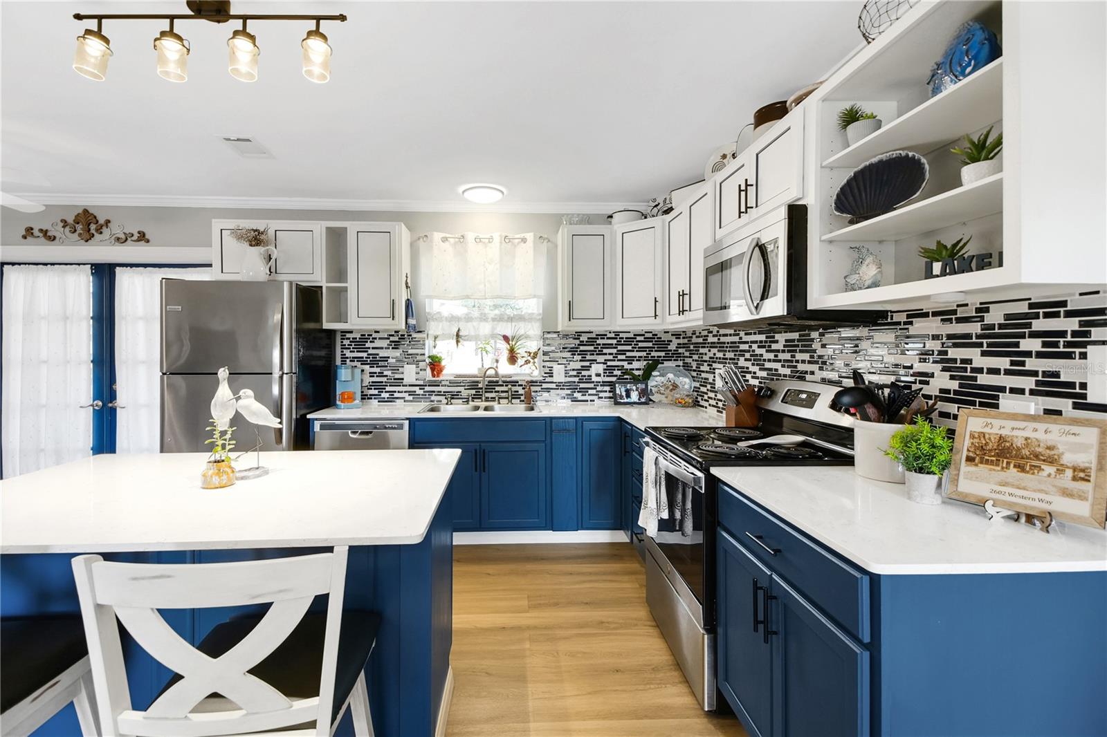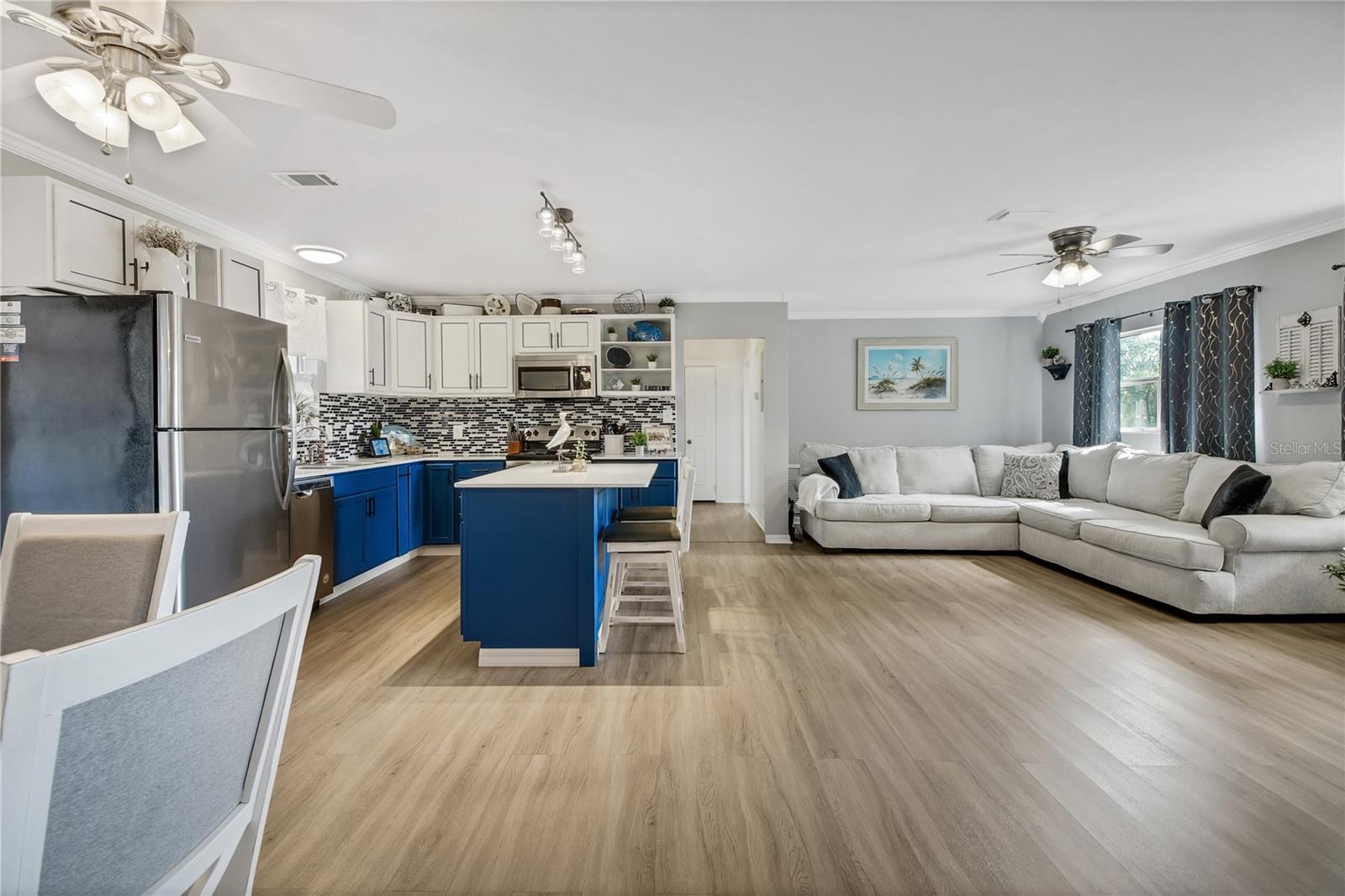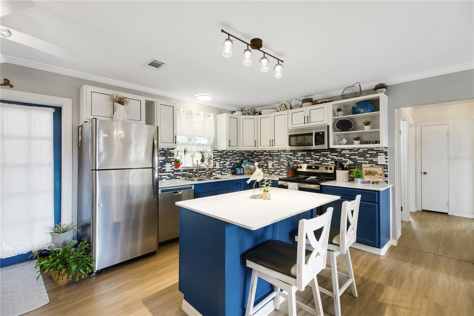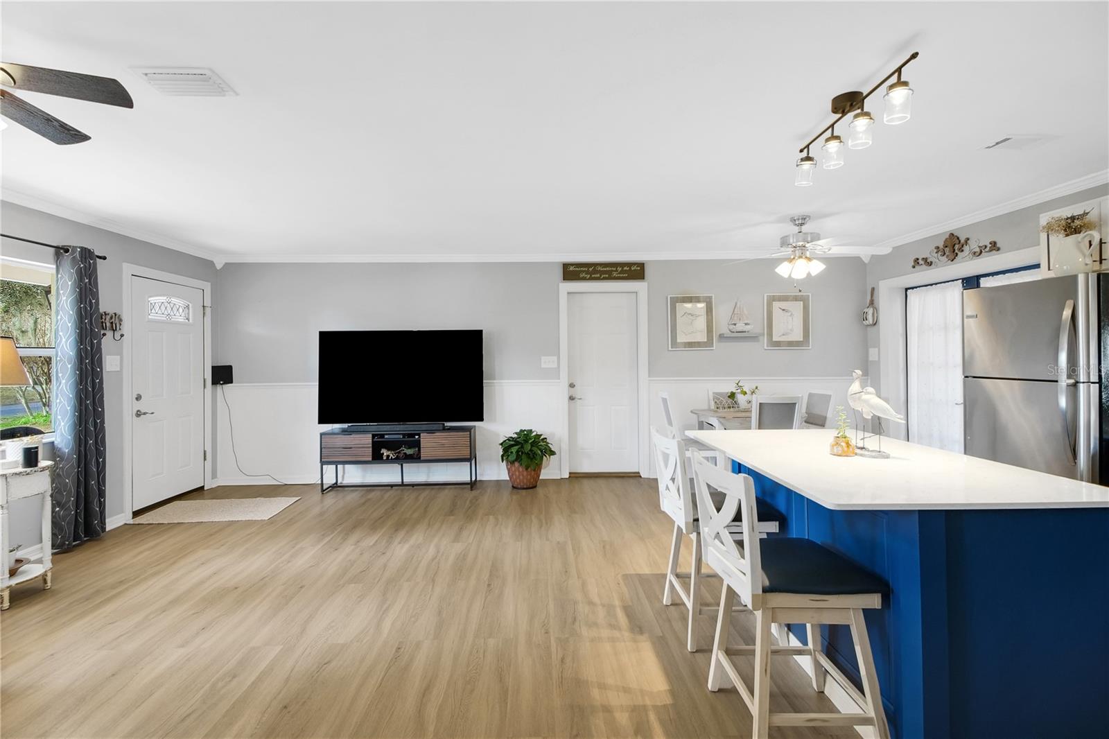 Adorable, cozy fully renovated home 2 bed 1 bath in Leesburg just a few minutes drive to The Villages! NEW ROOF in 2021. NEW HVAC in 2021. NEW Water Heater in 2025. Tucked back in a quiet neighborhood, you are surrounded by mature trees and oversized lots. This home is situated on a .27 acre lot. Upon entering the open floor plan, you will be pleasantly surprised by how large the home feels. New flooring throughout, giving a cohesive feel, which leads you from the living room to the kitchen where you will find new cabinetry, quartz counter tops, and all new SS appliances. The dining area offers French doors out to your new deck and backyard. Both bedrooms can be found down the hall where a new closet system has been installed in the master bedroom. You will find crown molding and fresh paint throughout the entire home. The full bathroom provides an extended quartz counter space for an incredibly useful vanity. NEWER WASHER AND DRYER installed in your laundry room which provides ample storage for the home with additional cabinetry and room for an additional bathroom if desired. The Florida room has an A/C window unit to enjoy the bonus area year round and also provides an additional area to entertain or could be used as a craft room or sunroom. The backyard has some BONUSES featuring a large 20 x 10 shed (with an A/C window unit and an 8 x 20 porch), a 12 x 24 new shed (less than 2 years old) and a smaller shed (9x7.5') that can hold your garden and lawn tools. Come check out this beauty before it's gone!