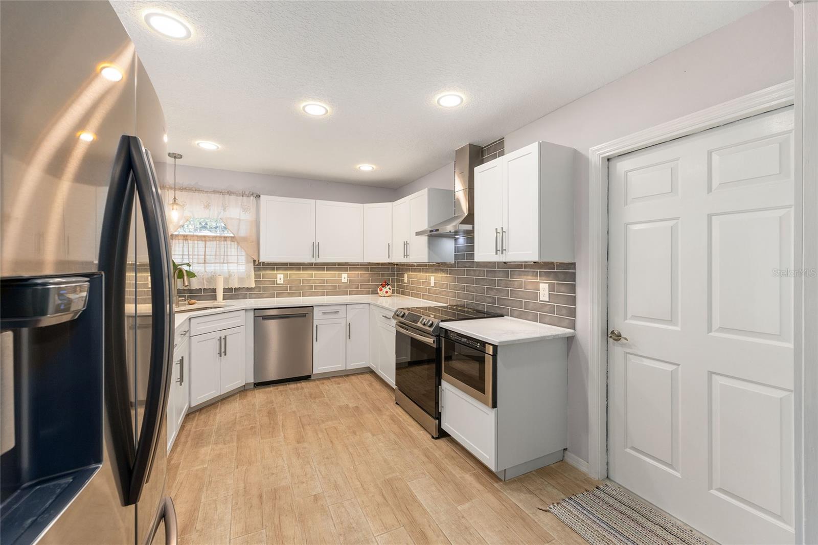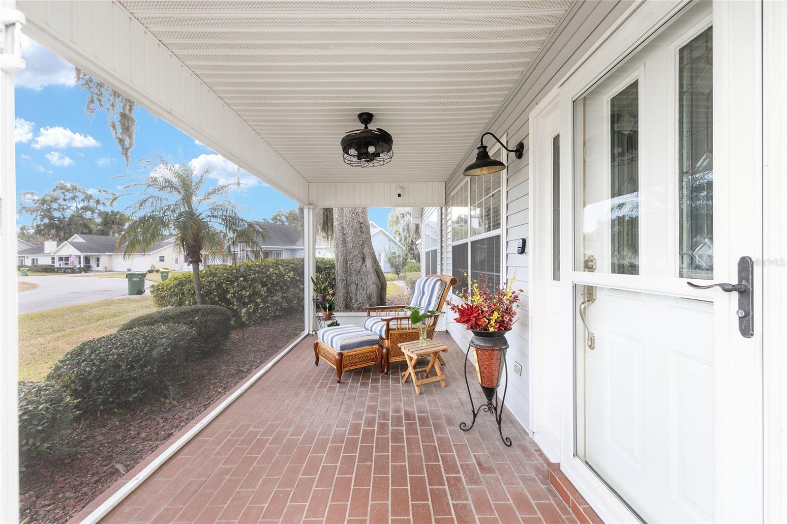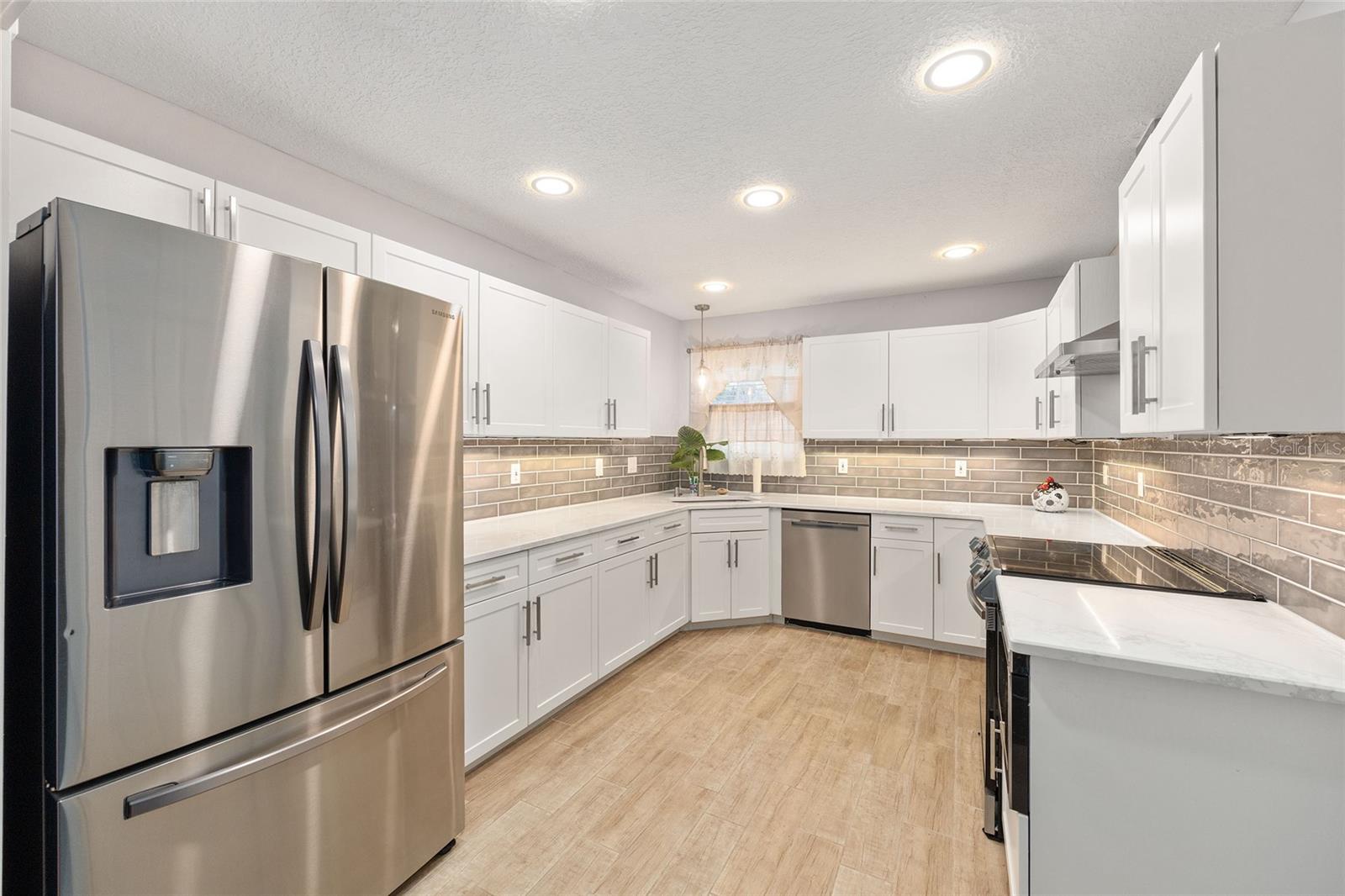 Wake up every morning to breathtaking views and sunrises over Lake Griffin from your screened front porch and from many rooms throughout the home. This move-in ready residence offers the perfect blend of comfort, style, and low-maintenance living. The driveway leads you to this unique single-family duplex-style home with the rare bonus of an oversized two-car garage with laundry area. Inside, the home feels light and open with a cathedral ceiling great room featuring a gas fireplace with quartz surround, perfect for cozy evenings. The updated kitchen is designed for both everyday living and entertaining, featuring quartz counter tops, shaker-style cabinetry, stainless steel appliances, a WiFi-enabled range and refrigerator, in-cabinet microwave drawer, and abundant storage. LED recessed and under-cabinet lighting brighten the space beautifully. The private master suite features a vaulted ceiling, oversized walk-in closet, and a fully updated spa-style bath with dual walk-in showers, double sinks, and granite countertops. The split-bedroom floor plan provides privacy, with two additional spacious bedrooms filled with natural light and sharing a guest bath with double vanity and granite counters. Simply relax on your porch, enjoy the panoramic lake views, and let someone else handle the maintenance. Low-stress living, incredible views, and a beautifully updated home — all in one perfect package.