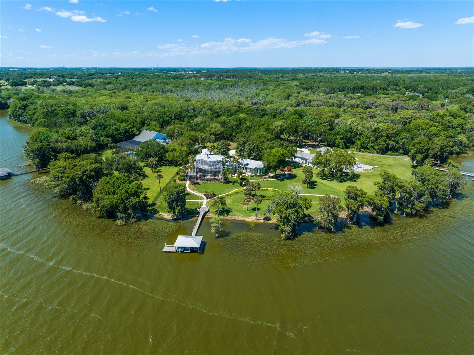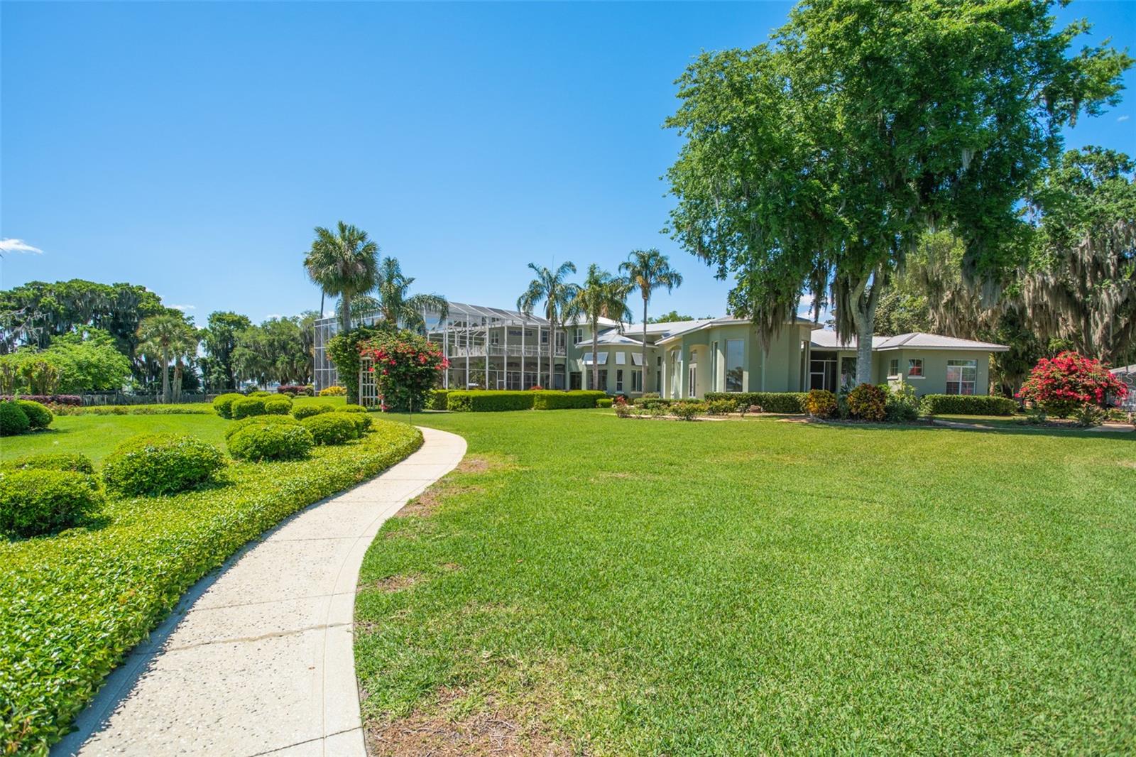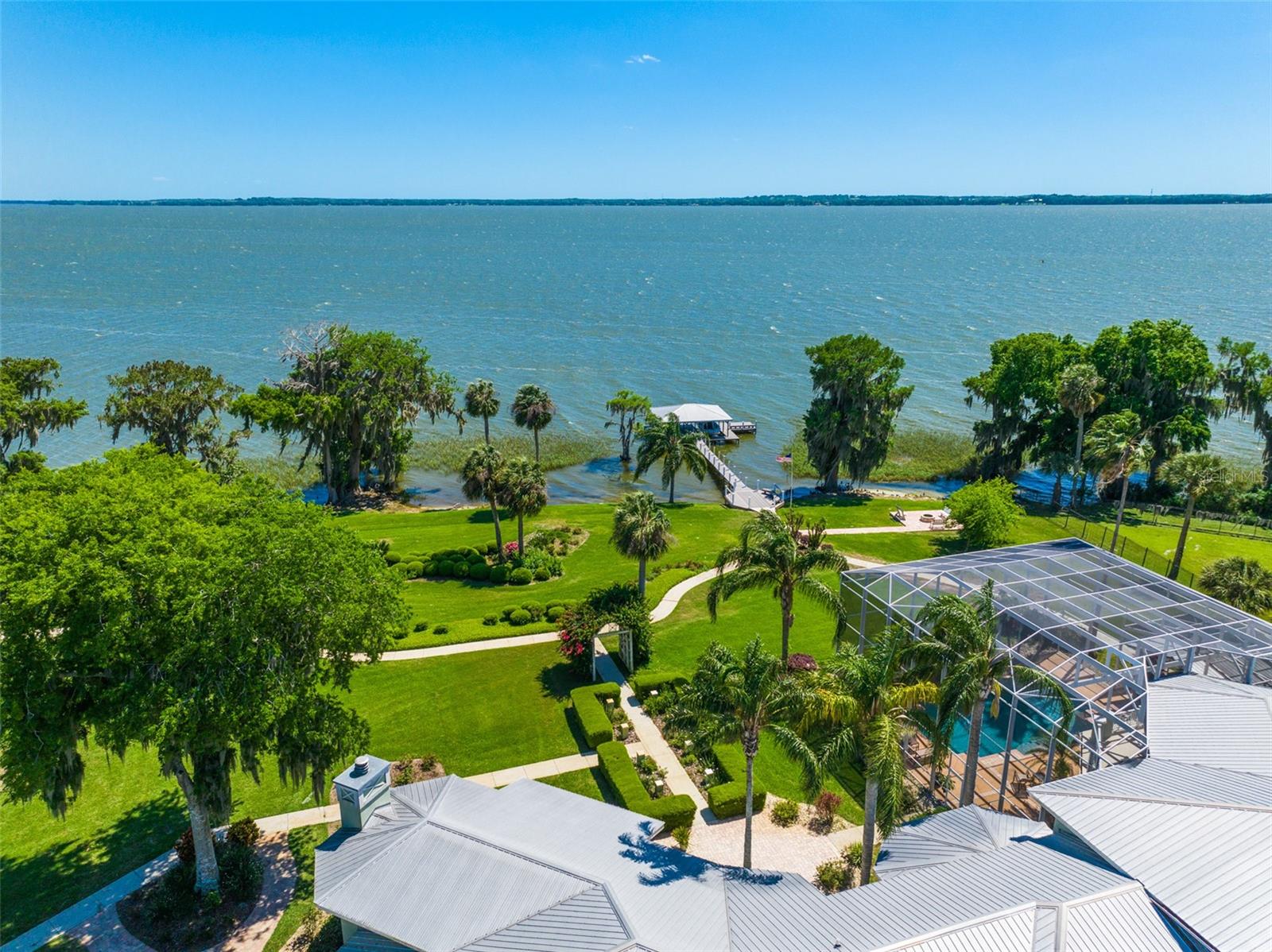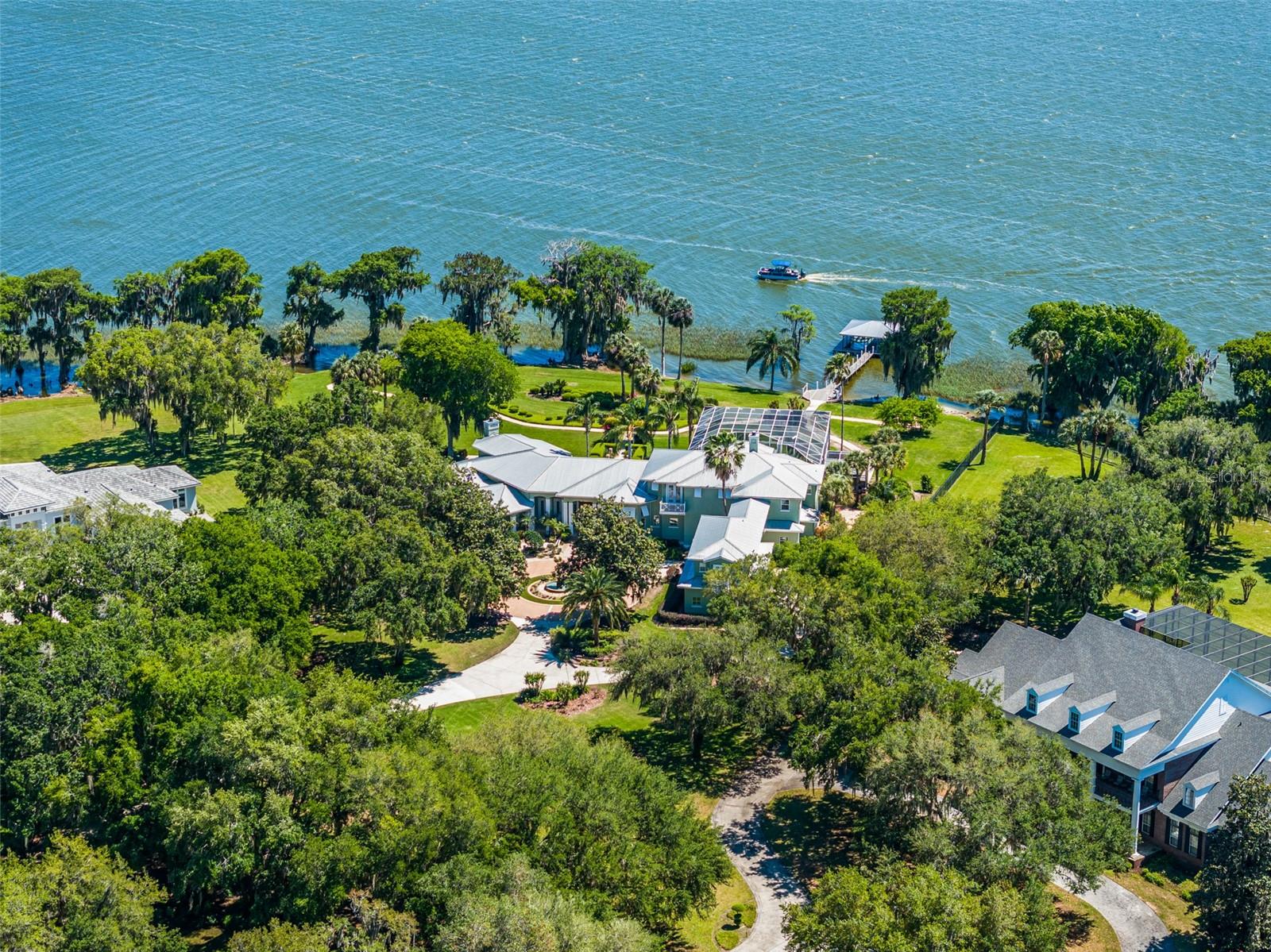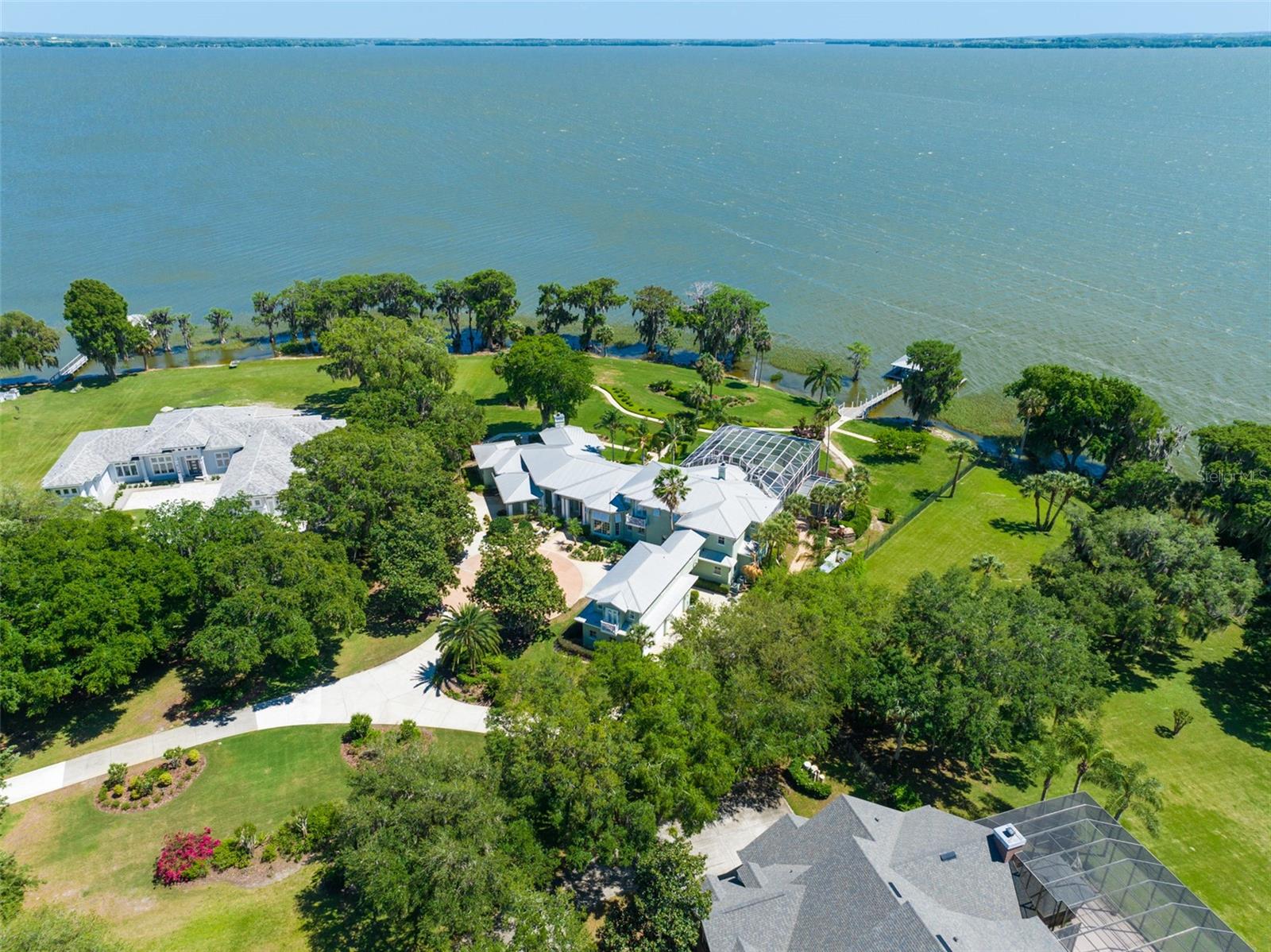 Discover an unrivaled waterfront paradise nestled directly on the shores of Lake Harris, part of the esteemed Harris Chain of Lakes. This expansive estate, accessible through a private gated driveway, offers a unique fusion of privacy, luxury, and leisure. The immediate homesite consists of 3.06 acres, while enjoying private ownership of an adjacent 46+/- conservation acres for additional privacy. Step into the custom-built 8,542 square foot sanctuary, masterfully designed to showcase breathtaking lake views from virtually every room. Marvel at the exquisite craftsmanship and attention to detail, from the elegantly laid diagonal hardwood floors and porcelain tiles to the intricate ceilings showcasing tongue & groove, barrel, coffered, and tray designs. Delight in the custom millwork, leaded glass entry door, granite countertops, multiple fireplaces, and designer finishes that grace every corner. Oversized windows throughout invite an abundance of natural light, framing the tranquil water vistas. Embrace the epitome of outdoor living that caters to both relaxation as well as formal entertaining. Your private backyard oasis awaits, complete with a serene walking path leading down to your personal firepit area and composite dock and boathouse, equipped with two lifts. Indoors, the thoughtfully designed floorplan offers a myriad of living spaces for everyone to enjoy. The open chef’s kitchen and dining areas provide the perfect setting for hosting unforgettable gatherings, seamlessly flowing into the massive pool area. Discover additional living spaces, including a dedicated homework station, a first-floor game room, and an office boasting custom wood details. Each bedroom hosts its own luxurious ensuite, while the versatile room above the garage can be transformed from a movie theater to guest quarters, home gym, or any flex space desired. Nestled within the renowned Harris Chain of Lakes in Central Florida, this exclusive retreat offers an unparalleled sense of seclusion while remaining mere minutes from a wealth of amenities including access to a public dock and boat ramp for additional ease. Explore the charming downtowns of Leesburg and nearby Mount Dora. Immerse yourself in the vibrant atmosphere of The Villages, and enjoy convenient access to UF Health & Advent Health, golf courses, and sports complexes. A myriad of shopping and dining options along US Hwy 441 await, and Leesburg International Airport is just a short drive away. Disney and Orlando International Airport are both within an hour's reach, making this estate the epitome of tranquility and convenience.
