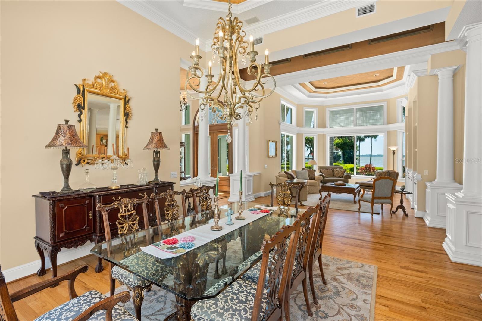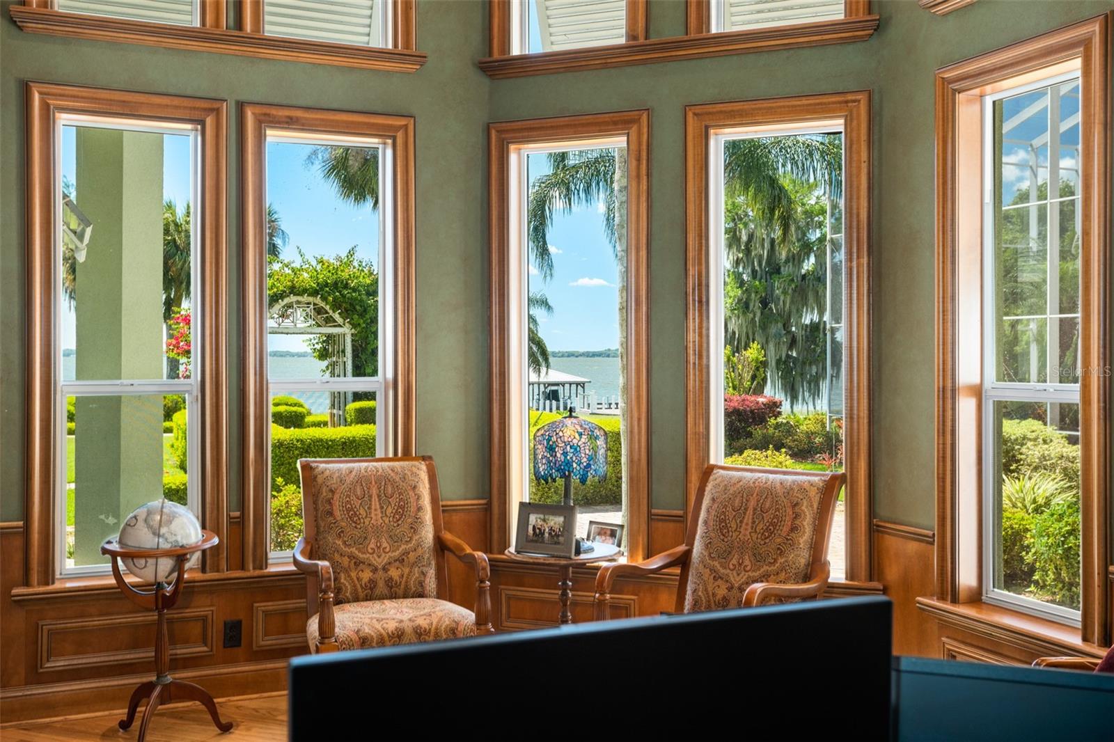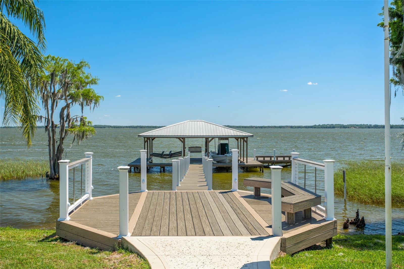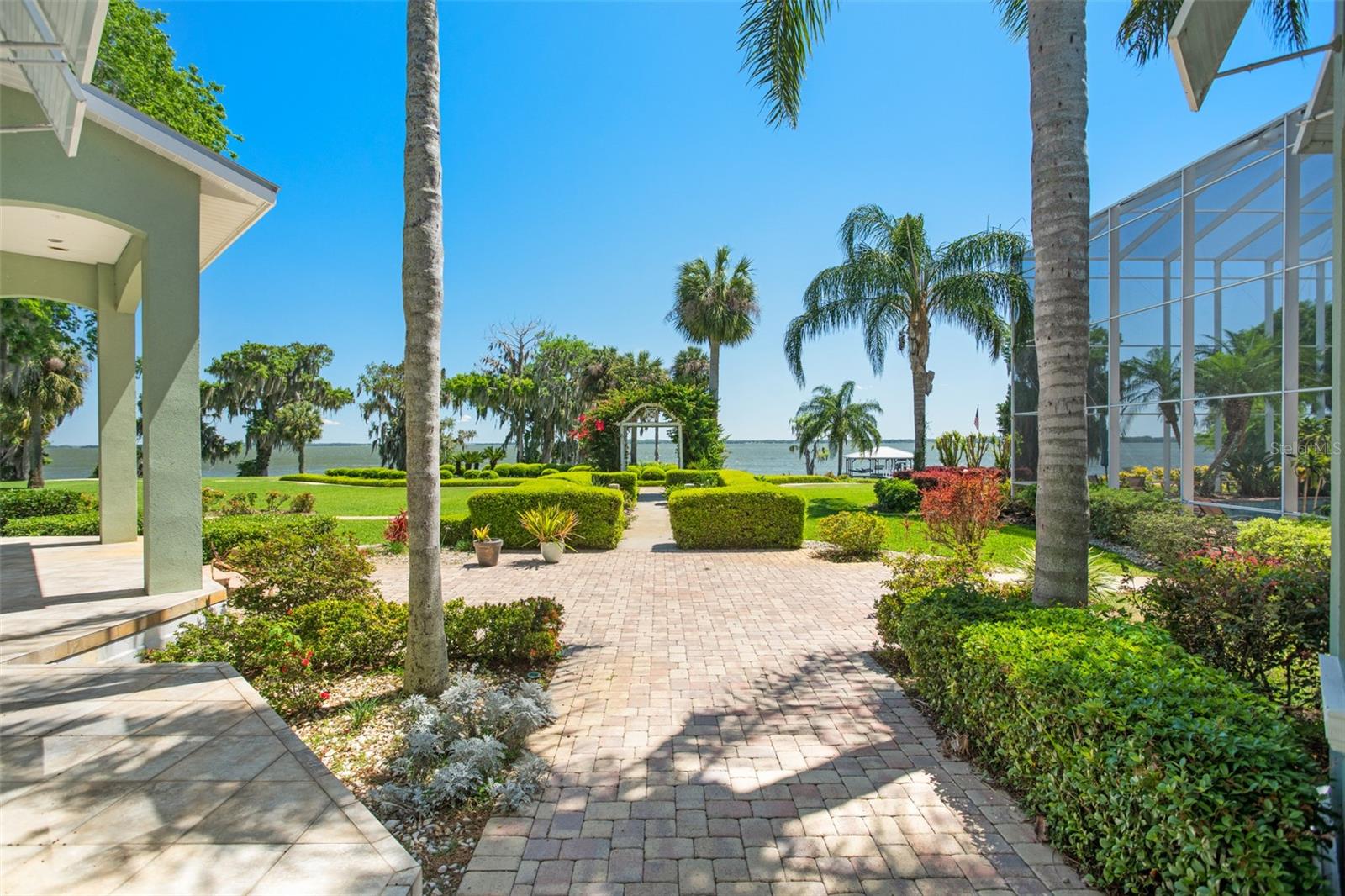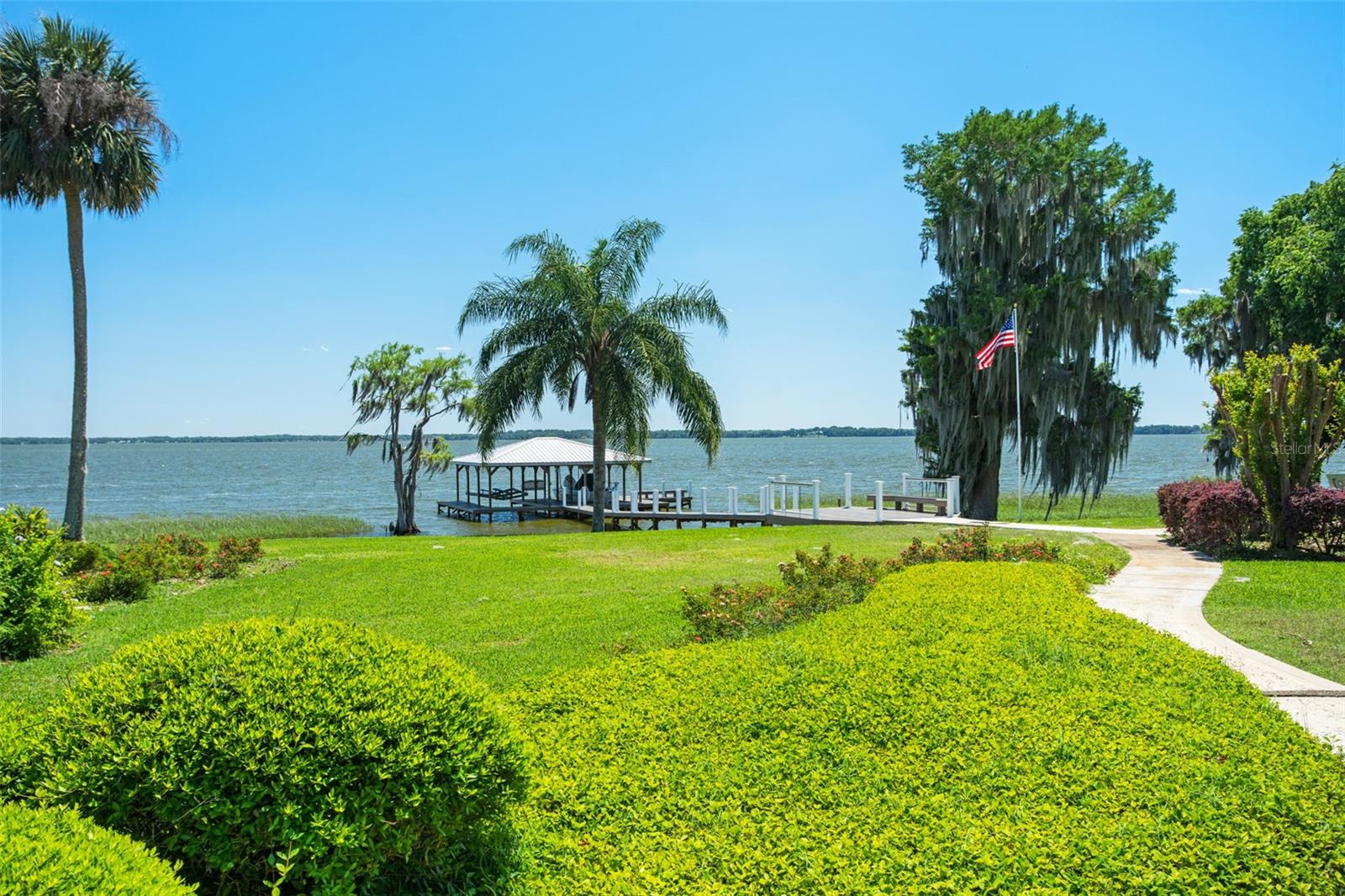 Discover an unrivaled waterfront paradise nestled directly on the shores of Lake Harris, part of the esteemed Harris Chain of Lakes. This expansive estate, accessible through a private gated driveway, offers a unique fusion of privacy, luxury, and leisure. The immediate homesite consists of 3.06 acres, while enjoying private ownership of an adjacent 46+/- conservation acres for additional privacy. Step into the custom-built 8,542 square foot sanctuary, masterfully designed to showcase breathtaking lake views from virtually every room. Marvel at the exquisite craftsmanship and attention to detail, from the elegantly laid diagonal hardwood floors and porcelain tiles to the intricate ceilings showcasing tongue & groove, barrel, coffered, and tray designs. Delight in the custom millwork, leaded glass entry door, granite countertops, multiple fireplaces, and designer finishes that grace every corner. Oversized windows throughout invite an abundance of natural light, framing the tranquil water vistas. Embrace the epitome of outdoor living that caters to both relaxation as well as formal entertaining. Your private backyard oasis awaits, complete with a serene walking path leading down to your personal firepit area and composite dock and boathouse, equipped with two lifts. Indoors, the thoughtfully designed floorplan offers a myriad of living spaces for everyone to enjoy. The open chef’s kitchen and dining areas provide the perfect setting for hosting unforgettable gatherings, seamlessly flowing into the massive pool area. Discover additional living spaces, including a dedicated homework station, a first-floor game room, and an office boasting custom wood details. Each bedroom hosts its own luxurious ensuite, while the versatile room above the garage can be transformed from a movie theater to guest quarters, home gym, or any flex space desired. Nestled within the renowned Harris Chain of Lakes in Central Florida, this exclusive retreat offers an unparalleled sense of seclusion while remaining mere minutes from a wealth of amenities including access to a public dock and boat ramp for additional ease. Explore the charming downtowns of Leesburg and nearby Mount Dora. Immerse yourself in the vibrant atmosphere of The Villages, and enjoy convenient access to UF Health & Advent Health, golf courses, and sports complexes. A myriad of shopping and dining options along US Hwy 441 await, and Leesburg International Airport is just a short drive away. Disney and Orlando International Airport are both within an hour's reach, making this estate the epitome of tranquility and convenience.