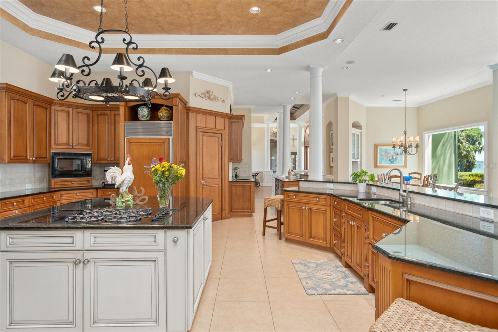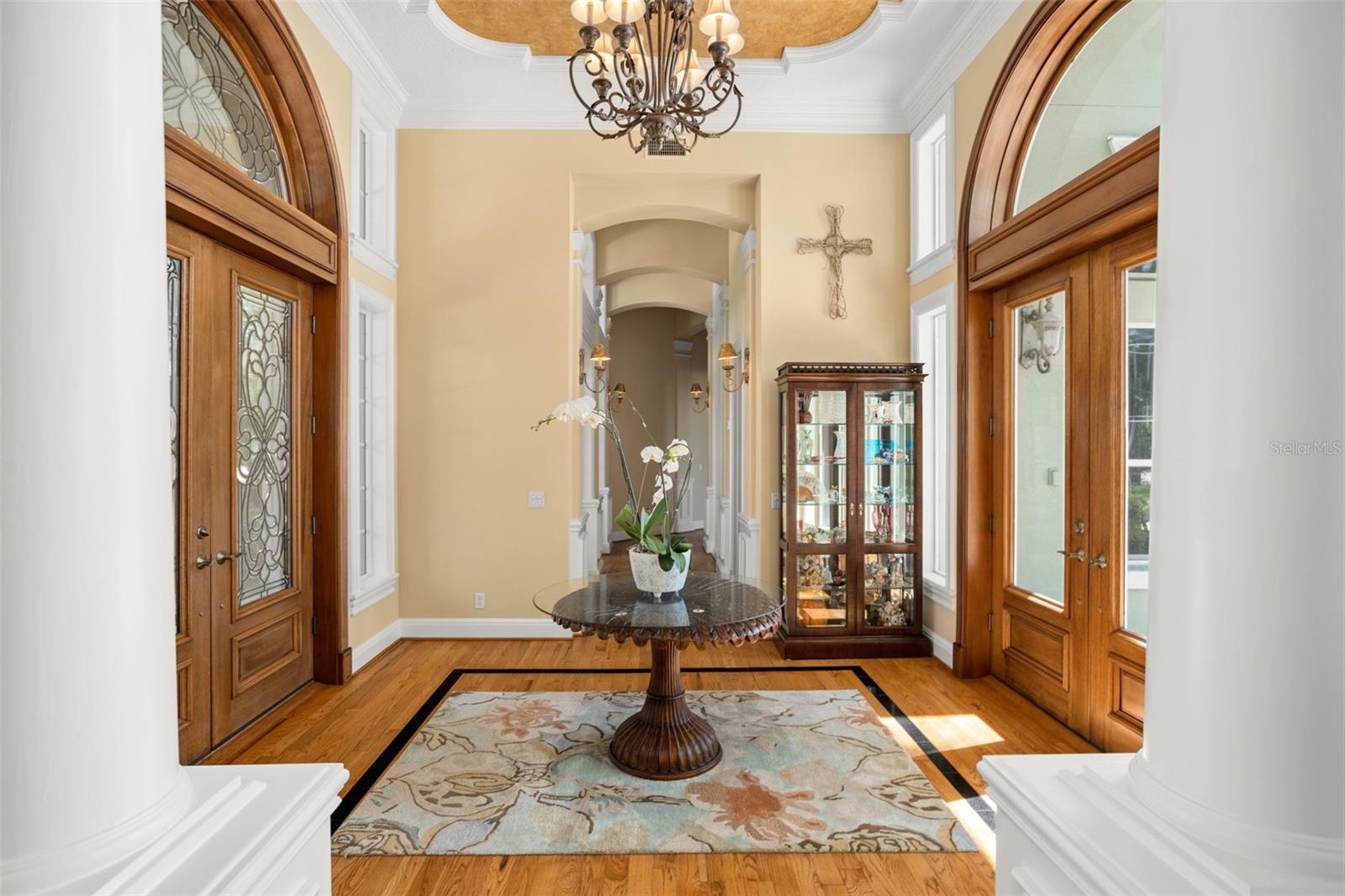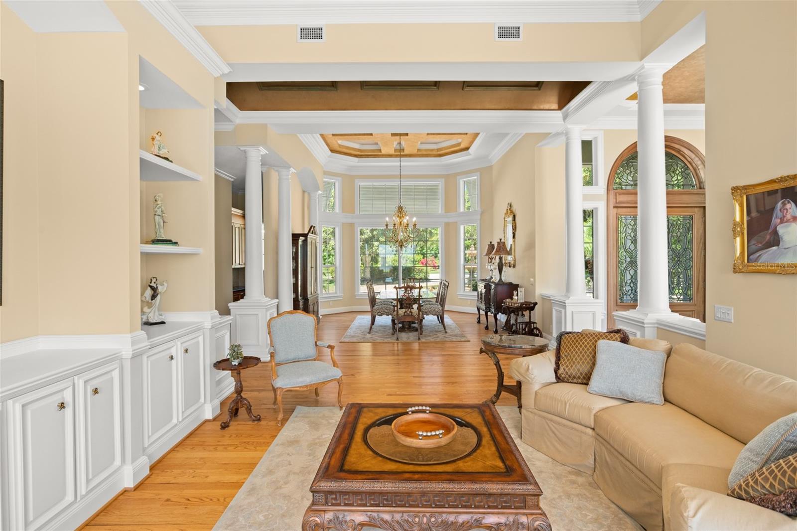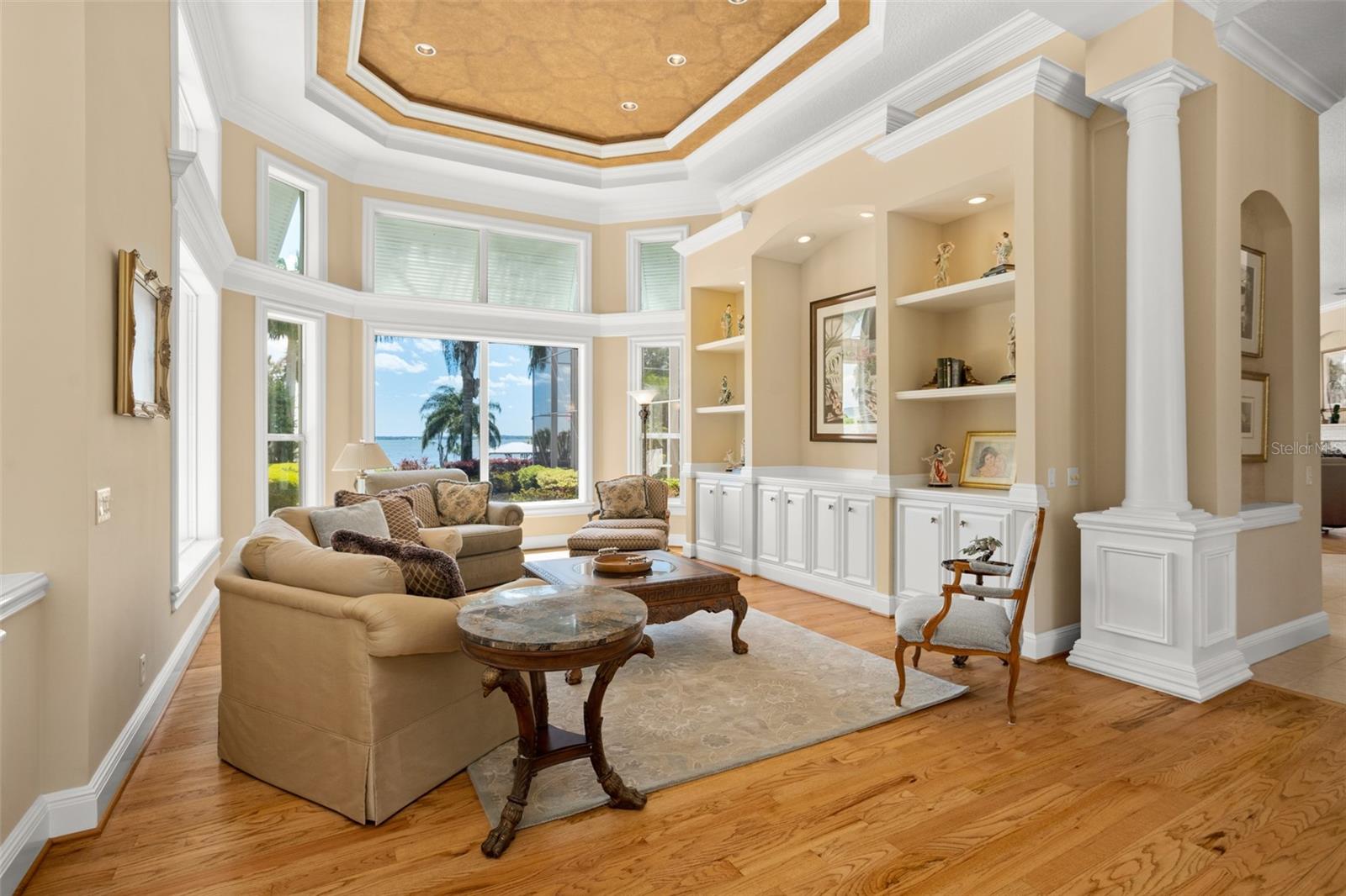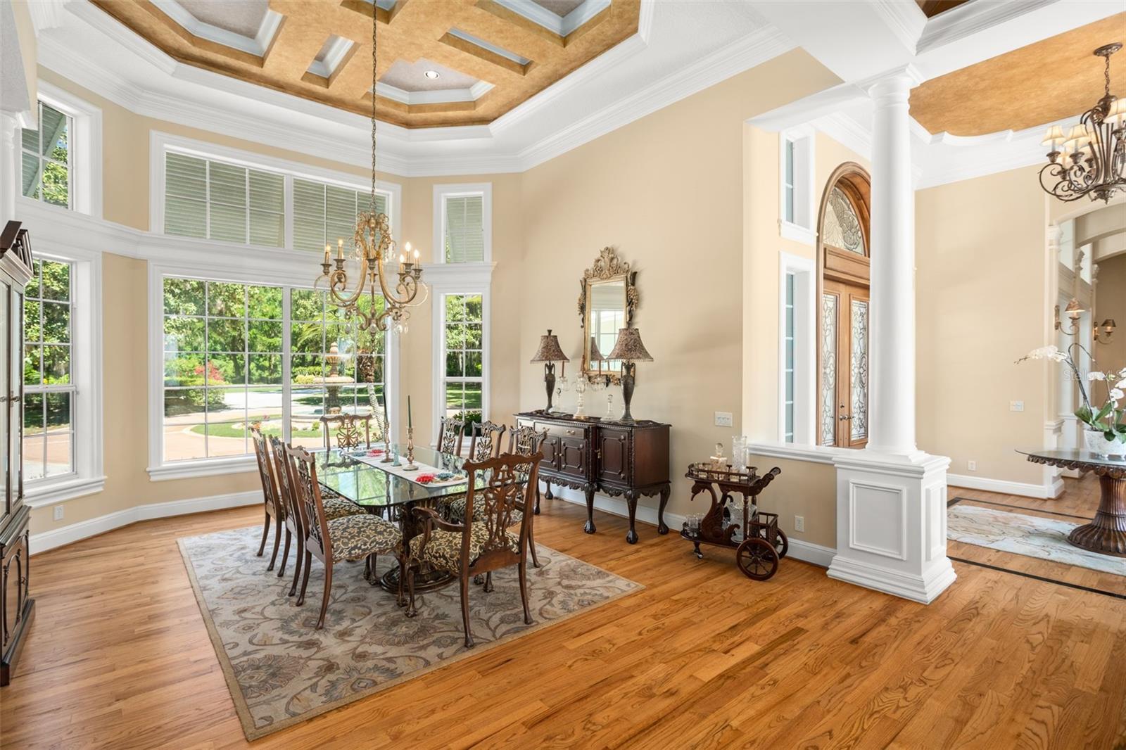 Discover an unrivaled waterfront paradise nestled directly on the shores of Lake Harris, part of the esteemed Harris Chain of Lakes. This expansive estate, accessible through a private gated driveway, offers a unique fusion of privacy, luxury, and leisure. The immediate homesite consists of 3.06 acres, while enjoying private ownership of an adjacent 46+/- conservation acres for additional privacy. Step into the custom-built 8,542 square foot sanctuary, masterfully designed to showcase breathtaking lake views from virtually every room. Marvel at the exquisite craftsmanship and attention to detail, from the elegantly laid diagonal hardwood floors and porcelain tiles to the intricate ceilings showcasing tongue & groove, barrel, coffered, and tray designs. Delight in the custom millwork, leaded glass entry door, granite countertops, multiple fireplaces, and designer finishes that grace every corner. Oversized windows throughout invite an abundance of natural light, framing the tranquil water vistas. Embrace the epitome of outdoor living that caters to both relaxation as well as formal entertaining. Your private backyard oasis awaits, complete with a serene walking path leading down to your personal firepit area and composite dock and boathouse, equipped with two lifts. Indoors, the thoughtfully designed floorplan offers a myriad of living spaces for everyone to enjoy. The open chef’s kitchen and dining areas provide the perfect setting for hosting unforgettable gatherings, seamlessly flowing into the massive pool area. Discover additional living spaces, including a dedicated homework station, a first-floor game room, and an office boasting custom wood details. Each bedroom hosts its own luxurious ensuite, while the versatile room above the garage can be transformed from a movie theater to guest quarters, home gym, or any flex space desired. Nestled within the renowned Harris Chain of Lakes in Central Florida, this exclusive retreat offers an unparalleled sense of seclusion while remaining mere minutes from a wealth of amenities including access to a public dock and boat ramp for additional ease. Explore the charming downtowns of Leesburg and nearby Mount Dora. Immerse yourself in the vibrant atmosphere of The Villages, and enjoy convenient access to UF Health & Advent Health, golf courses, and sports complexes. A myriad of shopping and dining options along US Hwy 441 await, and Leesburg International Airport is just a short drive away. Disney and Orlando International Airport are both within an hour's reach, making this estate the epitome of tranquility and convenience.