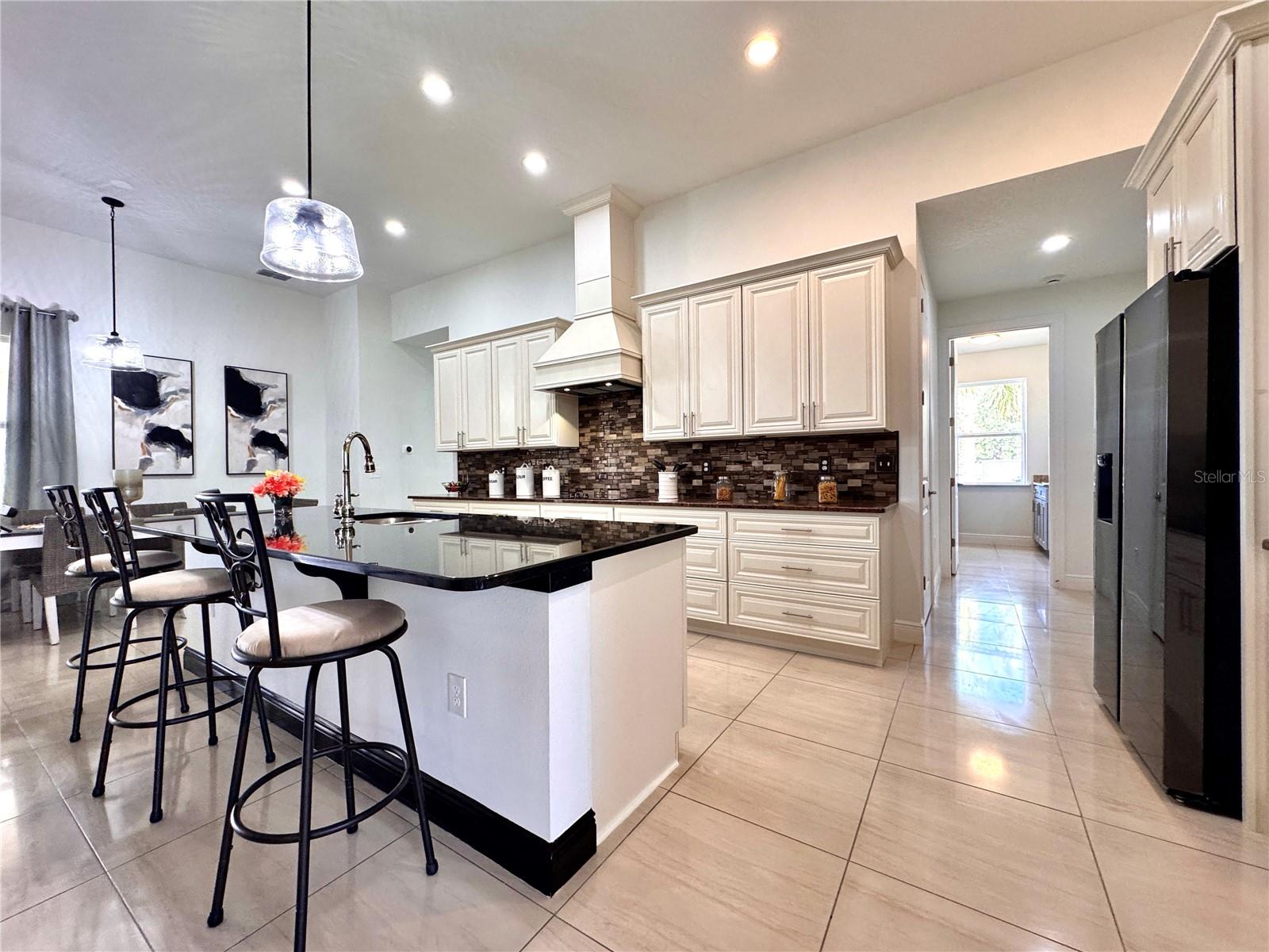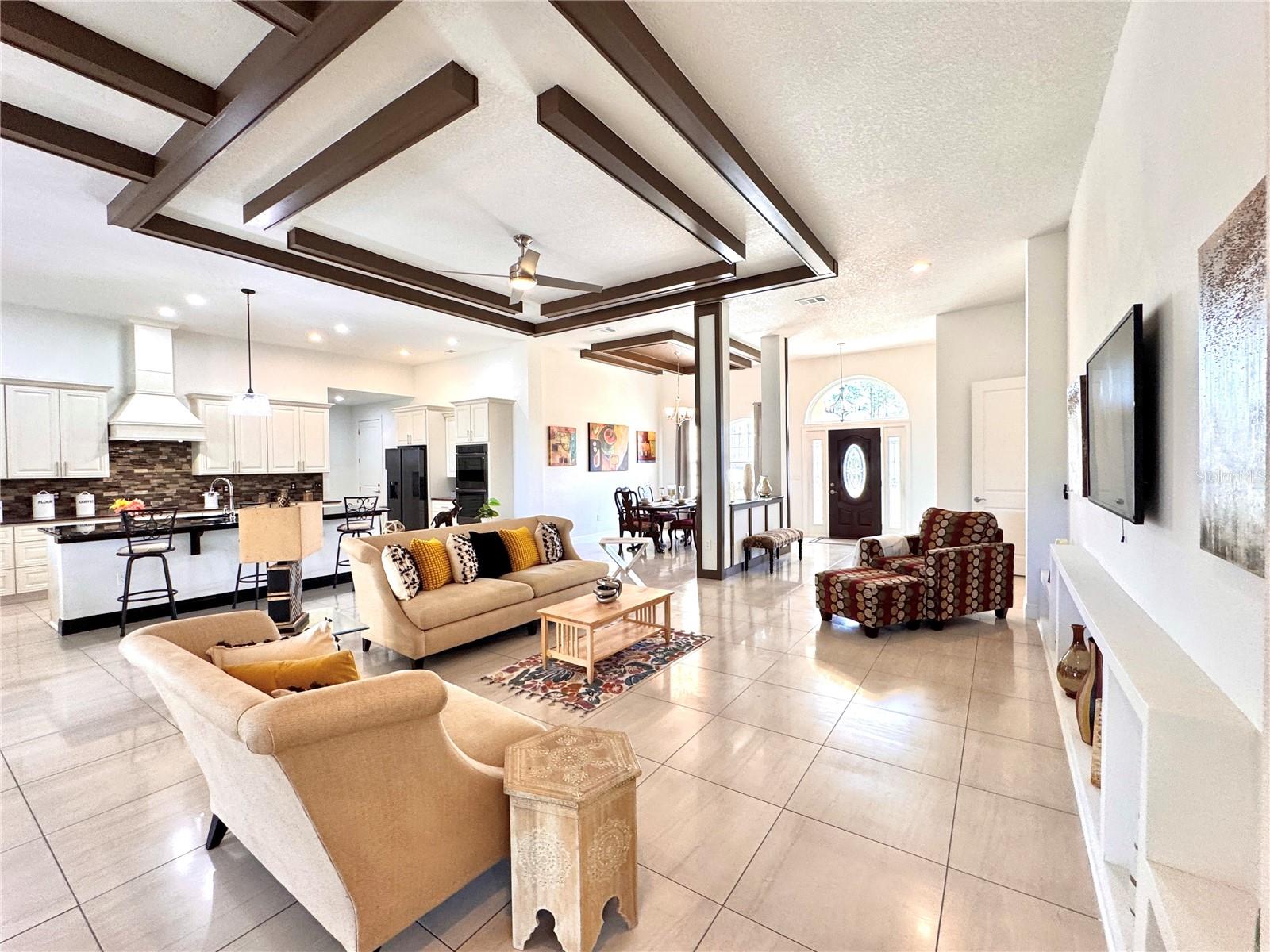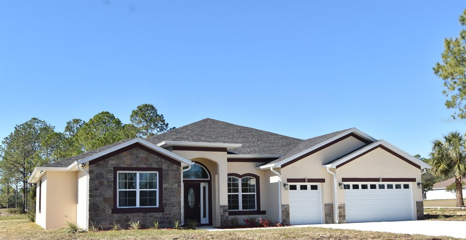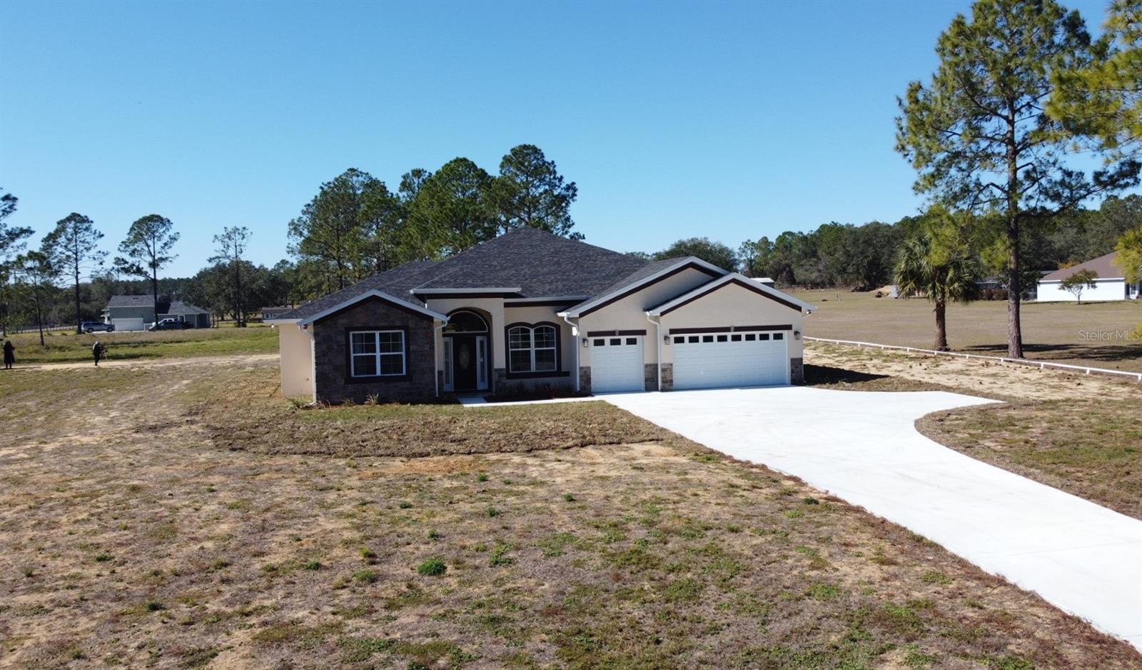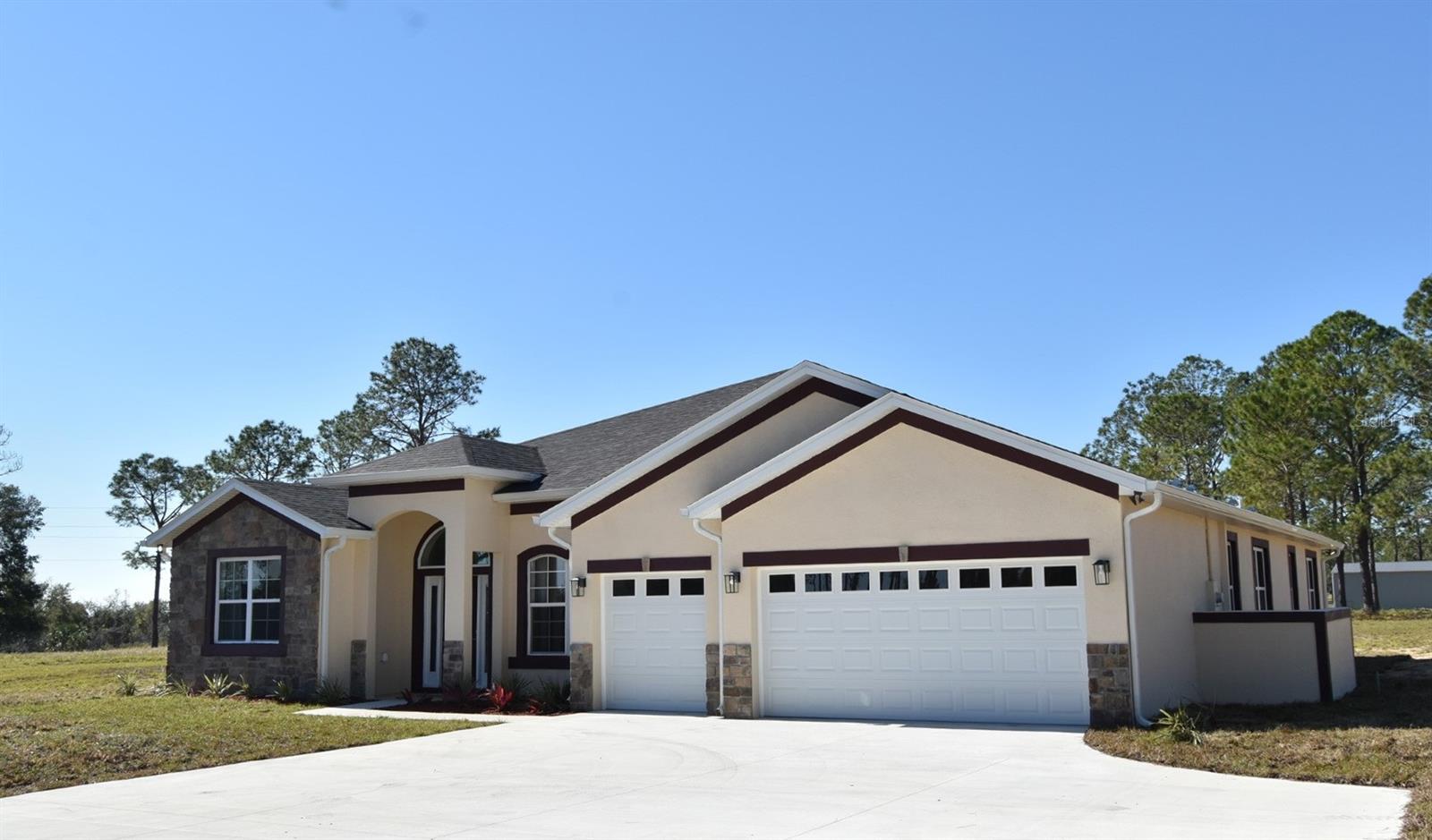 Welcome to Florida living! This brand-new, custom-built single-story home is designed to make the most of its expansive lot, featuring a long-paved driveway and backyard entertainment area. With elegant finishes and modern touches, the home greets you with a front entry and double doors leading to a versatile bonus room or office. The open concept living area showcases designer flooring and hardware, creating a warm and stylish atmosphere. The gourmet kitchen offers granite countertops, double ovens, a cooktop with custom hood, and ample bar seating, perfect for hosting and everyday meals. Step outside to enjoy Florida’s outdoor lifestyle with both covered and open-air spaces. The primary suite features a luxurious bath with a garden tub, separate shower, private water closet, and dual closets with built-ins. Three additional bedrooms provide flexible living space, including a Jack-and-Jill bathroom. A spacious laundry room with washer, dryer, utility sink, cabinets, and custom shelving offers added convenience. Built with solid block construction, energy-efficient windows and doors, plus a 3-car garage and separate golf cart entry, this home is ready for you to enjoy all the best Florida has to offer.