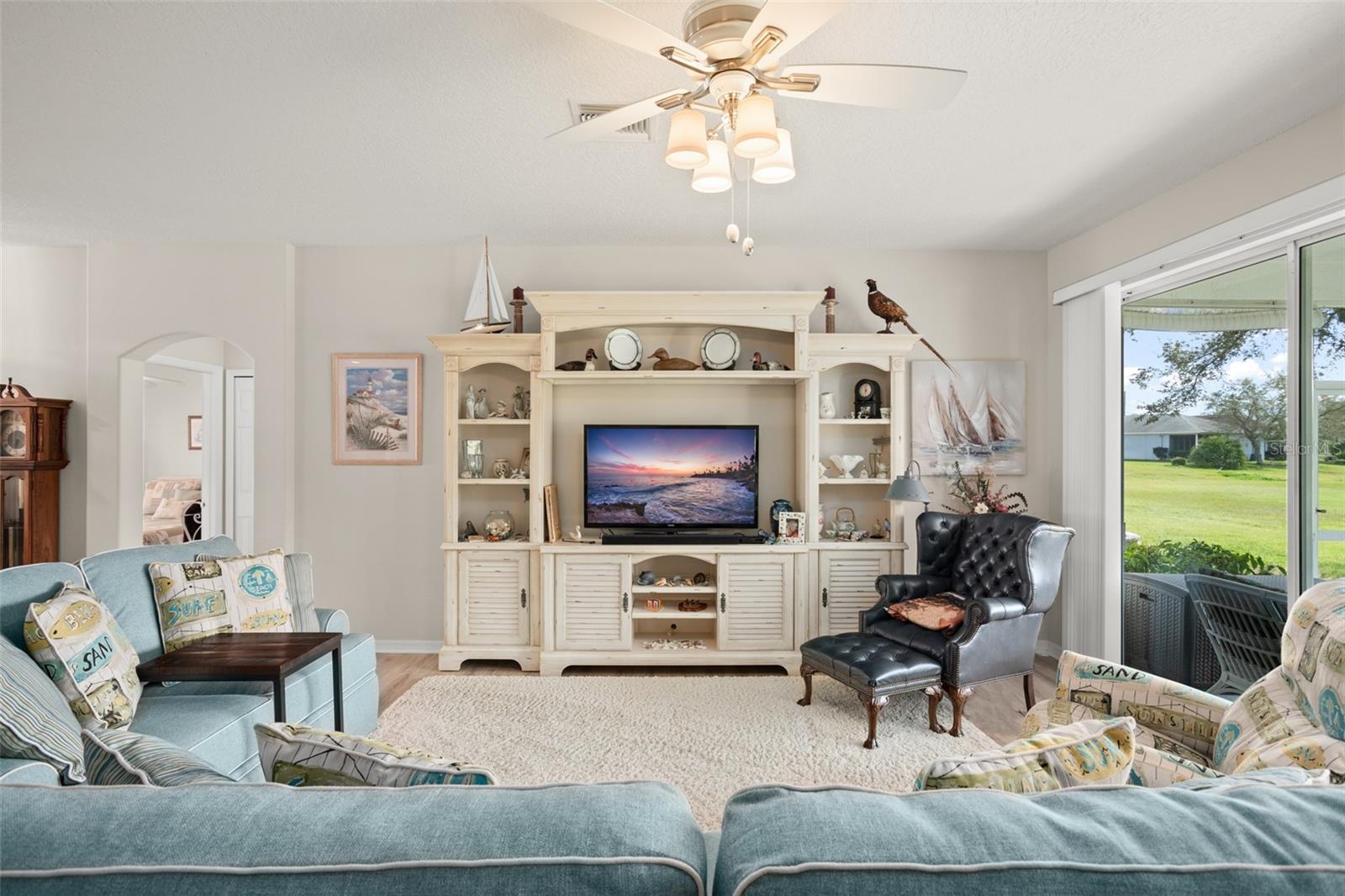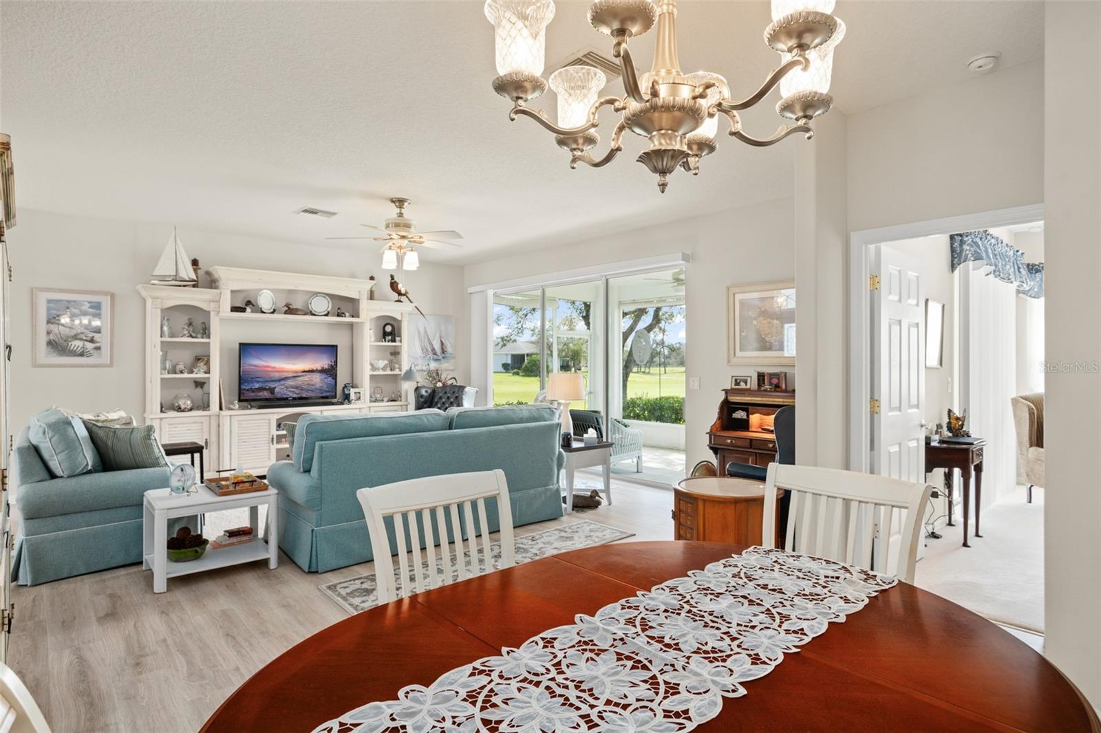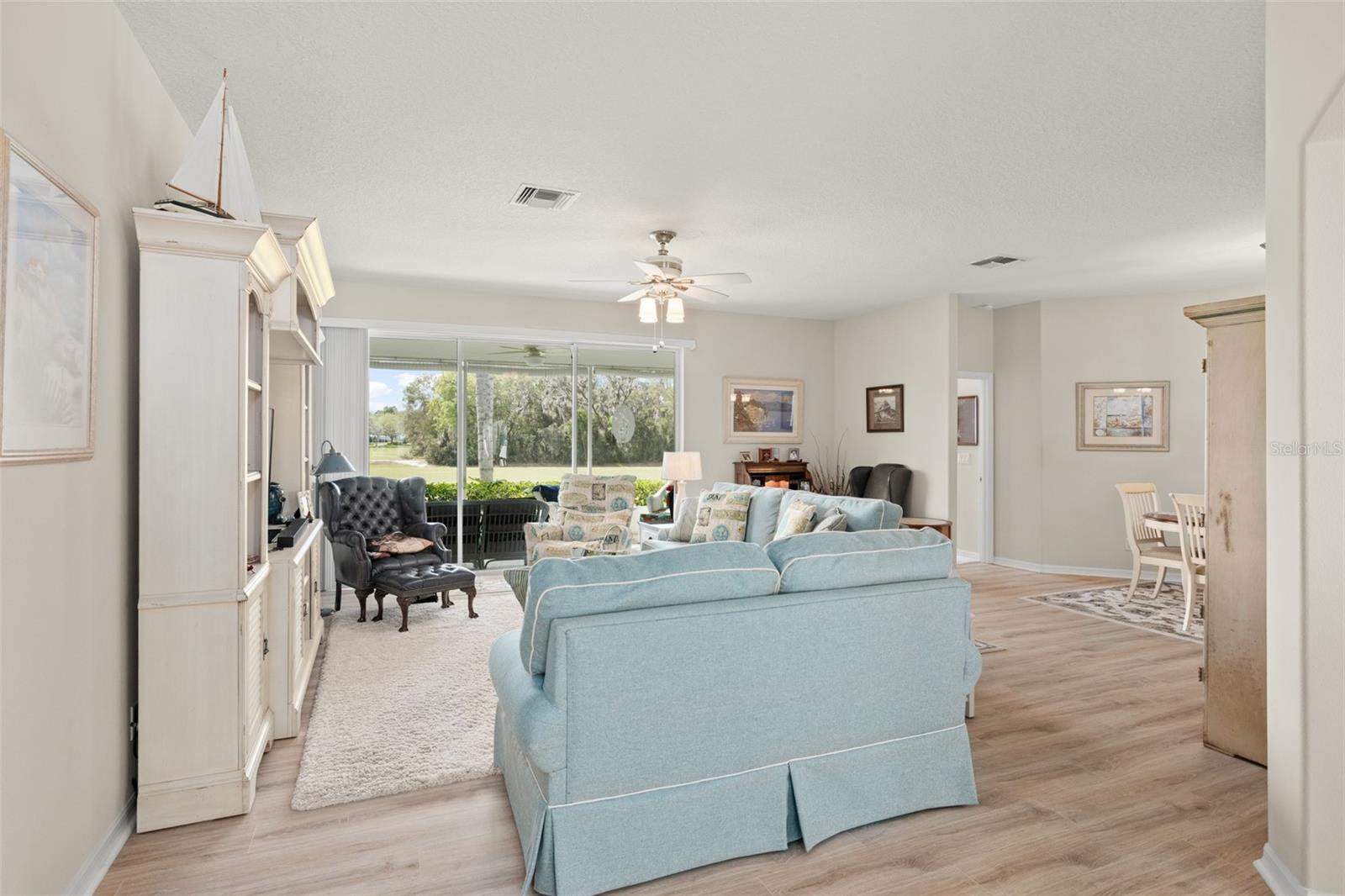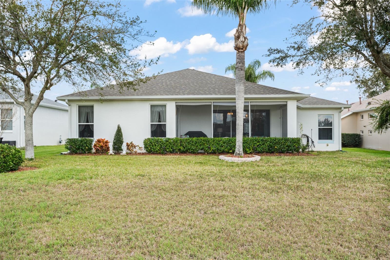 Welcome to this lovely and charming 3 Bed, 2 Bath home in the gated Legacy of Leesburg - a 55+ active adult community! It starts with great curb appeal - nicely landscaped yard, an enclosed screened in private courtyard, and NO REAR NEIGHBORS! You'll have no outside upkeep because the HOA takes care of your lawn. Inside, you will love the open concept common living areas and split bedroom plan - plenty of room and versatile enough to arrange as you see fit. You will enjoy entertaining with plenty of space in your combined living and dining room, which opens to the lanai! Your beautiful contemporary kitchen boasts Corian counters, a pass through window to the dining room, plenty of cabinet storage space, and dinette nook! The primary suite features a sliding door to the lanai, 2 walk-in closets, and en-suite bath including dual sinks, large walk in shower and separate garden bath. The secondary bedrooms are perfect for a guest bedroom, craft room, or an office. This property also features a climate controlled craft room/den/man cave that is conveniently located off of the garage! The spacious laundry room has built-in cabinetry- perfect for storing supplies. An extra reason to love this home is all that you have out back including your screened in lanai overlooking the green space- a peaceful oasis to watch the sunset. The flooring was replaced in 2021 with luxury vinyl plank throughout the living areas and plush carpeting in all bedrooms. This property is being offered FULLY FURNISHED with furniture that has hardly been used. This home has been well maintained and is ready for you to pack your bags and move right in! The Legacy community features many amenities including a clubhouse, fitness center, community pool, tennis courts, pickleball and more! You will love shopping and dining in the neighboring quaint small towns - Mt. Dora, Tavares, and Leesburg! Come see all that this immaculate home has to offer!
