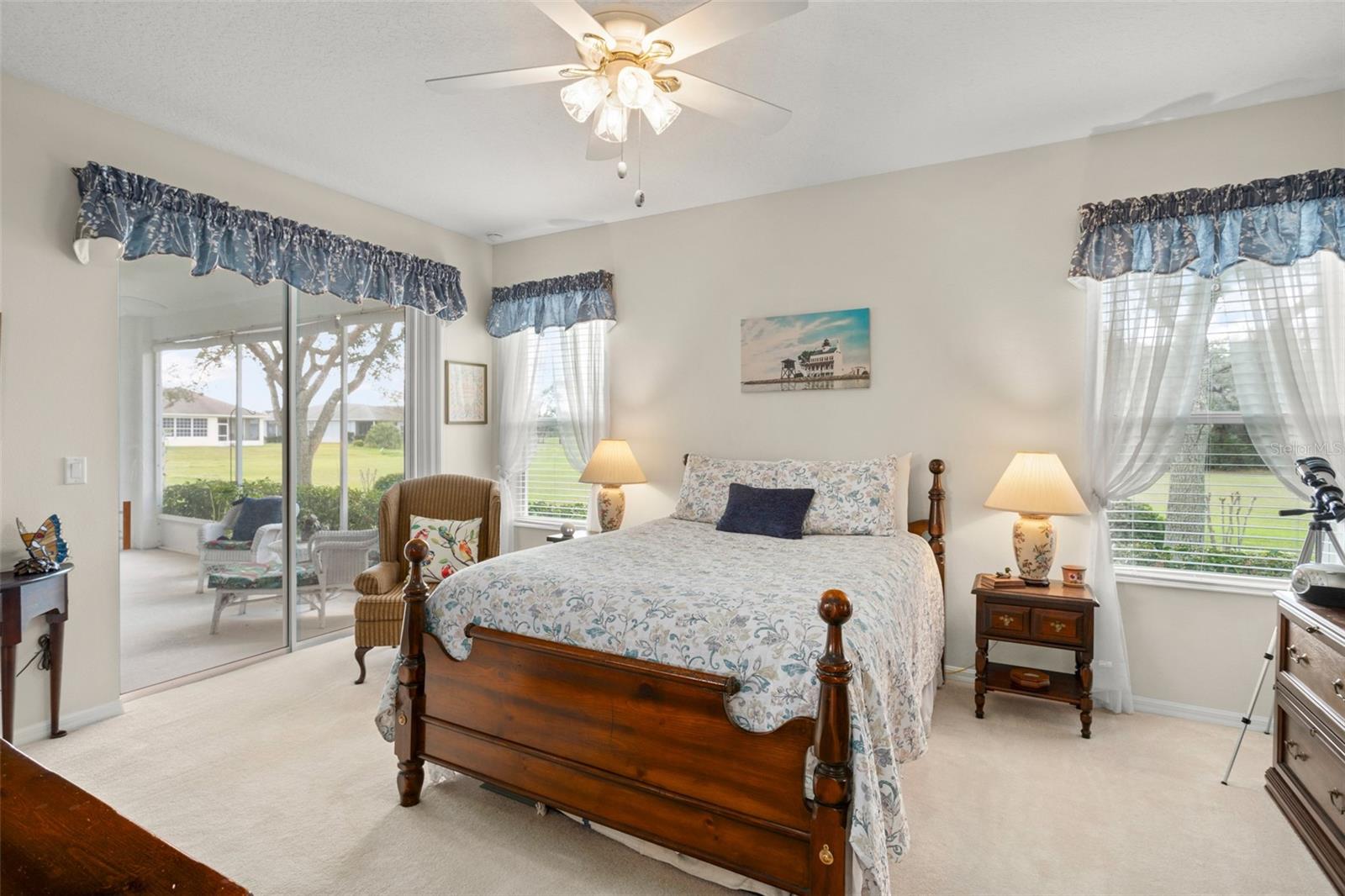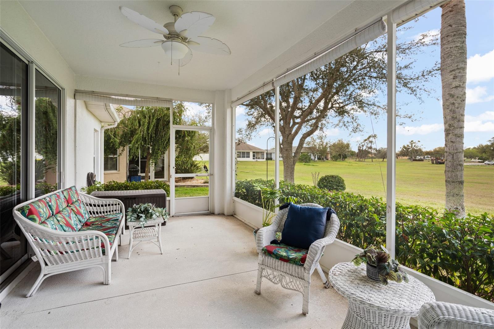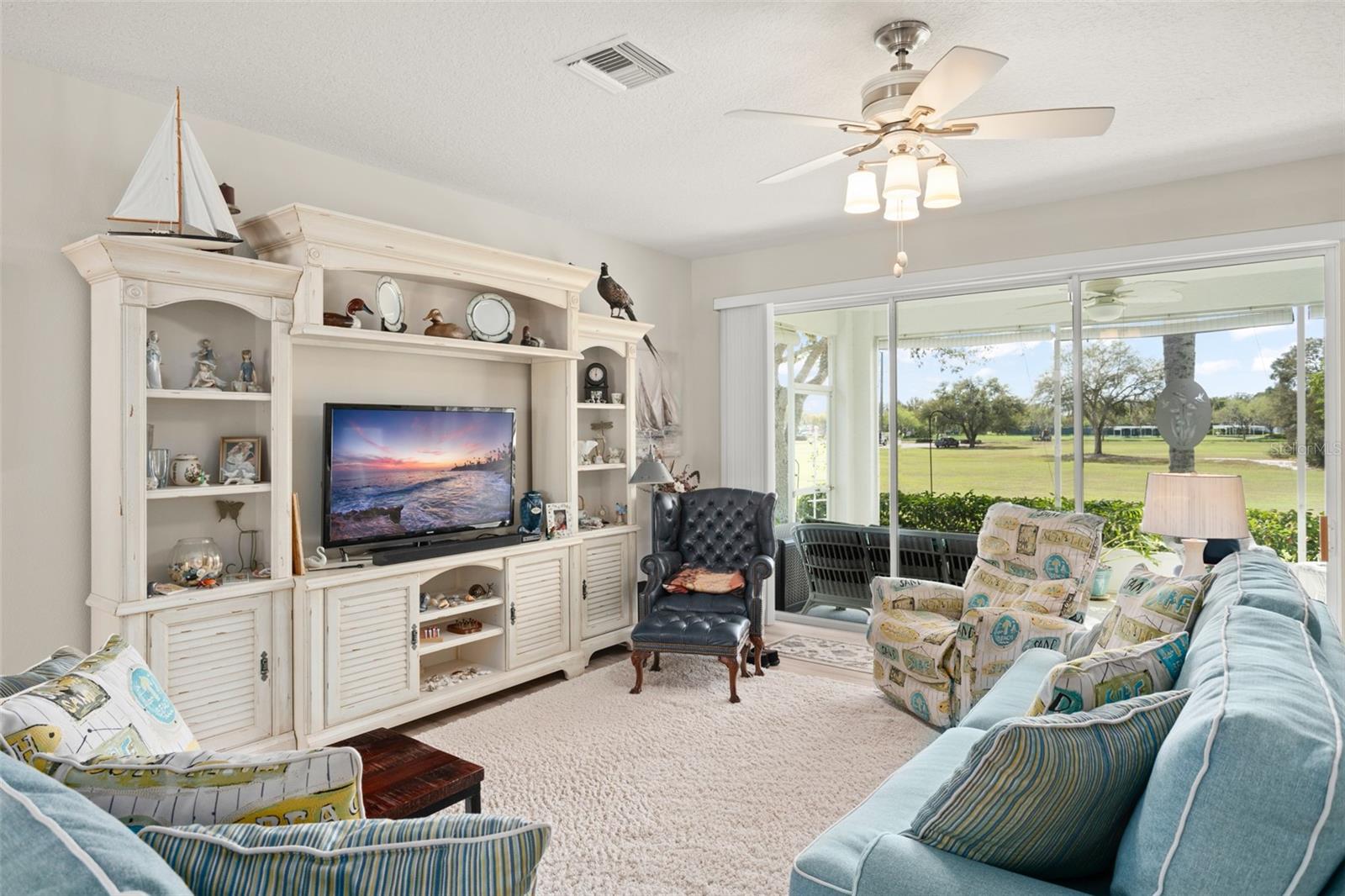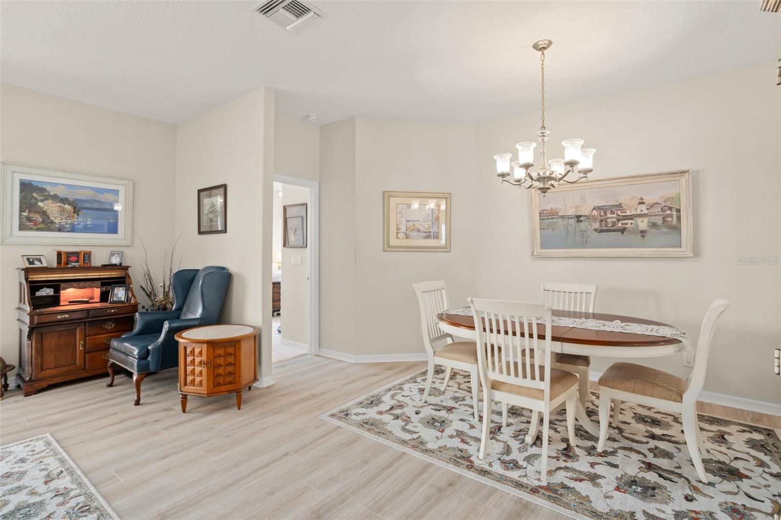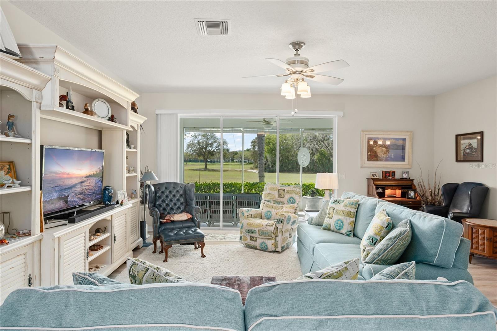 Welcome to this lovely and charming 3 Bed, 2 Bath home in the gated Legacy of Leesburg - a 55+ active adult community! It starts with great curb appeal - nicely landscaped yard, an enclosed screened in private courtyard, and NO REAR NEIGHBORS! You'll have no outside upkeep because the HOA takes care of your lawn. Inside, you will love the open concept common living areas and split bedroom plan - plenty of room and versatile enough to arrange as you see fit. You will enjoy entertaining with plenty of space in your combined living and dining room, which opens to the lanai! Your beautiful contemporary kitchen boasts Corian counters, a pass through window to the dining room, plenty of cabinet storage space, and dinette nook! The primary suite features a sliding door to the lanai, 2 walk-in closets, and en-suite bath including dual sinks, large walk in shower and separate garden bath. The secondary bedrooms are perfect for a guest bedroom, craft room, or an office. This property also features a climate controlled craft room/den/man cave that is conveniently located off of the garage! The spacious laundry room has built-in cabinetry- perfect for storing supplies. An extra reason to love this home is all that you have out back including your screened in lanai overlooking the green space- a peaceful oasis to watch the sunset. The flooring was replaced in 2021 with luxury vinyl plank throughout the living areas and plush carpeting in all bedrooms. This property is being offered FULLY FURNISHED with furniture that has hardly been used. This home has been well maintained and is ready for you to pack your bags and move right in! The Legacy community features many amenities including a clubhouse, fitness center, community pool, tennis courts, pickleball and more! You will love shopping and dining in the neighboring quaint small towns - Mt. Dora, Tavares, and Leesburg! Come see all that this immaculate home has to offer!