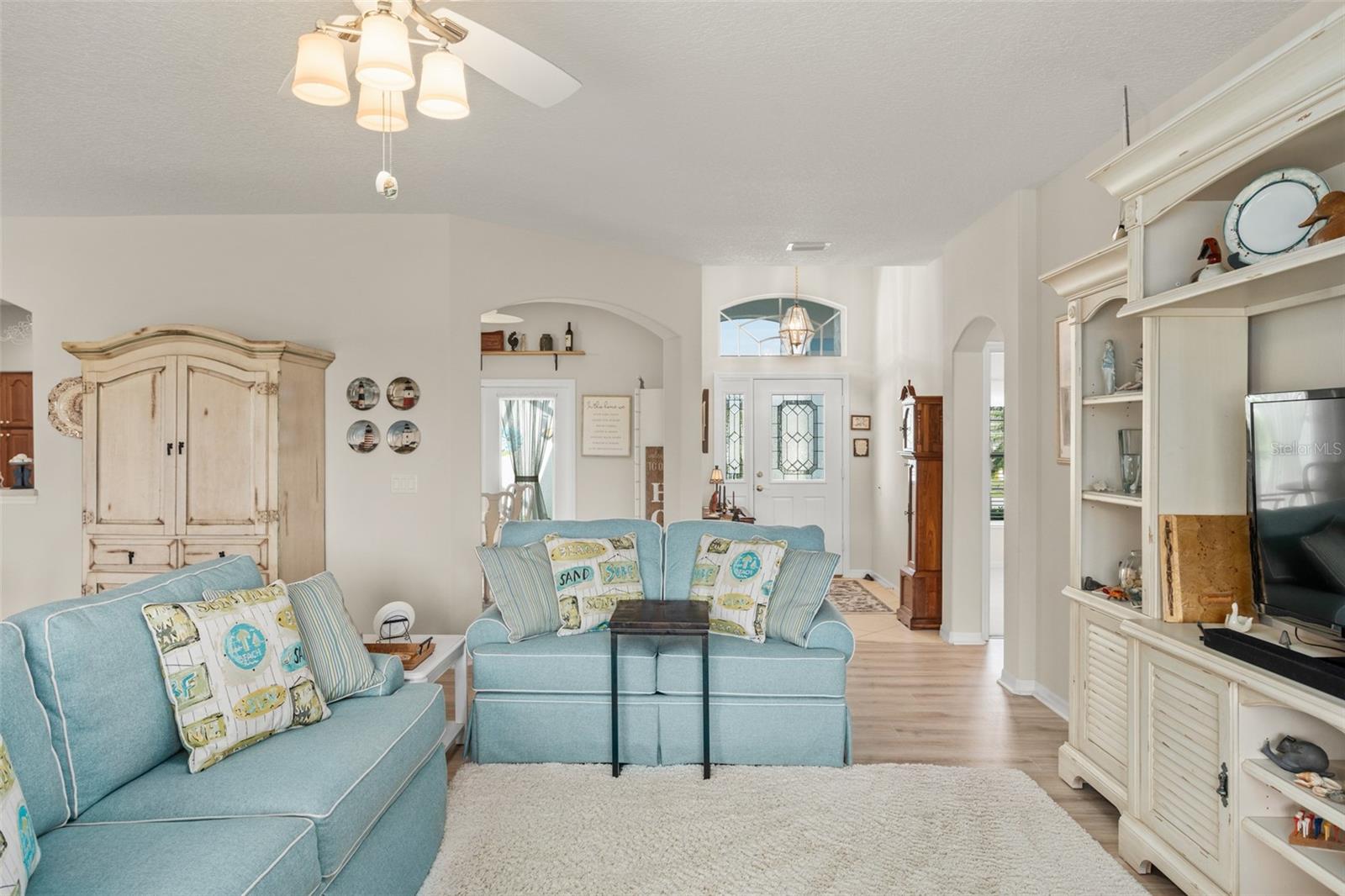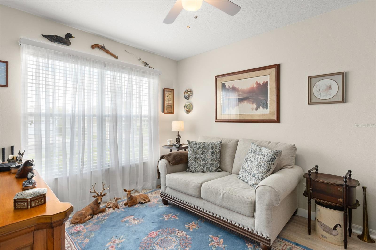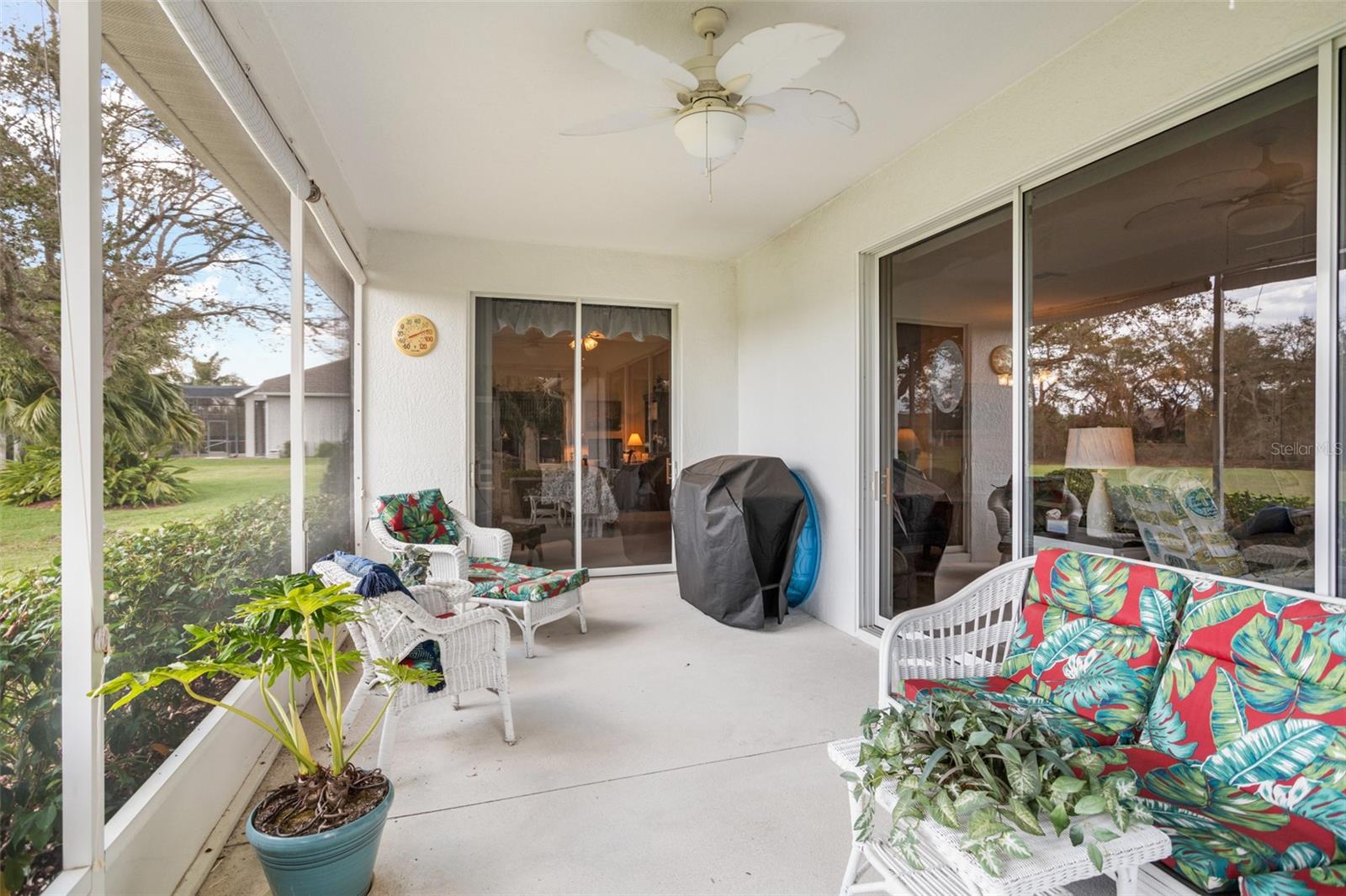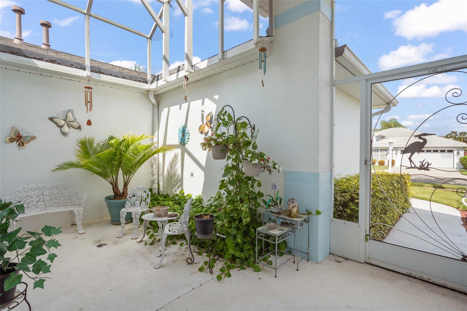 Welcome to this lovely and charming 3 Bed, 2 Bath home in the gated Legacy of Leesburg - a 55+ active adult community! It starts with great curb appeal - nicely landscaped yard, an enclosed screened in private courtyard, and NO REAR NEIGHBORS! You'll have no outside upkeep because the HOA takes care of your lawn. Inside, you will love the open concept common living areas and split bedroom plan - plenty of room and versatile enough to arrange as you see fit. You will enjoy entertaining with plenty of space in your combined living and dining room, which opens to the lanai! Your beautiful contemporary kitchen boasts Corian counters, a pass through window to the dining room, plenty of cabinet storage space, and dinette nook! The primary suite features a sliding door to the lanai, 2 walk-in closets, and en-suite bath including dual sinks, large walk in shower and separate garden bath. The secondary bedrooms are perfect for a guest bedroom, craft room, or an office. This property also features a climate controlled craft room/den/man cave that is conveniently located off of the garage! The spacious laundry room has built-in cabinetry- perfect for storing supplies. An extra reason to love this home is all that you have out back including your screened in lanai overlooking the green space- a peaceful oasis to watch the sunset. The flooring was replaced in 2021 with luxury vinyl plank throughout the living areas and plush carpeting in all bedrooms. This property is being offered FULLY FURNISHED with furniture that has hardly been used. This home has been well maintained and is ready for you to pack your bags and move right in! The Legacy community features many amenities including a clubhouse, fitness center, community pool, tennis courts, pickleball and more! You will love shopping and dining in the neighboring quaint small towns - Mt. Dora, Tavares, and Leesburg! Come see all that this immaculate home has to offer!
