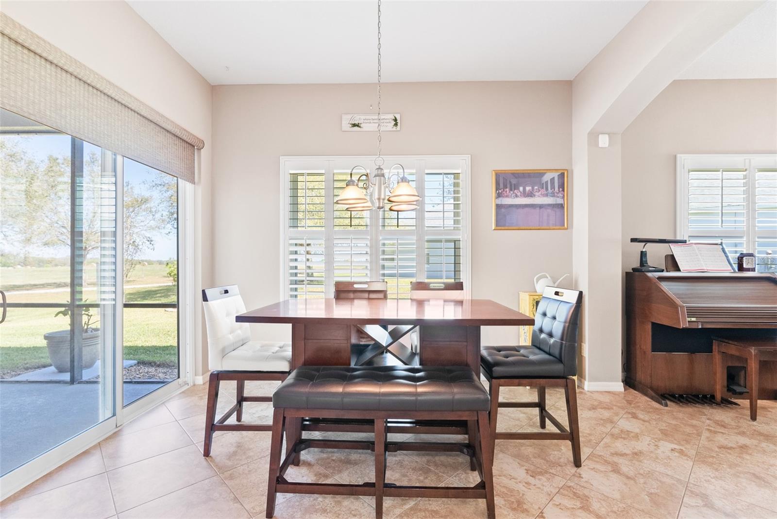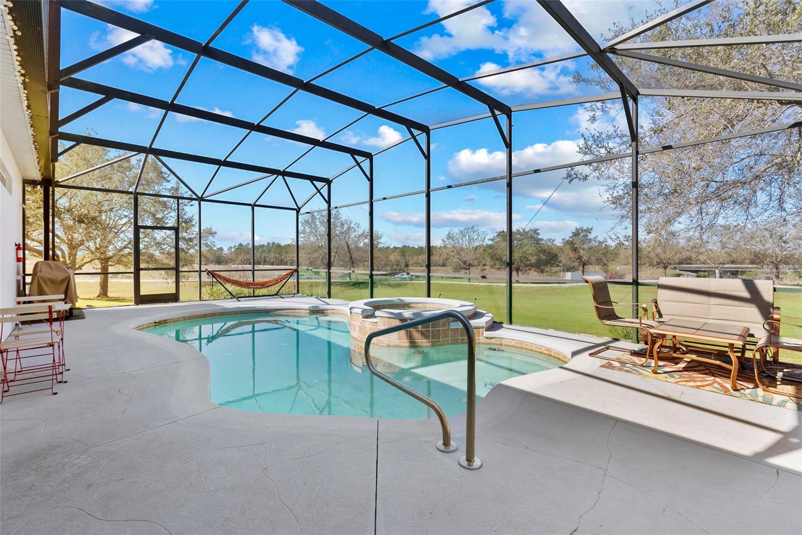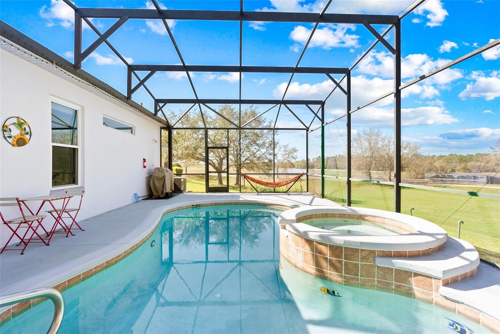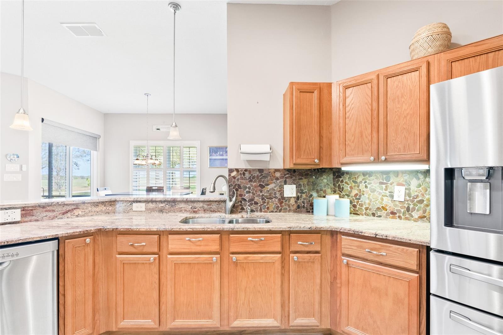3 bedroom 2 bath SOLAR HEATED POOL AND SPA with no rear neighbors! Welcome to this charming home situated on a peaceful cul-de-sac lot in Leesburg. The interior showcases modern finishes with tile flooring throughout the main areas and vinyl in the bedrooms. The kitchen has been thoughtfully updated with wood cabinets, elegant granite countertops, and brand-new stainless steel appliances. A newly installed AC system (2024) ensures comfort year-round. The guest bathroom is equipped with a luxurious walk-in jetted tub for ultimate relaxation. One of the property's standout features is its private backyard with no rear neighbors, complemented by a refreshing pool and spa. The windows are fitted with upgraded shutters for enhanced security and privacy. Located in an amenity-rich community, residents enjoy access to numerous recreational facilities including softball fields, shuffleboard courts, golf, horseshoe pits, tennis courts, pickleball courts, and ping pong tables. The convenient location puts you close to local restaurants and shopping destinations. This move-in ready home combines comfortable living spaces with resort-style community amenities, making it an ideal choice for those seeking an active lifestyle in a peaceful setting. The generous cul-de-sac lot provides extra space and privacy, while the well-maintained interior offers modern conveniences and updates throughout.