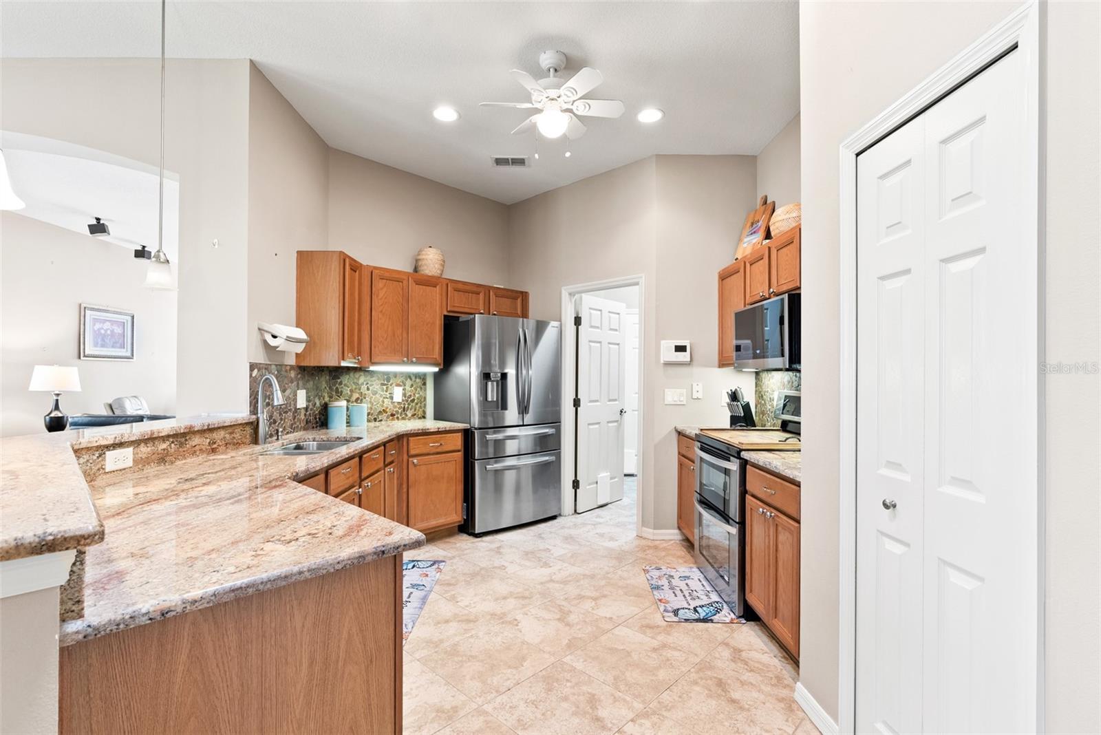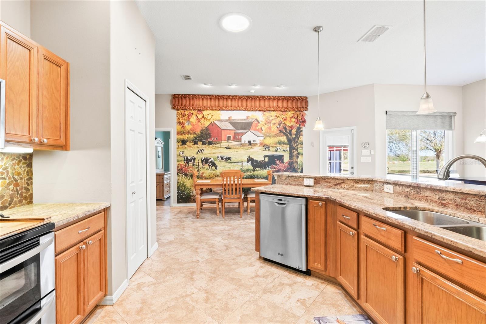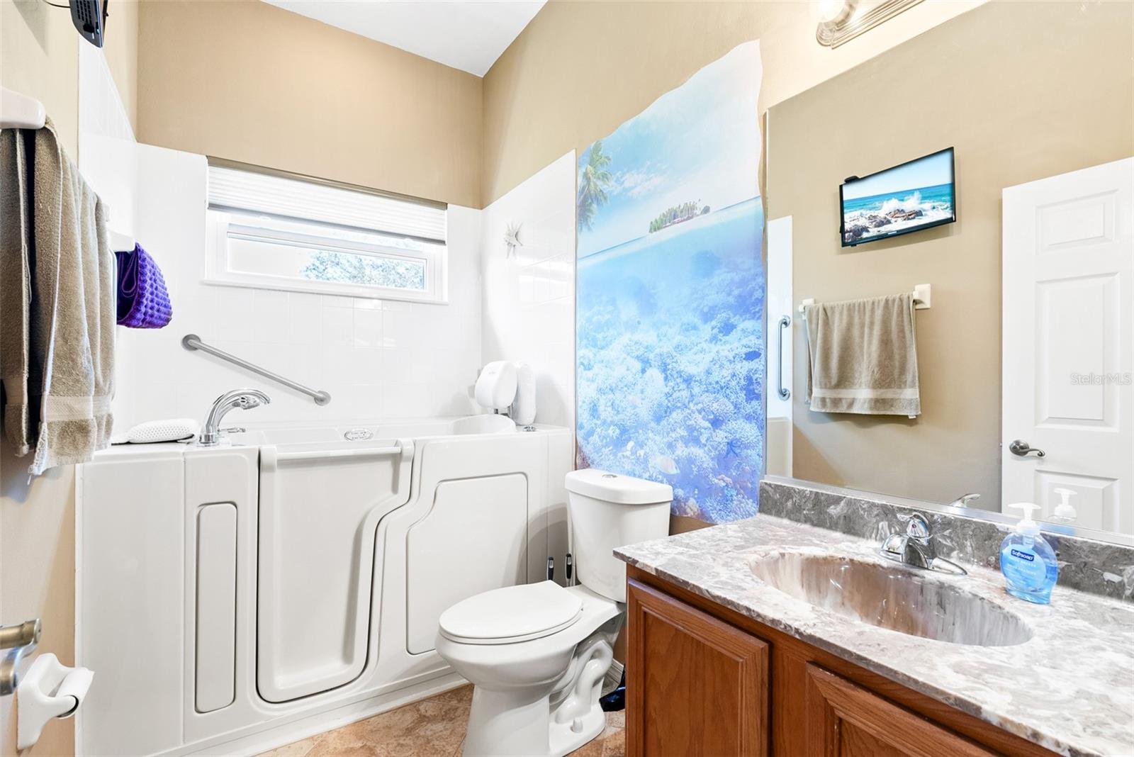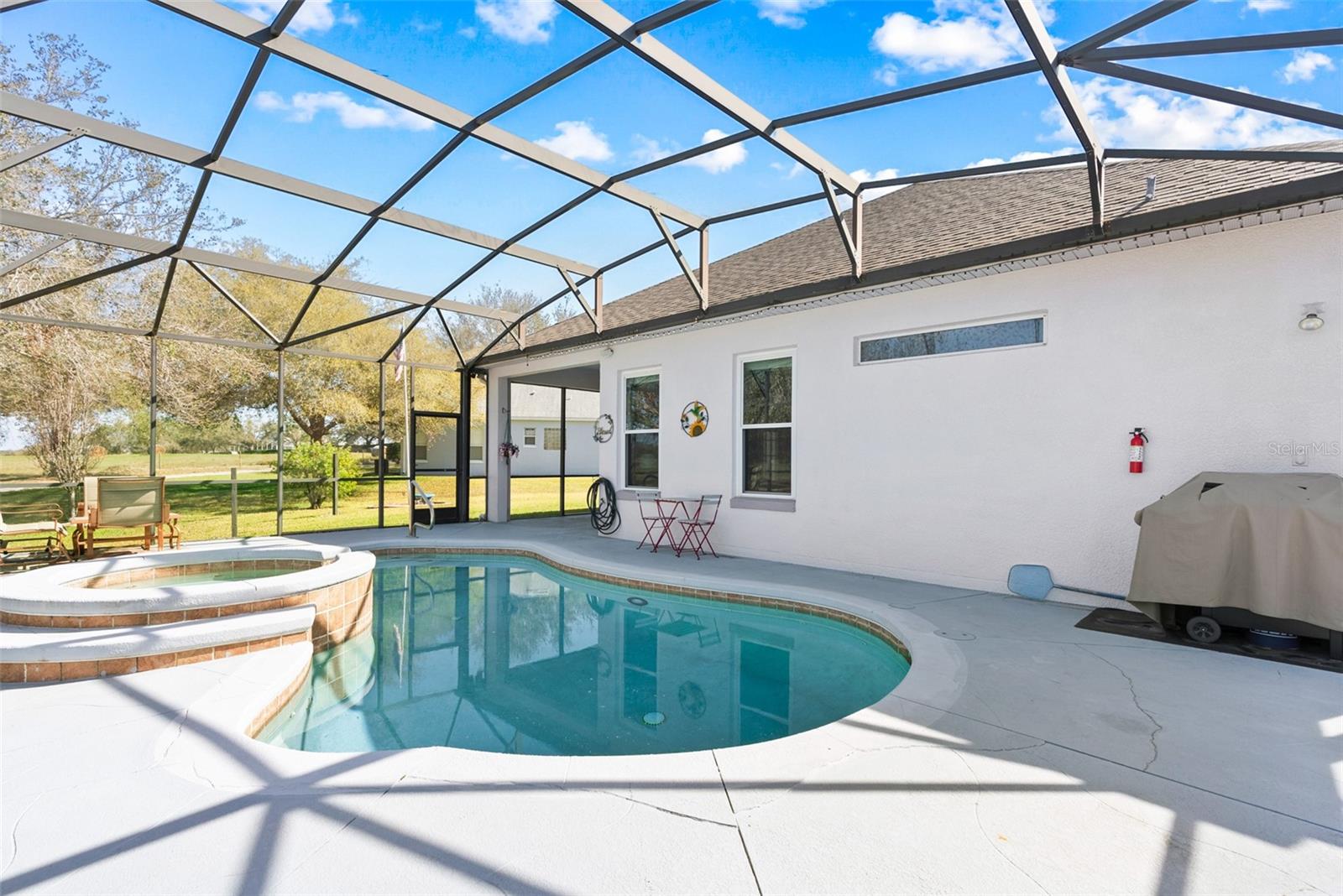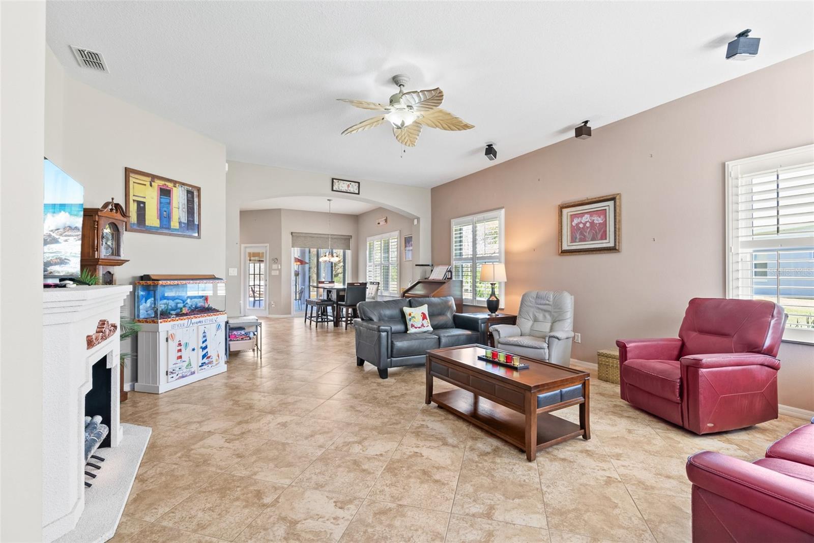 3 bedroom 2 bath SOLAR HEATED POOL AND SPA with no rear neighbors! Welcome to this charming home situated on a peaceful cul-de-sac lot in Leesburg. The interior showcases modern finishes with tile flooring throughout the main areas and vinyl in the bedrooms. The kitchen has been thoughtfully updated with wood cabinets, elegant granite countertops, and brand-new stainless steel appliances. A newly installed AC system (2024) ensures comfort year-round. The guest bathroom is equipped with a luxurious walk-in jetted tub for ultimate relaxation. One of the property's standout features is its private backyard with no rear neighbors, complemented by a refreshing pool and spa. The windows are fitted with upgraded shutters for enhanced security and privacy. Located in an amenity-rich community, residents enjoy access to numerous recreational facilities including softball fields, shuffleboard courts, golf, horseshoe pits, tennis courts, pickleball courts, and ping pong tables. The convenient location puts you close to local restaurants and shopping destinations. This move-in ready home combines comfortable living spaces with resort-style community amenities, making it an ideal choice for those seeking an active lifestyle in a peaceful setting. The generous cul-de-sac lot provides extra space and privacy, while the well-maintained interior offers modern conveniences and updates throughout.