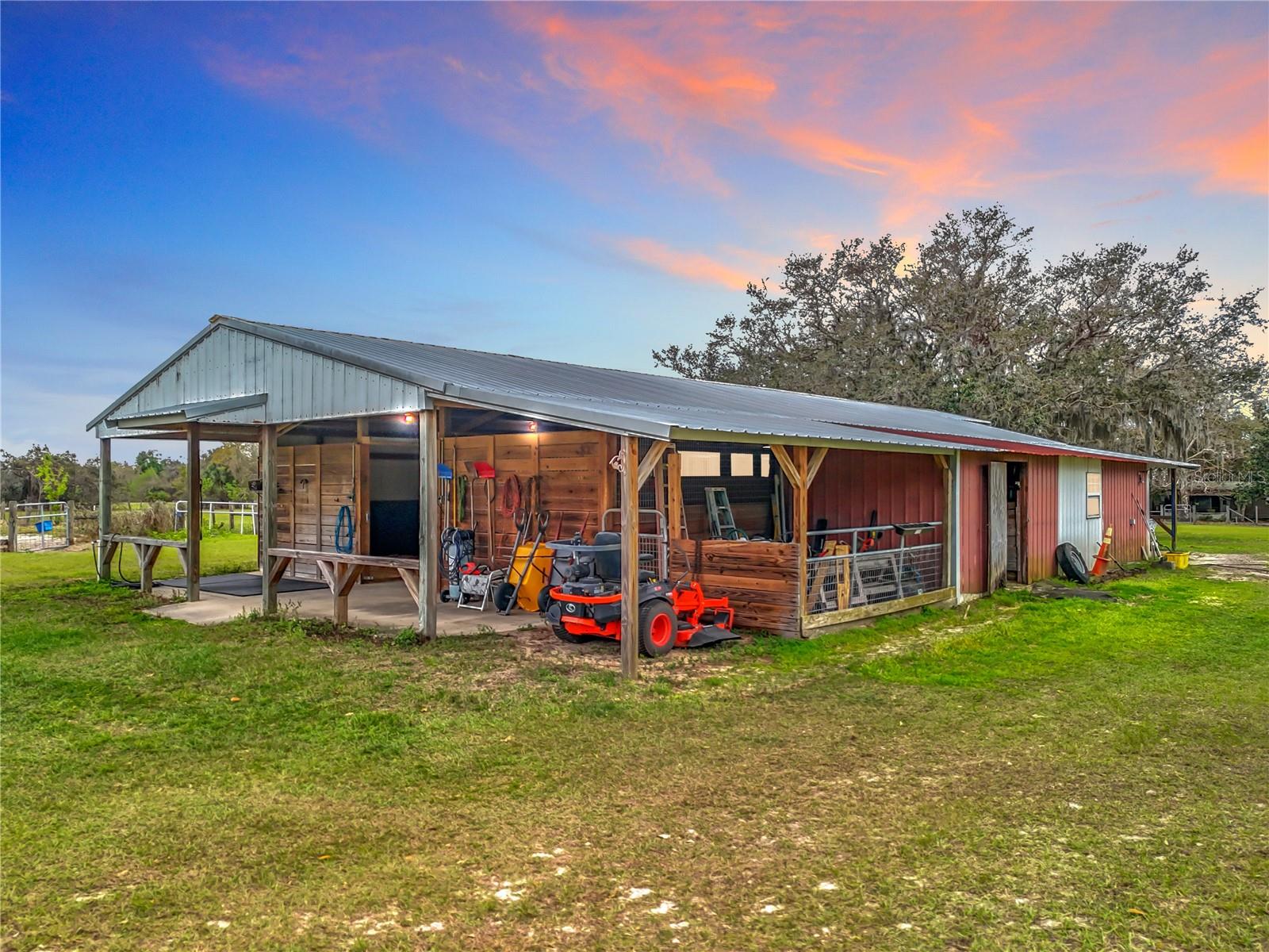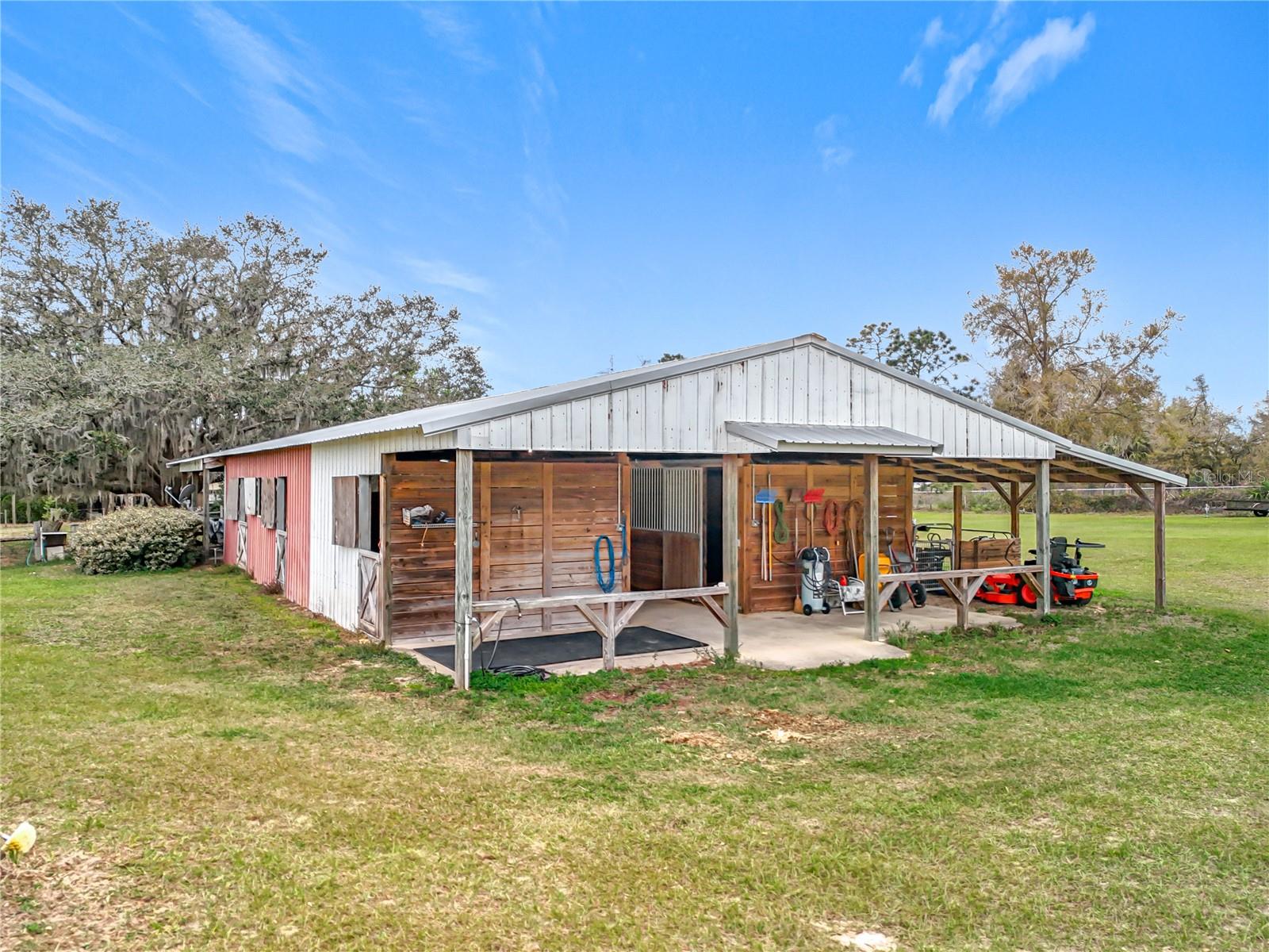PRICED TO SELL! This estate can be divided into four 5 ACRE LOTS for a family compound if needed. Nestled on 22.5 picturesque acres, 41204 Emeralda Island Rd is a dream property for horse enthusiasts, trainers, or investors. The property boasts lush pastures and two separate entrances, offering endless possibilities for private use, an equine business, or sub-leasing. At the heart of the facility is a thoughtfully designed center-aisle barn featuring 8 spacious matted stalls, each with its own electrical outlet for fans or lights and a 40 Amp RV electrical connection. Flexible removable dividers allow for larger stalls or foaling stalls as needed. The barn also includes two wash racks/tack-up centers, cross ties, an oversized tack room/feed room, and a welcoming sitting area — perfect for relaxing after a day with the horses. A separate, oversized, cleared and fenced pasture is located off of of the secondary entrance already equipped with a lean-to, run-in stall, perfect for easy sub-lease conversion OR quarantine stalling for new equine additions. While value is in the land, the manufactured home (30 year metal roof) on site provides established well, septic, electric, and associated impact fees paid. Located just one hour from the World Equestrian Center (WEC), this versatile property combines functionality, comfort, and prime location — ready to bring your equestrian vision to life.