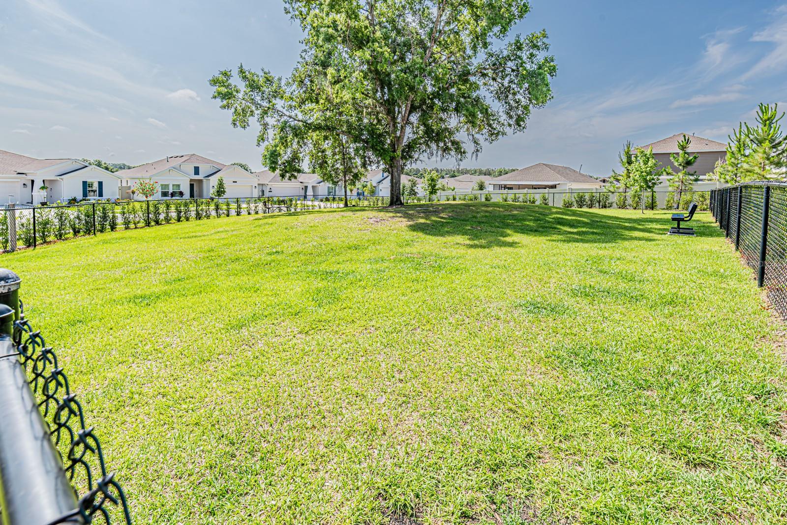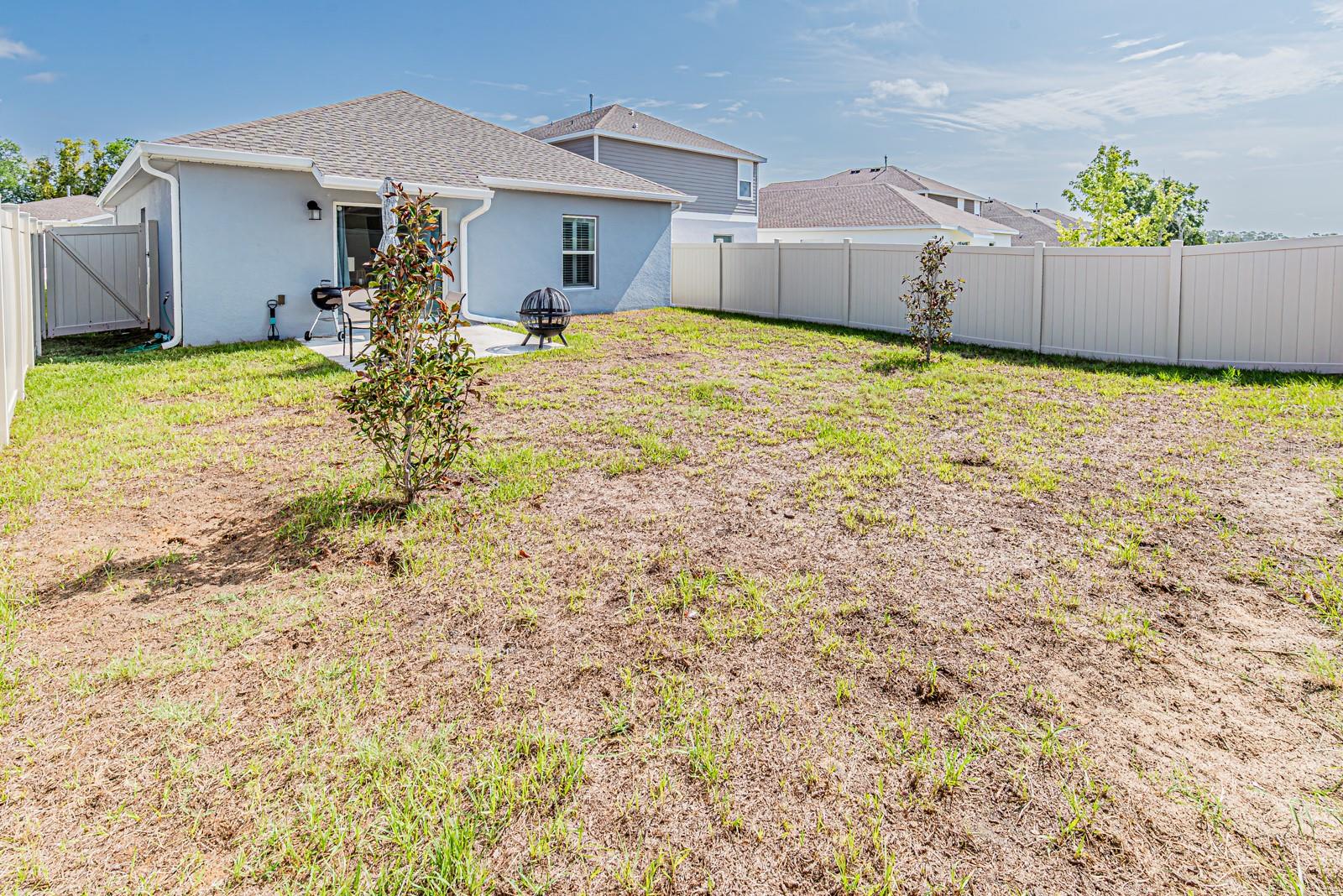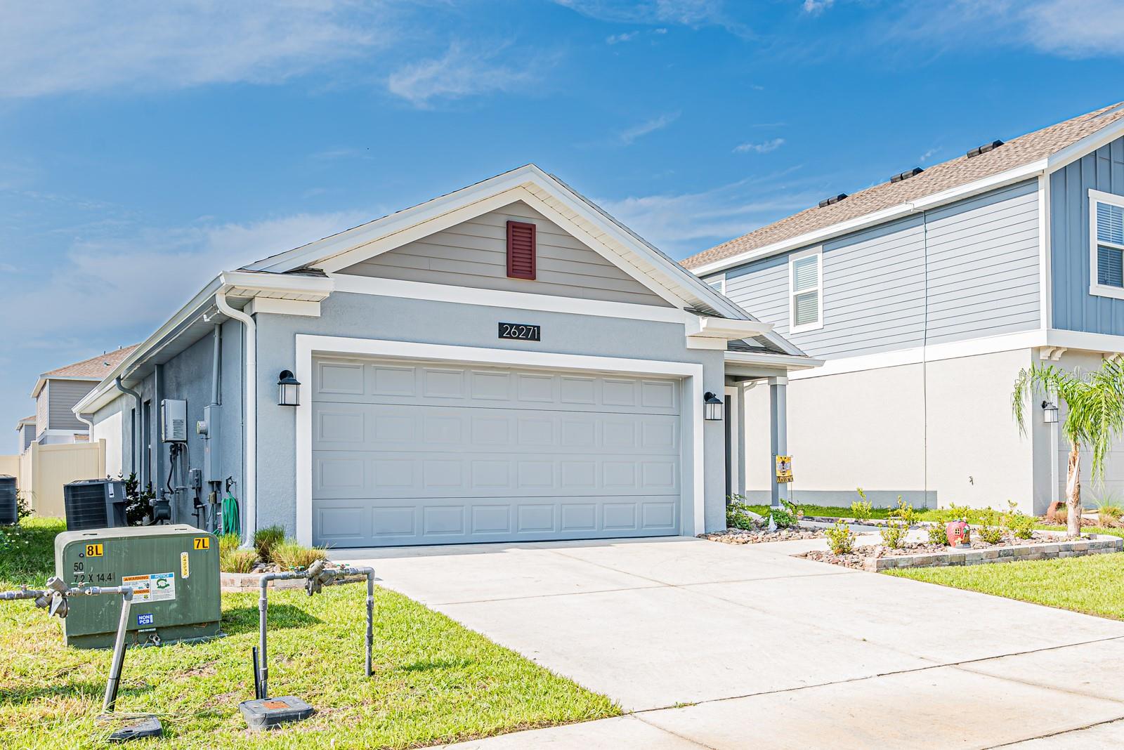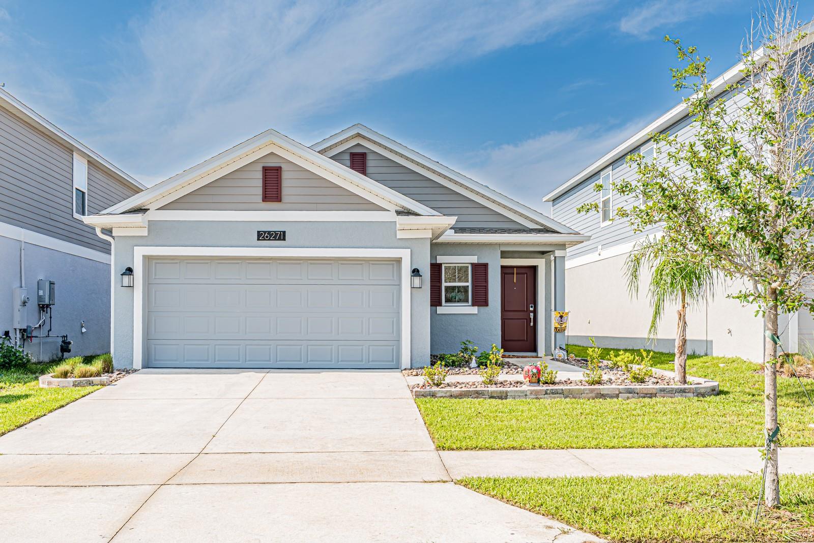 Welcome to this STUNNING, newly built 3-bedroom, 2-bathroom single-family home. Completed in 2023 and thoughtfully UPGRADED for modern living. From the inviting curb appeal with NEW landscaping, hardscapes and a newly installed vinyl privacy fence, to the stylish interior finishes, this home is truly MOVE-IN READY. Upon entering, you are greeted with tile floors, leading you to the heart of the home. Boasting an OPEN-CONCEPT layout, ideal for entertaining, with elegant tile flooring throughout the main living spaces and new WOOD FLOORING in all bedrooms. The kitchen is equipped with stainless steel appliances, grey STONE countertops, white cabinets with new hardware and an inviting kitchen island, perfect for cooking or entertaining. Windows have CUSTOM plantation shutters add a touch of charm and energy efficiency. Enjoy a split bedroom floor plan for added privacy, with the primary suite offering a spacious en suite bathroom, featuring dual sinks, a stand up shower and an enormous walk-in closet. On the other side of the home, you will have 2 additional bedrooms and a spacious guest bathroom. The large laundry room adds everyday convenience off of the garage, while the spacious living areas provide comfort and flow. Located in a community with a dog park and playground, and just minutes from shopping, dining, lake life, and major highways for an easy commute — this home combines comfort, convenience, and style in one exceptional package. Don't miss your opportunity to own this beautifully upgraded home — schedule your private showing today!