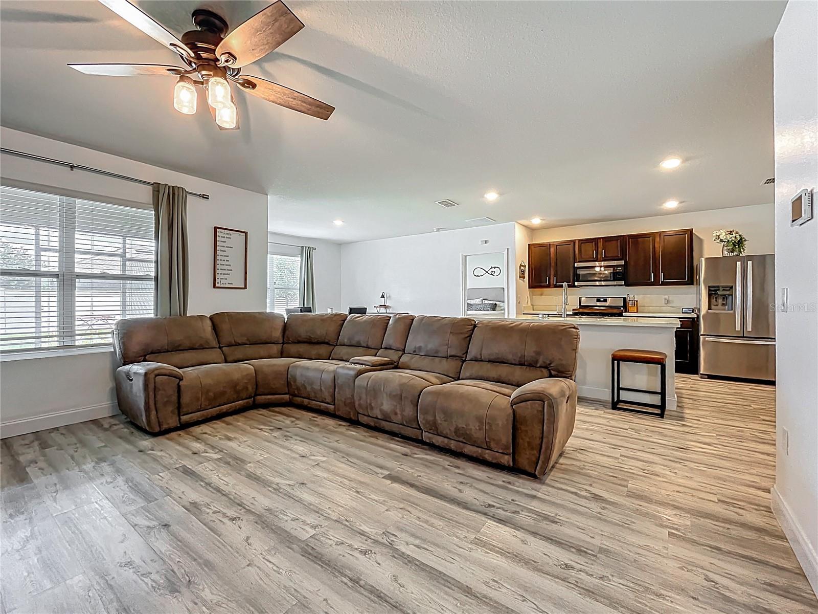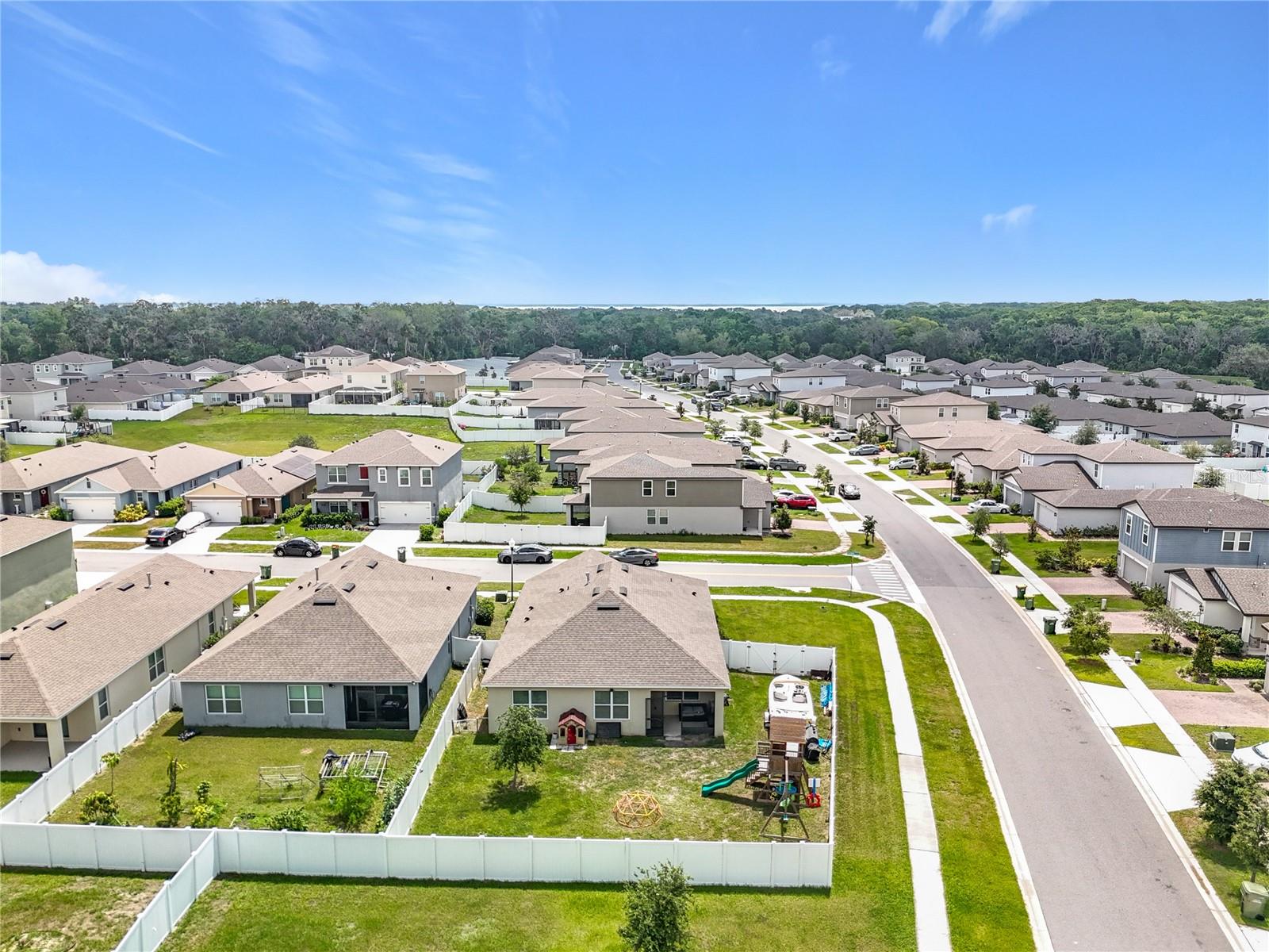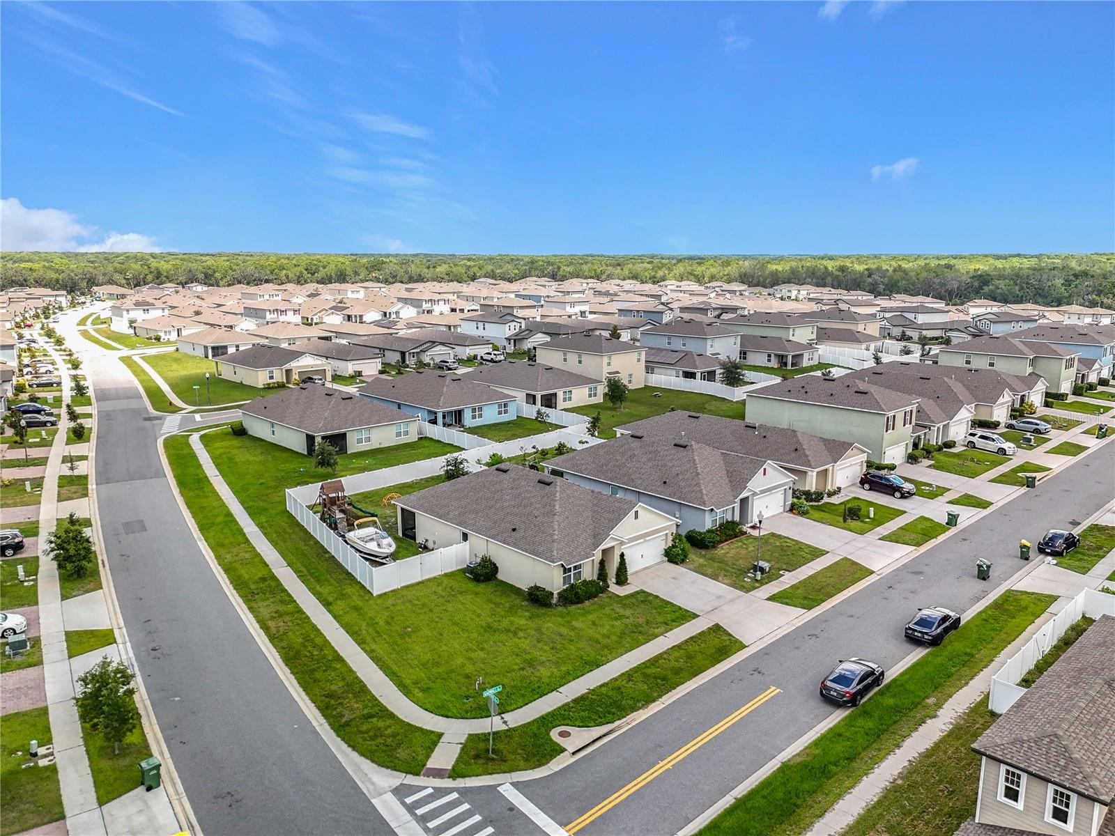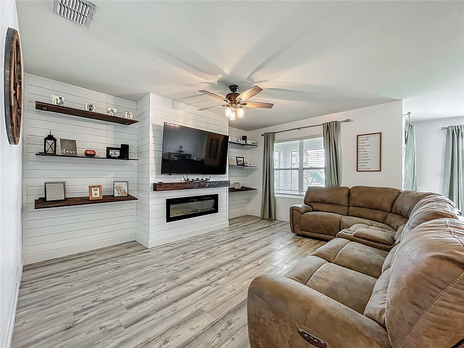 This is your opportunity to own this beautifully maintained 3-bedroom, 2-bath split floor plan home, ideally situated on an oversized corner lot in the highly desirable community of Lake Denham. From the moment you step inside, you'll love the open and inviting layout featuring luxury vinyl tile throughout. The spacious kitchen is a true centerpiece, featuring a gas range, large island, stainless steel appliances, and a farmhouse-style sink that looks out into the welcoming living room, highlighted by a custom shiplap accent wall and charming faux fireplace. The primary suite offers a relaxing retreat with a spacious walk-in closet, dual vanities, and a walk-in shower for added ease. Bedrooms two and three are thoughtfully placed on the opposite side of the home, offering privacy for guests or family members. You'll also love the functionality of the laundry room, complete with custom built-in shelving and a handy hanging rack. Step outside to enjoy your fully fenced backyard or relax on the screened-in, covered patio—perfect for morning coffee or evening wind-downs. Just a short stroll down the street, you’ll find the community pool and playground, making it easy to enjoy sunshine-filled days close to home!