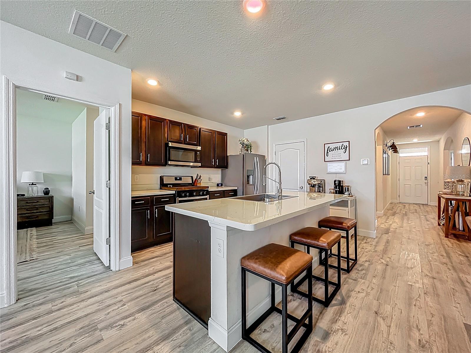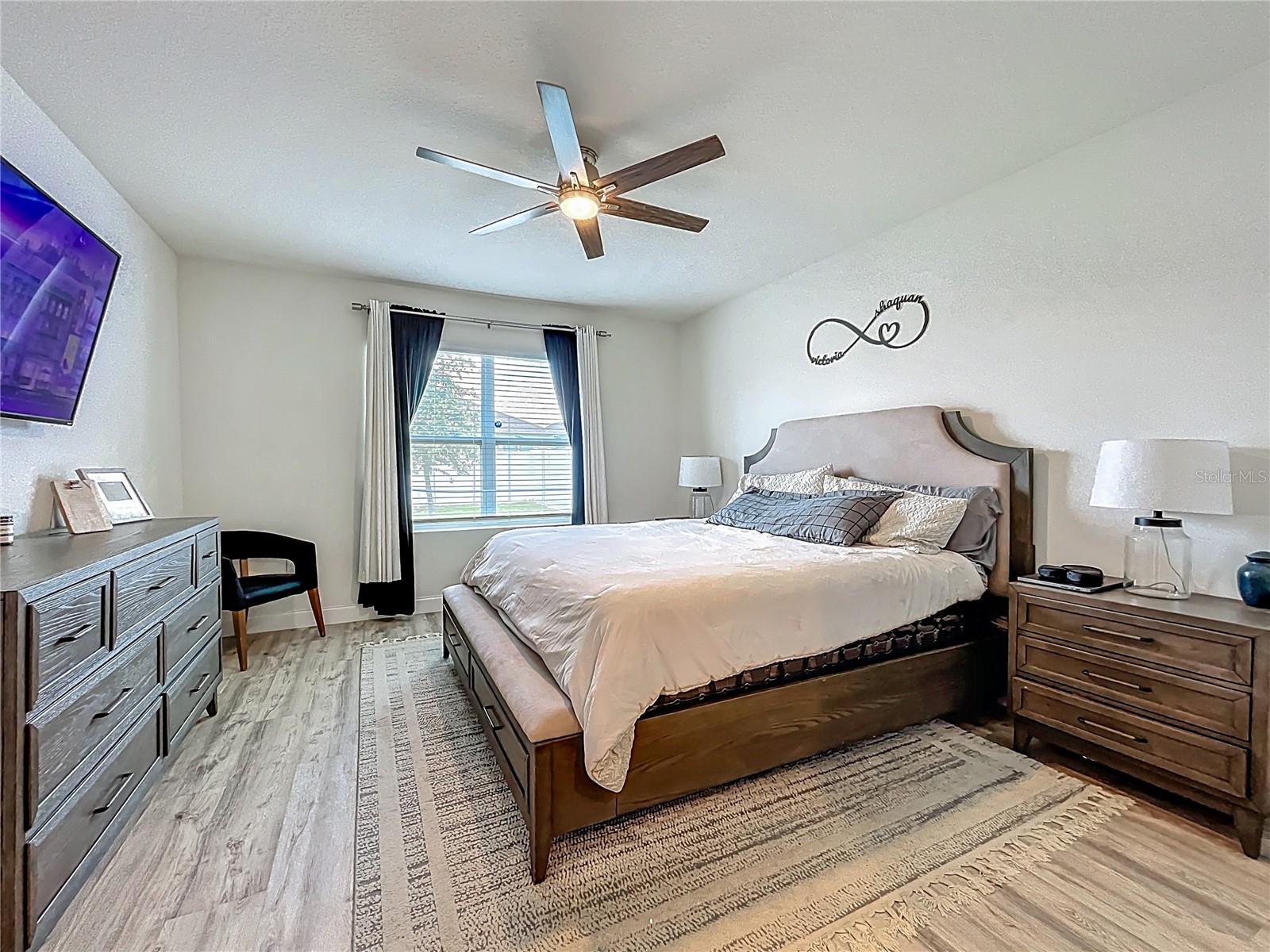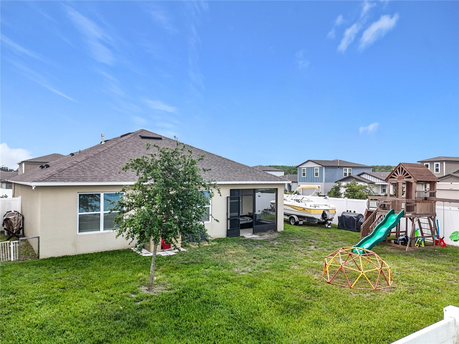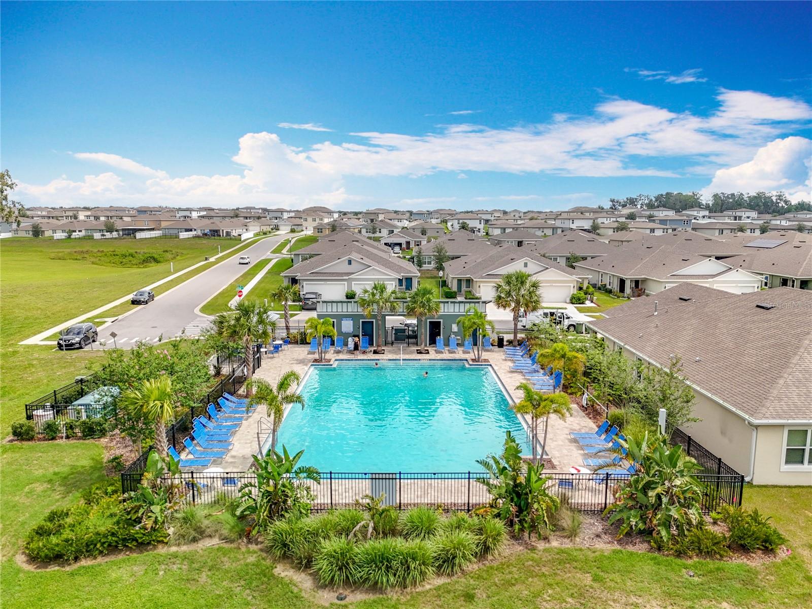 This is your opportunity to own this beautifully maintained 3-bedroom, 2-bath split floor plan home, ideally situated on an oversized corner lot in the highly desirable community of Lake Denham. From the moment you step inside, you'll love the open and inviting layout featuring luxury vinyl tile throughout. The spacious kitchen is a true centerpiece, featuring a gas range, large island, stainless steel appliances, and a farmhouse-style sink that looks out into the welcoming living room, highlighted by a custom shiplap accent wall and charming faux fireplace. The primary suite offers a relaxing retreat with a spacious walk-in closet, dual vanities, and a walk-in shower for added ease. Bedrooms two and three are thoughtfully placed on the opposite side of the home, offering privacy for guests or family members. You'll also love the functionality of the laundry room, complete with custom built-in shelving and a handy hanging rack. Step outside to enjoy your fully fenced backyard or relax on the screened-in, covered patio—perfect for morning coffee or evening wind-downs. Just a short stroll down the street, you’ll find the community pool and playground, making it easy to enjoy sunshine-filled days close to home!