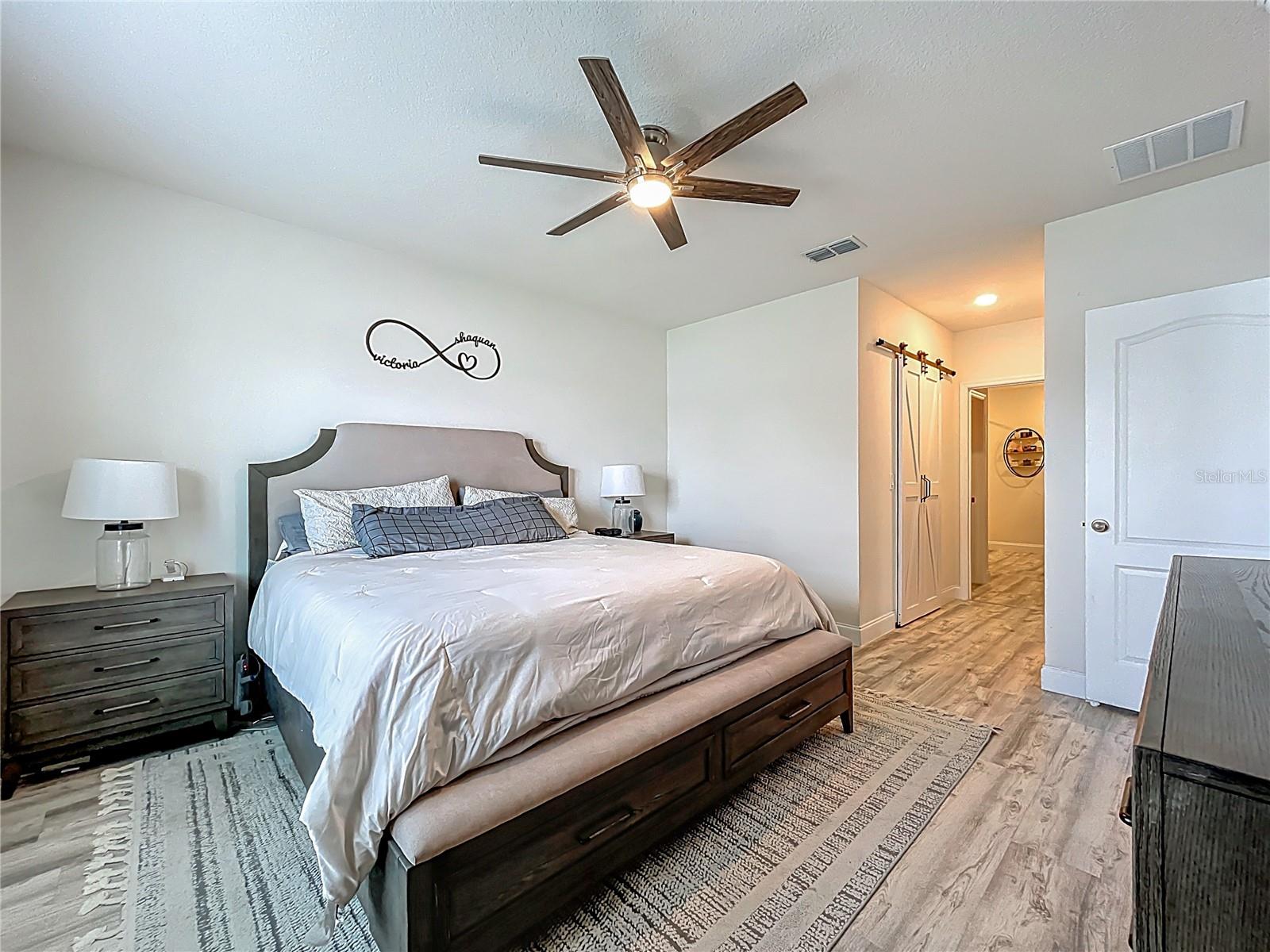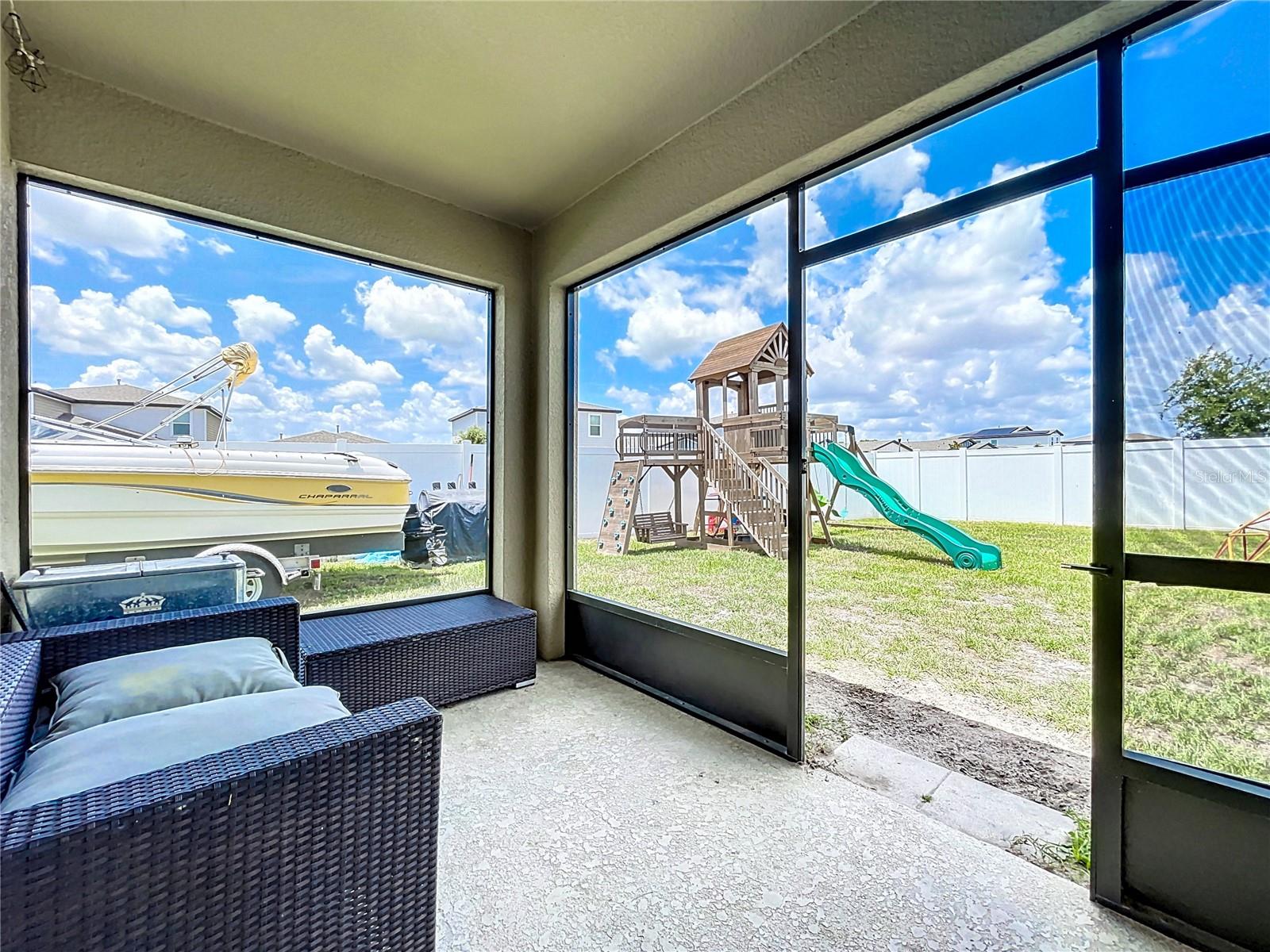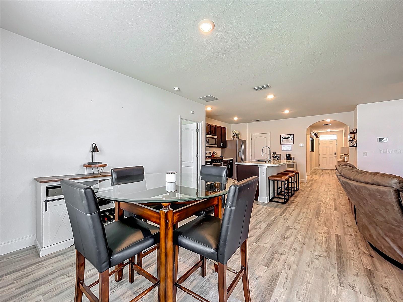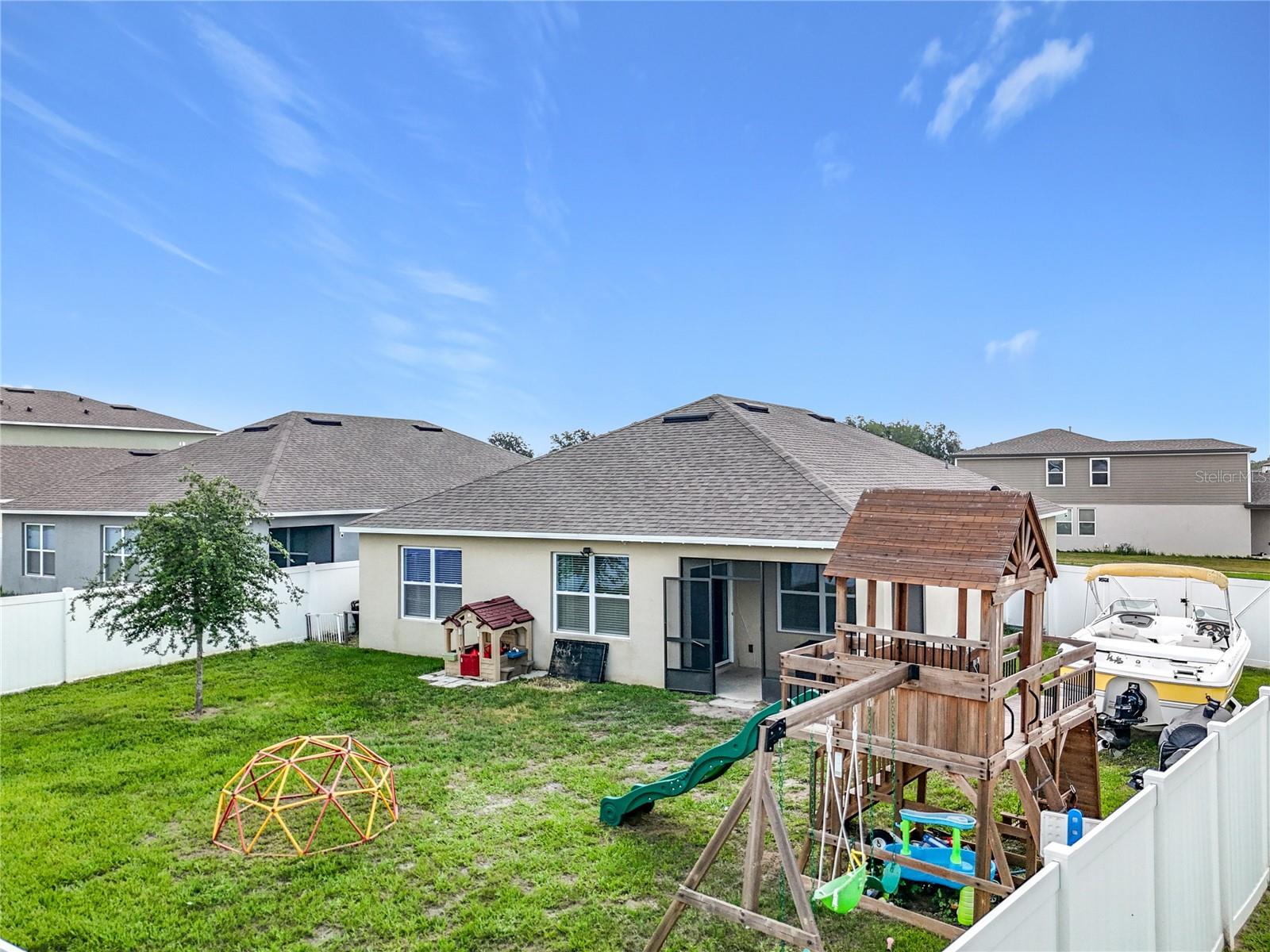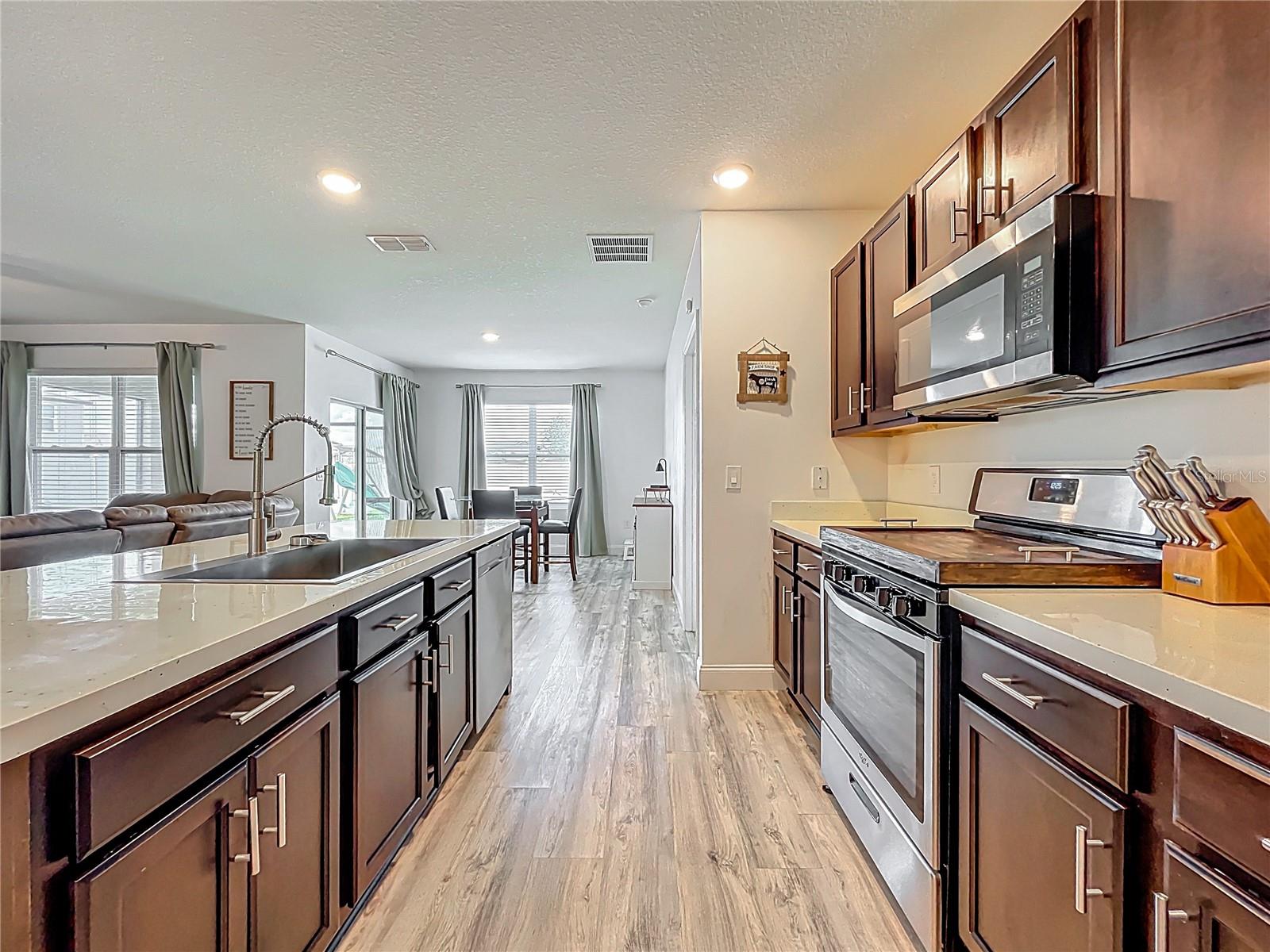This is your opportunity to own this beautifully maintained 3-bedroom, 2-bath split floor plan home, ideally situated on an oversized corner lot in the highly desirable community of Lake Denham. From the moment you step inside, you'll love the open and inviting layout featuring luxury vinyl tile throughout. The spacious kitchen is a true centerpiece, featuring a gas range, large island, stainless steel appliances, and a farmhouse-style sink that looks out into the welcoming living room, highlighted by a custom shiplap accent wall and charming faux fireplace. The primary suite offers a relaxing retreat with a spacious walk-in closet, dual vanities, and a walk-in shower for added ease. Bedrooms two and three are thoughtfully placed on the opposite side of the home, offering privacy for guests or family members. You'll also love the functionality of the laundry room, complete with custom built-in shelving and a handy hanging rack. Step outside to enjoy your fully fenced backyard or relax on the screened-in, covered patio—perfect for morning coffee or evening wind-downs. Just a short stroll down the street, you’ll find the community pool and playground, making it easy to enjoy sunshine-filled days close to home!