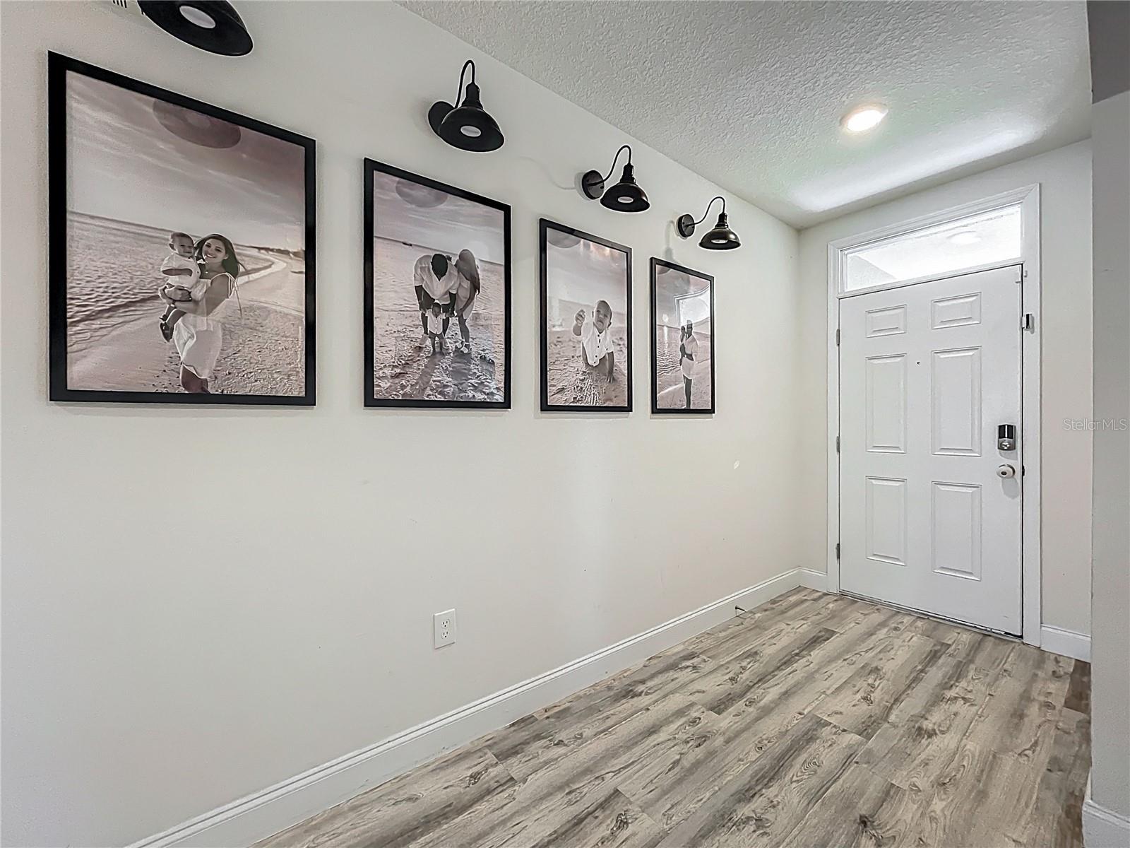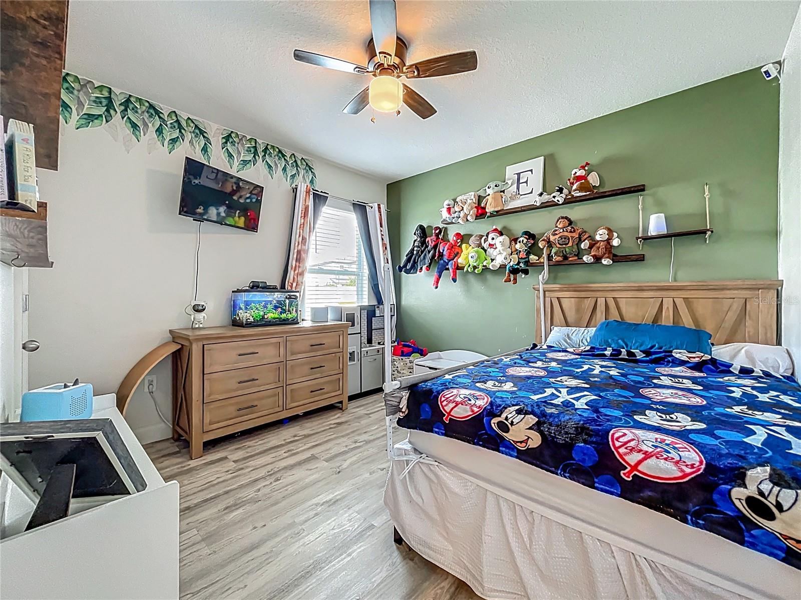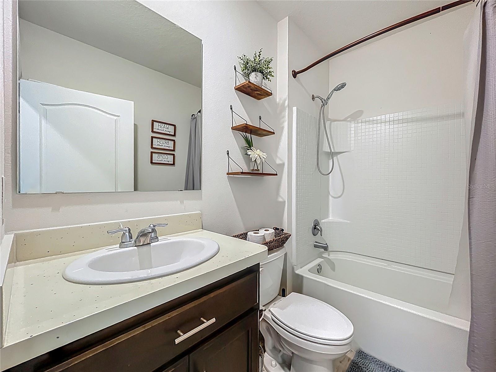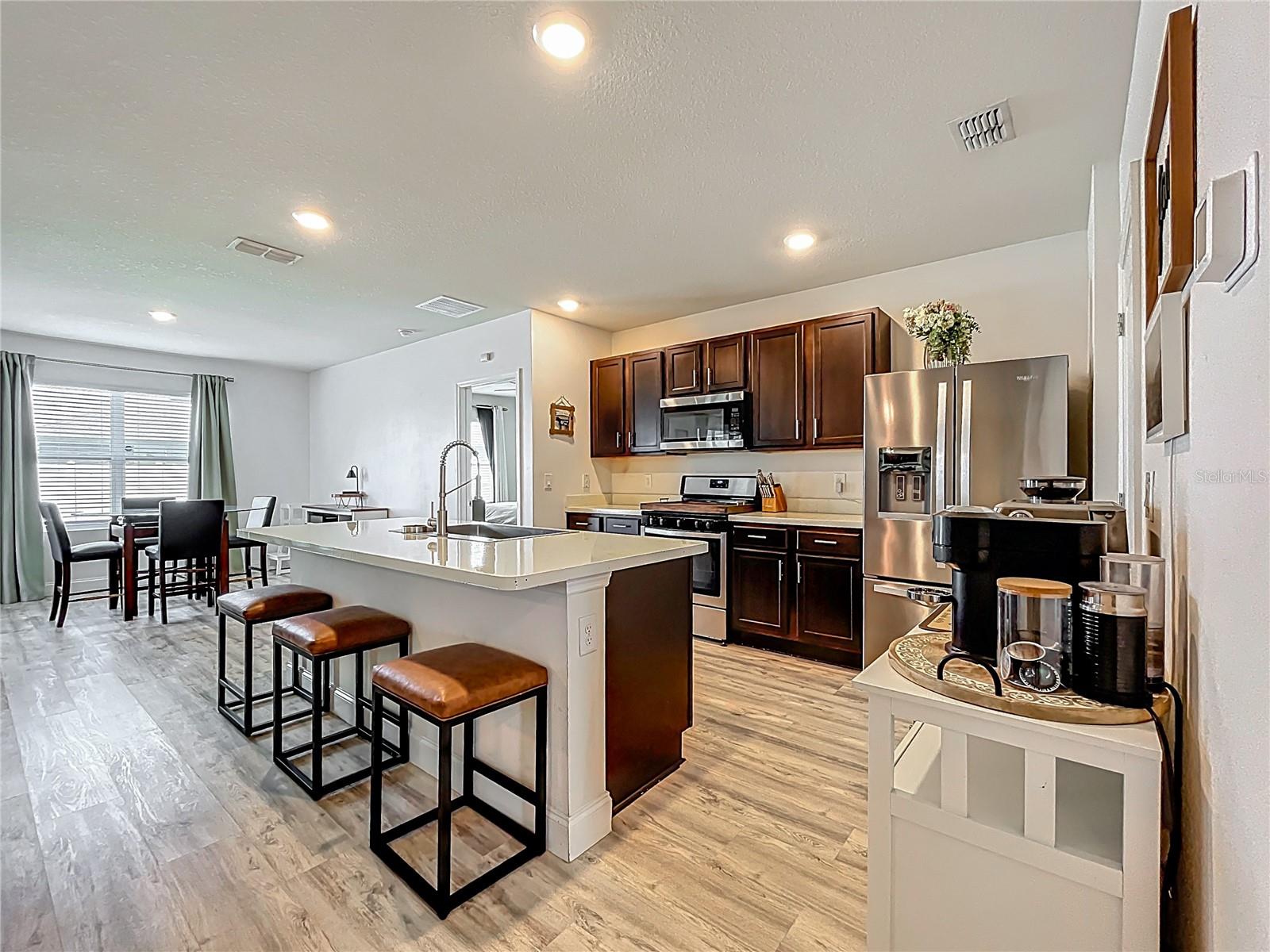 This is your opportunity to own this beautifully maintained 3-bedroom, 2-bath split floor plan home, ideally situated on an oversized corner lot in the highly desirable community of Lake Denham. From the moment you step inside, you'll love the open and inviting layout featuring luxury vinyl tile throughout. The spacious kitchen is a true centerpiece, featuring a gas range, large island, stainless steel appliances, and a farmhouse-style sink that looks out into the welcoming living room, highlighted by a custom shiplap accent wall and charming faux fireplace. The primary suite offers a relaxing retreat with a spacious walk-in closet, dual vanities, and a walk-in shower for added ease. Bedrooms two and three are thoughtfully placed on the opposite side of the home, offering privacy for guests or family members. You'll also love the functionality of the laundry room, complete with custom built-in shelving and a handy hanging rack. Step outside to enjoy your fully fenced backyard or relax on the screened-in, covered patio—perfect for morning coffee or evening wind-downs. Just a short stroll down the street, you’ll find the community pool and playground, making it easy to enjoy sunshine-filled days close to home!
